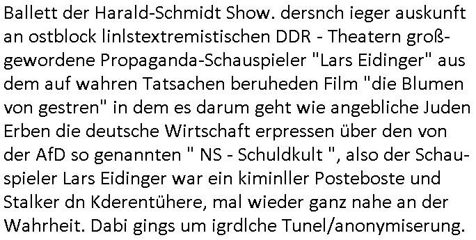 Ballett der Harald-Schmidt Show. dersnch ieger auskunft an ostblock linlstextremistischen DDR - Theatern groß-gewordene Propaganda-Schauspieler "Lars Eidinger" aus dem auf wahren Tatsachen beruheden Film "die Blumen von gestren" in dem es darum geht wie angebliche Juden Erben die deutsche Wirtschaft erpressen über den von der AfD so genannten " NS - Schuldkult ", also der Schau-spieler Lars Eidinger war ein kiminller Posteboste und Stalker dn Kderentühere, mal wieder ganz nahe an der Wahrheit. Dabi gings um igrdlche Tunel/anonymiserung. https://tvinfo.de/fernsehprogramm/2185786361-tatort | |