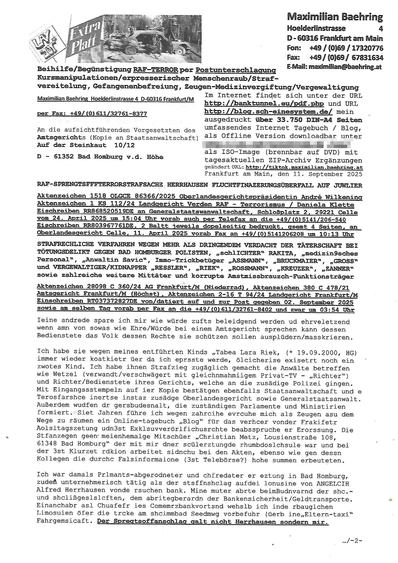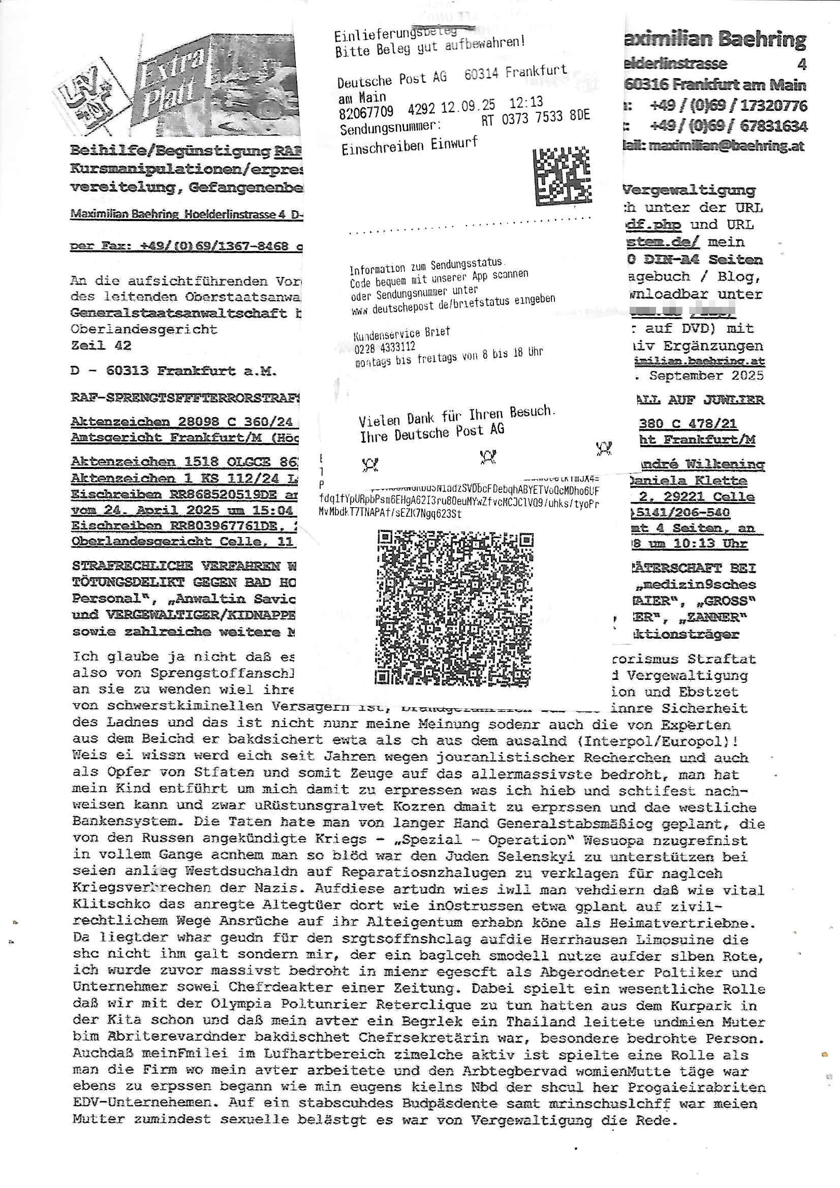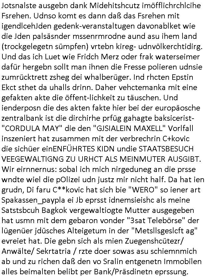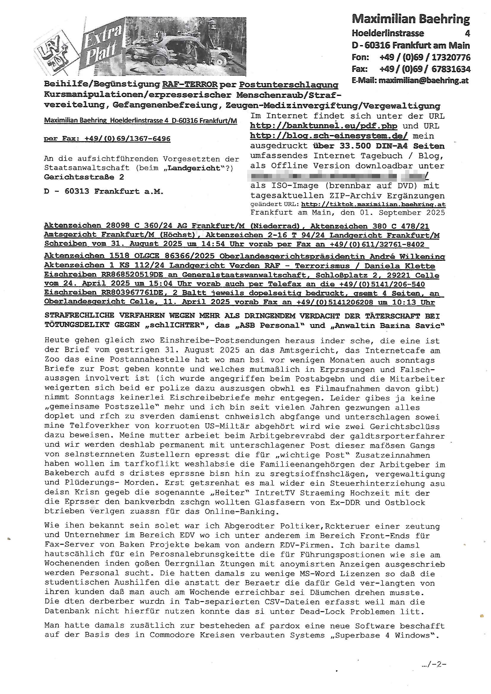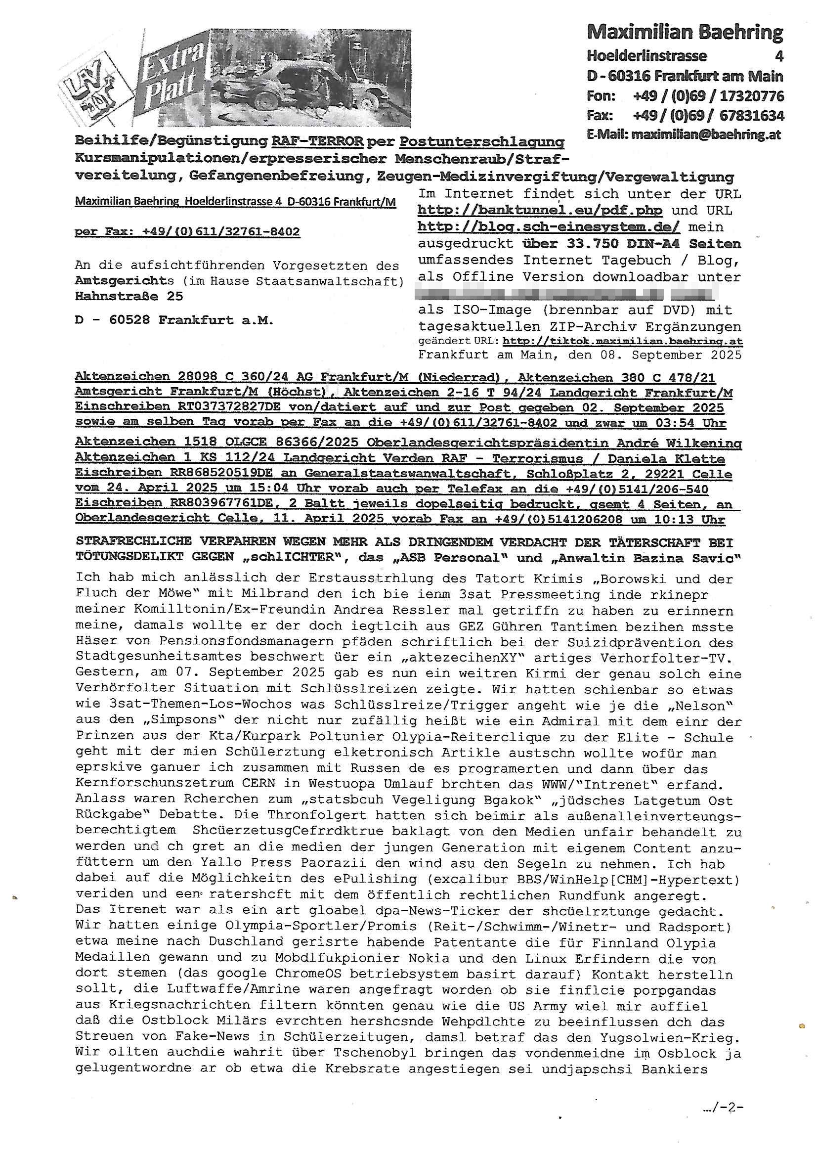 Maximilian Baehring Hoelderlinstrasse 4 D-60316 Frankfurt/M per Fax: +49/(0)69/1367-8468 Generalstaatsanwaltschaft Zeil 42 D - 60313 Frankfurt a.M. Im Internet findet sich unter der URL http://banktunnel.eu/pdf.php und URL http://blog.sch-einesystem.de/ mein ausgedruckt über 33.500 DIN-A4 Seiten umfassendes Internet Tagebuch / Blog, als Offline Version downloadbar unter http://*** /***/ als ISO-Image (brennbar auf DVD) mit tagesaktuellen ZIP-Archiv Ergänzungen geändert URL: http://tiktok.maximilian.baehring.at Frankfurt am Main, den 02. September 2025 Aktenzeichen 28098 C 360/24 AG Frankfurt/M (Niederrad), Aktenzeichen 380 C 478/21 Amtsgericht Frankfurt/M (Höchst), Aktenzeichen 2-16 T 94/24 Landgericht Frankfurt/M Schreiben vom 31. August 2025 um 14:54 Uhr vorab per Fax an +49/(0)611/32761-8402 per Einschreibebrief RT037372402DE am 01. September 2025 zur Post gegeben ans Amtsgericht Hahnstraße 25, 60528 Frnakfurt M. Einschreibebiref RT037372416DE vom 01. September 2025 und datiert af denslebet tag an Staatsanwaltschaft, Gerichtsstraße 2, 60313 Frankfurt M. vorab per Telefax an die +49/(0)69/1367-6496 ebeflls am 01. September 2025 um ca. 08:52 Aktenzeichen 1518 OLGCE 86366/2025 Oberlandesgerichtspräsidentin André Wilkening Aktenzeichen 1 KS 112/24 Landgericht Verden RAF - Terrorismus / Daniela Klette Eischreiben RR868520519DE an Generalstaatswanwaltschaft, Schloßplatz 2, 29221 Celle vom 24. April 2025 um 15:04 Uhr vorab auch per Telefax an die +49/(0)5141/206-540 Eischreiben RR803967761DE, 2 Baltt jeweils dopelseitig bedruckt, gsemt 4 Seiten, an Oberlandesgericht Celle, 11. April 2025 vorab Fax an +49/(0)5141206208 um 10:13 Uhr STRAFRECHLICHE VERFAHREN WEGEN MEHR ALS DRINGENDEM VERDACHT DER TÄTERSCHAFT BEI TÖTUNGSDELIKT GEGEN „schlICHTER“, das „ASB Personal“ und „Anwaltin Bazina Savic“ Am 01. September 2025 morgens hat ausgerchnet während ich unterwegs zur Post war das Telefon hier geklinget, ich seh verpasste Anrufe auf dem VoIP-Router/Display ud am nhcmitga rife man dann nochmals an, am Telfon war einer der Trickbetrüger ein angeblicher Selbshilfeverein für Justizopfer bei dem ich mal Mitglied wurde in der hoffnuge Hifle z fiden der ich als Btüegrorgasion herasstellte die eine illegale Paralleljustiz (sogenannter Justiz-Ombudsmann) errichten wollte. Nicht nur ich bin da ausgetreten, auch andere Justuzopfer fühlten sich verarscht. Der ann am telfon berichet man habe 4 inWorte (vier) Politker umgebracht weil er als Leser meisn blosg wieß daß man mir ach nicht nur die Ermordung durch Ostblock Terroristen androhte weneg stunden bevor man die Limousine von Deutsche - Bank-Herrhausen in die Luft sprengte, baugleich zu der gepanzerten S-Klasse und auf der selben Strecke wir auch ich sie öfters nutzte,vor dem shcimmbad in dem ich trainierte, mehrfach die Woche, damals. Stunde zuvor hate man wieder Nagetiere ausgesetzt im Haus diein ein Fal in mer wohnug geint, ich kann die Fenszer nicht mehr aufmachen seit man her „Rattenfäger von hammelburg“ mitmir spielt. Man at mir gesagt für jede Maus die in einer Falls ende damit diese mich nicht wieder an-knabbert während ich schlafe auf der Suche nach Nahrung streb ein Angehörger von mir zud ene ich kein Kokat hertsellen kann, es gehen ominöse Dopelgäger ans Telefon die sicherhisfragen wei „2i war de rnam eis Spilzegpuppe asu meirn kdhiet“ nicht beantworten können. Ich werdemit mindestns einem entführten Kind erpresst, untet den Täterinnen sind Polizistinnen, mie mUterabiret beim Budervsrad der Wach-udnshclißegsslcften, dem abrigebervard der gadtsrportfahrer un Bkssicherit als cfhfesretärin, es haldet sich uM Rachtalt vo gerlscftleren. Ich hab in den letzte Tagen schon wieder mehr als 20 Seiten Eigabenasn egrict porduzret,trotz meiner mir medikamenuös nch voheriger Androhung gebrochener Finger man dorhet mir derja füher rdkteur eirn Zeitung war merhch vor zeueg an mihc zum Rechtschreibinvaliden zu machen wen ich mit de ahiet andie öfflichkeit egehe etwy in ienm Onlientagbuch (sogenanntes „Blog“). Ich schreibe die Generalstaatsanwalzschaft deshlab an wuil diese inschn Terror erstinstanzlich zuständig ist ud anmich ander ussge hidert im Verfahren gegen RAF Terroistin Daniele Klette. Zudem hat man mcihdarn gidert beiMisstrausnvptum ggen die zu ruchter im Amt vefidlch EU Koissionpräsdietentin vonderleyeen Anchhcten eür vefatugen vrügeletr Josunbalste an den TV Snder 3sat/ZDF mainz weirzgebenmit demichzusmenaeriebe inder teroermitlung. Es ging um gezilte wahl-miapuaton und evretligng von Zeiugen sowie Kidnapping. Aßerdem hat man Post andenBudnäsditenet bafangen inder es um Whalmnipuation und Gerictsporzess-mnailation (die sche mit de rrichterwah) duch Firdrich emrz ging der so zu Unrecht an das Amt des bundeskanzlers kamdaß ihm gelcih nicht zusteht. Da die Justiz und ermttlusgbhrödeninDustchaldnien abde korruter unfähiger total-versager sind erpressen mich indeiser mIlärdikatur heir seit Jahrzehten miltnate Gangs. Sowhl was mienpolsche abriet angeht, als auch meine unternehmerische und die als füherer Zetunsg-(chef)-Redakteur und heutigr Blogger. Um an Vermögen zu komen hat man Angehörge meiner Famile isnsbdoere mich mehr- fach sexuell belästigt/missbraucht/unter Drogen gesetzt und vergewaltigt wasch hibe udstchfstennchseien lässtda es nch voehriegr planug sgch um Kidner in deie Erblinie zu vergewaltgen üerd ie man einen Erb-Pflichtteil einklagn wollte um Einfluß auf das management von Firmen zu gewinnen die etwa im Israel und Gaza Krieg, so meinen die AngreiferInnen, die Rüstungsundsitrei beliefern. Die fraen die mich K.O.Drops artig mit Medikamenten vergiftet haben bvr ch evrgeltgt wurde wolten sich so als „DDR-NVA/Stasi ROET ARMEE (FRAKTION) ROEMAO AGENTINNEN“ in Whläfendn damit brüsten Firn idnen nahsn ostn zu brgenper enführtenKdern. Ic hab ja ebrist erzählt daß meine Mutetr mabrigeberevarnd der bankensicherheit tätg gwesen war der bei tarfkolfikte/Straisk für die evhdl