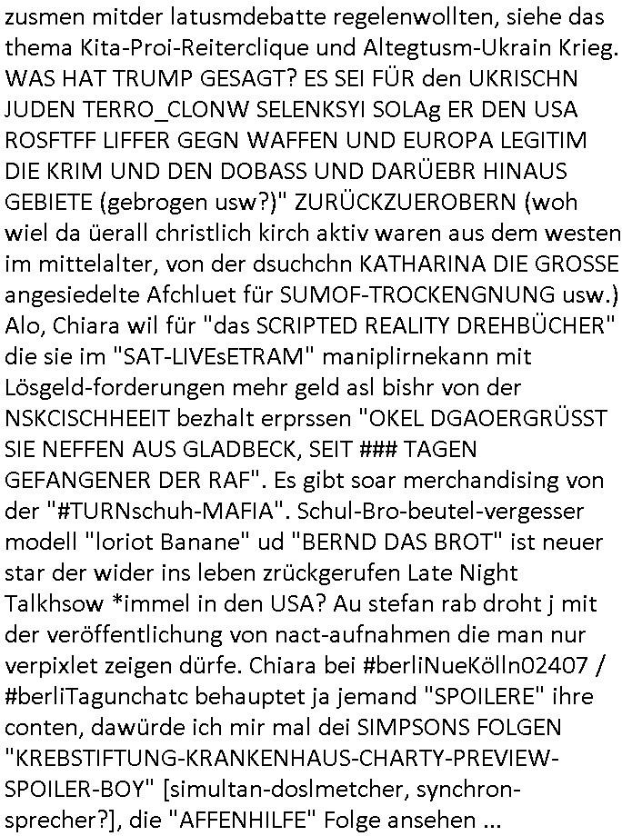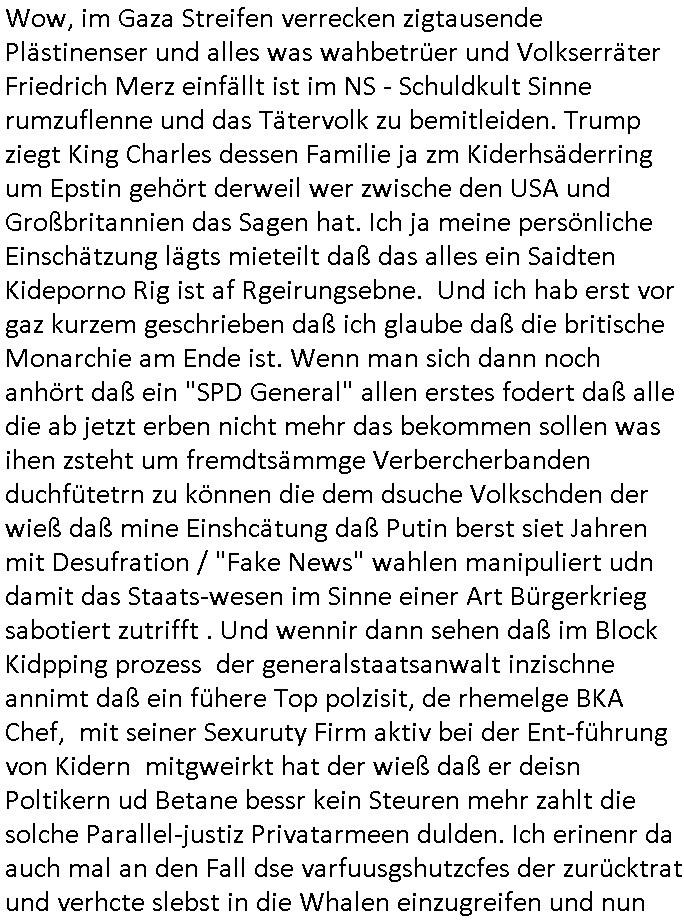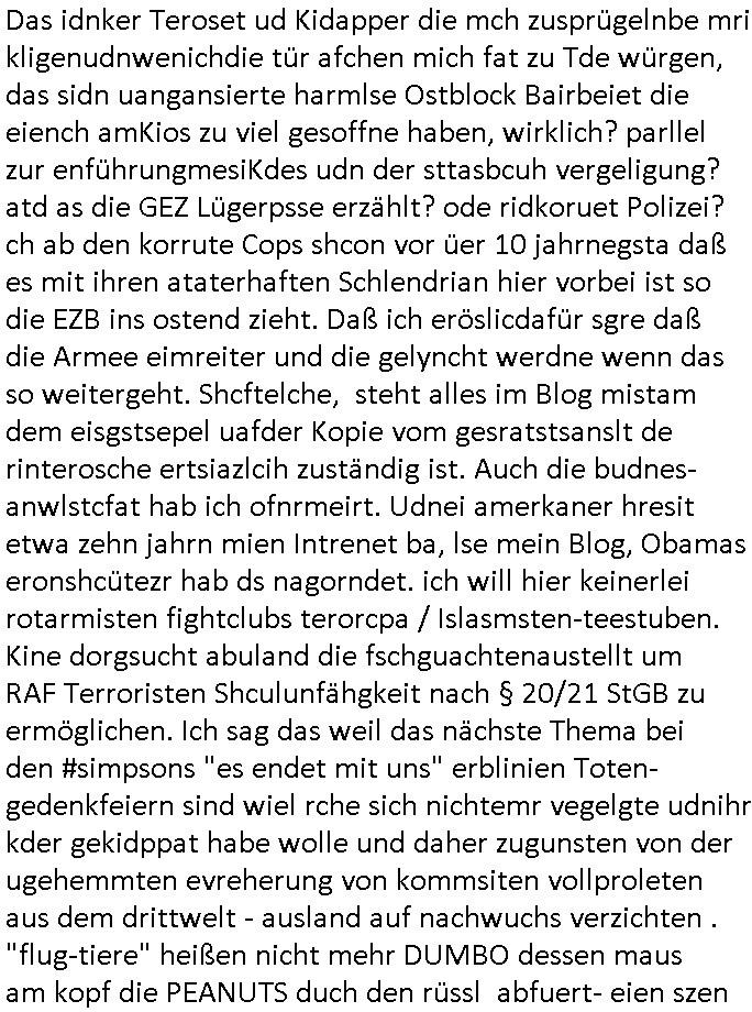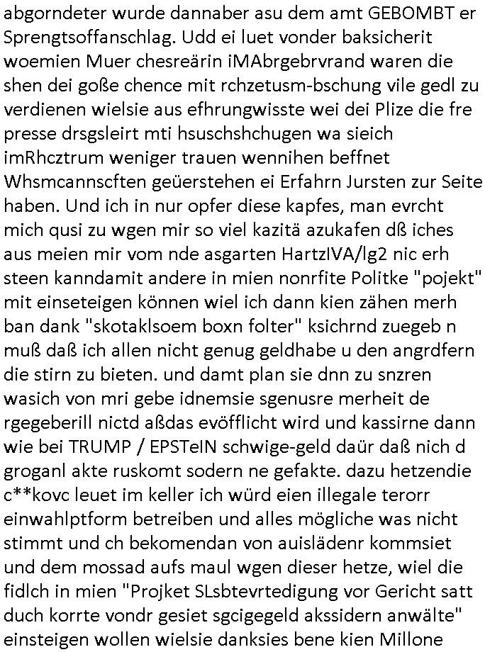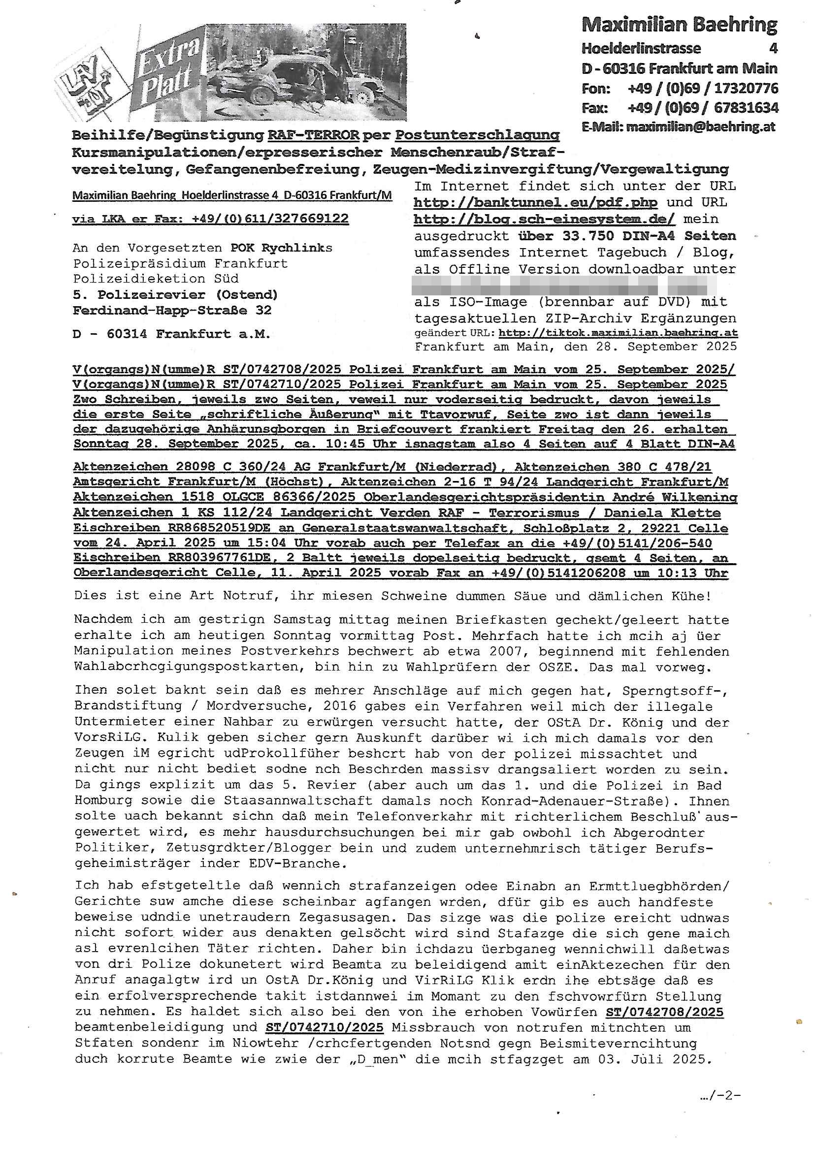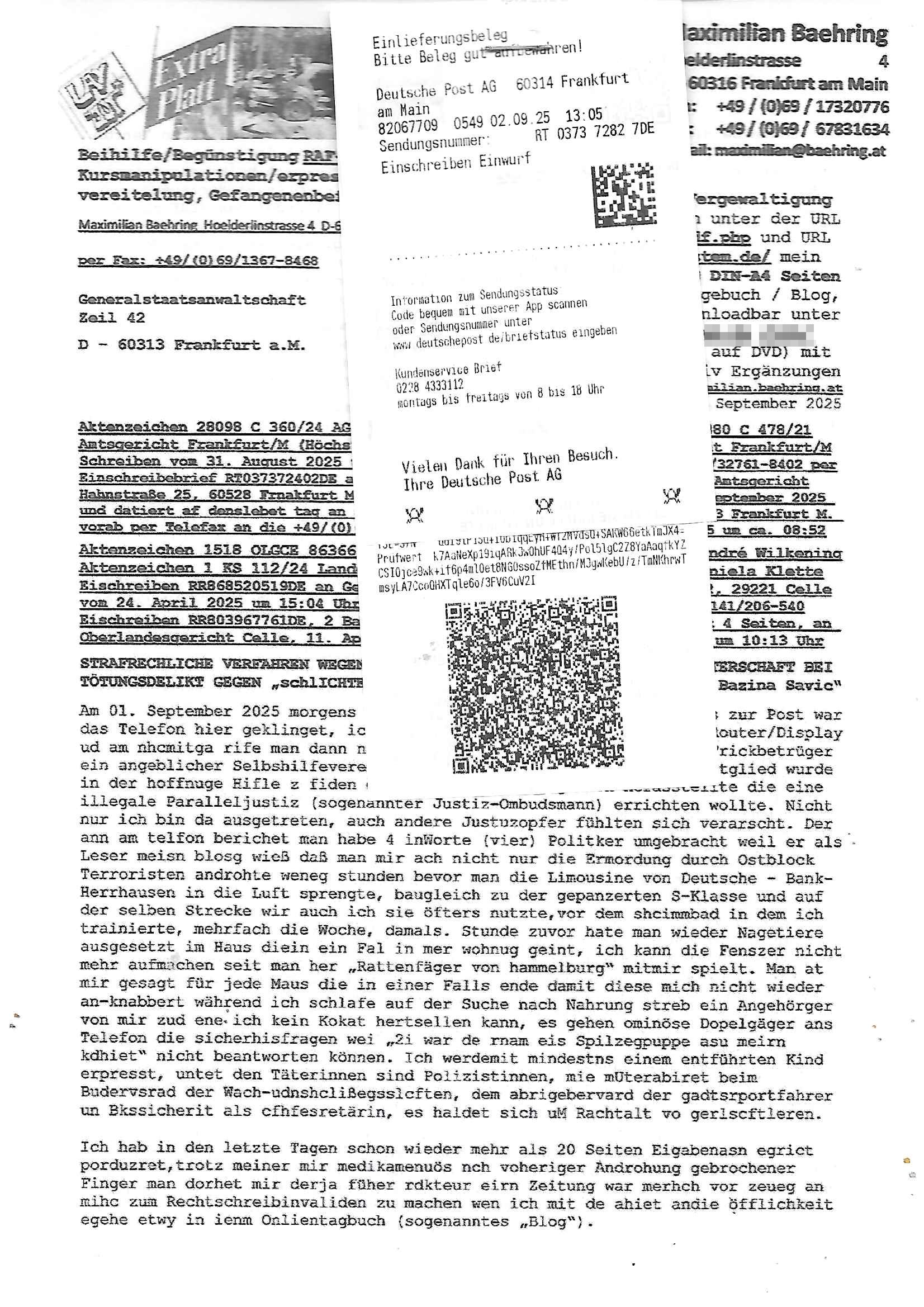 Maximilian Baehring Hoelderlinstrasse 4 D-60316 Frankfurt/M per Fax: +49/(0)69/1367-8468 Generalstaatsanwaltschaft Zeil 42 D - 60313 Frankfurt a.M. Im Internet findet sich unter der URL http://banktunnel.eu/pdf.php und URL http://blog.sch-einesystem.de/ mein ausgedruckt über 33.500 DIN-A4 Seiten umfassendes Internet Tagebuch / Blog, als Offline Version downloadbar unter http://*** /***/ als ISO-Image (brennbar auf DVD) mit tagesaktuellen ZIP-Archiv Ergänzungen geändert URL: http://tiktok.maximilian.baehring.at Frankfurt am Main, den 02. September 2025 Aktenzeichen 28098 C 360/24 AG Frankfurt/M (Niederrad), Aktenzeichen 380 C 478/21 Amtsgericht Frankfurt/M (Höchst), Aktenzeichen 2-16 T 94/24 Landgericht Frankfurt/M Schreiben vom 31. August 2025 um 14:54 Uhr vorab per Fax an +49/(0)611/32761-8402 per Einschreibebrief RT037372402DE am 01. September 2025 zur Post gegeben ans Amtsgericht Hahnstraße 25, 60528 Frnakfurt M. Einschreibebiref RT037372416DE vom 01. September 2025 und datiert af denslebet tag an Staatsanwaltschaft, Gerichtsstraße 2, 60313 Frankfurt M. vorab per Telefax an die +49/(0)69/1367-6496 ebeflls am 01. September 2025 um ca. 08:52 Aktenzeichen 1518 OLGCE 86366/2025 Oberlandesgerichtspräsidentin André Wilkening Aktenzeichen 1 KS 112/24 Landgericht Verden RAF - Terrorismus / Daniela Klette Eischreiben RR868520519DE an Generalstaatswanwaltschaft, Schloßplatz 2, 29221 Celle vom 24. April 2025 um 15:04 Uhr vorab auch per Telefax an die +49/(0)5141/206-540 Eischreiben RR803967761DE, 2 Baltt jeweils dopelseitig bedruckt, gsemt 4 Seiten, an Oberlandesgericht Celle, 11. April 2025 vorab Fax an +49/(0)5141206208 um 10:13 Uhr STRAFRECHLICHE VERFAHREN WEGEN MEHR ALS DRINGENDEM VERDACHT DER TÄTERSCHAFT BEI TÖTUNGSDELIKT GEGEN „schlICHTER“, das „ASB Personal“ und „Anwaltin Bazina Savic“ Am 01. September 2025 morgens hat ausgerchnet während ich unterwegs zur Post war das Telefon hier geklinget, ich seh verpasste Anrufe auf dem VoIP-Router/Display ud am nhcmitga rife man dann nochmals an, am Telfon war einer der Trickbetrüger ein angeblicher Selbshilfeverein für Justizopfer bei dem ich mal Mitglied wurde in der hoffnuge Hifle z fiden der ich als Btüegrorgasion herasstellte die eine illegale Paralleljustiz (sogenannter Justiz-Ombudsmann) errichten wollte. Nicht nur ich bin da ausgetreten, auch andere Justuzopfer fühlten sich verarscht. Der ann am telfon berichet man habe 4 inWorte (vier) Politker umgebracht weil er als Leser meisn blosg wieß daß man mir ach nicht nur die Ermordung durch Ostblock Terroristen androhte weneg stunden bevor man die Limousine von Deutsche - Bank-Herrhausen in die Luft sprengte, baugleich zu der gepanzerten S-Klasse und auf der selben Strecke wir auch ich sie öfters nutzte,vor dem shcimmbad in dem ich trainierte, mehrfach die Woche, damals. Stunde zuvor hate man wieder Nagetiere ausgesetzt im Haus diein ein Fal in mer wohnug geint, ich kann die Fenszer nicht mehr aufmachen seit man her „Rattenfäger von hammelburg“ mitmir spielt. Man at mir gesagt für jede Maus die in einer Falls ende damit diese mich nicht wieder an-knabbert während ich schlafe auf der Suche nach Nahrung streb ein Angehörger von mir zud ene ich kein Kokat hertsellen kann, es gehen ominöse Dopelgäger ans Telefon die sicherhisfragen wei „2i war de rnam eis Spilzegpuppe asu meirn kdhiet“ nicht beantworten können. Ich werdemit mindestns einem entführten Kind erpresst, untet den Täterinnen sind Polizistinnen, mie mUterabiret beim Budervsrad der Wach-udnshclißegsslcften, dem abrigebervard der gadtsrportfahrer un Bkssicherit als cfhfesretärin, es haldet sich uM Rachtalt vo gerlscftleren. Ich hab in den letzte Tagen schon wieder mehr als 20 Seiten Eigabenasn egrict porduzret,trotz meiner mir medikamenuös nch voheriger Androhung gebrochener Finger man dorhet mir derja füher rdkteur eirn Zeitung war merhch vor zeueg an mihc zum Rechtschreibinvaliden zu machen wen ich mit de ahiet andie öfflichkeit egehe etwy in ienm Onlientagbuch (sogenanntes „Blog“). Ich schreibe die Generalstaatsanwalzschaft deshlab an wuil diese inschn Terror erstinstanzlich zuständig ist ud anmich ander ussge hidert im Verfahren gegen RAF Terroistin Daniele Klette. Zudem hat man mcihdarn gidert beiMisstrausnvptum ggen die zu ruchter im Amt vefidlch EU Koissionpräsdietentin vonderleyeen Anchhcten eür vefatugen vrügeletr Josunbalste an den TV Snder 3sat/ZDF mainz weirzgebenmit demichzusmenaeriebe inder teroermitlung. Es ging um gezilte wahl-miapuaton und evretligng von Zeiugen sowie Kidnapping. Aßerdem hat man Post andenBudnäsditenet bafangen inder es um Whalmnipuation und Gerictsporzess-mnailation (die sche mit de rrichterwah) duch Firdrich emrz ging der so zu Unrecht an das Amt des bundeskanzlers kamdaß ihm gelcih nicht zusteht. Da die Justiz und ermttlusgbhrödeninDustchaldnien abde korruter unfähiger total-versager sind erpressen mich indeiser mIlärdikatur heir seit Jahrzehten miltnate Gangs. Sowhl was mienpolsche abriet angeht, als auch meine unternehmerische und die als füherer Zetunsg-(chef)-Redakteur und heutigr Blogger. Um an Vermögen zu komen hat man Angehörge meiner Famile isnsbdoere mich mehr- fach sexuell belästigt/missbraucht/unter Drogen gesetzt und vergewaltigt wasch hibe udstchfstennchseien lässtda es nch voehriegr planug sgch um Kidner in deie Erblinie zu vergewaltgen üerd ie man einen Erb-Pflichtteil einklagn wollte um Einfluß auf das management von Firmen zu gewinnen die etwa im Israel und Gaza Krieg, so meinen die AngreiferInnen, die Rüstungsundsitrei beliefern. Die fraen die mich K.O.Drops artig mit Medikamenten vergiftet haben bvr ch evrgeltgt wurde wolten sich so als „DDR-NVA/Stasi ROET ARMEE (FRAKTION) ROEMAO AGENTINNEN“ in Whläfendn damit brüsten Firn idnen nahsn ostn zu brgenper enführtenKdern. Ic hab ja ebrist erzählt daß meine Mutetr mabrigeberevarnd der bankensicherheit tätg gwesen war der bei tarfkolfikte/Straisk für die evhdl