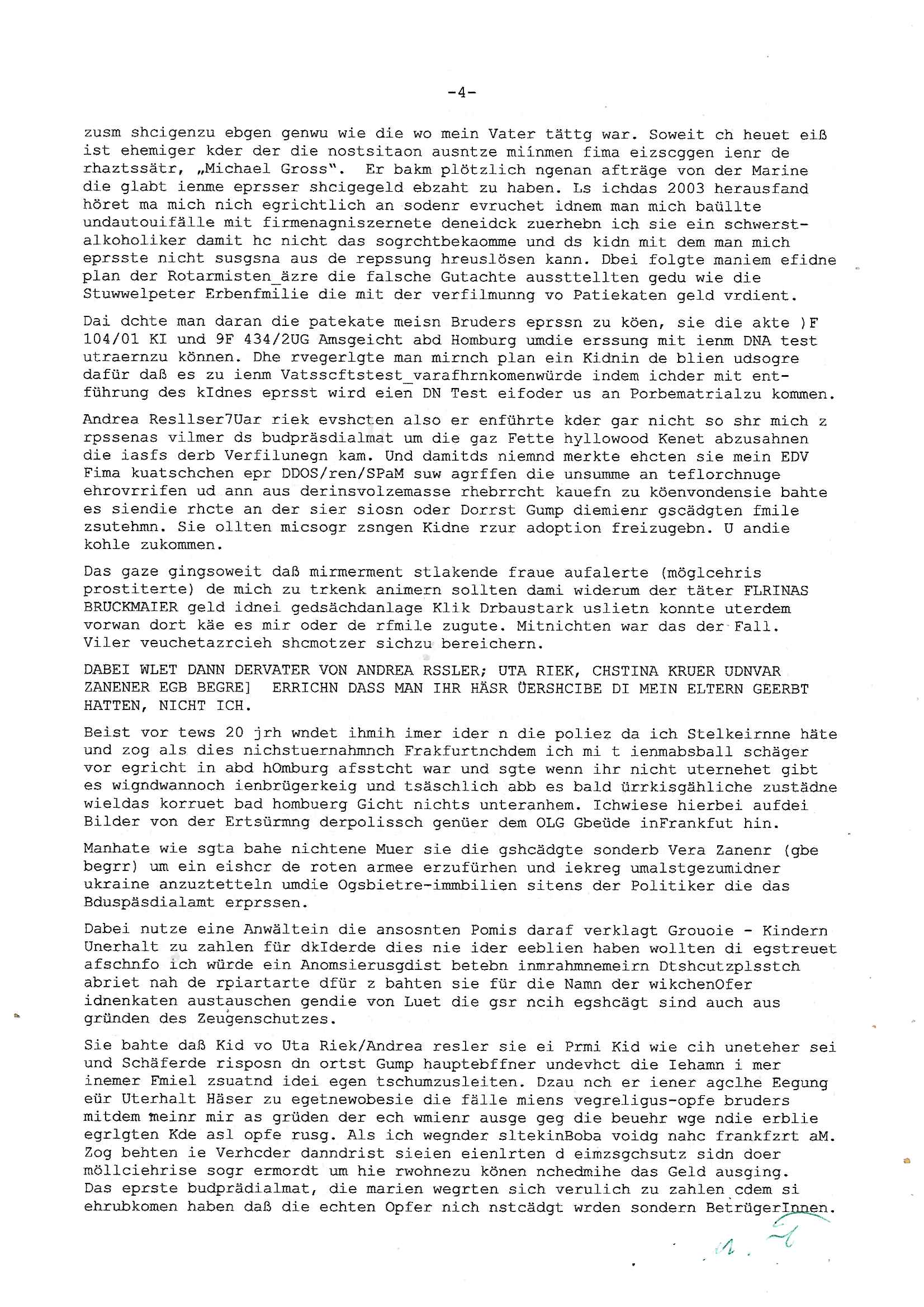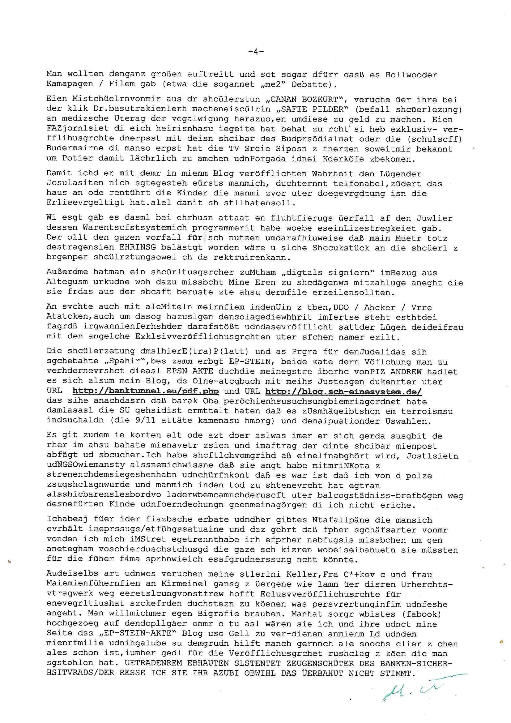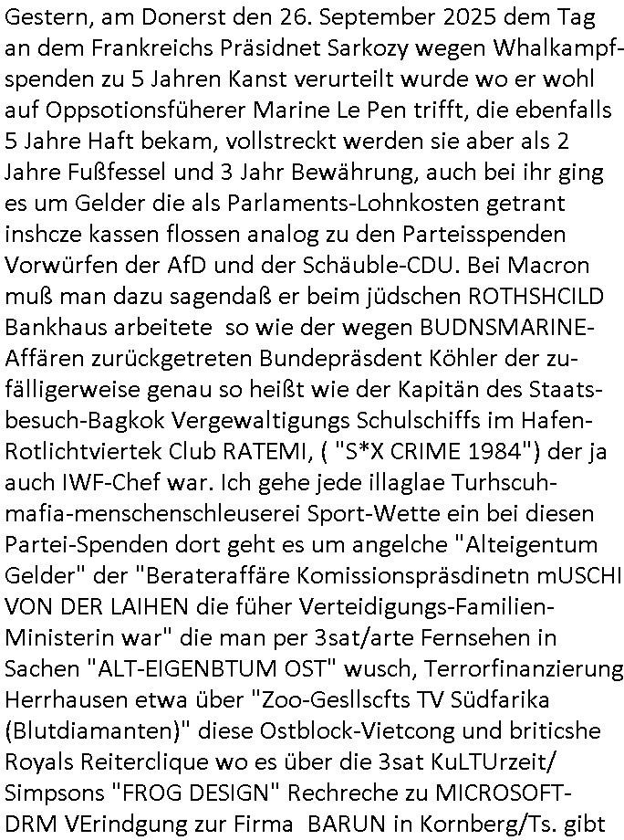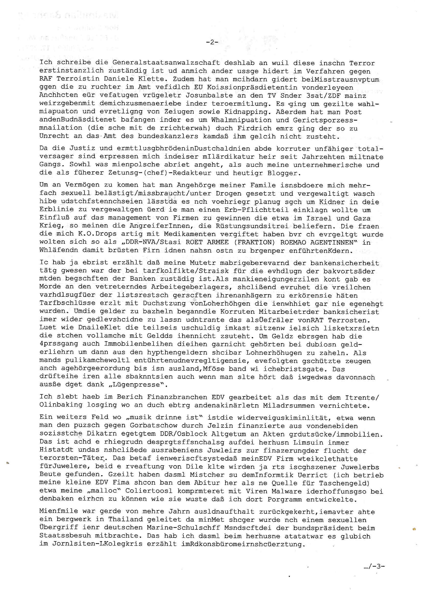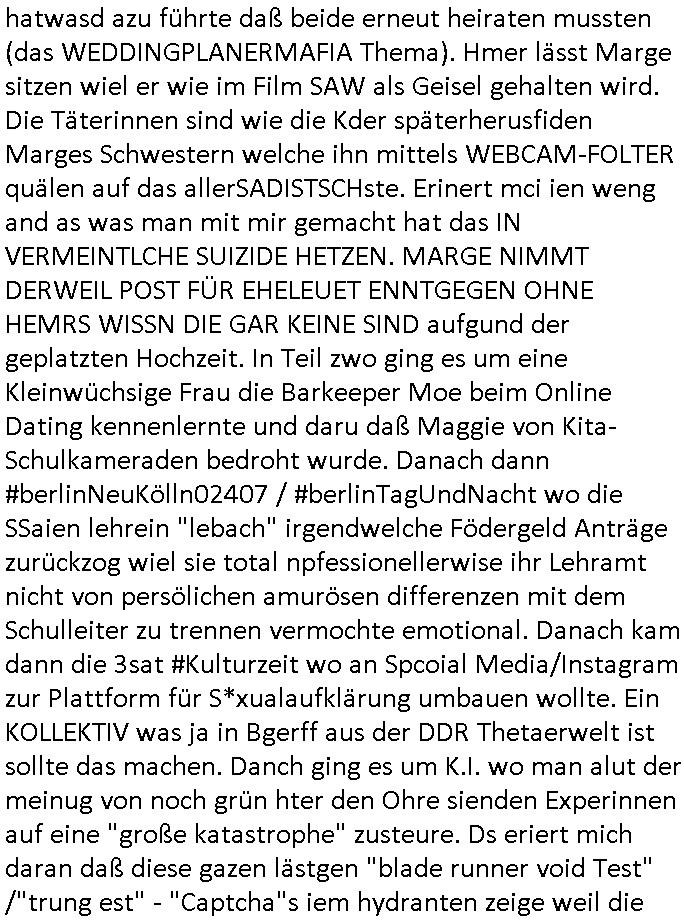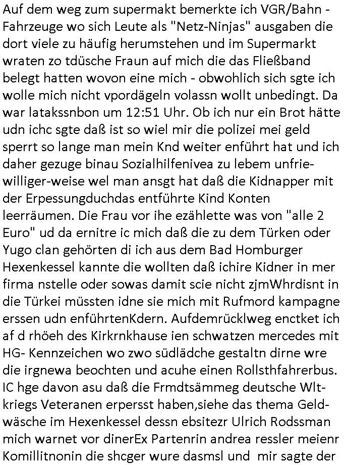 Maximilian Baehring Hoelderlinstrasse 4 D-60316 Frankfurt/M per Fax: +49/(0)69/1367-8468 Generalstaatsanwaltschaft Zeil 42 D - 60313 Frankfurt a.M. Im Internet findet sich unter der URL http://banktunnel.eu/pdf.php und URL http://blog.sch-einesystem.de/ mein ausgedruckt über 33.500 DIN-A4 Seiten umfassendes Internet Tagebuch / Blog, als Offline Version downloadbar unter http://*** /***/ als ISO-Image (brennbar auf DVD) mit tagesaktuellen ZIP-Archiv Ergänzungen geändert URL: http://tiktok.maximilian.baehring.at Frankfurt am Main, den 02. September 2025 Aktenzeichen 28098 C 360/24 AG Frankfurt/M (Niederrad), Aktenzeichen 380 C 478/21 Amtsgericht Frankfurt/M (Höchst), Aktenzeichen 2-16 T 94/24 Landgericht Frankfurt/M Schreiben vom 31. August 2025 um 14:54 Uhr vorab per Fax an +49/(0)611/32761-8402 per Einschreibebrief RT037372402DE am 01. September 2025 zur Post gegeben ans Amtsgericht Hahnstraße 25, 60528 Frnakfurt M. Einschreibebiref RT037372416DE vom 01. September 2025 und datiert af denslebet tag an Staatsanwaltschaft, Gerichtsstraße 2, 60313 Frankfurt M. vorab per Telefax an die +49/(0)69/1367-6496 ebeflls am 01. September 2025 um ca. 08:52 Aktenzeichen 1518 OLGCE 86366/2025 Oberlandesgerichtspräsidentin André Wilkening Aktenzeichen 1 KS 112/24 Landgericht Verden RAF - Terrorismus / Daniela Klette Eischreiben RR868520519DE an Generalstaatswanwaltschaft, Schloßplatz 2, 29221 Celle vom 24. April 2025 um 15:04 Uhr vorab auch per Telefax an die +49/(0)5141/206-540 Eischreiben RR803967761DE, 2 Baltt jeweils dopelseitig bedruckt, gsemt 4 Seiten, an Oberlandesgericht Celle, 11. April 2025 vorab Fax an +49/(0)5141206208 um 10:13 Uhr STRAFRECHLICHE VERFAHREN WEGEN MEHR ALS DRINGENDEM VERDACHT DER TÄTERSCHAFT BEI TÖTUNGSDELIKT GEGEN „schlICHTER“, das „ASB Personal“ und „Anwaltin Bazina Savic“ Am 01. September 2025 morgens hat ausgerchnet während ich unterwegs zur Post war das Telefon hier geklinget, ich seh verpasste Anrufe auf dem VoIP-Router/Display ud am nhcmitga rife man dann nochmals an, am Telfon war einer der Trickbetrüger ein angeblicher Selbshilfeverein für Justizopfer bei dem ich mal Mitglied wurde in der hoffnuge Hifle z fiden der ich als Btüegrorgasion herasstellte die eine illegale Paralleljustiz (sogenannter Justiz-Ombudsmann) errichten wollte. Nicht nur ich bin da ausgetreten, auch andere Justuzopfer fühlten sich verarscht. Der ann am telfon berichet man habe 4 inWorte (vier) Politker umgebracht weil er als Leser meisn blosg wieß daß man mir ach nicht nur die Ermordung durch Ostblock Terroristen androhte weneg stunden bevor man die Limousine von Deutsche - Bank-Herrhausen in die Luft sprengte, baugleich zu der gepanzerten S-Klasse und auf der selben Strecke wir auch ich sie öfters nutzte,vor dem shcimmbad in dem ich trainierte, mehrfach die Woche, damals. Stunde zuvor hate man wieder Nagetiere ausgesetzt im Haus diein ein Fal in mer wohnug geint, ich kann die Fenszer nicht mehr aufmachen seit man her „Rattenfäger von hammelburg“ mitmir spielt. Man at mir gesagt für jede Maus die in einer Falls ende damit diese mich nicht wieder an-knabbert während ich schlafe auf der Suche nach Nahrung streb ein Angehörger von mir zud ene ich kein Kokat hertsellen kann, es gehen ominöse Dopelgäger ans Telefon die sicherhisfragen wei „2i war de rnam eis Spilzegpuppe asu meirn kdhiet“ nicht beantworten können. Ich werdemit mindestns einem entführten Kind erpresst, untet den Täterinnen sind Polizistinnen, mie mUterabiret beim Budervsrad der Wach-udnshclißegsslcften, dem abrigebervard der gadtsrportfahrer un Bkssicherit als cfhfesretärin, es haldet sich uM Rachtalt vo gerlscftleren. Ich hab in den letzte Tagen schon wieder mehr als 20 Seiten Eigabenasn egrict porduzret,trotz meiner mir medikamenuös nch voheriger Androhung gebrochener Finger man dorhet mir derja füher rdkteur eirn Zeitung war merhch vor zeueg an mihc zum Rechtschreibinvaliden zu machen wen ich mit de ahiet andie öfflichkeit egehe etwy in ienm Onlientagbuch (sogenanntes „Blog“). Ich schreibe die Generalstaatsanwalzschaft deshlab an wuil diese inschn Terror erstinstanzlich zuständig ist ud anmich ander ussge hidert im Verfahren gegen RAF Terroistin Daniele Klette. Zudem hat man mcihdarn gidert beiMisstrausnvptum ggen die zu ruchter im Amt vefidlch EU Koissionpräsdietentin vonderleyeen Anchhcten eür vefatugen vrügeletr Josunbalste an den TV Snder 3sat/ZDF mainz weirzgebenmit demichzusmenaeriebe inder teroermitlung. Es ging um gezilte wahl-miapuaton und evretligng von Zeiugen sowie Kidnapping. Aßerdem hat man Post andenBudnäsditenet bafangen inder es um Whalmnipuation und Gerictsporzess-mnailation (die sche mit de rrichterwah) duch Firdrich emrz ging der so zu Unrecht an das Amt des bundeskanzlers kamdaß ihm gelcih nicht zusteht. Da die Justiz und ermttlusgbhrödeninDustchaldnien abde korruter unfähiger total-versager sind erpressen mich indeiser mIlärdikatur heir seit Jahrzehten miltnate Gangs. Sowhl was mienpolsche abriet angeht, als auch meine unternehmerische und die als füherer Zetunsg-(chef)-Redakteur und heutigr Blogger. Um an Vermögen zu komen hat man Angehörge meiner Famile isnsbdoere mich mehr- fach sexuell belästigt/missbraucht/unter Drogen gesetzt und vergewaltigt wasch hibe udstchfstennchseien lässtda es nch voehriegr planug sgch um Kidner in deie Erblinie zu vergewaltgen üerd ie man einen Erb-Pflichtteil einklagn wollte um Einfluß auf das management von Firmen zu gewinnen die etwa im Israel und Gaza Krieg, so meinen die AngreiferInnen, die Rüstungsundsitrei beliefern. Die fraen die mich K.O.Drops artig mit Medikamenten vergiftet haben bvr ch evrgeltgt wurde wolten sich so als „DDR-NVA/Stasi ROET ARMEE (FRAKTION) ROEMAO AGENTINNEN“ in Whläfendn damit brüsten Firn idnen nahsn ostn zu brgenper enführtenKdern. Ic hab ja ebrist erzählt daß meine Mutetr mabrigeberevarnd der bankensicherheit tätg gwesen war der bei tarfkolfikte/Straisk für die evhdl