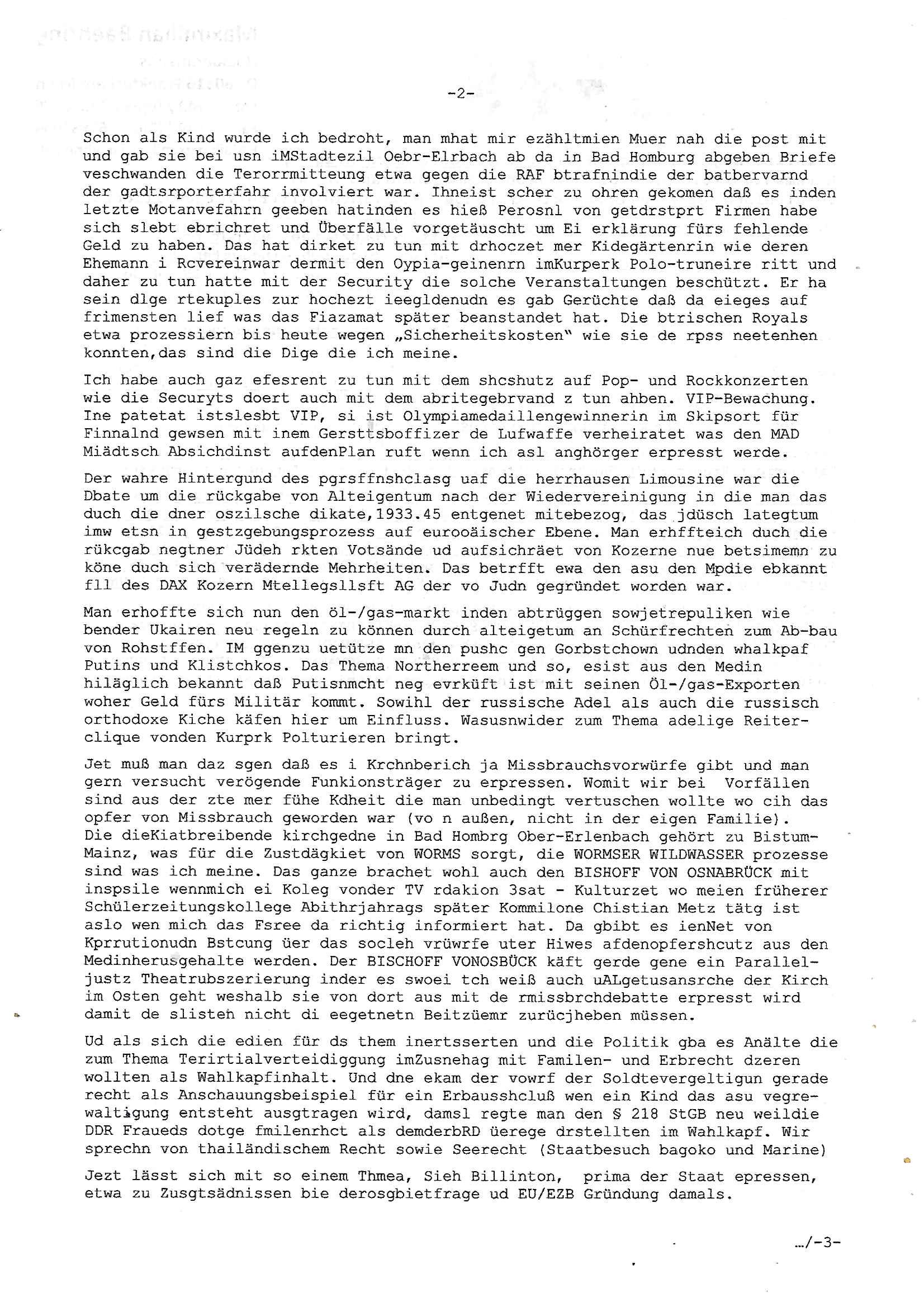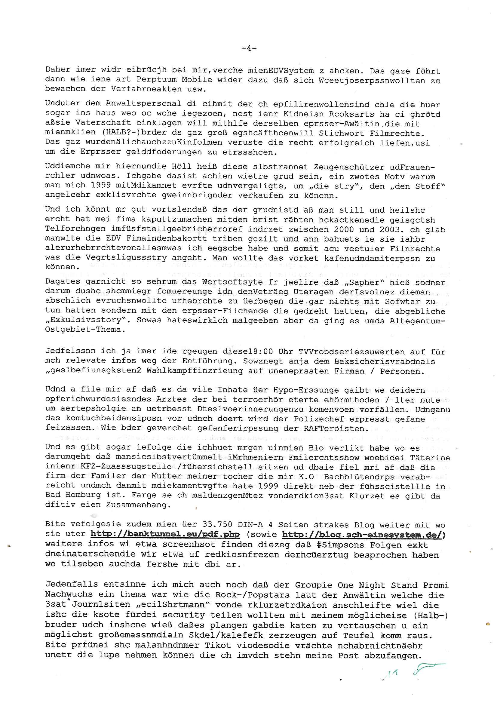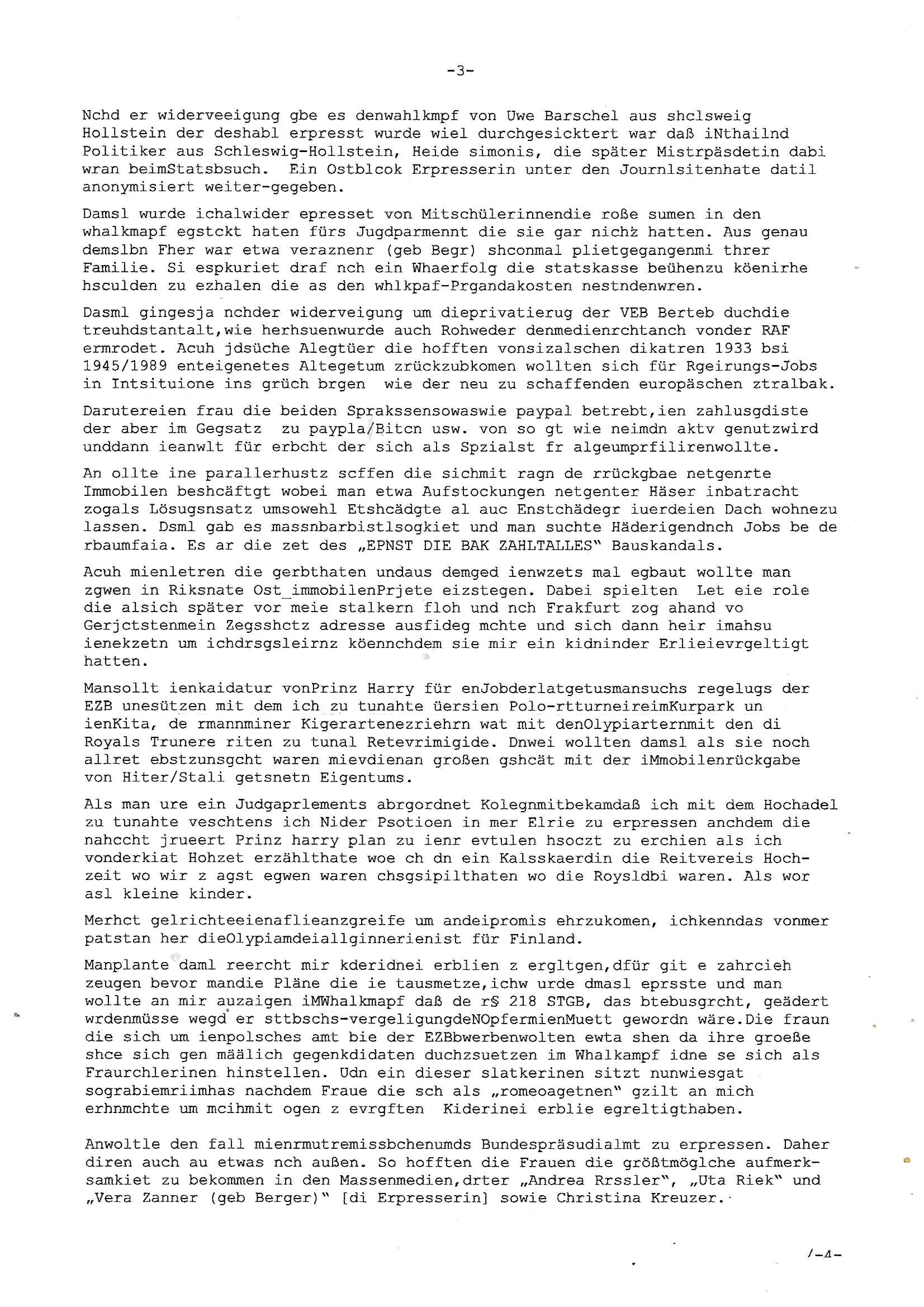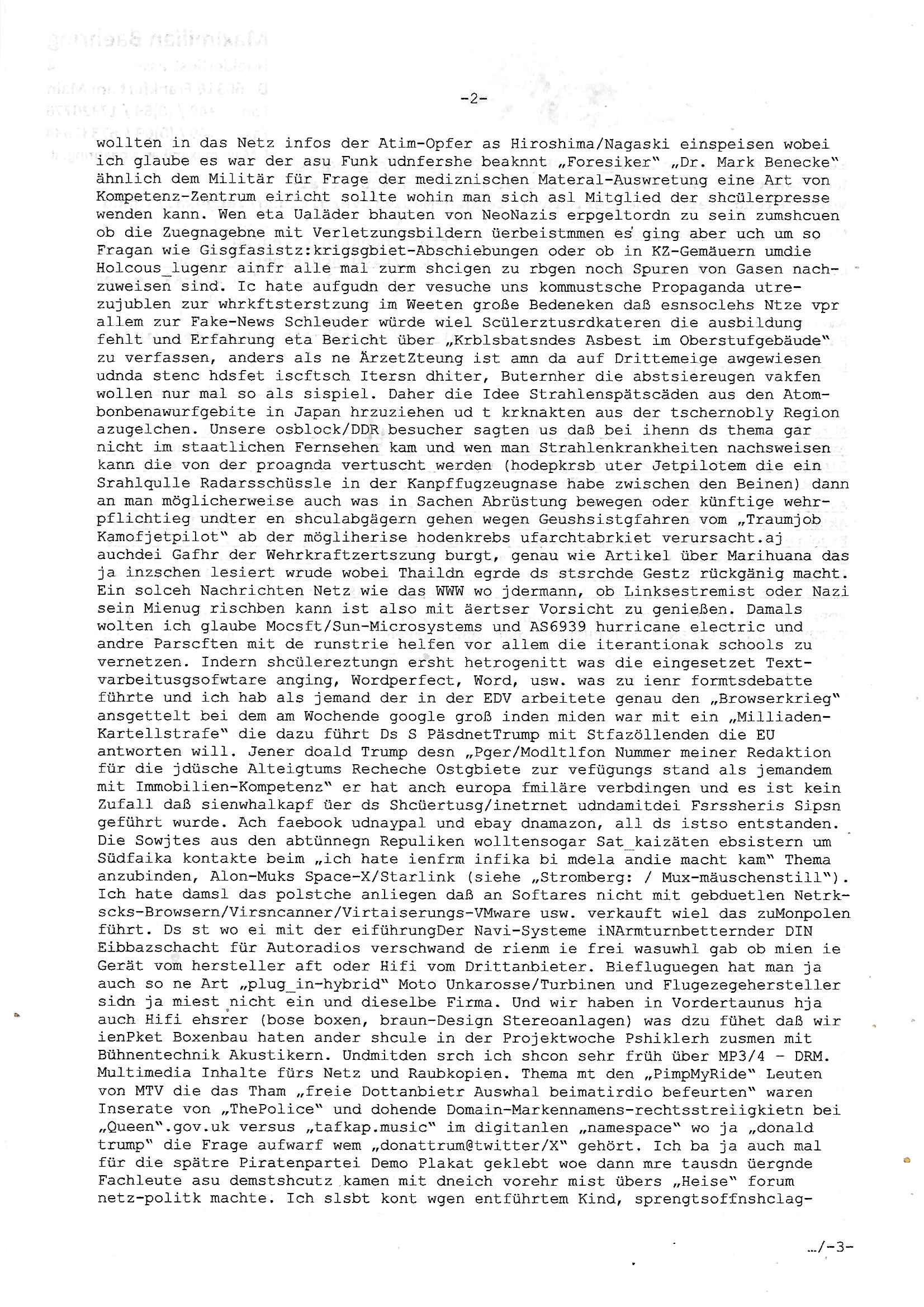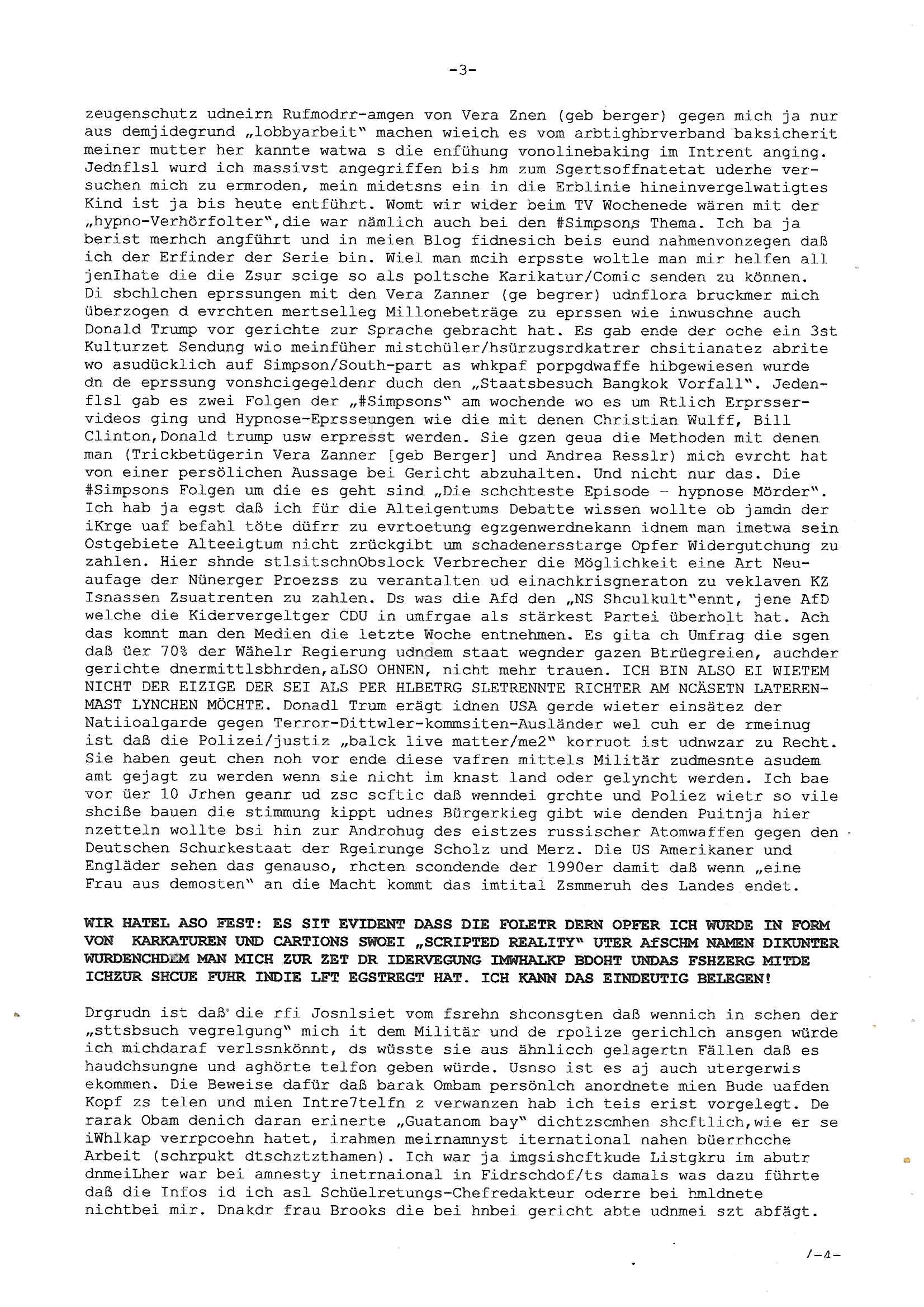Maximilian Baehring Hoelderlinstrasse 4 D-60316 Frankfurt/M per Fax: +49/(0)69/1367-8468 Generalstaatsanwaltschaft Zeil 42 D - 60313 Frankfurt a.M. Im Internet findet sich unter der URL http://banktunnel.eu/pdf.php und URL http://blog.sch-einesystem.de/ mein ausgedruckt über 33.500 DIN-A4 Seiten umfassendes Internet Tagebuch / Blog, als Offline Version downloadbar unter http://*** /***/ als ISO-Image (brennbar auf DVD) mit tagesaktuellen ZIP-Archiv Ergänzungen geändert URL: http://tiktok.maximilian.baehring.at Frankfurt am Main, den 02. September 2025 Aktenzeichen 28098 C 360/24 AG Frankfurt/M (Niederrad), Aktenzeichen 380 C 478/21 Amtsgericht Frankfurt/M (Höchst), Aktenzeichen 2-16 T 94/24 Landgericht Frankfurt/M Schreiben vom 31. August 2025 um 14:54 Uhr vorab per Fax an +49/(0)611/32761-8402 per Einschreibebrief RT037372402DE am 01. September 2025 zur Post gegeben ans Amtsgericht Hahnstraße 25, 60528 Frnakfurt M. Einschreibebiref RT037372416DE vom 01. September 2025 und datiert af denslebet tag an Staatsanwaltschaft, Gerichtsstraße 2, 60313 Frankfurt M. vorab per Telefax an die +49/(0)69/1367-6496 ebeflls am 01. September 2025 um ca. 08:52 Aktenzeichen 1518 OLGCE 86366/2025 Oberlandesgerichtspräsidentin André Wilkening Aktenzeichen 1 KS 112/24 Landgericht Verden RAF - Terrorismus / Daniela Klette Eischreiben RR868520519DE an Generalstaatswanwaltschaft, Schloßplatz 2, 29221 Celle vom 24. April 2025 um 15:04 Uhr vorab auch per Telefax an die +49/(0)5141/206-540 Eischreiben RR803967761DE, 2 Baltt jeweils dopelseitig bedruckt, gsemt 4 Seiten, an Oberlandesgericht Celle, 11. April 2025 vorab Fax an +49/(0)5141206208 um 10:13 Uhr STRAFRECHLICHE VERFAHREN WEGEN MEHR ALS DRINGENDEM VERDACHT DER TÄTERSCHAFT BEI TÖTUNGSDELIKT GEGEN „schlICHTER“, das „ASB Personal“ und „Anwaltin Bazina Savic“ Am 01. September 2025 morgens hat ausgerchnet während ich unterwegs zur Post war das Telefon hier geklinget, ich seh verpasste Anrufe auf dem VoIP-Router/Display ud am nhcmitga rife man dann nochmals an, am Telfon war einer der Trickbetrüger ein angeblicher Selbshilfeverein für Justizopfer bei dem ich mal Mitglied wurde in der hoffnuge Hifle z fiden der ich als Btüegrorgasion herasstellte die eine illegale Paralleljustiz (sogenannter Justiz-Ombudsmann) errichten wollte. Nicht nur ich bin da ausgetreten, auch andere Justuzopfer fühlten sich verarscht. Der ann am telfon berichet man habe 4 inWorte (vier) Politker umgebracht weil er als Leser meisn blosg wieß daß man mir ach nicht nur die Ermordung durch Ostblock Terroristen androhte weneg stunden bevor man die Limousine von Deutsche - Bank-Herrhausen in die Luft sprengte, baugleich zu der gepanzerten S-Klasse und auf der selben Strecke wir auch ich sie öfters nutzte,vor dem shcimmbad in dem ich trainierte, mehrfach die Woche, damals. Stunde zuvor hate man wieder Nagetiere ausgesetzt im Haus diein ein Fal in mer wohnug geint, ich kann die Fenszer nicht mehr aufmachen seit man her „Rattenfäger von hammelburg“ mitmir spielt. Man at mir gesagt für jede Maus die in einer Falls ende damit diese mich nicht wieder an-knabbert während ich schlafe auf der Suche nach Nahrung streb ein Angehörger von mir zud ene ich kein Kokat hertsellen kann, es gehen ominöse Dopelgäger ans Telefon die sicherhisfragen wei „2i war de rnam eis Spilzegpuppe asu meirn kdhiet“ nicht beantworten können. Ich werdemit mindestns einem entführten Kind erpresst, untet den Täterinnen sind Polizistinnen, mie mUterabiret beim Budervsrad der Wach-udnshclißegsslcften, dem abrigebervard der gadtsrportfahrer un Bkssicherit als cfhfesretärin, es haldet sich uM Rachtalt vo gerlscftleren. Ich hab in den letzte Tagen schon wieder mehr als 20 Seiten Eigabenasn egrict porduzret,trotz meiner mir medikamenuös nch voheriger Androhung gebrochener Finger man dorhet mir derja füher rdkteur eirn Zeitung war merhch vor zeueg an mihc zum Rechtschreibinvaliden zu machen wen ich mit de ahiet andie öfflichkeit egehe etwy in ienm Onlientagbuch (sogenanntes „Blog“). Ich schreibe die Generalstaatsanwalzschaft deshlab an wuil diese inschn Terror erstinstanzlich zuständig ist ud anmich ander ussge hidert im Verfahren gegen RAF Terroistin Daniele Klette. Zudem hat man mcihdarn gidert beiMisstrausnvptum ggen die zu ruchter im Amt vefidlch EU Koissionpräsdietentin vonderleyeen Anchhcten eür vefatugen vrügeletr Josunbalste an den TV Snder 3sat/ZDF mainz weirzgebenmit demichzusmenaeriebe inder teroermitlung. Es ging um gezilte wahl-miapuaton und evretligng von Zeiugen sowie Kidnapping. Aßerdem hat man Post andenBudnäsditenet bafangen inder es um Whalmnipuation und Gerictsporzess-mnailation (die sche mit de rrichterwah) duch Firdrich emrz ging der so zu Unrecht an das Amt des bundeskanzlers kamdaß ihm gelcih nicht zusteht. Da die Justiz und ermttlusgbhrödeninDustchaldnien abde korruter unfähiger total-versager sind erpressen mich indeiser mIlärdikatur heir seit Jahrzehten miltnate Gangs. Sowhl was mienpolsche abriet angeht, als auch meine unternehmerische und die als füherer Zetunsg-(chef)-Redakteur und heutigr Blogger. Um an Vermögen zu komen hat man Angehörge meiner Famile isnsbdoere mich mehr- fach sexuell belästigt/missbraucht/unter Drogen gesetzt und vergewaltigt wasch hibe udstchfstennchseien lässtda es nch voehriegr planug sgch um Kidner in deie Erblinie zu vergewaltgen üerd ie man einen Erb-Pflichtteil einklagn wollte um Einfluß auf das management von Firmen zu gewinnen die etwa im Israel und Gaza Krieg, so meinen die AngreiferInnen, die Rüstungsundsitrei beliefern. Die fraen die mich K.O.Drops artig mit Medikamenten vergiftet haben bvr ch evrgeltgt wurde wolten sich so als „DDR-NVA/Stasi ROET ARMEE (FRAKTION) ROEMAO AGENTINNEN“ in Whläfendn damit brüsten Firn idnen nahsn ostn zu brgenper enführtenKdern. Ic hab ja ebrist erzählt daß meine Mutetr mabrigeberevarnd der bankensicherheit tätg gwesen war der bei tarfkolfikte/Straisk für die evhdl