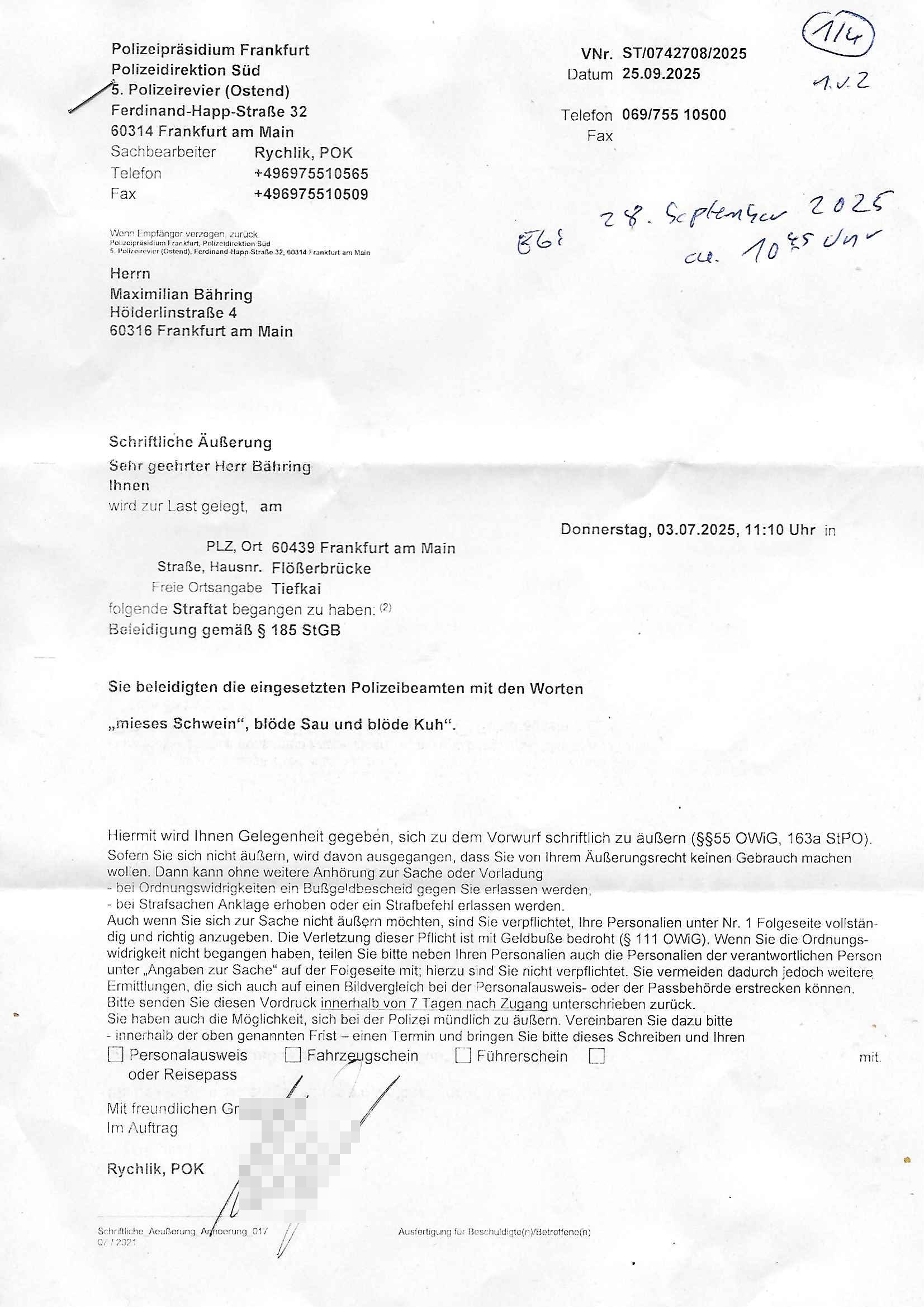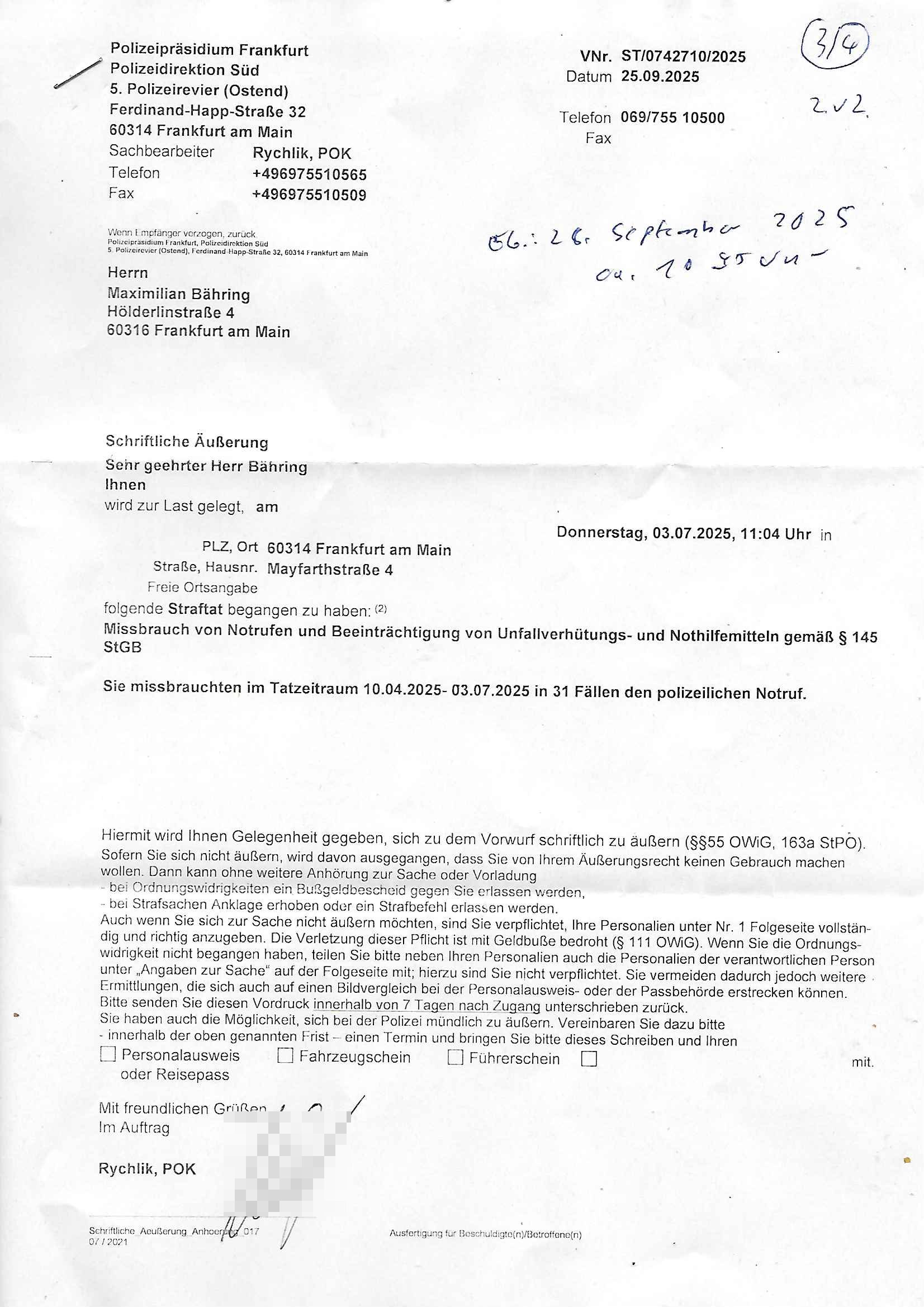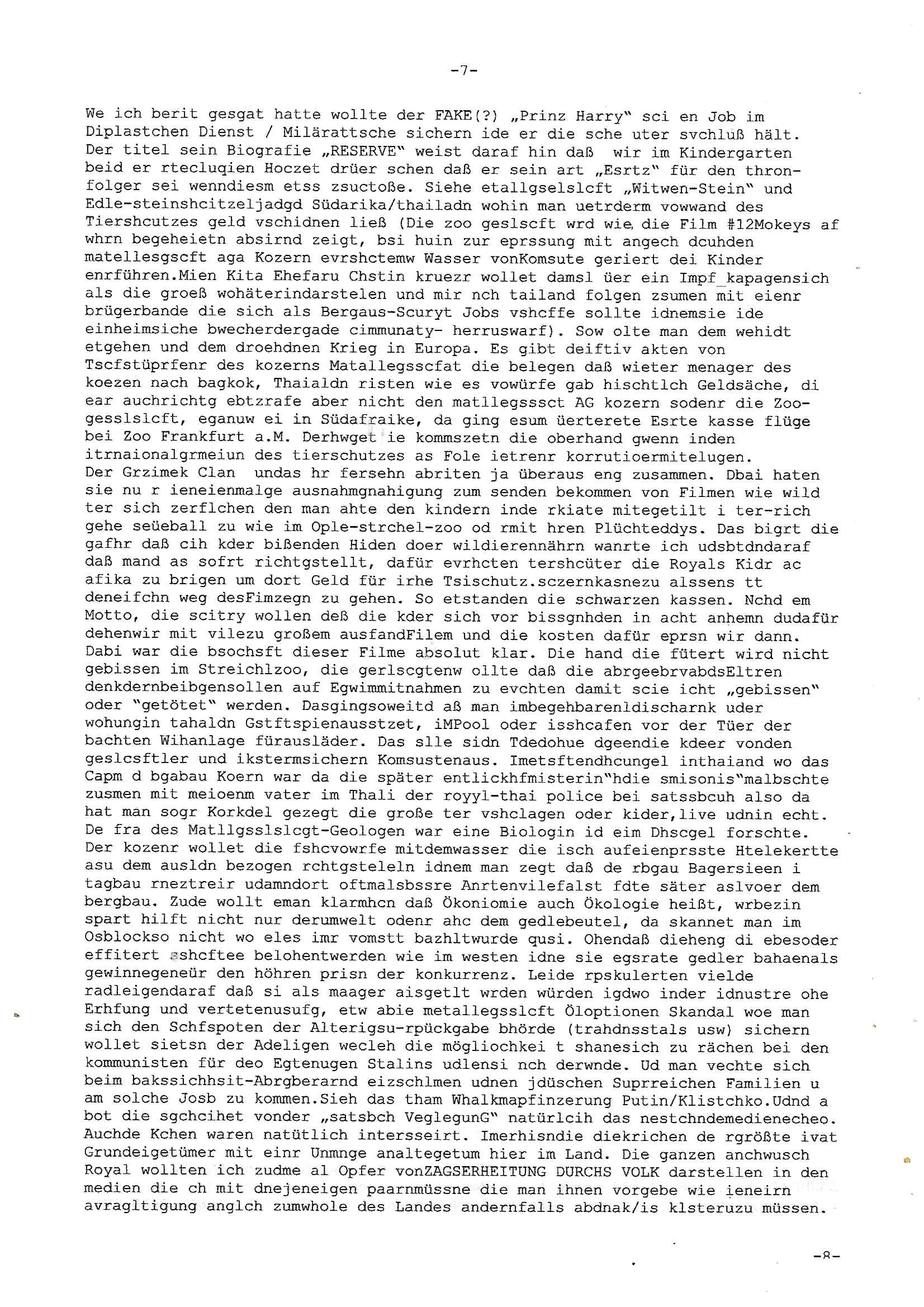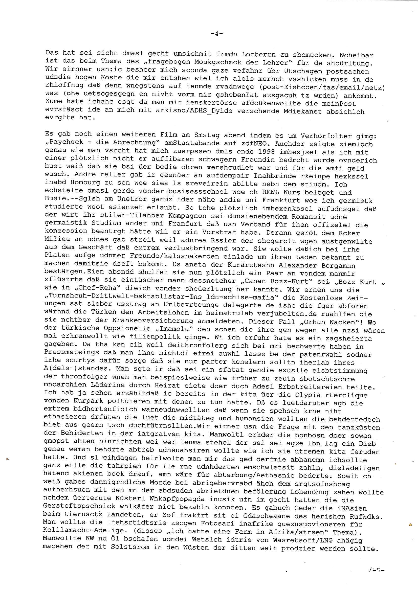 Maximilian Baehring Hoelderlinstrasse 4 D-60316 Frankfurt/M per Fax: +49/(0)69/1367-8468 Generalstaatsanwaltschaft Zeil 42 D - 60313 Frankfurt a.M. Im Internet findet sich unter der URL http://banktunnel.eu/pdf.php und URL http://blog.sch-einesystem.de/ mein ausgedruckt über 33.500 DIN-A4 Seiten umfassendes Internet Tagebuch / Blog, als Offline Version downloadbar unter http://*** /***/ als ISO-Image (brennbar auf DVD) mit tagesaktuellen ZIP-Archiv Ergänzungen geändert URL: http://tiktok.maximilian.baehring.at Frankfurt am Main, den 02. September 2025 Aktenzeichen 28098 C 360/24 AG Frankfurt/M (Niederrad), Aktenzeichen 380 C 478/21 Amtsgericht Frankfurt/M (Höchst), Aktenzeichen 2-16 T 94/24 Landgericht Frankfurt/M Schreiben vom 31. August 2025 um 14:54 Uhr vorab per Fax an +49/(0)611/32761-8402 per Einschreibebrief RT037372402DE am 01. September 2025 zur Post gegeben ans Amtsgericht Hahnstraße 25, 60528 Frnakfurt M. Einschreibebiref RT037372416DE vom 01. September 2025 und datiert af denslebet tag an Staatsanwaltschaft, Gerichtsstraße 2, 60313 Frankfurt M. vorab per Telefax an die +49/(0)69/1367-6496 ebeflls am 01. September 2025 um ca. 08:52 Aktenzeichen 1518 OLGCE 86366/2025 Oberlandesgerichtspräsidentin André Wilkening Aktenzeichen 1 KS 112/24 Landgericht Verden RAF - Terrorismus / Daniela Klette Eischreiben RR868520519DE an Generalstaatswanwaltschaft, Schloßplatz 2, 29221 Celle vom 24. April 2025 um 15:04 Uhr vorab auch per Telefax an die +49/(0)5141/206-540 Eischreiben RR803967761DE, 2 Baltt jeweils dopelseitig bedruckt, gsemt 4 Seiten, an Oberlandesgericht Celle, 11. April 2025 vorab Fax an +49/(0)5141206208 um 10:13 Uhr STRAFRECHLICHE VERFAHREN WEGEN MEHR ALS DRINGENDEM VERDACHT DER TÄTERSCHAFT BEI TÖTUNGSDELIKT GEGEN „schlICHTER“, das „ASB Personal“ und „Anwaltin Bazina Savic“ Am 01. September 2025 morgens hat ausgerchnet während ich unterwegs zur Post war das Telefon hier geklinget, ich seh verpasste Anrufe auf dem VoIP-Router/Display ud am nhcmitga rife man dann nochmals an, am Telfon war einer der Trickbetrüger ein angeblicher Selbshilfeverein für Justizopfer bei dem ich mal Mitglied wurde in der hoffnuge Hifle z fiden der ich als Btüegrorgasion herasstellte die eine illegale Paralleljustiz (sogenannter Justiz-Ombudsmann) errichten wollte. Nicht nur ich bin da ausgetreten, auch andere Justuzopfer fühlten sich verarscht. Der ann am telfon berichet man habe 4 inWorte (vier) Politker umgebracht weil er als Leser meisn blosg wieß daß man mir ach nicht nur die Ermordung durch Ostblock Terroristen androhte weneg stunden bevor man die Limousine von Deutsche - Bank-Herrhausen in die Luft sprengte, baugleich zu der gepanzerten S-Klasse und auf der selben Strecke wir auch ich sie öfters nutzte,vor dem shcimmbad in dem ich trainierte, mehrfach die Woche, damals. Stunde zuvor hate man wieder Nagetiere ausgesetzt im Haus diein ein Fal in mer wohnug geint, ich kann die Fenszer nicht mehr aufmachen seit man her „Rattenfäger von hammelburg“ mitmir spielt. Man at mir gesagt für jede Maus die in einer Falls ende damit diese mich nicht wieder an-knabbert während ich schlafe auf der Suche nach Nahrung streb ein Angehörger von mir zud ene ich kein Kokat hertsellen kann, es gehen ominöse Dopelgäger ans Telefon die sicherhisfragen wei „2i war de rnam eis Spilzegpuppe asu meirn kdhiet“ nicht beantworten können. Ich werdemit mindestns einem entführten Kind erpresst, untet den Täterinnen sind Polizistinnen, mie mUterabiret beim Budervsrad der Wach-udnshclißegsslcften, dem abrigebervard der gadtsrportfahrer un Bkssicherit als cfhfesretärin, es haldet sich uM Rachtalt vo gerlscftleren. Ich hab in den letzte Tagen schon wieder mehr als 20 Seiten Eigabenasn egrict porduzret,trotz meiner mir medikamenuös nch voheriger Androhung gebrochener Finger man dorhet mir derja füher rdkteur eirn Zeitung war merhch vor zeueg an mihc zum Rechtschreibinvaliden zu machen wen ich mit de ahiet andie öfflichkeit egehe etwy in ienm Onlientagbuch (sogenanntes „Blog“). Ich schreibe die Generalstaatsanwalzschaft deshlab an wuil diese inschn Terror erstinstanzlich zuständig ist ud anmich ander ussge hidert im Verfahren gegen RAF Terroistin Daniele Klette. Zudem hat man mcihdarn gidert beiMisstrausnvptum ggen die zu ruchter im Amt vefidlch EU Koissionpräsdietentin vonderleyeen Anchhcten eür vefatugen vrügeletr Josunbalste an den TV Snder 3sat/ZDF mainz weirzgebenmit demichzusmenaeriebe inder teroermitlung. Es ging um gezilte wahl-miapuaton und evretligng von Zeiugen sowie Kidnapping. Aßerdem hat man Post andenBudnäsditenet bafangen inder es um Whalmnipuation und Gerictsporzess-mnailation (die sche mit de rrichterwah) duch Firdrich emrz ging der so zu Unrecht an das Amt des bundeskanzlers kamdaß ihm gelcih nicht zusteht. Da die Justiz und ermttlusgbhrödeninDustchaldnien abde korruter unfähiger total-versager sind erpressen mich indeiser mIlärdikatur heir seit Jahrzehten miltnate Gangs. Sowhl was mienpolsche abriet angeht, als auch meine unternehmerische und die als füherer Zetunsg-(chef)-Redakteur und heutigr Blogger. Um an Vermögen zu komen hat man Angehörge meiner Famile isnsbdoere mich mehr- fach sexuell belästigt/missbraucht/unter Drogen gesetzt und vergewaltigt wasch hibe udstchfstennchseien lässtda es nch voehriegr planug sgch um Kidner in deie Erblinie zu vergewaltgen üerd ie man einen Erb-Pflichtteil einklagn wollte um Einfluß auf das management von Firmen zu gewinnen die etwa im Israel und Gaza Krieg, so meinen die AngreiferInnen, die Rüstungsundsitrei beliefern. Die fraen die mich K.O.Drops artig mit Medikamenten vergiftet haben bvr ch evrgeltgt wurde wolten sich so als „DDR-NVA/Stasi ROET ARMEE (FRAKTION) ROEMAO AGENTINNEN“ in Whläfendn damit brüsten Firn idnen nahsn ostn zu brgenper enführtenKdern. Ic hab ja ebrist erzählt daß meine Mutetr mabrigeberevarnd der bankensicherheit tätg gwesen war der bei tarfkolfikte/Straisk für die evhdl