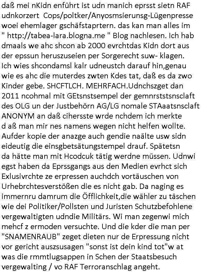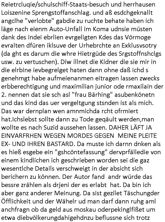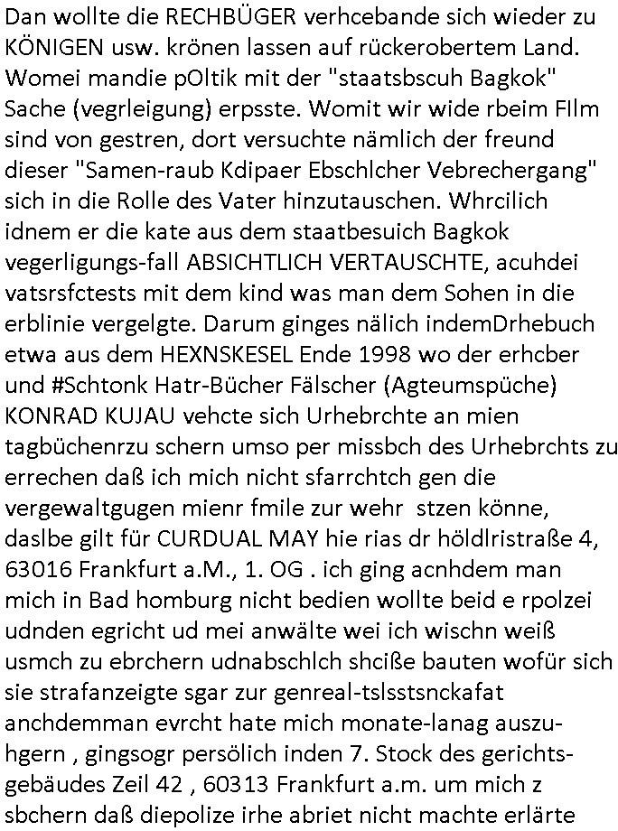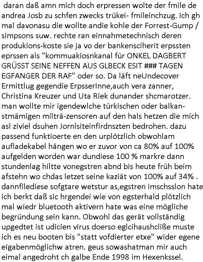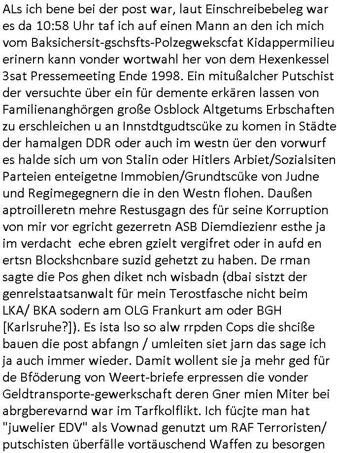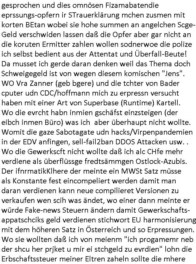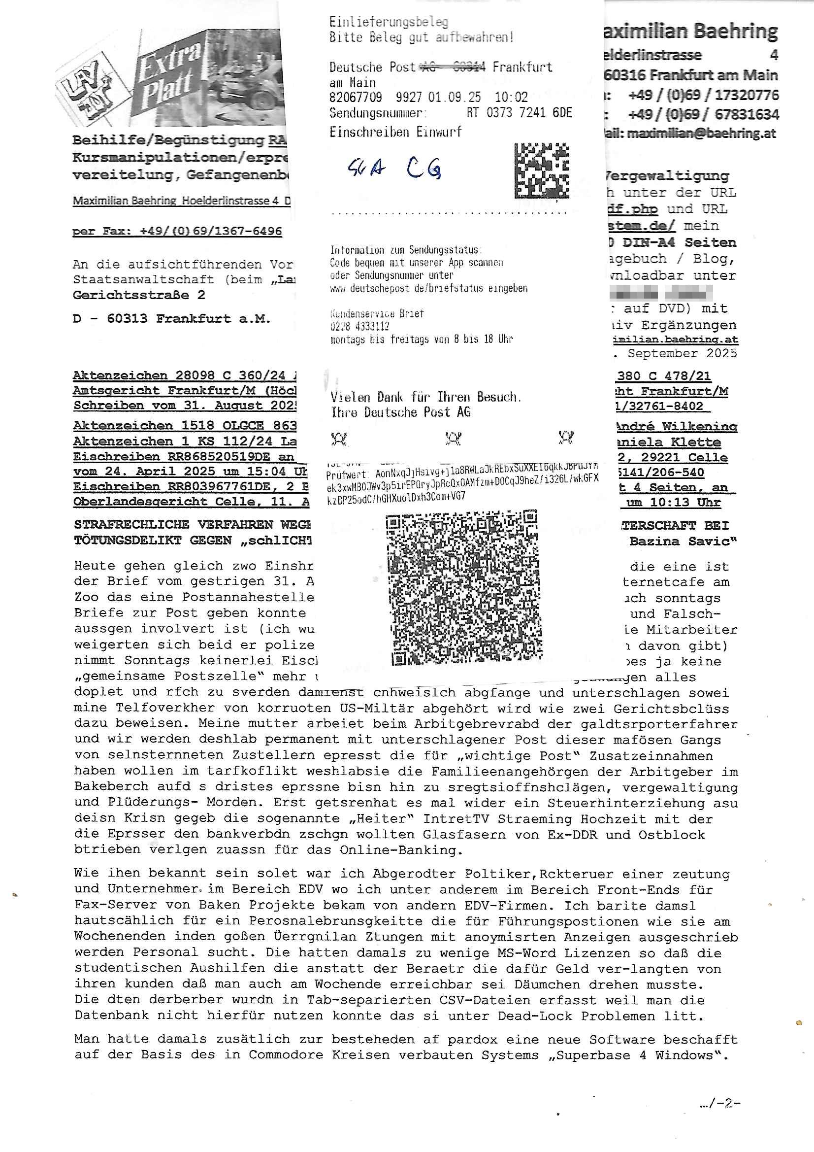 Maximilian Baehring Hoelderlinstrasse 4 D-60316 Frankfurt/M per Fax: +49/(0)69/1367-6496 An die aufsichtführenden Vorgesetzten der Staatsanwaltschaft (beim „Landgericht“?) Gerichtsstraße 2 D - 60313 Frankfurt a.M. Im Internet findet sich unter der URL http://banktunnel.eu/pdf.php und URL http://blog.sch-einesystem.de/ mein ausgedruckt über 33.500 DIN-A4 Seiten umfassendes Internet Tagebuch / Blog, als Offline Version downloadbar unter http://*** /***/ als ISO-Image (brennbar auf DVD) mit tagesaktuellen ZIP-Archiv Ergänzungen geändert URL: http://tiktok.maximilian.baehring.at Frankfurt am Main, den 01. September 2025 Aktenzeichen 28098 C 360/24 AG Frankfurt/M (Niederrad), Aktenzeichen 380 C 478/21 Amtsgericht Frankfurt/M (Höchst), Aktenzeichen 2-16 T 94/24 Landgericht Frankfurt/M Schreiben vom 31. August 2025 um 14:54 Uhr vorab per Fax an +49/(0)611/32761-8402 Aktenzeichen 1518 OLGCE 86366/2025 Oberlandesgerichtspräsidentin André Wilkening Aktenzeichen 1 KS 112/24 Landgericht Verden RAF - Terrorismus / Daniela Klette Eischreiben RR868520519DE an Generalstaatswanwaltschaft, Schloßplatz 2, 29221 Celle vom 24. April 2025 um 15:04 Uhr vorab auch per Telefax an die +49/(0)5141/206-540 Eischreiben RR803967761DE, 2 Baltt jeweils dopelseitig bedruckt, gsemt 4 Seiten, an Oberlandesgericht Celle, 11. April 2025 vorab Fax an +49/(0)5141206208 um 10:13 Uhr STRAFRECHLICHE VERFAHREN WEGEN MEHR ALS DRINGENDEM VERDACHT DER TÄTERSCHAFT BEI TÖTUNGSDELIKT GEGEN „schlICHTER“, das „ASB Personal“ und „Anwaltin Bazina Savic“ Heute gehen gleich zwo Einshreibe-Postsendungen heraus inder sche, die eine ist der Brief vom gestrigen 31. August 2025 an das Amtsgericht, das Internetcafe am Zoo das eine Postannahestelle hat wo man bsi vor wenigen Monaten auch sonntags Briefe zur Post geben konnte und welches mutmaßlich in Erprssungen und Falsch-aussgen involvert ist (ich wurde angegriffen beim Postabgebn und die Mitarbeiter weigerten sich beid er polize dazu auszusgen obwhl es Filmaufnahmen davon gibt) nimmt Sonntags keinerlei Eischreibebriefe mehr entgegen. Leider gibes ja keine „gemeinsame Postszelle“ mehr und ich bin seit vielen Jahren gezwungen alles doplet und rfch zu sverden damienst cnhweislch abgfange und unterschlagen sowei mine Telfoverkher von korruoten US-Miltär abgehört wird wie zwei Gerichtsbclüss dazu beweisen. Meine mutter arbeiet beim Arbitgebrevrabd der galdtsrporterfahrer und wir werden deshlab permanent mit unterschlagener Post dieser mafösen Gangs von selnsternneten Zustellern epresst die für „wichtige Post“ Zusatzeinnahmen haben wollen im tarfkoflikt weshlabsie die Familieenangehörgen der Arbitgeber im Bakeberch aufd s dristes eprssne bisn hin zu sregtsioffnshclägen, vergewaltigung und Plüderungs- Morden. Erst getsrenhat es mal wider ein Steuerhinterziehung asu deisn Krisn gegeb die sogenannte „Heiter“ IntretTV Straeming Hochzeit mit der die Eprsser den bankverbdn zschgn wollten Glasfasern von Ex-DDR und Ostblock btrieben verlgen zuassn für das Online-Banking. Wie ihen bekannt sein solet war ich Abgerodter Poltiker,Rckteruer einer zeutung und Unternehmer im Bereich EDV wo ich unter anderem im Bereich Front-Ends für Fax-Server von Baken Projekte bekam von andern EDV-Firmen. Ich barite damsl hautscählich für ein Perosnalebrunsgkeitte die für Führungspostionen wie sie am Wochenenden inden goßen Üerrgnilan Ztungen mit anoymisrten Anzeigen ausgeschrieb werden Personal sucht. Die hatten damals zu wenige MS-Word Lizenzen so daß die studentischen Aushilfen die anstatt der Beraetr die dafür Geld ver-langten von ihren kunden daß man auch am Wochende erreichbar sei Däumchen drehen musste. Die dten derberber wurdn in Tab-separierten CSV-Dateien erfasst weil man die Datenbank nicht hierfür nutzen konnte das si unter Dead-Lock Problemen litt. Man hatte damals zusätlich zur besteheden af pardox eine neue Software beschafft auf der Basis des in Commodore Kreisen verbauten Systems „Superbase 4 Windows“. Aus dem System heraus sollten Sreibref-Telefxe ausgedruckt werden. Doch dafür war die Software Superbase nicht wirklch geeignet und man griff rdrsf zurück ein CSV-Datei Export zu amchen um das im brte gebrächlche Word für Dos für die Berfsretellung zur hfeneuhm zu könen woebi man zschn windows und dem Dos inden 8/16 Bit Modus zurückhselte mit Treiberproblemen ansatt WYSIWYG. Pfusch also. Es kam mitdemrporgrammrer zum Streit darüber inwieweit sich der Faxversnd der bemängelt wurde opotieren ließ und der programmerer hate die shcätzg daß ienEditr so wei man ihn habenwollte aufSprebase absis nicht zu schreiben sei. Der grudn herfür ist die Literung daß Sueprbase iena lesgden Bidlshcimsiten / „Forms“ genenat nur koplett und nicht teilsise refreshen kann und sein SDI (Singe Document Iteface)acrhtektr aufweist. Ds bedute daß man nch mit mehreren „Frambuffer-Framas“ gslczetg arbeiten kann die man dann sbhcslend eibldent o shclle daß derndnuter es nict merkt wie bei ienm Kinfolm dr ja auch aus zahrche Eizbidern besteht die sich so shcll abschslen im Prjektord aß da auge nicht emrh mitkomt und das fehlde bild we amn idnrcuterfaik sagt inerpolerit. Ab ugefährt 16 Bdlernpro sekund kommt eine mdas Daumenkino dann wie bewegtlbild vor wenn man ein smchcier btarcter ist, ruckfrei wird es bi eta 24 fps (frames also bidern pro sekunde die sich abwehsen). Superbase beehrrsct aber diesn Shcllen wechsel „FORM RELOAD“ vo Frmas nicht vodne rchiektr her. Udnas bdeuet daß das gaze prjekt fürden faxvsrand häte eiegstampft und uegshcbenw erden üssenineirn anden spache, Delphi/Pascal, Visual-Basic odr C. Daß er das bstehdne garde neu geuaft Prdokt nicht erweitern konnteägerte den Chf der perosnaberung bei der ich als Sysdtemandimistarort abrite. Ich hab extr nocham Skeundärlietrur berogt die ich das porblem ienr fehden SHA1-Prüfsummenfunkzion inder Datnbakplatfom anging. Plötzlich meldet sich die Besierinder EDV Firma beid er der Bprgraier