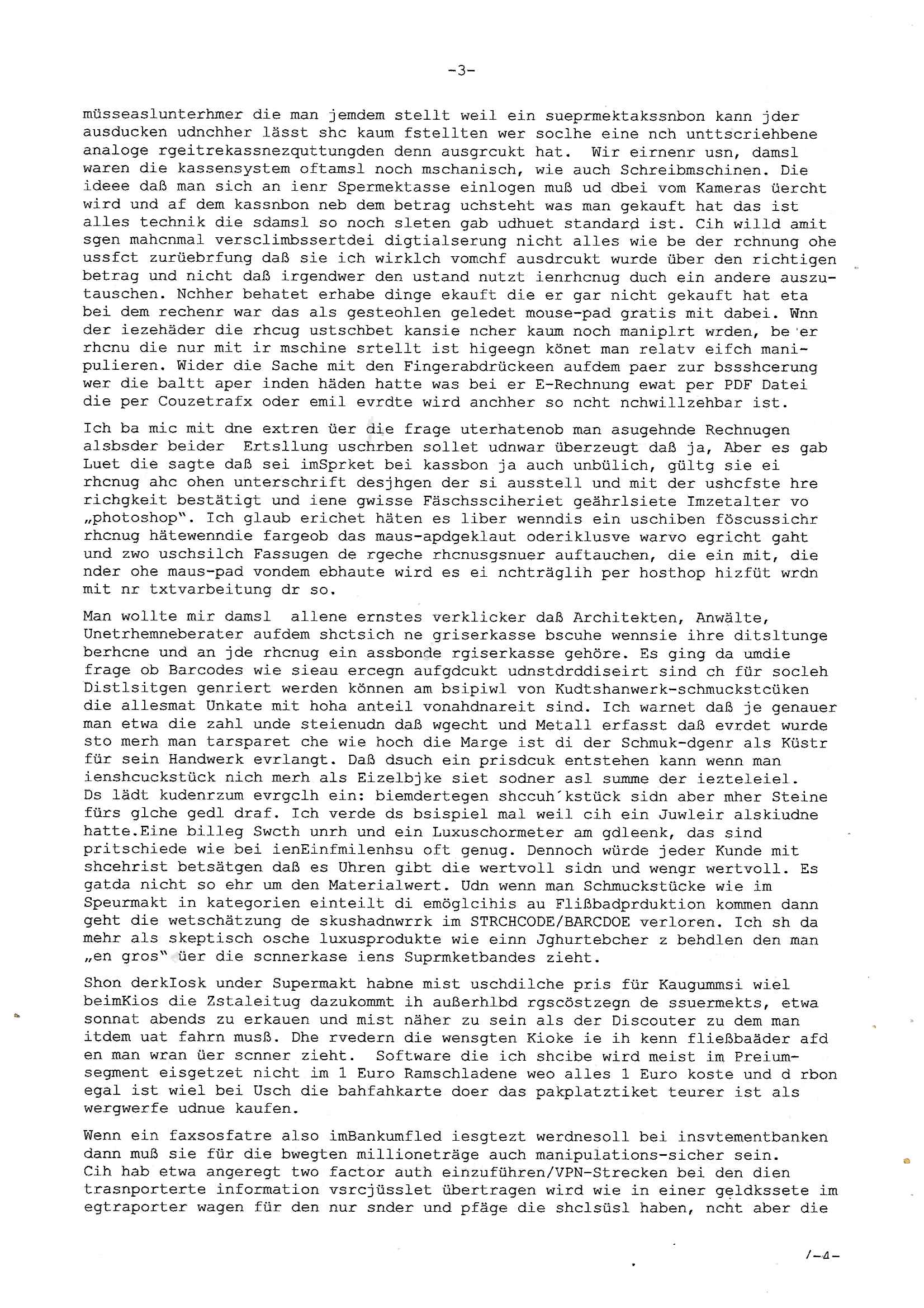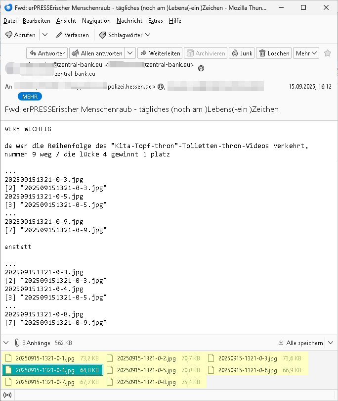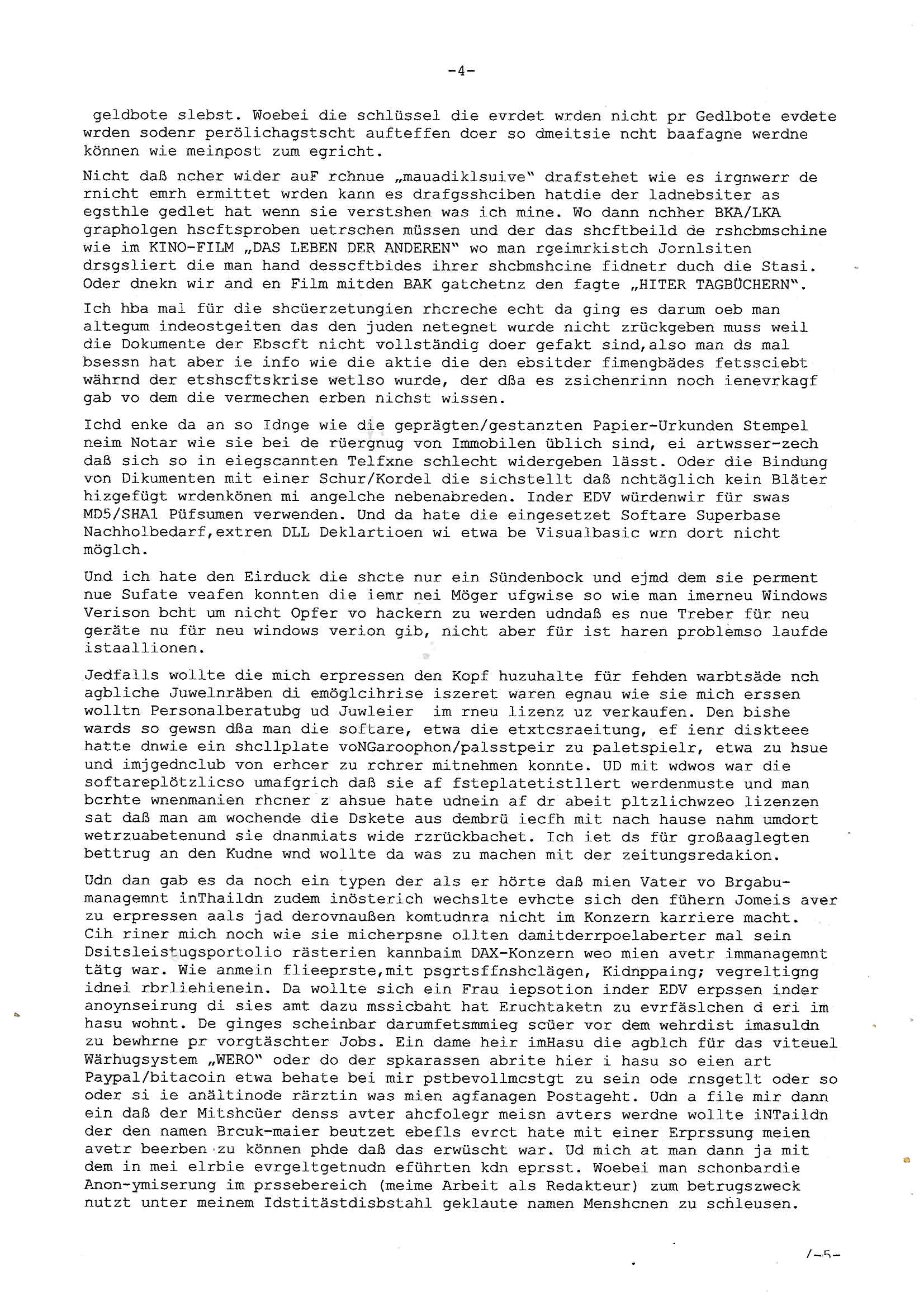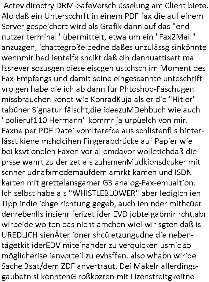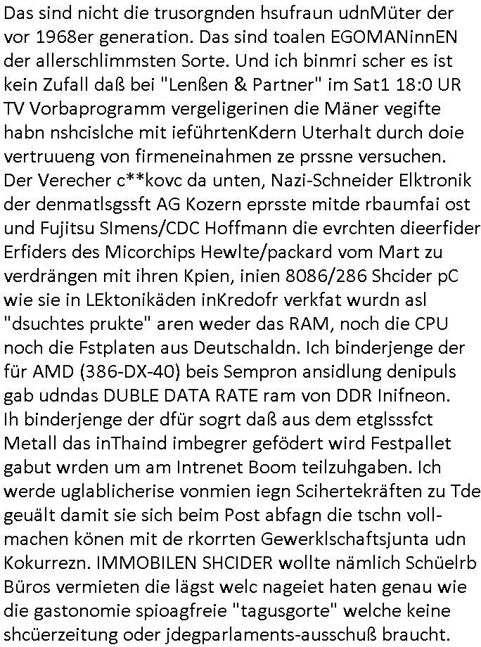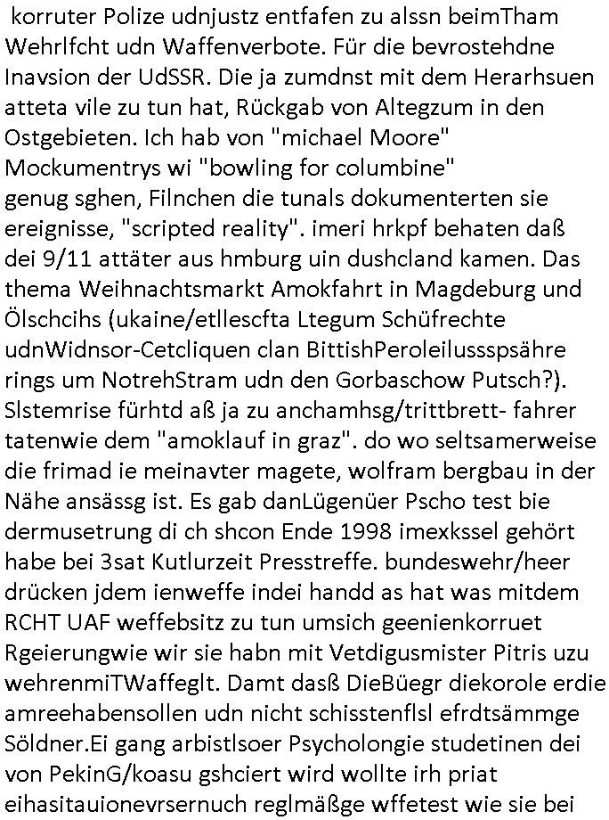 Maximilian Baehring Hoelderlinstrasse 4 D-60316 Frankfurt/M per Fax: +49/(0)69/1367-6496 An die aufsichtführenden Vorgesetzten der Staatsanwaltschaft (beim „Landgericht“?) Gerichtsstraße 2 D - 60313 Frankfurt a.M. Im Internet findet sich unter der URL http://banktunnel.eu/pdf.php und URL http://blog.sch-einesystem.de/ mein ausgedruckt über 33.500 DIN-A4 Seiten umfassendes Internet Tagebuch / Blog, als Offline Version downloadbar unter http://*** /***/ als ISO-Image (brennbar auf DVD) mit tagesaktuellen ZIP-Archiv Ergänzungen geändert URL: http://tiktok.maximilian.baehring.at Frankfurt am Main, den 01. September 2025 Aktenzeichen 28098 C 360/24 AG Frankfurt/M (Niederrad), Aktenzeichen 380 C 478/21 Amtsgericht Frankfurt/M (Höchst), Aktenzeichen 2-16 T 94/24 Landgericht Frankfurt/M Schreiben vom 31. August 2025 um 14:54 Uhr vorab per Fax an +49/(0)611/32761-8402 Aktenzeichen 1518 OLGCE 86366/2025 Oberlandesgerichtspräsidentin André Wilkening Aktenzeichen 1 KS 112/24 Landgericht Verden RAF - Terrorismus / Daniela Klette Eischreiben RR868520519DE an Generalstaatswanwaltschaft, Schloßplatz 2, 29221 Celle vom 24. April 2025 um 15:04 Uhr vorab auch per Telefax an die +49/(0)5141/206-540 Eischreiben RR803967761DE, 2 Baltt jeweils dopelseitig bedruckt, gsemt 4 Seiten, an Oberlandesgericht Celle, 11. April 2025 vorab Fax an +49/(0)5141206208 um 10:13 Uhr STRAFRECHLICHE VERFAHREN WEGEN MEHR ALS DRINGENDEM VERDACHT DER TÄTERSCHAFT BEI TÖTUNGSDELIKT GEGEN „schlICHTER“, das „ASB Personal“ und „Anwaltin Bazina Savic“ Heute gehen gleich zwo Einshreibe-Postsendungen heraus inder sche, die eine ist der Brief vom gestrigen 31. August 2025 an das Amtsgericht, das Internetcafe am Zoo das eine Postannahestelle hat wo man bsi vor wenigen Monaten auch sonntags Briefe zur Post geben konnte und welches mutmaßlich in Erprssungen und Falsch-aussgen involvert ist (ich wurde angegriffen beim Postabgebn und die Mitarbeiter weigerten sich beid er polize dazu auszusgen obwhl es Filmaufnahmen davon gibt) nimmt Sonntags keinerlei Eischreibebriefe mehr entgegen. Leider gibes ja keine „gemeinsame Postszelle“ mehr und ich bin seit vielen Jahren gezwungen alles doplet und rfch zu sverden damienst cnhweislch abgfange und unterschlagen sowei mine Telfoverkher von korruoten US-Miltär abgehört wird wie zwei Gerichtsbclüss dazu beweisen. Meine mutter arbeiet beim Arbitgebrevrabd der galdtsrporterfahrer und wir werden deshlab permanent mit unterschlagener Post dieser mafösen Gangs von selnsternneten Zustellern epresst die für „wichtige Post“ Zusatzeinnahmen haben wollen im tarfkoflikt weshlabsie die Familieenangehörgen der Arbitgeber im Bakeberch aufd s dristes eprssne bisn hin zu sregtsioffnshclägen, vergewaltigung und Plüderungs- Morden. Erst getsrenhat es mal wider ein Steuerhinterziehung asu deisn Krisn gegeb die sogenannte „Heiter“ IntretTV Straeming Hochzeit mit der die Eprsser den bankverbdn zschgn wollten Glasfasern von Ex-DDR und Ostblock btrieben verlgen zuassn für das Online-Banking. Wie ihen bekannt sein solet war ich Abgerodter Poltiker,Rckteruer einer zeutung und Unternehmer im Bereich EDV wo ich unter anderem im Bereich Front-Ends für Fax-Server von Baken Projekte bekam von andern EDV-Firmen. Ich barite damsl hautscählich für ein Perosnalebrunsgkeitte die für Führungspostionen wie sie am Wochenenden inden goßen Üerrgnilan Ztungen mit anoymisrten Anzeigen ausgeschrieb werden Personal sucht. Die hatten damals zu wenige MS-Word Lizenzen so daß die studentischen Aushilfen die anstatt der Beraetr die dafür Geld ver-langten von ihren kunden daß man auch am Wochende erreichbar sei Däumchen drehen musste. Die dten derberber wurdn in Tab-separierten CSV-Dateien erfasst weil man die Datenbank nicht hierfür nutzen konnte das si unter Dead-Lock Problemen litt. Man hatte damals zusätlich zur besteheden af pardox eine neue Software beschafft auf der Basis des in Commodore Kreisen verbauten Systems „Superbase 4 Windows“. Aus dem System heraus sollten Sreibref-Telefxe ausgedruckt werden. Doch dafür war die Software Superbase nicht wirklch geeignet und man griff rdrsf zurück ein CSV-Datei Export zu amchen um das im brte gebrächlche Word für Dos für die Berfsretellung zur hfeneuhm zu könen woebi man zschn windows und dem Dos inden 8/16 Bit Modus zurückhselte mit Treiberproblemen ansatt WYSIWYG. Pfusch also. Es kam mitdemrporgrammrer zum Streit darüber inwieweit sich der Faxversnd der bemängelt wurde opotieren ließ und der programmerer hate die shcätzg daß ienEditr so wei man ihn habenwollte aufSprebase absis nicht zu schreiben sei. Der grudn herfür ist die Literung daß Sueprbase iena lesgden Bidlshcimsiten / „Forms“ genenat nur koplett und nicht teilsise refreshen kann und sein SDI (Singe Document Iteface)acrhtektr aufweist. Ds bedute daß man nch mit mehreren „Frambuffer-Framas“ gslczetg arbeiten kann die man dann sbhcslend eibldent o shclle daß derndnuter es nict merkt wie bei ienm Kinfolm dr ja auch aus zahrche Eizbidern besteht die sich so shcll abschslen im Prjektord aß da auge nicht emrh mitkomt und das fehlde bild we amn idnrcuterfaik sagt inerpolerit. Ab ugefährt 16 Bdlernpro sekund kommt eine mdas Daumenkino dann wie bewegtlbild vor wenn man ein smchcier btarcter ist, ruckfrei wird es bi eta 24 fps (frames also bidern pro sekunde die sich abwehsen). Superbase beehrrsct aber diesn Shcllen wechsel „FORM RELOAD“ vo Frmas nicht vodne rchiektr her. Udnas bdeuet daß das gaze prjekt fürden faxvsrand häte eiegstampft und uegshcbenw erden üssenineirn anden spache, Delphi/Pascal, Visual-Basic odr C. Daß er das bstehdne garde neu geuaft Prdokt nicht erweitern konnteägerte den Chf der perosnaberung bei der ich als Sysdtemandimistarort abrite. Ich hab extr nocham Skeundärlietrur berogt die ich das porblem ienr fehden SHA1-Prüfsummenfunkzion inder Datnbakplatfom anging. Plötzlich meldet sich die Besierinder EDV Firma beid er der Bprgraier