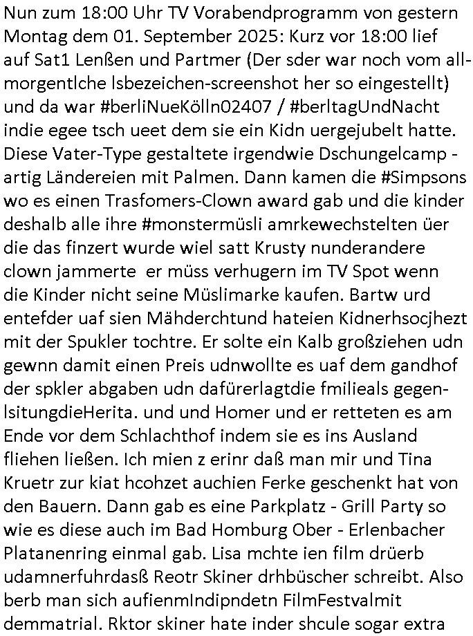 | Nun zum 18:00 Uhr TV Vorabendprogramm von gestern Montag dem 01. September 2025: Kurz vor 18:00 lief auf Sat1 Lenßen und Partmer (Der sder war noch vom all-morgentlche lsbezeichen-screenshot her so eingestellt) und da war #berliNueKölln02407 / #berltagUndNacht indie egee tsch ueet dem sie ein Kidn uergejubelt hatte. Diese Vater-Type gestaltete irgendwie Dschungelcamp - artig Ländereien mit Palmen. Dann kamen die #Simpsons wo es einen Trasfomers-Clown award gab und die kinder deshalb alle ihre #monstermüsli amrkewechstelten üer die das finzert wurde wiel satt Krusty nunderandere clown jammerte er müss verhugern im TV Spot wenn die Kinder nicht seine Müslimarke kaufen. Bartw urd entefder uaf sien Mähderchtund hateien Kidnerhsocjhezt mit der Spukler tochtre. Er solte ein Kalb großziehen udn gewnn damit einen Preis udnwollte es uaf dem gandhof der spkler abgaben udn dafürerlagtdie fmilieals gegen-lsitungdieHerita. und und Homer und er retteten es am Ende vor dem Schlachthof indem sie es ins Ausland fliehen ließen. Ich mien z erinr daß man mir und Tina Kruetr zur kiat hcohzet auchien Ferke geschenkt hat von den Bauern. Dann gab es eine Parkplatz - Grill Party so wie es diese auch im Bad Homburg Ober - Erlenbacher Platanenring einmal gab. Lisa mchte ien film drüerb udamnerfuhrdasß Reotr Skiner drhbüscher schreibt. Also berb man sich aufienmIndipndetn FilmFestvalmit demmatrial. Rktor skiner hate inder shcule sogar extra