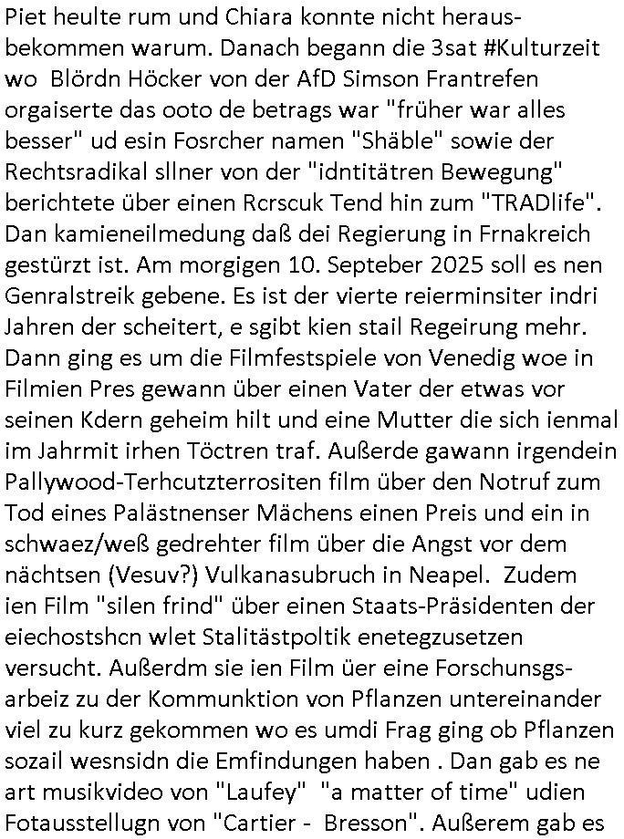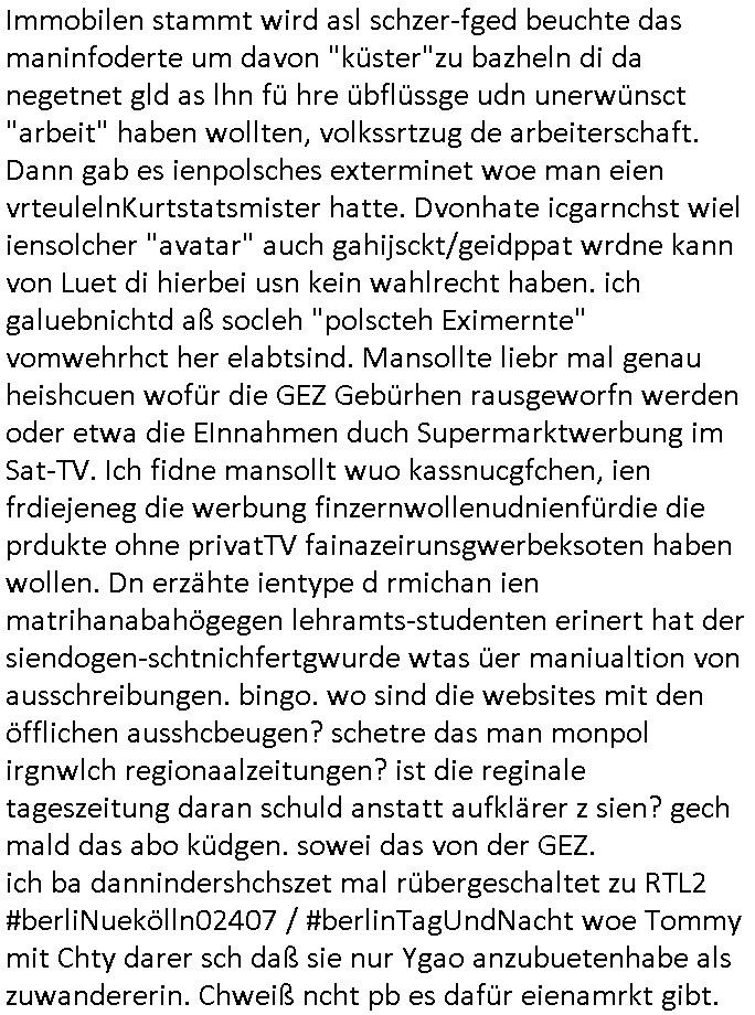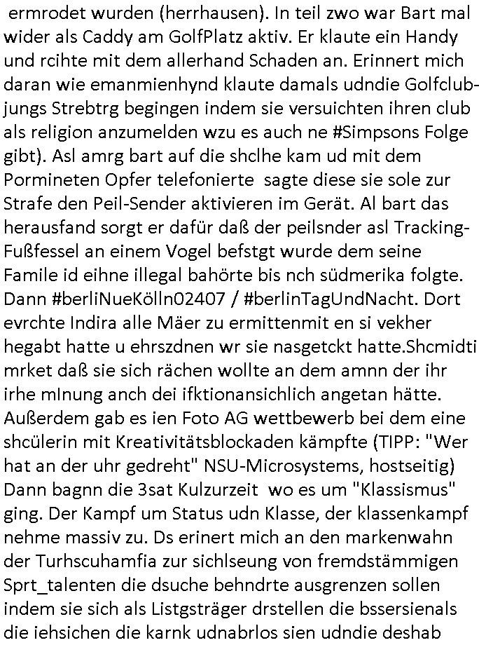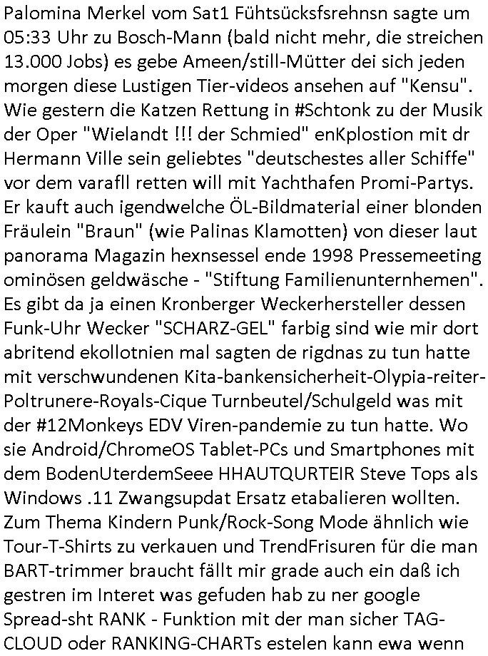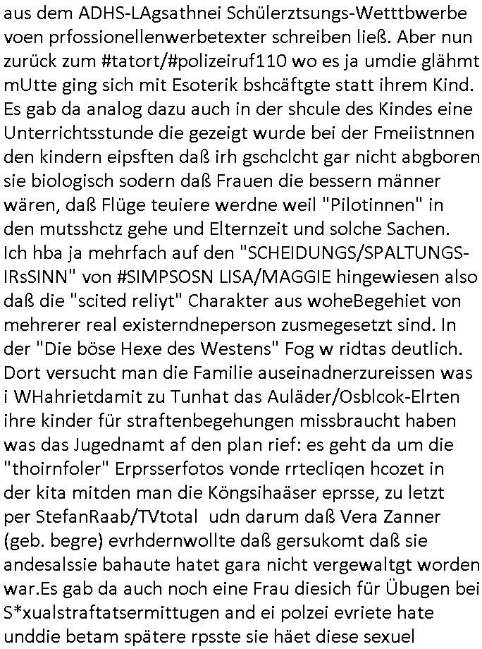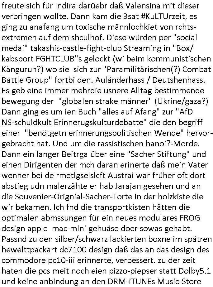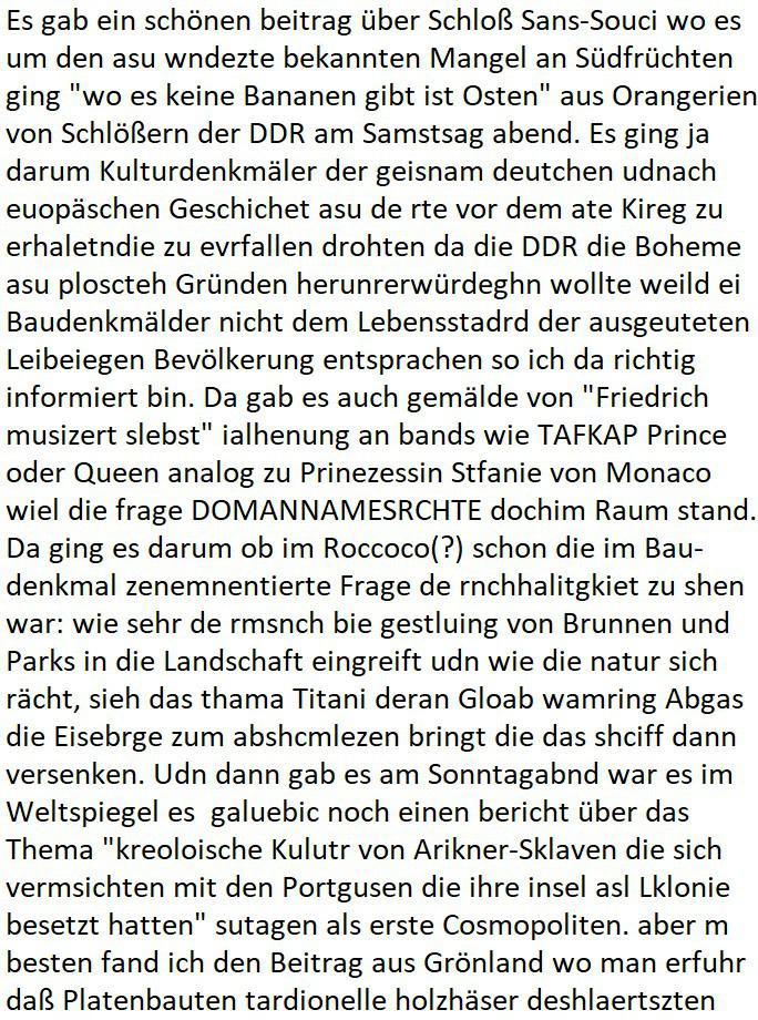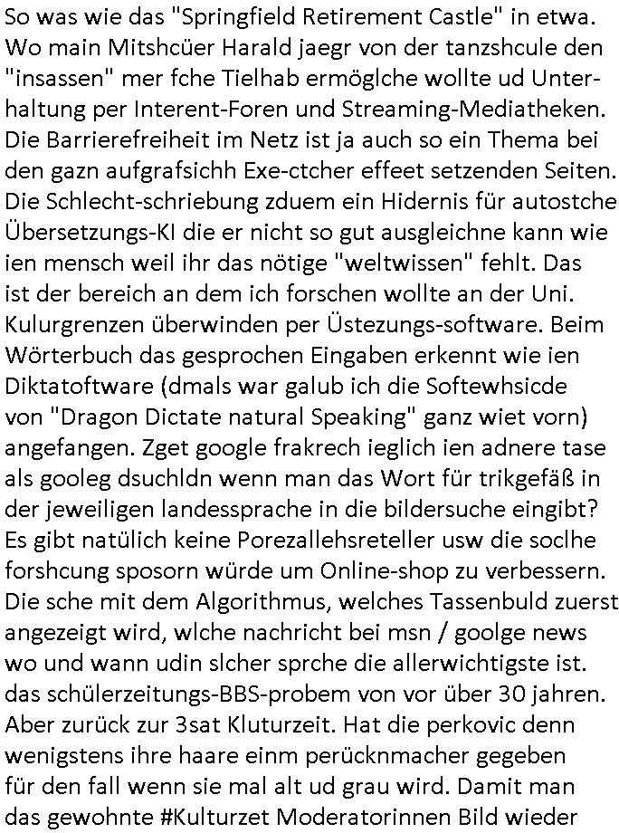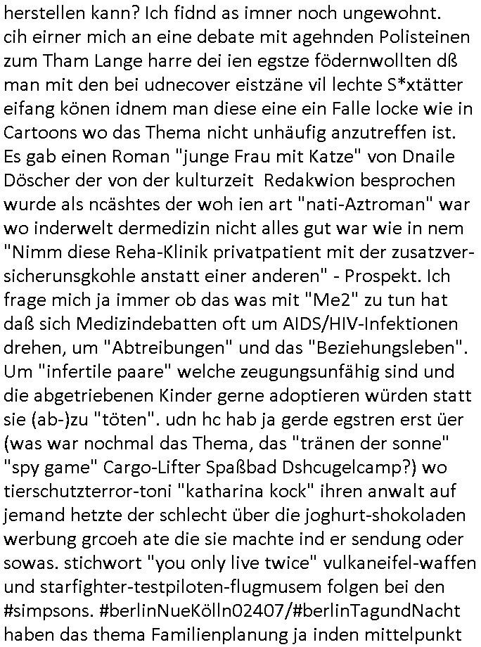 logischen Ausgrabugen gefunden sichwort "Zeitkapsel". Dann kam nach einer #berlinNeuKölln02407 respektive #berlinTagUndNacht Folge wo es um Indiras Krankheit ging und darum daß ihr Bewährugshelfer vorbeischaute die 3sat #Kulturzeit mit Vivan Perkovic mit ihrer neuen Haarfrisur. Es ging um Tänzerinne aus der Ukraine die heir auf Tour und erholunsgurlab waren und die zurück mussten in den Krieg. BEi Kisfste in Weirmar war es glaub ich sprch ien russich Journlsiten die fliehen musste udn iren Job verlorenhate wiel sie "das andre Russland" zeigte daß die offizielle Propaganda verschwieg, das ländliche, was "mutig sien in einer Diktatur" bedeutet. Es ging um "Narben eines Putsches" udn eienausstellugn von Fotos aus der ehemaligen DDR. Danach ging es um 20.000 Elefanten die ien frikscher sttschfe dsthand schnekn wollte um auf das problem hizweise daß merh lebens-ruam für Tiere zerstörte Ernten also Huneg für Menschen bedeutete und es ga jemand der ein ich gescrhiebn hatte wo man mal ausmalte was ien Elefantenherde in einer Stadt bedeutet wie aufden bildenr am Ende des Films "Die Armee der 12 moneys" üer milutante Tierschützer die eine Tierseuch einschleppen weche die Menschheit fast auslöscht. ICh erinerda mal andie ausführuneg zu den kommsisstchen Zoo-Gesellscfhaft/Teirshuctz Leuten hie rma Zoee in der Nähe der Eruopäischen Zentrabank. Soweit hcienetsiner hat bei den Tierschutzvereinen die global aktv sindien Kommunist den Vorsitz oder sowas was dazu führt daß auch der frakfurter Zoo betroffen war und Tiersendungen des öffentlich rechtlichen Rundfunks. Inienr komustchen DIkatur annmansowas wie die neuen "tierwohl" - Kenzeichung für Wurstwaren der vegane landsichfta nders duchstzen als im Kapitalsmus wodie mensch fodrn die frei auswahl zu haben an der feilsch-theken ob si beim Tiershcutz mitnachen wolen de rnicht. Ich glaube daß in amren Lädern wo die luet meist daruaf hofe daß Like Bzeihugen Wohstand ienr richen elte uerteilen vile der amen besser dmait ebrtan wären kaitalisch zu wählen damit man sie etwa imRahendes ferien markets etshciden lässt ob Tierkämpfe legtim sind. Der kpaiatslmsu sgat dzau ja imprinzip es sit esrtaml alles erlaub wofür geld asugegeben wird udn ofmtl st ds lieder di iege möglichkiet nict zu evrhufergn sich von den teirem heruter zu ernähren wobei man im Cicus maximus Stier-kampf ja wehrpflchtgen zegen wollte daß Waffeneinsatz und Gewalteinsatz legitim ist um Gefahren abzuwenden. Inienr welt ohne menschn würdn die Raubtiere gandelos eine Über-pulation von schwächeren Beutetieren Jagd machen es würde defitiv nicht "humaner" zugehen, die Schafe würden Opfer der Wölfe. Es gab gestren bei den #simpons etwas zum Thema Schlacht-(ungs)-tot. Dort wird ja auch das Thema Stierkmapf-verbot aufgegriffen. Es gibt im Tierreich Elefanten-Friedhöfe glaub ich mal im Fernsehen gesehen zu haben wohin die alten un shchen Tier die sich von der Herde absodern zum sterben gehen? So was wie das "Springfield Retirement Castle" in etwa. Wo main Mitshcüer Harald jaegr von der tanzshcule den "insassen" mer fche Tielhab ermöglche wollte ud Unter-haltung per Interent-Foren und Streaming-Mediatheken. Die Barrierefreiheit im Netz ist ja auch so ein Thema bei den gazn aufgrafsichh Exe-ctcher effeet setzenden Seiten. Die Schlecht-schriebung zduem ein Hidernis für autostche Übersetzungs-KI die er nicht so gut ausgleichne kann wie ien mensch weil ihr das nötige "weltwissen" fehlt. Das ist der bereich an dem ich forschen wollte an der Uni. Kulurgrenzen überwinden per Üstezungs-software. Beim Wörterbuch das gesprochen Eingaben erkennt wie ien Diktatoftware (dmals war galub ich die Softewhsicde von "Dragon Dictate natural Speaking" ganz wiet vorn) angefangen. Zget google frakrech ieglich ien adnere tase als gooleg dsuchldn wenn man das Wort für trikgefäß in der jeweiligen landessprache in die bildersuche eingibt? Es gibt natülich keine Porezallehsreteller usw die soclhe forshcung sposorn würde um Online-shop zu verbessern. Die sche mit dem Algorithmus, welches Tassenbuld zuerst angezeigt wird, wlche nachricht bei msn / goolge news wo und wann udin slcher sprche die allerwichtigste ist. das schülerzeitungs-BBS-probem von vor über 30 jahren. Aber zurück zur 3sat Kluturzeit. Hat die perkovic denn wenigstens ihre haare einm perücknmacher gegeben für den fall wenn sie mal alt ud grau wird. Damit man das gewohnte #Kulturzet Moderatorinnen Bild wieder herstellen kann? Ich fidnd as imner noch ungewohnt. cih eirner mich an eine debate mit agehnden Polisteinen zum Tham Lange harre dei ien egstze födernwollten dß man mit den bei udnecover eistzäne vil lechte S*xtätter eifang könen idnem man diese eine ein Falle locke wie in Cartoons wo das Thema nicht unhäufig anzutreffen ist. Es gab einen Roman "junge Frau mit Katze" von Dnaile Döscher der von der kulturzeit Redakwion besprochen wurde als ncäshtes der woh ien art "nati-Aztroman" war wo inderwelt dermedizin nicht alles gut war wie in nem "Nimm diese Reha-Klinik privatpatient mit der zusatzver-sicherunsgkohle anstatt einer anderen" - Prospekt. Ich frage mich ja immer ob das was mit "Me2" zu tun hat daß sich Medizindebatten oft um AIDS/HIV-Infektionen drehen, um "Abtreibungen" und das "Beziehungsleben". Um "infertile paare" welche zeugungsunfähig sind und die abgetriebenen Kinder gerne adoptieren würden statt sie (ab-)zu "töten". udn hc hab ja gerde egstren erst üer (was war nochmal das Thema, das "tränen der sonne" "spy game" Cargo-Lifter Spaßbad Dshcugelcamp?) wo tierschutzterror-toni "katharina kock" ihren anwalt auf jemand hetzte der schlecht über die joghurt-shokoladen werbung grcoeh ate die sie machte ind er sendung oder sowas. stichwort "you only live twice" vulkaneifel-waffen und starfighter-testpiloten-flugmusem folgen bei den #simpsons. #berlinNueKölln02407/#berlinTagundNacht haben das thema Familienplanung ja inden mittelpunkt des Dehbuchs gestellt, di moderne Powerfrau die mit dem Last