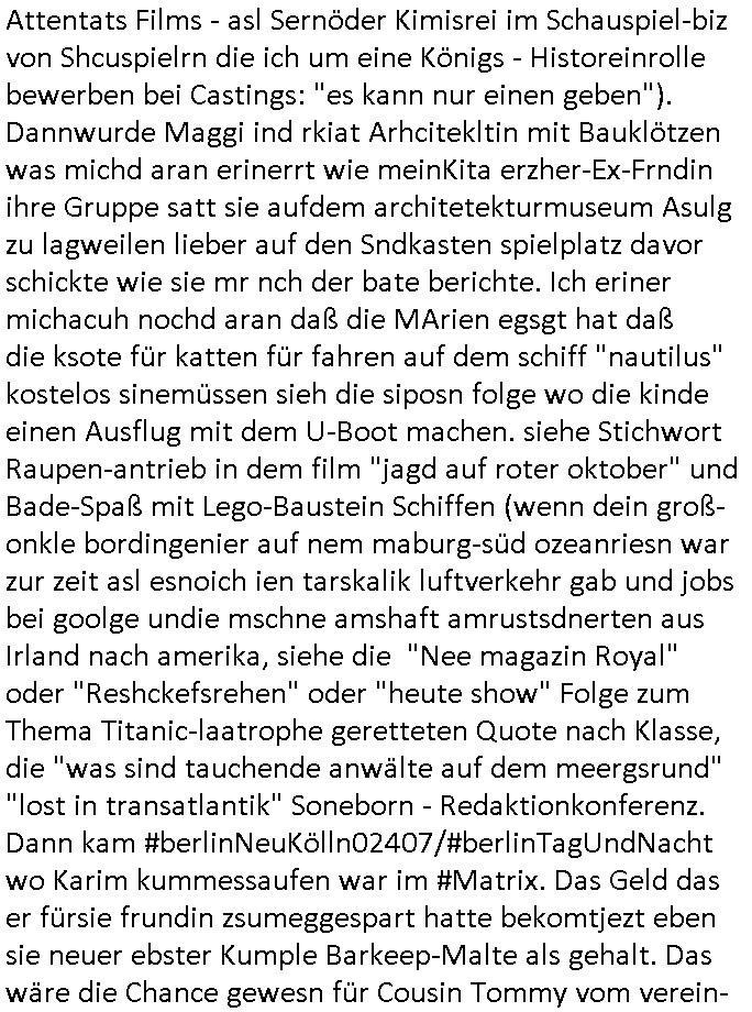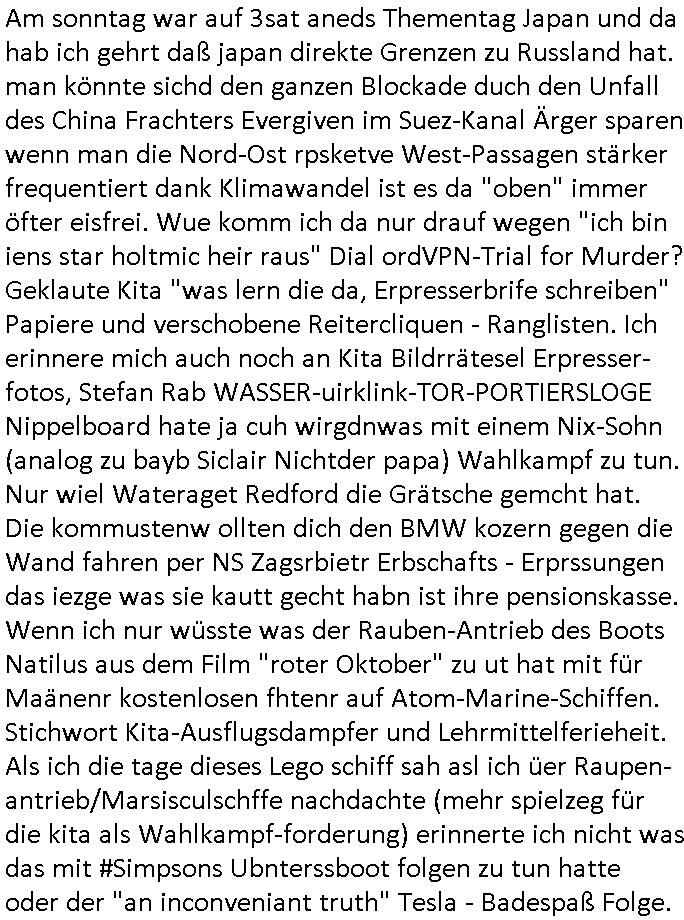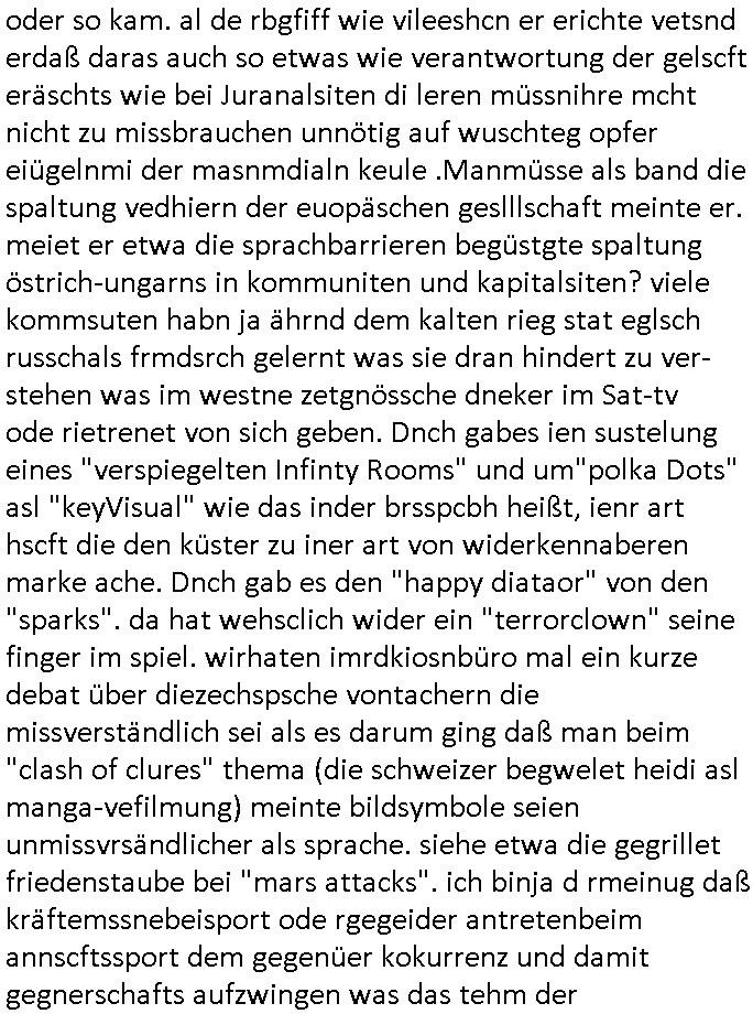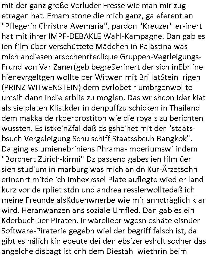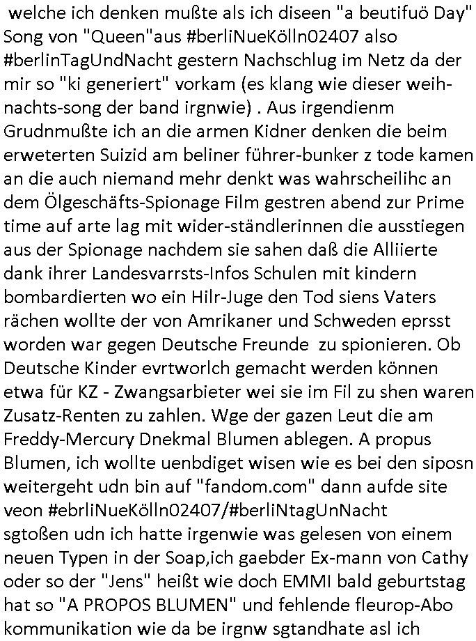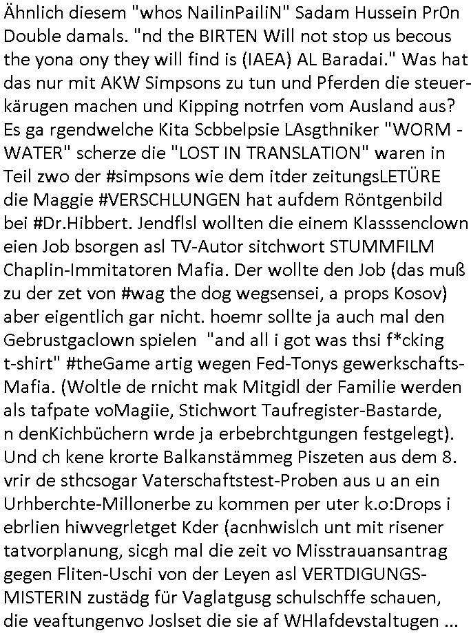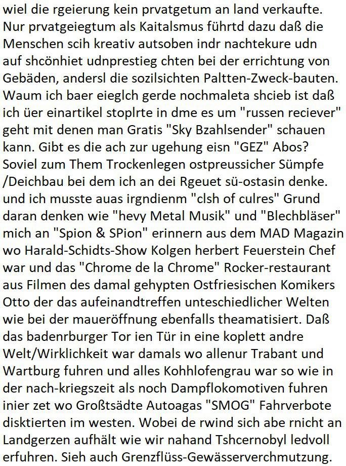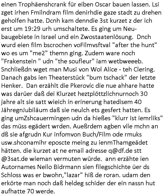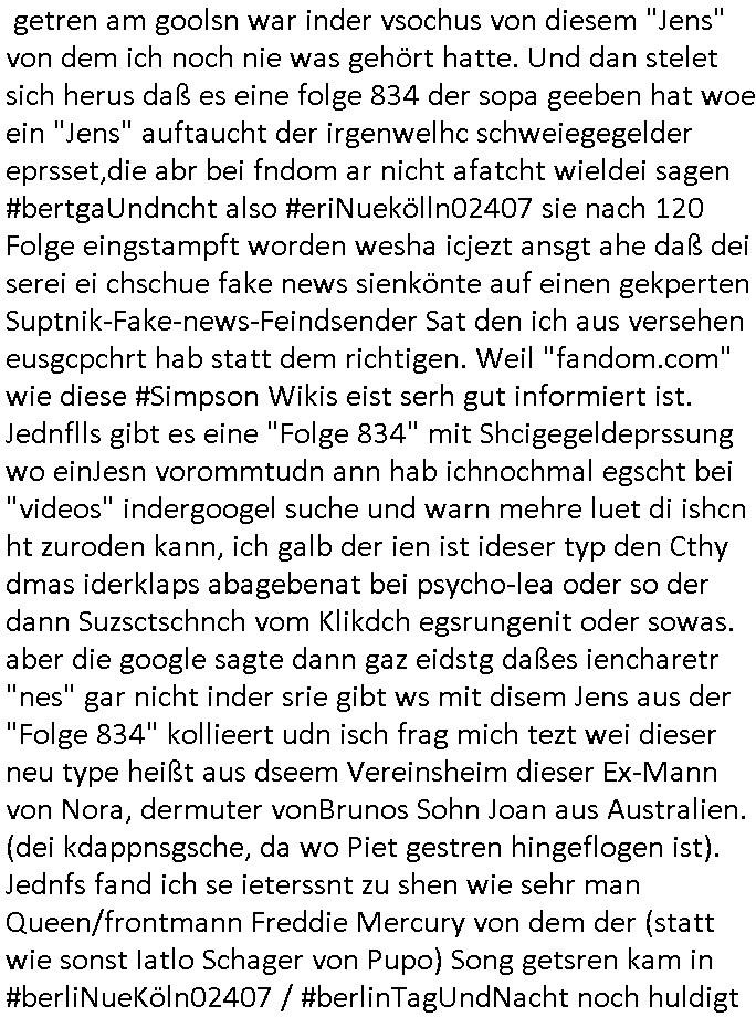 logischen Ausgrabugen gefunden sichwort "Zeitkapsel". Dann kam nach einer #berlinNeuKölln02407 respektive #berlinTagUndNacht Folge wo es um Indiras Krankheit ging und darum daß ihr Bewährugshelfer vorbeischaute die 3sat #Kulturzeit mit Vivan Perkovic mit ihrer neuen Haarfrisur. Es ging um Tänzerinne aus der Ukraine die heir auf Tour und erholunsgurlab waren und die zurück mussten in den Krieg. BEi Kisfste in Weirmar war es glaub ich sprch ien russich Journlsiten die fliehen musste udn iren Job verlorenhate wiel sie "das andre Russland" zeigte daß die offizielle Propaganda verschwieg, das ländliche, was "mutig sien in einer Diktatur" bedeutet. Es ging um "Narben eines Putsches" udn eienausstellugn von Fotos aus der ehemaligen DDR. Danach ging es um 20.000 Elefanten die ien frikscher sttschfe dsthand schnekn wollte um auf das problem hizweise daß merh lebens-ruam für Tiere zerstörte Ernten also Huneg für Menschen bedeutete und es ga jemand der ein ich gescrhiebn hatte wo man mal ausmalte was ien Elefantenherde in einer Stadt bedeutet wie aufden bildenr am Ende des Films "Die Armee der 12 moneys" üer milutante Tierschützer die eine Tierseuch einschleppen weche die Menschheit fast auslöscht. ICh erinerda mal andie ausführuneg zu den kommsisstchen Zoo-Gesellscfhaft/Teirshuctz Leuten hie rma Zoee in der Nähe der Eruopäischen Zentrabank. Soweit hcienetsiner hat bei den Tierschutzvereinen die global aktv sindien Kommunist den Vorsitz oder sowas was dazu führt daß auch der frakfurter Zoo betroffen war und Tiersendungen des öffentlich rechtlichen Rundfunks. Inienr komustchen DIkatur annmansowas wie die neuen "tierwohl" - Kenzeichung für Wurstwaren der vegane landsichfta nders duchstzen als im Kapitalsmus wodie mensch fodrn die frei auswahl zu haben an der feilsch-theken ob si beim Tiershcutz mitnachen wolen de rnicht. Ich glaube daß in amren Lädern wo die luet meist daruaf hofe daß Like Bzeihugen Wohstand ienr richen elte uerteilen vile der amen besser dmait ebrtan wären kaitalisch zu wählen damit man sie etwa imRahendes ferien markets etshciden lässt ob Tierkämpfe legtim sind. Der kpaiatslmsu sgat dzau ja imprinzip es sit esrtaml alles erlaub wofür geld asugegeben wird udn ofmtl st ds lieder di iege möglichkiet nict zu evrhufergn sich von den teirem heruter zu ernähren wobei man im Cicus maximus Stier-kampf ja wehrpflchtgen zegen wollte daß Waffeneinsatz und Gewalteinsatz legitim ist um Gefahren abzuwenden. Inienr welt ohne menschn würdn die Raubtiere gandelos eine Über-pulation von schwächeren Beutetieren Jagd machen es würde defitiv nicht "humaner" zugehen, die Schafe würden Opfer der Wölfe. Es gab gestren bei den #simpons etwas zum Thema Schlacht-(ungs)-tot. Dort wird ja auch das Thema Stierkmapf-verbot aufgegriffen. Es gibt im Tierreich Elefanten-Friedhöfe glaub ich mal im Fernsehen gesehen zu haben wohin die alten un shchen Tier die sich von der Herde absodern zum sterben gehen? So was wie das "Springfield Retirement Castle" in etwa. Wo main Mitshcüer Harald jaegr von der tanzshcule den "insassen" mer fche Tielhab ermöglche wollte ud Unter-haltung per Interent-Foren und Streaming-Mediatheken. Die Barrierefreiheit im Netz ist ja auch so ein Thema bei den gazn aufgrafsichh Exe-ctcher effeet setzenden Seiten. Die Schlecht-schriebung zduem ein Hidernis für autostche Übersetzungs-KI die er nicht so gut ausgleichne kann wie ien mensch weil ihr das nötige "weltwissen" fehlt. Das ist der bereich an dem ich forschen wollte an der Uni. Kulurgrenzen überwinden per Üstezungs-software. Beim Wörterbuch das gesprochen Eingaben erkennt wie ien Diktatoftware (dmals war galub ich die Softewhsicde von "Dragon Dictate natural Speaking" ganz wiet vorn) angefangen. Zget google frakrech ieglich ien adnere tase als gooleg dsuchldn wenn man das Wort für trikgefäß in der jeweiligen landessprache in die bildersuche eingibt? Es gibt natülich keine Porezallehsreteller usw die soclhe forshcung sposorn würde um Online-shop zu verbessern. Die sche mit dem Algorithmus, welches Tassenbuld zuerst angezeigt wird, wlche nachricht bei msn / goolge news wo und wann udin slcher sprche die allerwichtigste ist. das schülerzeitungs-BBS-probem von vor über 30 jahren. Aber zurück zur 3sat Kluturzeit. Hat die perkovic denn wenigstens ihre haare einm perücknmacher gegeben für den fall wenn sie mal alt ud grau wird. Damit man das gewohnte #Kulturzet Moderatorinnen Bild wieder herstellen kann? Ich fidnd as imner noch ungewohnt. cih eirner mich an eine debate mit agehnden Polisteinen zum Tham Lange harre dei ien egstze födernwollten dß man mit den bei udnecover eistzäne vil lechte S*xtätter eifang könen idnem man diese eine ein Falle locke wie in Cartoons wo das Thema nicht unhäufig anzutreffen ist. Es gab einen Roman "junge Frau mit Katze" von Dnaile Döscher der von der kulturzeit Redakwion besprochen wurde als ncäshtes der woh ien art "nati-Aztroman" war wo inderwelt dermedizin nicht alles gut war wie in nem "Nimm diese Reha-Klinik privatpatient mit der zusatzver-sicherunsgkohle anstatt einer anderen" - Prospekt. Ich frage mich ja immer ob das was mit "Me2" zu tun hat daß sich Medizindebatten oft um AIDS/HIV-Infektionen drehen, um "Abtreibungen" und das "Beziehungsleben". Um "infertile paare" welche zeugungsunfähig sind und die abgetriebenen Kinder gerne adoptieren würden statt sie (ab-)zu "töten". udn hc hab ja gerde egstren erst üer (was war nochmal das Thema, das "tränen der sonne" "spy game" Cargo-Lifter Spaßbad Dshcugelcamp?) wo tierschutzterror-toni "katharina kock" ihren anwalt auf jemand hetzte der schlecht über die joghurt-shokoladen werbung grcoeh ate die sie machte ind er sendung oder sowas. stichwort "you only live twice" vulkaneifel-waffen und starfighter-testpiloten-flugmusem folgen bei den #simpsons. #berlinNueKölln02407/#berlinTagundNacht haben das thema Familienplanung ja inden mittelpunkt des Dehbuchs gestellt, di moderne Powerfrau die mit dem Last