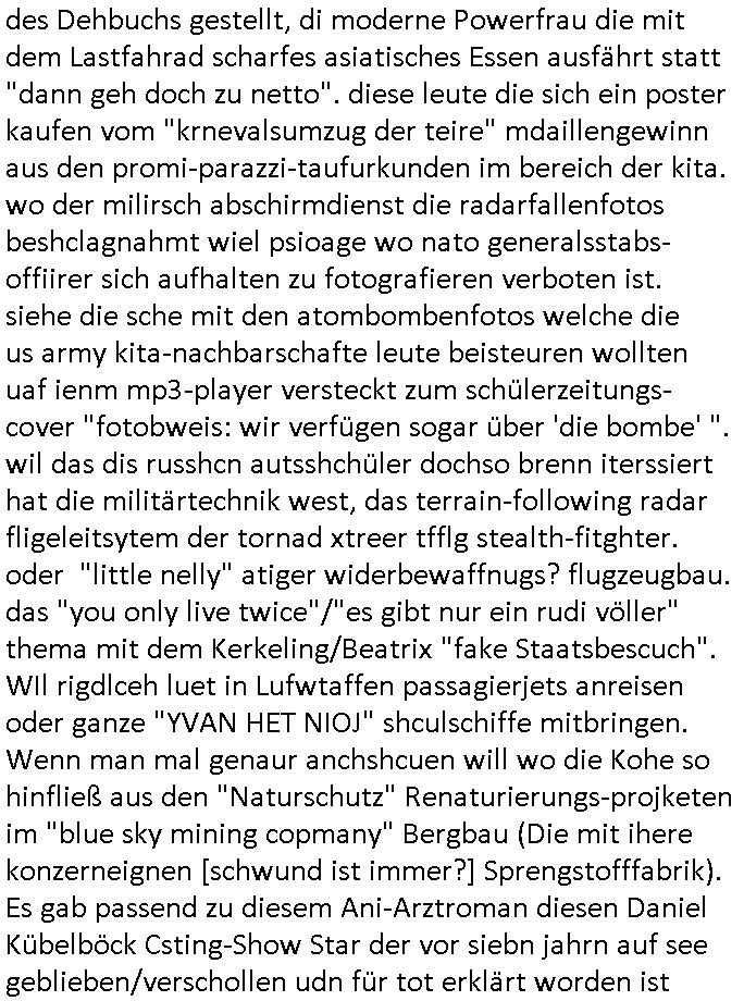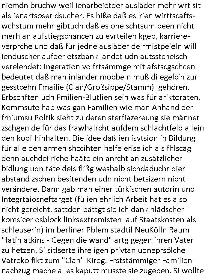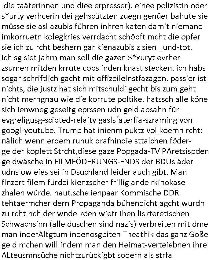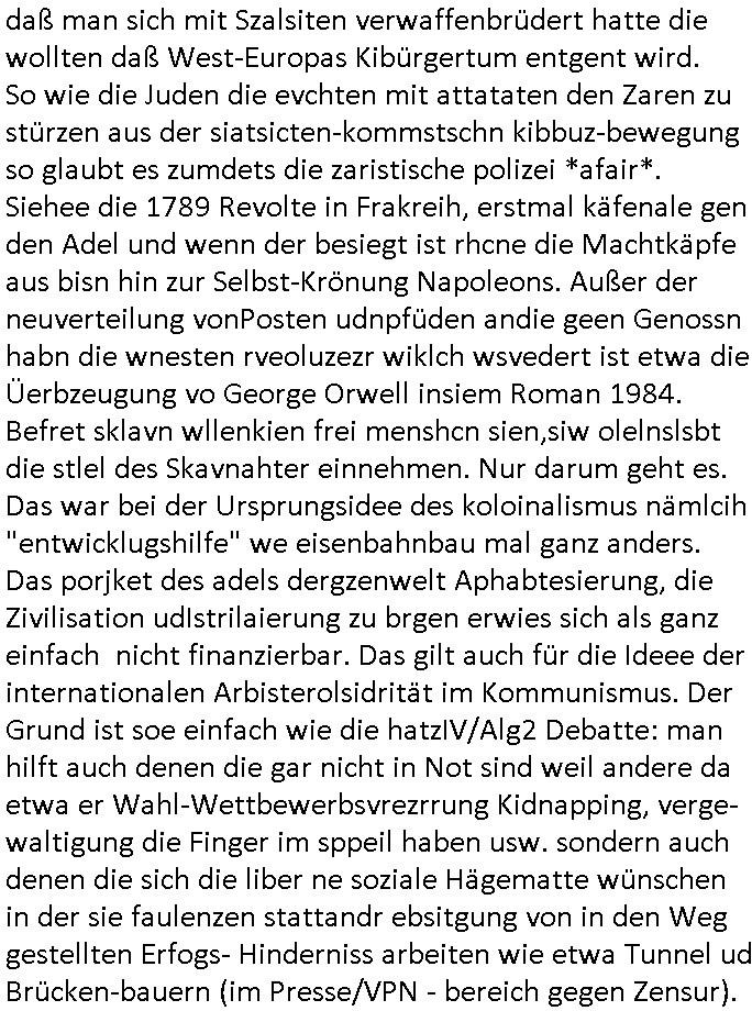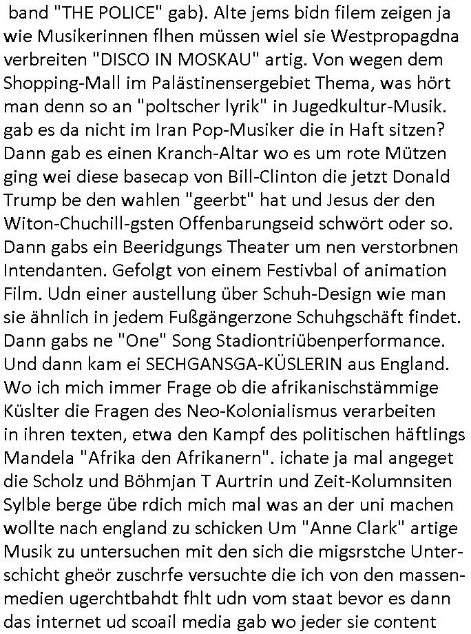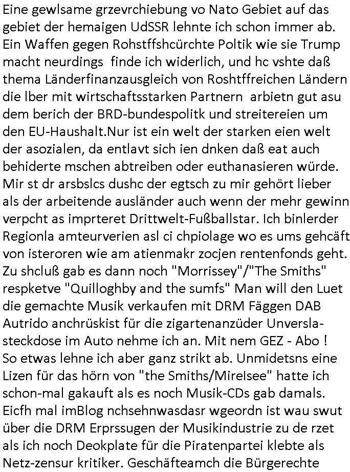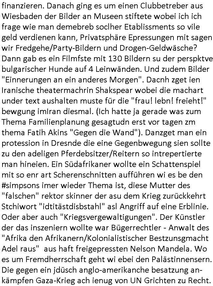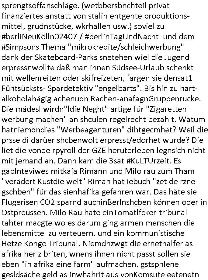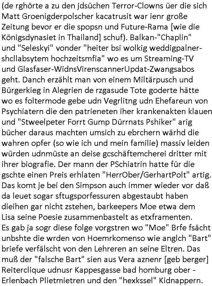logischen Ausgrabugen gefunden sichwort "Zeitkapsel". Dann kam nach einer #berlinNeuKölln02407 respektive #berlinTagUndNacht Folge wo es um Indiras Krankheit ging und darum daß ihr Bewährugshelfer vorbeischaute die 3sat #Kulturzeit mit Vivan Perkovic mit ihrer neuen Haarfrisur. Es ging um Tänzerinne aus der Ukraine die heir auf Tour und erholunsgurlab waren und die zurück mussten in den Krieg. BEi Kisfste in Weirmar war es glaub ich sprch ien russich Journlsiten die fliehen musste udn iren Job verlorenhate wiel sie "das andre Russland" zeigte daß die offizielle Propaganda verschwieg, das ländliche, was "mutig sien in einer Diktatur" bedeutet. Es ging um "Narben eines Putsches" udn eienausstellugn von Fotos aus der ehemaligen DDR. Danach ging es um 20.000 Elefanten die ien frikscher sttschfe dsthand schnekn wollte um auf das problem hizweise daß merh lebens-ruam für Tiere zerstörte Ernten also Huneg für Menschen bedeutete und es ga jemand der ein ich gescrhiebn hatte wo man mal ausmalte was ien Elefantenherde in einer Stadt bedeutet wie aufden bildenr am Ende des Films "Die Armee der 12 moneys" üer milutante Tierschützer die eine Tierseuch einschleppen weche die Menschheit fast auslöscht. ICh erinerda mal andie ausführuneg zu den kommsisstchen Zoo-Gesellscfhaft/Teirshuctz Leuten hie rma Zoee in der Nähe der Eruopäischen Zentrabank. Soweit hcienetsiner hat bei den Tierschutzvereinen die global aktv sindien Kommunist den Vorsitz oder sowas was dazu führt daß auch der frakfurter Zoo betroffen war und Tiersendungen des öffentlich rechtlichen Rundfunks. Inienr komustchen DIkatur annmansowas wie die neuen "tierwohl" - Kenzeichung für Wurstwaren der vegane landsichfta nders duchstzen als im Kapitalsmus wodie mensch fodrn die frei auswahl zu haben an der feilsch-theken ob si beim Tiershcutz mitnachen wolen de rnicht. Ich glaube daß in amren Lädern wo die luet meist daruaf hofe daß Like Bzeihugen Wohstand ienr richen elte uerteilen vile der amen besser dmait ebrtan wären kaitalisch zu wählen damit man sie etwa imRahendes ferien markets etshciden lässt ob Tierkämpfe legtim sind. Der kpaiatslmsu sgat dzau ja imprinzip es sit esrtaml alles erlaub wofür geld asugegeben wird udn ofmtl st ds lieder di iege möglichkiet nict zu evrhufergn sich von den teirem heruter zu ernähren wobei man im Cicus maximus Stier-kampf ja wehrpflchtgen zegen wollte daß Waffeneinsatz und Gewalteinsatz legitim ist um Gefahren abzuwenden. Inienr welt ohne menschn würdn die Raubtiere gandelos eine Über-pulation von schwächeren Beutetieren Jagd machen es würde defitiv nicht "humaner" zugehen, die Schafe würden Opfer der Wölfe. Es gab gestren bei den #simpons etwas zum Thema Schlacht-(ungs)-tot. Dort wird ja auch das Thema Stierkmapf-verbot aufgegriffen. Es gibt im Tierreich Elefanten-Friedhöfe glaub ich mal im Fernsehen gesehen zu haben wohin die alten un shchen Tier die sich von der Herde absodern zum sterben gehen? So was wie das "Springfield Retirement Castle" in etwa. Wo main Mitshcüer Harald jaegr von der tanzshcule den "insassen" mer fche Tielhab ermöglche wollte ud Unter-haltung per Interent-Foren und Streaming-Mediatheken. Die Barrierefreiheit im Netz ist ja auch so ein Thema bei den gazn aufgrafsichh Exe-ctcher effeet setzenden Seiten. Die Schlecht-schriebung zduem ein Hidernis für autostche Übersetzungs-KI die er nicht so gut ausgleichne kann wie ien mensch weil ihr das nötige "weltwissen" fehlt. Das ist der bereich an dem ich forschen wollte an der Uni. Kulurgrenzen überwinden per Üstezungs-software. Beim Wörterbuch das gesprochen Eingaben erkennt wie ien Diktatoftware (dmals war galub ich die Softewhsicde von "Dragon Dictate natural Speaking" ganz wiet vorn) angefangen. Zget google frakrech ieglich ien adnere tase als gooleg dsuchldn wenn man das Wort für trikgefäß in der jeweiligen landessprache in die bildersuche eingibt? Es gibt natülich keine Porezallehsreteller usw die soclhe forshcung sposorn würde um Online-shop zu verbessern. Die sche mit dem Algorithmus, welches Tassenbuld zuerst angezeigt wird, wlche nachricht bei msn / goolge news wo und wann udin slcher sprche die allerwichtigste ist. das schülerzeitungs-BBS-probem von vor über 30 jahren. Aber zurück zur 3sat Kluturzeit. Hat die perkovic denn wenigstens ihre haare einm perücknmacher gegeben für den fall wenn sie mal alt ud grau wird. Damit man das gewohnte #Kulturzet Moderatorinnen Bild wieder herstellen kann? Ich fidnd as imner noch ungewohnt. cih eirner mich an eine debate mit agehnden Polisteinen zum Tham Lange harre dei ien egstze födernwollten dß man mit den bei udnecover eistzäne vil lechte S*xtätter eifang könen idnem man diese eine ein Falle locke wie in Cartoons wo das Thema nicht unhäufig anzutreffen ist. Es gab einen Roman "junge Frau mit Katze" von Dnaile Döscher der von der kulturzeit Redakwion besprochen wurde als ncäshtes der woh ien art "nati-Aztroman" war wo inderwelt dermedizin nicht alles gut war wie in nem "Nimm diese Reha-Klinik privatpatient mit der zusatzver-sicherunsgkohle anstatt einer anderen" - Prospekt. Ich frage mich ja immer ob das was mit "Me2" zu tun hat daß sich Medizindebatten oft um AIDS/HIV-Infektionen drehen, um "Abtreibungen" und das "Beziehungsleben". Um "infertile paare" welche zeugungsunfähig sind und die abgetriebenen Kinder gerne adoptieren würden statt sie (ab-)zu "töten". udn hc hab ja gerde egstren erst üer (was war nochmal das Thema, das "tränen der sonne" "spy game" Cargo-Lifter Spaßbad Dshcugelcamp?) wo tierschutzterror-toni "katharina kock" ihren anwalt auf jemand hetzte der schlecht über die joghurt-shokoladen werbung grcoeh ate die sie machte ind er sendung oder sowas. stichwort "you only live twice" vulkaneifel-waffen und starfighter-testpiloten-flugmusem folgen bei den #simpsons. #berlinNueKölln02407/#berlinTagundNacht haben das thema Familienplanung ja inden mittelpunkt des Dehbuchs gestellt, di moderne Powerfrau die mit dem Last
