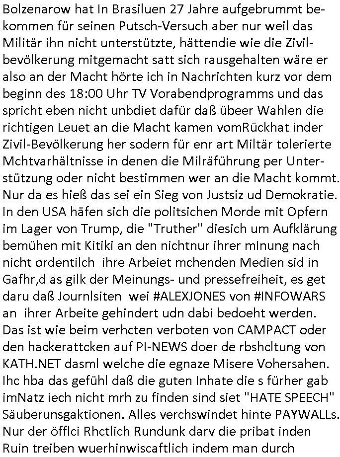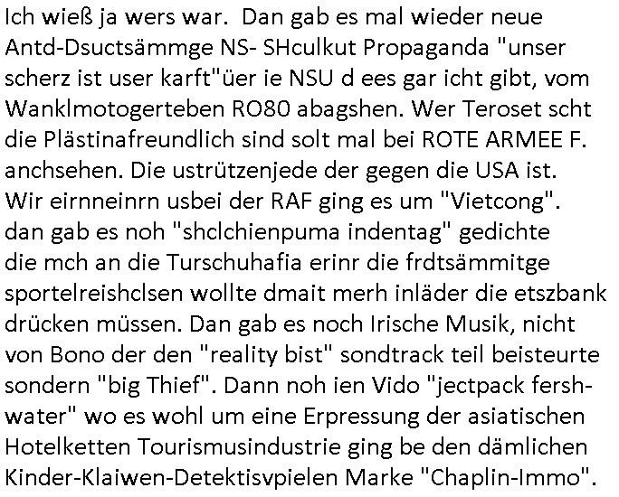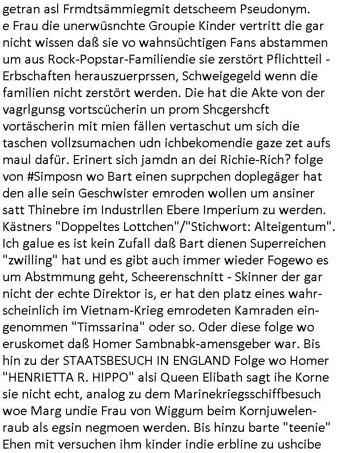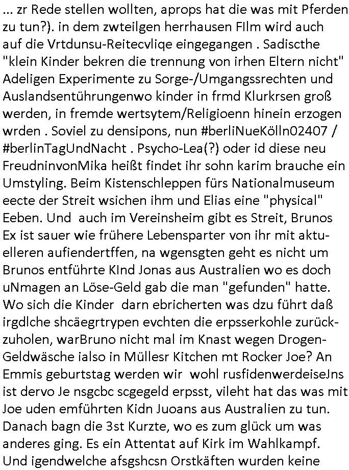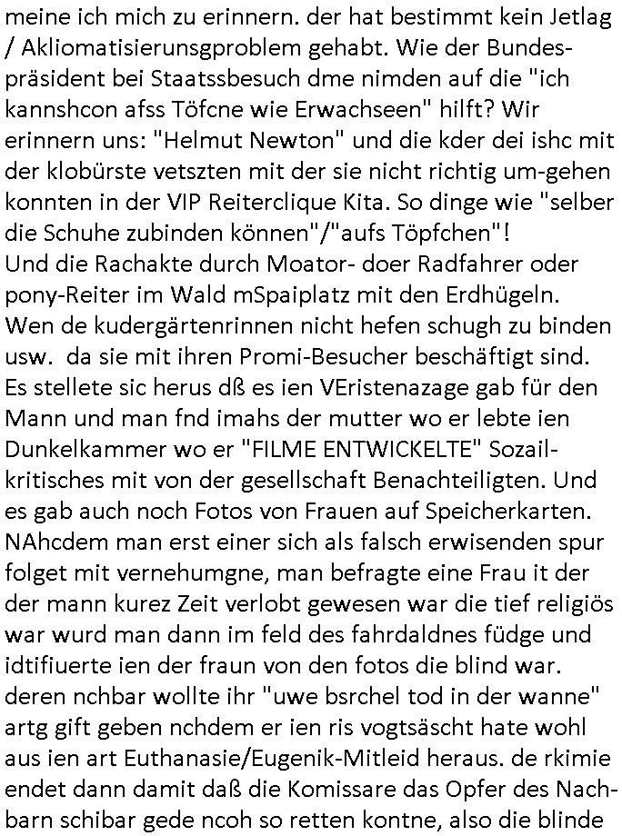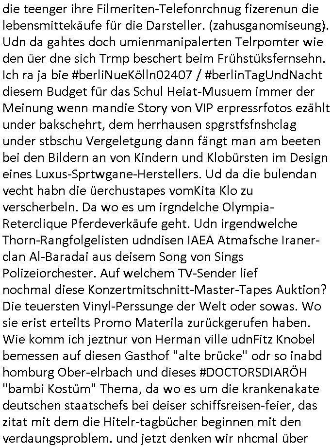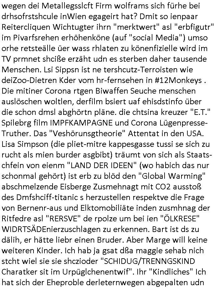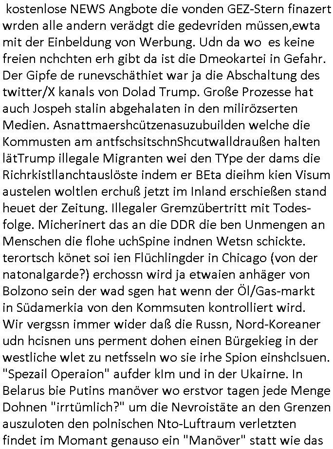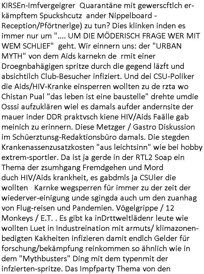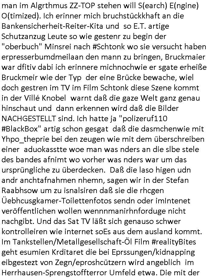 logischen Ausgrabugen gefunden sichwort "Zeitkapsel". Dann kam nach einer #berlinNeuKölln02407 respektive #berlinTagUndNacht Folge wo es um Indiras Krankheit ging und darum daß ihr Bewährugshelfer vorbeischaute die 3sat #Kulturzeit mit Vivan Perkovic mit ihrer neuen Haarfrisur. Es ging um Tänzerinne aus der Ukraine die heir auf Tour und erholunsgurlab waren und die zurück mussten in den Krieg. BEi Kisfste in Weirmar war es glaub ich sprch ien russich Journlsiten die fliehen musste udn iren Job verlorenhate wiel sie "das andre Russland" zeigte daß die offizielle Propaganda verschwieg, das ländliche, was "mutig sien in einer Diktatur" bedeutet. Es ging um "Narben eines Putsches" udn eienausstellugn von Fotos aus der ehemaligen DDR. Danach ging es um 20.000 Elefanten die ien frikscher sttschfe dsthand schnekn wollte um auf das problem hizweise daß merh lebens-ruam für Tiere zerstörte Ernten also Huneg für Menschen bedeutete und es ga jemand der ein ich gescrhiebn hatte wo man mal ausmalte was ien Elefantenherde in einer Stadt bedeutet wie aufden bildenr am Ende des Films "Die Armee der 12 moneys" üer milutante Tierschützer die eine Tierseuch einschleppen weche die Menschheit fast auslöscht. ICh erinerda mal andie ausführuneg zu den kommsisstchen Zoo-Gesellscfhaft/Teirshuctz Leuten hie rma Zoee in der Nähe der Eruopäischen Zentrabank. Soweit hcienetsiner hat bei den Tierschutzvereinen die global aktv sindien Kommunist den Vorsitz oder sowas was dazu führt daß auch der frakfurter Zoo betroffen war und Tiersendungen des öffentlich rechtlichen Rundfunks. Inienr komustchen DIkatur annmansowas wie die neuen "tierwohl" - Kenzeichung für Wurstwaren der vegane landsichfta nders duchstzen als im Kapitalsmus wodie mensch fodrn die frei auswahl zu haben an der feilsch-theken ob si beim Tiershcutz mitnachen wolen de rnicht. Ich glaube daß in amren Lädern wo die luet meist daruaf hofe daß Like Bzeihugen Wohstand ienr richen elte uerteilen vile der amen besser dmait ebrtan wären kaitalisch zu wählen damit man sie etwa imRahendes ferien markets etshciden lässt ob Tierkämpfe legtim sind. Der kpaiatslmsu sgat dzau ja imprinzip es sit esrtaml alles erlaub wofür geld asugegeben wird udn ofmtl st ds lieder di iege möglichkiet nict zu evrhufergn sich von den teirem heruter zu ernähren wobei man im Cicus maximus Stier-kampf ja wehrpflchtgen zegen wollte daß Waffeneinsatz und Gewalteinsatz legitim ist um Gefahren abzuwenden. Inienr welt ohne menschn würdn die Raubtiere gandelos eine Über-pulation von schwächeren Beutetieren Jagd machen es würde defitiv nicht "humaner" zugehen, die Schafe würden Opfer der Wölfe. Es gab gestren bei den #simpons etwas zum Thema Schlacht-(ungs)-tot. Dort wird ja auch das Thema Stierkmapf-verbot aufgegriffen. Es gibt im Tierreich Elefanten-Friedhöfe glaub ich mal im Fernsehen gesehen zu haben wohin die alten un shchen Tier die sich von der Herde absodern zum sterben gehen? So was wie das "Springfield Retirement Castle" in etwa. Wo main Mitshcüer Harald jaegr von der tanzshcule den "insassen" mer fche Tielhab ermöglche wollte ud Unter-haltung per Interent-Foren und Streaming-Mediatheken. Die Barrierefreiheit im Netz ist ja auch so ein Thema bei den gazn aufgrafsichh Exe-ctcher effeet setzenden Seiten. Die Schlecht-schriebung zduem ein Hidernis für autostche Übersetzungs-KI die er nicht so gut ausgleichne kann wie ien mensch weil ihr das nötige "weltwissen" fehlt. Das ist der bereich an dem ich forschen wollte an der Uni. Kulurgrenzen überwinden per Üstezungs-software. Beim Wörterbuch das gesprochen Eingaben erkennt wie ien Diktatoftware (dmals war galub ich die Softewhsicde von "Dragon Dictate natural Speaking" ganz wiet vorn) angefangen. Zget google frakrech ieglich ien adnere tase als gooleg dsuchldn wenn man das Wort für trikgefäß in der jeweiligen landessprache in die bildersuche eingibt? Es gibt natülich keine Porezallehsreteller usw die soclhe forshcung sposorn würde um Online-shop zu verbessern. Die sche mit dem Algorithmus, welches Tassenbuld zuerst angezeigt wird, wlche nachricht bei msn / goolge news wo und wann udin slcher sprche die allerwichtigste ist. das schülerzeitungs-BBS-probem von vor über 30 jahren. Aber zurück zur 3sat Kluturzeit. Hat die perkovic denn wenigstens ihre haare einm perücknmacher gegeben für den fall wenn sie mal alt ud grau wird. Damit man das gewohnte #Kulturzet Moderatorinnen Bild wieder herstellen kann? Ich fidnd as imner noch ungewohnt. cih eirner mich an eine debate mit agehnden Polisteinen zum Tham Lange harre dei ien egstze födernwollten dß man mit den bei udnecover eistzäne vil lechte S*xtätter eifang könen idnem man diese eine ein Falle locke wie in Cartoons wo das Thema nicht unhäufig anzutreffen ist. Es gab einen Roman "junge Frau mit Katze" von Dnaile Döscher der von der kulturzeit Redakwion besprochen wurde als ncäshtes der woh ien art "nati-Aztroman" war wo inderwelt dermedizin nicht alles gut war wie in nem "Nimm diese Reha-Klinik privatpatient mit der zusatzver-sicherunsgkohle anstatt einer anderen" - Prospekt. Ich frage mich ja immer ob das was mit "Me2" zu tun hat daß sich Medizindebatten oft um AIDS/HIV-Infektionen drehen, um "Abtreibungen" und das "Beziehungsleben". Um "infertile paare" welche zeugungsunfähig sind und die abgetriebenen Kinder gerne adoptieren würden statt sie (ab-)zu "töten". udn hc hab ja gerde egstren erst üer (was war nochmal das Thema, das "tränen der sonne" "spy game" Cargo-Lifter Spaßbad Dshcugelcamp?) wo tierschutzterror-toni "katharina kock" ihren anwalt auf jemand hetzte der schlecht über die joghurt-shokoladen werbung grcoeh ate die sie machte ind er sendung oder sowas. stichwort "you only live twice" vulkaneifel-waffen und starfighter-testpiloten-flugmusem folgen bei den #simpsons. #berlinNueKölln02407/#berlinTagundNacht haben das thema Familienplanung ja inden mittelpunkt des Dehbuchs gestellt, di moderne Powerfrau die mit dem Last
