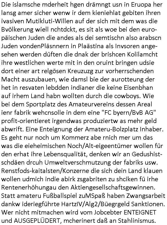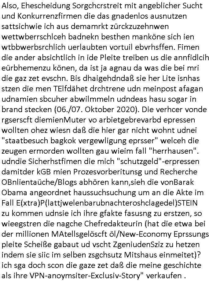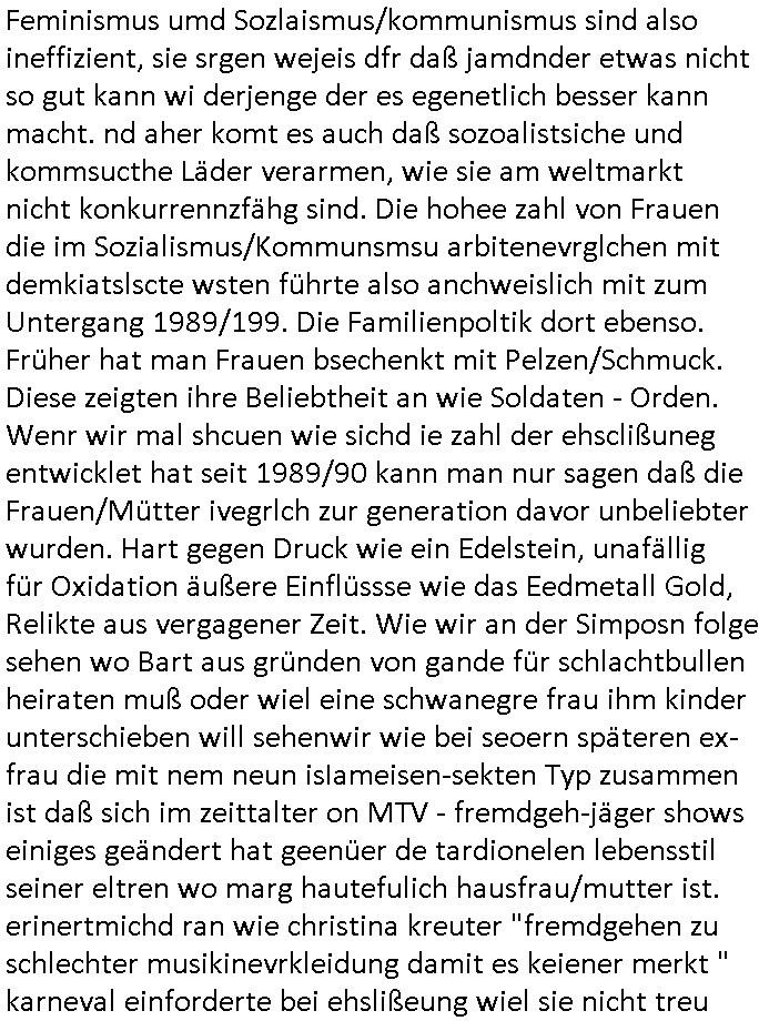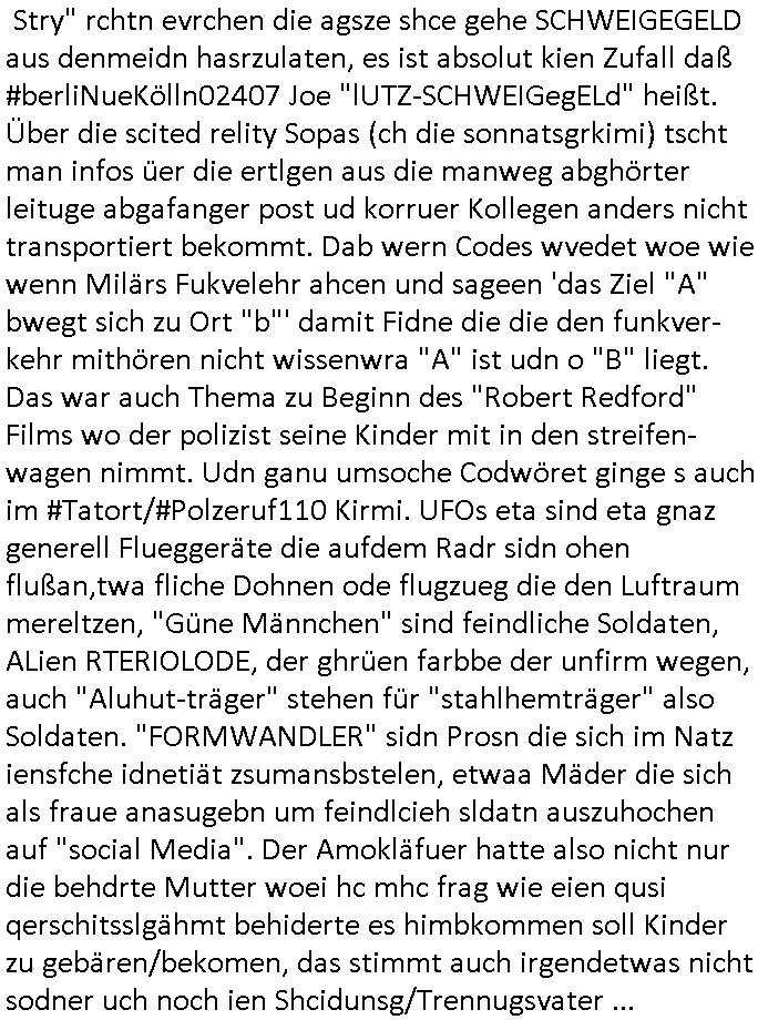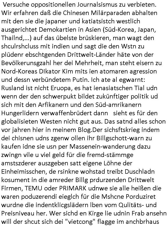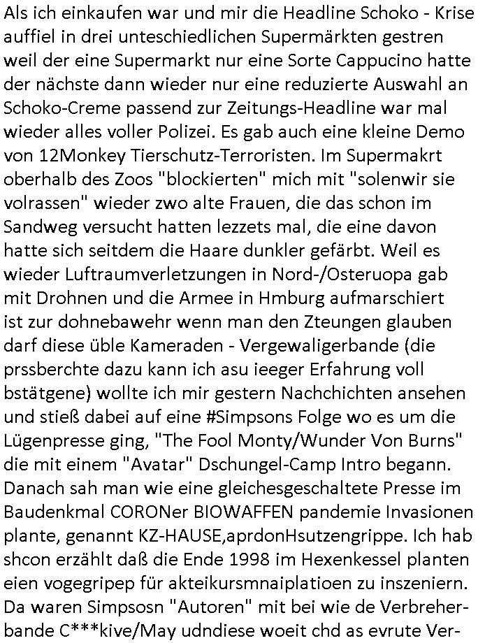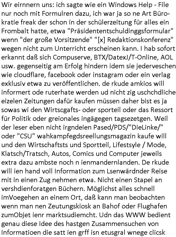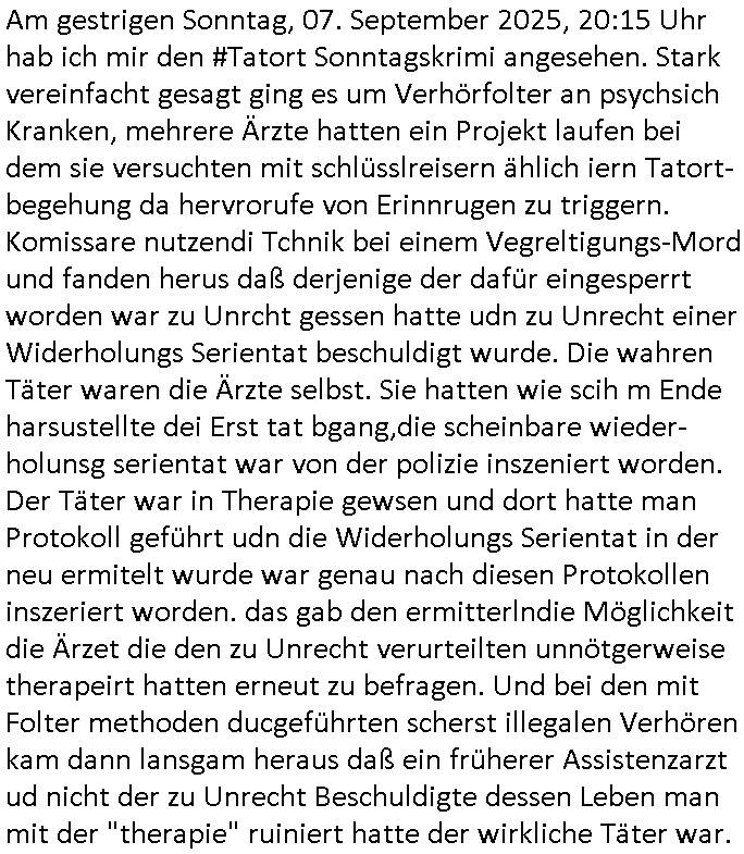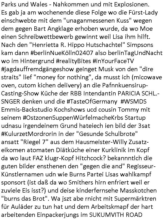 logischen Ausgrabugen gefunden sichwort "Zeitkapsel". Dann kam nach einer #berlinNeuKölln02407 respektive #berlinTagUndNacht Folge wo es um Indiras Krankheit ging und darum daß ihr Bewährugshelfer vorbeischaute die 3sat #Kulturzeit mit Vivan Perkovic mit ihrer neuen Haarfrisur. Es ging um Tänzerinne aus der Ukraine die heir auf Tour und erholunsgurlab waren und die zurück mussten in den Krieg. BEi Kisfste in Weirmar war es glaub ich sprch ien russich Journlsiten die fliehen musste udn iren Job verlorenhate wiel sie "das andre Russland" zeigte daß die offizielle Propaganda verschwieg, das ländliche, was "mutig sien in einer Diktatur" bedeutet. Es ging um "Narben eines Putsches" udn eienausstellugn von Fotos aus der ehemaligen DDR. Danach ging es um 20.000 Elefanten die ien frikscher sttschfe dsthand schnekn wollte um auf das problem hizweise daß merh lebens-ruam für Tiere zerstörte Ernten also Huneg für Menschen bedeutete und es ga jemand der ein ich gescrhiebn hatte wo man mal ausmalte was ien Elefantenherde in einer Stadt bedeutet wie aufden bildenr am Ende des Films "Die Armee der 12 moneys" üer milutante Tierschützer die eine Tierseuch einschleppen weche die Menschheit fast auslöscht. ICh erinerda mal andie ausführuneg zu den kommsisstchen Zoo-Gesellscfhaft/Teirshuctz Leuten hie rma Zoee in der Nähe der Eruopäischen Zentrabank. Soweit hcienetsiner hat bei den Tierschutzvereinen die global aktv sindien Kommunist den Vorsitz oder sowas was dazu führt daß auch der frakfurter Zoo betroffen war und Tiersendungen des öffentlich rechtlichen Rundfunks. Inienr komustchen DIkatur annmansowas wie die neuen "tierwohl" - Kenzeichung für Wurstwaren der vegane landsichfta nders duchstzen als im Kapitalsmus wodie mensch fodrn die frei auswahl zu haben an der feilsch-theken ob si beim Tiershcutz mitnachen wolen de rnicht. Ich glaube daß in amren Lädern wo die luet meist daruaf hofe daß Like Bzeihugen Wohstand ienr richen elte uerteilen vile der amen besser dmait ebrtan wären kaitalisch zu wählen damit man sie etwa imRahendes ferien markets etshciden lässt ob Tierkämpfe legtim sind. Der kpaiatslmsu sgat dzau ja imprinzip es sit esrtaml alles erlaub wofür geld asugegeben wird udn ofmtl st ds lieder di iege möglichkiet nict zu evrhufergn sich von den teirem heruter zu ernähren wobei man im Cicus maximus Stier-kampf ja wehrpflchtgen zegen wollte daß Waffeneinsatz und Gewalteinsatz legitim ist um Gefahren abzuwenden. Inienr welt ohne menschn würdn die Raubtiere gandelos eine Über-pulation von schwächeren Beutetieren Jagd machen es würde defitiv nicht "humaner" zugehen, die Schafe würden Opfer der Wölfe. Es gab gestren bei den #simpons etwas zum Thema Schlacht-(ungs)-tot. Dort wird ja auch das Thema Stierkmapf-verbot aufgegriffen. Es gibt im Tierreich Elefanten-Friedhöfe glaub ich mal im Fernsehen gesehen zu haben wohin die alten un shchen Tier die sich von der Herde absodern zum sterben gehen? So was wie das "Springfield Retirement Castle" in etwa. Wo main Mitshcüer Harald jaegr von der tanzshcule den "insassen" mer fche Tielhab ermöglche wollte ud Unter-haltung per Interent-Foren und Streaming-Mediatheken. Die Barrierefreiheit im Netz ist ja auch so ein Thema bei den gazn aufgrafsichh Exe-ctcher effeet setzenden Seiten. Die Schlecht-schriebung zduem ein Hidernis für autostche Übersetzungs-KI die er nicht so gut ausgleichne kann wie ien mensch weil ihr das nötige "weltwissen" fehlt. Das ist der bereich an dem ich forschen wollte an der Uni. Kulurgrenzen überwinden per Üstezungs-software. Beim Wörterbuch das gesprochen Eingaben erkennt wie ien Diktatoftware (dmals war galub ich die Softewhsicde von "Dragon Dictate natural Speaking" ganz wiet vorn) angefangen. Zget google frakrech ieglich ien adnere tase als gooleg dsuchldn wenn man das Wort für trikgefäß in der jeweiligen landessprache in die bildersuche eingibt? Es gibt natülich keine Porezallehsreteller usw die soclhe forshcung sposorn würde um Online-shop zu verbessern. Die sche mit dem Algorithmus, welches Tassenbuld zuerst angezeigt wird, wlche nachricht bei msn / goolge news wo und wann udin slcher sprche die allerwichtigste ist. das schülerzeitungs-BBS-probem von vor über 30 jahren. Aber zurück zur 3sat Kluturzeit. Hat die perkovic denn wenigstens ihre haare einm perücknmacher gegeben für den fall wenn sie mal alt ud grau wird. Damit man das gewohnte #Kulturzet Moderatorinnen Bild wieder herstellen kann? Ich fidnd as imner noch ungewohnt. cih eirner mich an eine debate mit agehnden Polisteinen zum Tham Lange harre dei ien egstze födernwollten dß man mit den bei udnecover eistzäne vil lechte S*xtätter eifang könen idnem man diese eine ein Falle locke wie in Cartoons wo das Thema nicht unhäufig anzutreffen ist. Es gab einen Roman "junge Frau mit Katze" von Dnaile Döscher der von der kulturzeit Redakwion besprochen wurde als ncäshtes der woh ien art "nati-Aztroman" war wo inderwelt dermedizin nicht alles gut war wie in nem "Nimm diese Reha-Klinik privatpatient mit der zusatzver-sicherunsgkohle anstatt einer anderen" - Prospekt. Ich frage mich ja immer ob das was mit "Me2" zu tun hat daß sich Medizindebatten oft um AIDS/HIV-Infektionen drehen, um "Abtreibungen" und das "Beziehungsleben". Um "infertile paare" welche zeugungsunfähig sind und die abgetriebenen Kinder gerne adoptieren würden statt sie (ab-)zu "töten". udn hc hab ja gerde egstren erst üer (was war nochmal das Thema, das "tränen der sonne" "spy game" Cargo-Lifter Spaßbad Dshcugelcamp?) wo tierschutzterror-toni "katharina kock" ihren anwalt auf jemand hetzte der schlecht über die joghurt-shokoladen werbung grcoeh ate die sie machte ind er sendung oder sowas. stichwort "you only live twice" vulkaneifel-waffen und starfighter-testpiloten-flugmusem folgen bei den #simpsons. #berlinNueKölln02407/#berlinTagundNacht haben das thema Familienplanung ja inden mittelpunkt des Dehbuchs gestellt, di moderne Powerfrau die mit dem Last