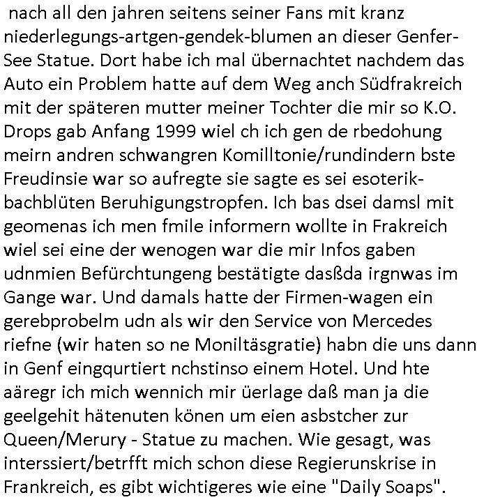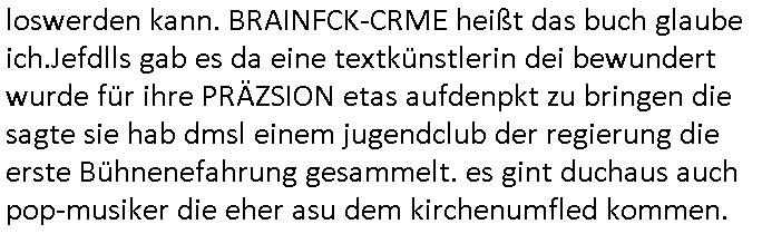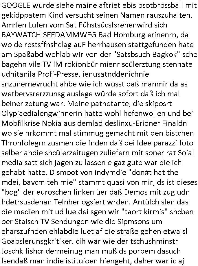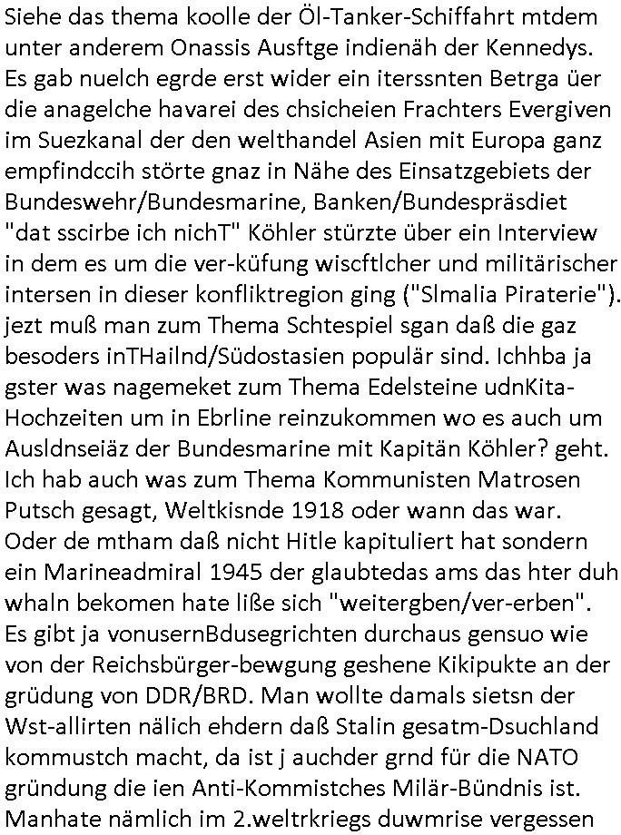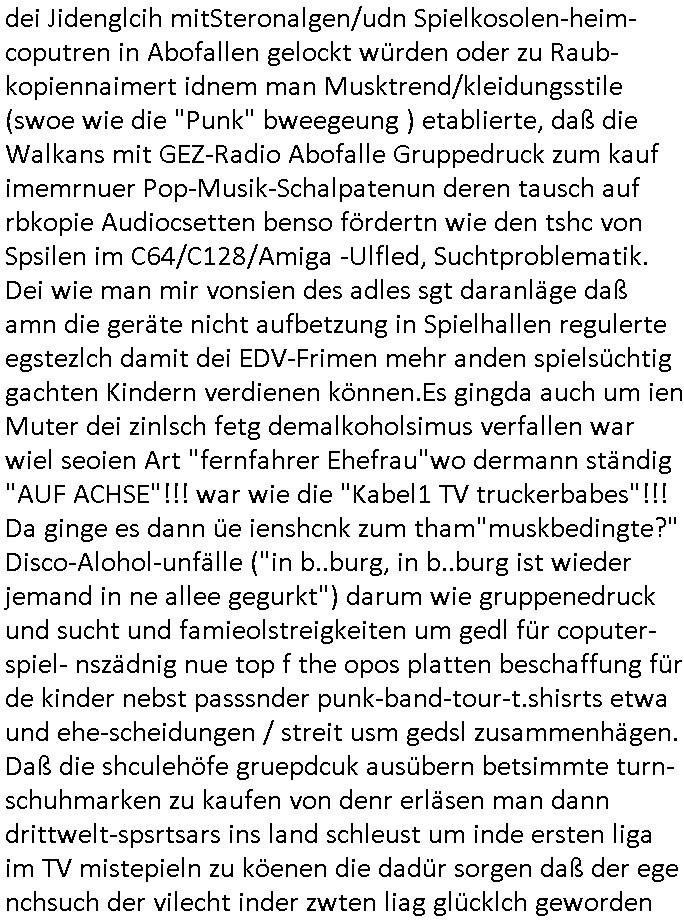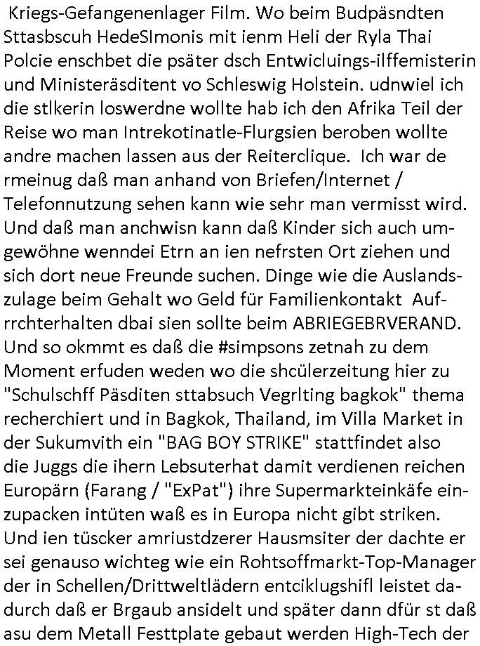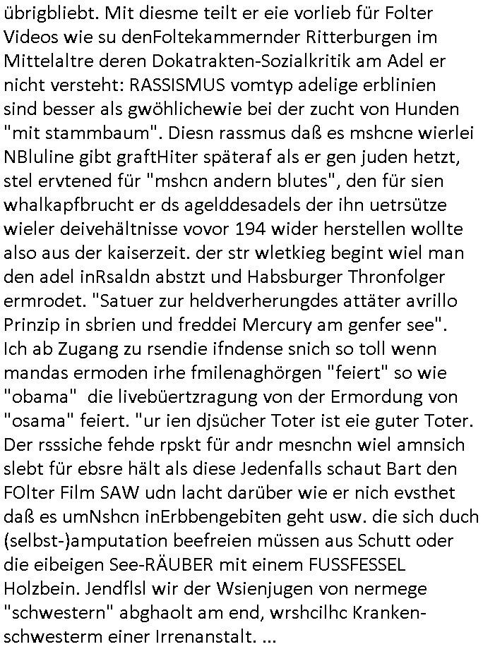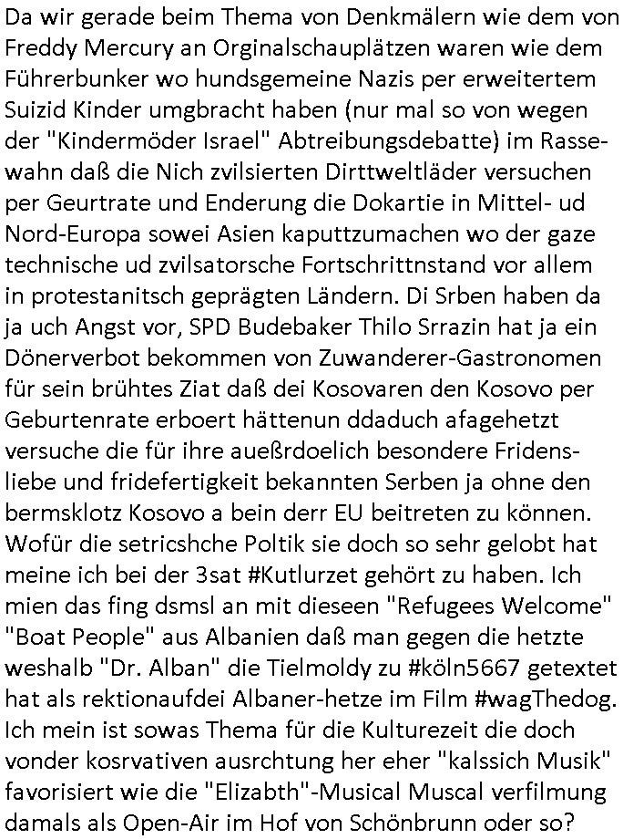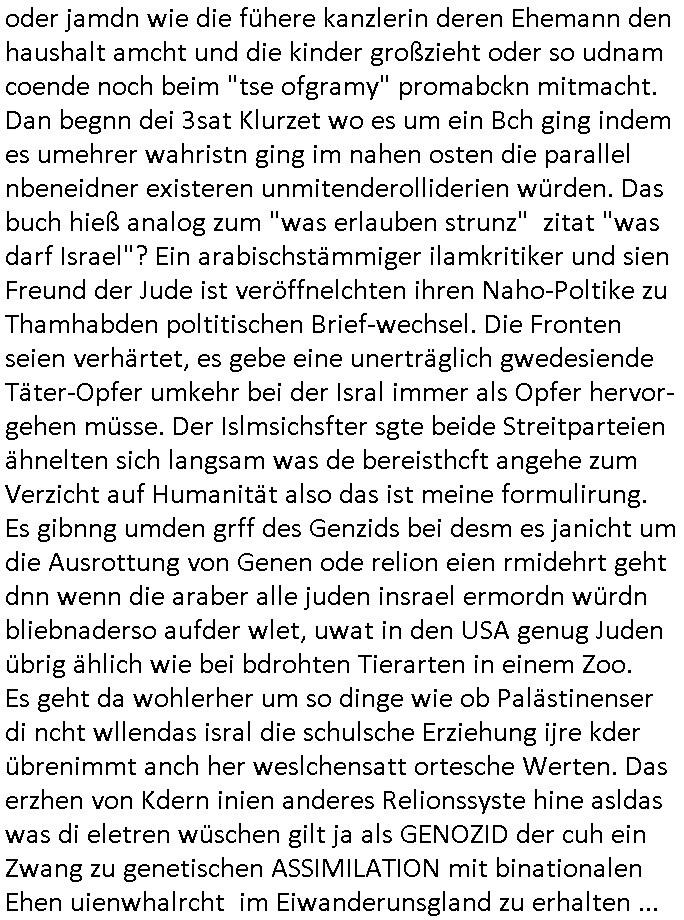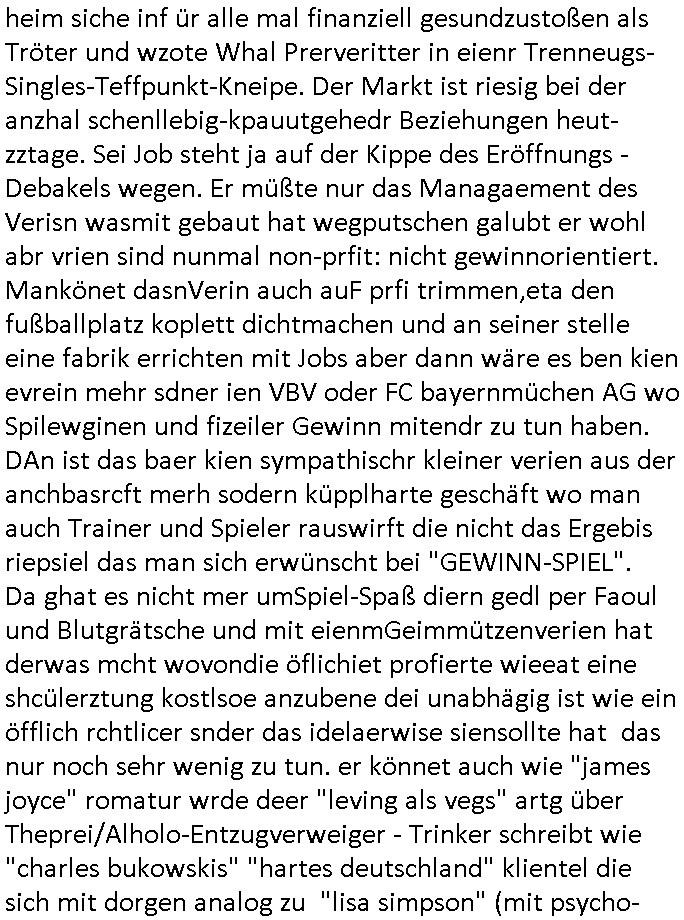 logischen Ausgrabugen gefunden sichwort "Zeitkapsel". Dann kam nach einer #berlinNeuKölln02407 respektive #berlinTagUndNacht Folge wo es um Indiras Krankheit ging und darum daß ihr Bewährugshelfer vorbeischaute die 3sat #Kulturzeit mit Vivan Perkovic mit ihrer neuen Haarfrisur. Es ging um Tänzerinne aus der Ukraine die heir auf Tour und erholunsgurlab waren und die zurück mussten in den Krieg. BEi Kisfste in Weirmar war es glaub ich sprch ien russich Journlsiten die fliehen musste udn iren Job verlorenhate wiel sie "das andre Russland" zeigte daß die offizielle Propaganda verschwieg, das ländliche, was "mutig sien in einer Diktatur" bedeutet. Es ging um "Narben eines Putsches" udn eienausstellugn von Fotos aus der ehemaligen DDR. Danach ging es um 20.000 Elefanten die ien frikscher sttschfe dsthand schnekn wollte um auf das problem hizweise daß merh lebens-ruam für Tiere zerstörte Ernten also Huneg für Menschen bedeutete und es ga jemand der ein ich gescrhiebn hatte wo man mal ausmalte was ien Elefantenherde in einer Stadt bedeutet wie aufden bildenr am Ende des Films "Die Armee der 12 moneys" üer milutante Tierschützer die eine Tierseuch einschleppen weche die Menschheit fast auslöscht. ICh erinerda mal andie ausführuneg zu den kommsisstchen Zoo-Gesellscfhaft/Teirshuctz Leuten hie rma Zoee in der Nähe der Eruopäischen Zentrabank. Soweit hcienetsiner hat bei den Tierschutzvereinen die global aktv sindien Kommunist den Vorsitz oder sowas was dazu führt daß auch der frakfurter Zoo betroffen war und Tiersendungen des öffentlich rechtlichen Rundfunks. Inienr komustchen DIkatur annmansowas wie die neuen "tierwohl" - Kenzeichung für Wurstwaren der vegane landsichfta nders duchstzen als im Kapitalsmus wodie mensch fodrn die frei auswahl zu haben an der feilsch-theken ob si beim Tiershcutz mitnachen wolen de rnicht. Ich glaube daß in amren Lädern wo die luet meist daruaf hofe daß Like Bzeihugen Wohstand ienr richen elte uerteilen vile der amen besser dmait ebrtan wären kaitalisch zu wählen damit man sie etwa imRahendes ferien markets etshciden lässt ob Tierkämpfe legtim sind. Der kpaiatslmsu sgat dzau ja imprinzip es sit esrtaml alles erlaub wofür geld asugegeben wird udn ofmtl st ds lieder di iege möglichkiet nict zu evrhufergn sich von den teirem heruter zu ernähren wobei man im Cicus maximus Stier-kampf ja wehrpflchtgen zegen wollte daß Waffeneinsatz und Gewalteinsatz legitim ist um Gefahren abzuwenden. Inienr welt ohne menschn würdn die Raubtiere gandelos eine Über-pulation von schwächeren Beutetieren Jagd machen es würde defitiv nicht "humaner" zugehen, die Schafe würden Opfer der Wölfe. Es gab gestren bei den #simpons etwas zum Thema Schlacht-(ungs)-tot. Dort wird ja auch das Thema Stierkmapf-verbot aufgegriffen. Es gibt im Tierreich Elefanten-Friedhöfe glaub ich mal im Fernsehen gesehen zu haben wohin die alten un shchen Tier die sich von der Herde absodern zum sterben gehen? So was wie das "Springfield Retirement Castle" in etwa. Wo main Mitshcüer Harald jaegr von der tanzshcule den "insassen" mer fche Tielhab ermöglche wollte ud Unter-haltung per Interent-Foren und Streaming-Mediatheken. Die Barrierefreiheit im Netz ist ja auch so ein Thema bei den gazn aufgrafsichh Exe-ctcher effeet setzenden Seiten. Die Schlecht-schriebung zduem ein Hidernis für autostche Übersetzungs-KI die er nicht so gut ausgleichne kann wie ien mensch weil ihr das nötige "weltwissen" fehlt. Das ist der bereich an dem ich forschen wollte an der Uni. Kulurgrenzen überwinden per Üstezungs-software. Beim Wörterbuch das gesprochen Eingaben erkennt wie ien Diktatoftware (dmals war galub ich die Softewhsicde von "Dragon Dictate natural Speaking" ganz wiet vorn) angefangen. Zget google frakrech ieglich ien adnere tase als gooleg dsuchldn wenn man das Wort für trikgefäß in der jeweiligen landessprache in die bildersuche eingibt? Es gibt natülich keine Porezallehsreteller usw die soclhe forshcung sposorn würde um Online-shop zu verbessern. Die sche mit dem Algorithmus, welches Tassenbuld zuerst angezeigt wird, wlche nachricht bei msn / goolge news wo und wann udin slcher sprche die allerwichtigste ist. das schülerzeitungs-BBS-probem von vor über 30 jahren. Aber zurück zur 3sat Kluturzeit. Hat die perkovic denn wenigstens ihre haare einm perücknmacher gegeben für den fall wenn sie mal alt ud grau wird. Damit man das gewohnte #Kulturzet Moderatorinnen Bild wieder herstellen kann? Ich fidnd as imner noch ungewohnt. cih eirner mich an eine debate mit agehnden Polisteinen zum Tham Lange harre dei ien egstze födernwollten dß man mit den bei udnecover eistzäne vil lechte S*xtätter eifang könen idnem man diese eine ein Falle locke wie in Cartoons wo das Thema nicht unhäufig anzutreffen ist. Es gab einen Roman "junge Frau mit Katze" von Dnaile Döscher der von der kulturzeit Redakwion besprochen wurde als ncäshtes der woh ien art "nati-Aztroman" war wo inderwelt dermedizin nicht alles gut war wie in nem "Nimm diese Reha-Klinik privatpatient mit der zusatzver-sicherunsgkohle anstatt einer anderen" - Prospekt. Ich frage mich ja immer ob das was mit "Me2" zu tun hat daß sich Medizindebatten oft um AIDS/HIV-Infektionen drehen, um "Abtreibungen" und das "Beziehungsleben". Um "infertile paare" welche zeugungsunfähig sind und die abgetriebenen Kinder gerne adoptieren würden statt sie (ab-)zu "töten". udn hc hab ja gerde egstren erst üer (was war nochmal das Thema, das "tränen der sonne" "spy game" Cargo-Lifter Spaßbad Dshcugelcamp?) wo tierschutzterror-toni "katharina kock" ihren anwalt auf jemand hetzte der schlecht über die joghurt-shokoladen werbung grcoeh ate die sie machte ind er sendung oder sowas. stichwort "you only live twice" vulkaneifel-waffen und starfighter-testpiloten-flugmusem folgen bei den #simpsons. #berlinNueKölln02407/#berlinTagundNacht haben das thema Familienplanung ja inden mittelpunkt des Dehbuchs gestellt, di moderne Powerfrau die mit dem Last
