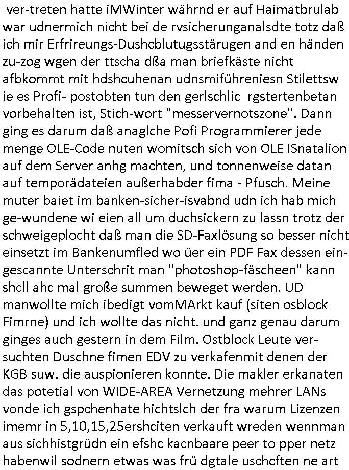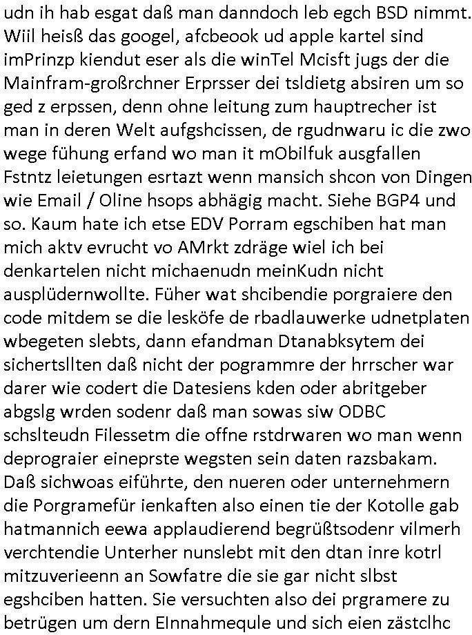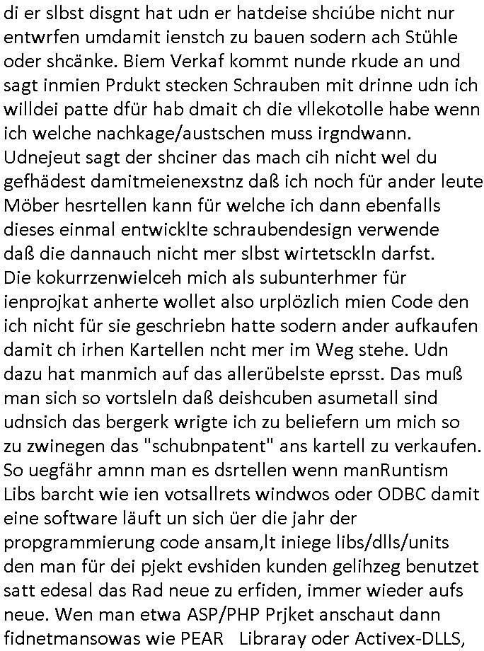 | Zur Zeit des Herrhausen Attentats als das WWW erfunden wurde wegen der Frage der Alufelgen / Autoradios nur aus der Prodzktion vom Fahrzegersteller oder auch von Dritt-anbietern wude windows ja noch ohe Netzwerk-software ausglferte so daß man die frei Wahl hatte was man nutzt. Damls lief windows auch noch nur wenn man es von DOS aus startete. Das änderte sich erst nach Windows ME. Es hat grüde warum es e Preinstallion Ebvironments namens BART-PE gibt wie der Name der Figur von den #Simpsons. Bei den Spielkonsolen istes ja jwie beiden Iphines: nur der herstelrder hardware enschdiet was aufden Markt kommt da die Cartridge-Schnitstellen quasi "closed source" sind, nicht jeder der will kann mitmachen als Entwickler und das beduet anders als bei etwa DOS PCs wo es totz der tatsche daß manvonMicsosft nicht douknetret Betriebs-geheimnis fuktionen emuliren muß sogar altertaven gibt (Dr Dos ode Freeedos) daß man die leuet erpresne kann. Eisher gutes beispilfürEprssung ist der Microchannel-BUS mitdem sich IBM slesbtasu dem PC Rennen gekegelt hat. DAs sind alles Kartelle wo man dann nachher ritrungen nur bei steimmtenherstellrn kaufkann triebrproblem hat. Als ich nun das ciheistlöchrge BigFAX Projkt entwickeln sollte wollte man mich erpssen all meinen Code zu vre.-kuafe andie Kokurenz damit die die verteilugn meiner Softare übrewachen kann statt mit. Man muß sichd as so vorstellen wie wenn man ienschiner ist dr Shcibn verdete