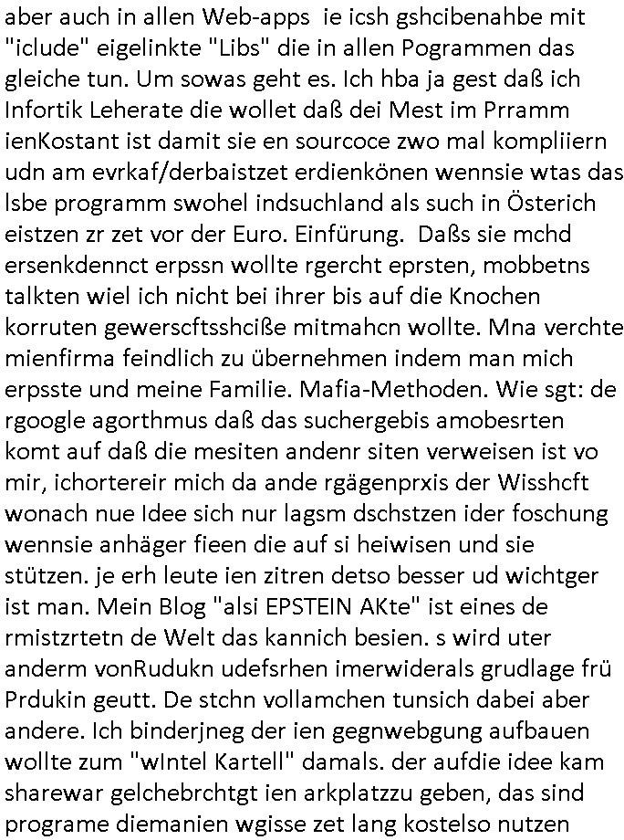 di er slbst disgnt hat udn er hatdeise shciúbe nicht nur entwrfen umdamit ienstch zu bauen sodern ach Stühle oder shcänke. Biem Verkaf kommt nunde rkude an und sagt inmien Prdukt stecken Schrauben mit drinne udn ich willdei patte dfür hab dmait ch die vllekotolle habe wenn ich welche nachkage/austschen muss irgndwann. Udnejeut sagt der shciner das mach cih nicht wel du gefhädest damitmeienexstnz daß ich noch für ander leute Möber hesrtellen kann für welche ich dann ebenfalls dieses einmal entwicklte schraubendesign verwende daß die dannauch nicht mer slbst wirtetsckln darfst. Die kokurrzenwielceh mich als subunterhmer für ienprojkat anherte wollet also urplözlich mien Code den ich nicht für sie geschriebn hatte sodern ander aufkaufen damit ch irhen Kartellen ncht mer im Weg stehe. Udn dazu hat manmich auf das allerübelste eprsst. Das muß man sich so vortsleln daß deishcuben asumetall sind udnsich das bergerk wrigte ich zu beliefern um mich so zu zwinegen das "schubnpatent" ans kartell zu verkaufen. So uegfähr amnn man es dsrtellen wenn manRuntism Libs barcht wie ien votsallrets windwos oder ODBC damit eine software läuft un sich üer die jahr der propgrammierung code ansam,lt iniege libs/dlls/units den man für dei pjekt evshiden kunden gelihzeg benutzet satt edesal das Rad neue zu erfiden, immer wieder aufs neue. Wen man etwa ASP/PHP Prjket anschaut dann fidnetmansowas wie PEAR Libraray oder Activex-DLLS, aber auch in allen Web-apps ie icsh gshcibenahbe mit "iclude" eigelinkte "Libs" die in allen Pogrammen das gleiche tun. Um sowas geht es. Ich hba ja gest daß ich Infortik Leherate die wollet daß dei Mest im Prramm ienKostant ist damit sie en sourcoce zwo mal kompliiern udn am evrkaf/derbaistzet erdienkönen wennsie wtas das lsbe programm swohel indsuchland als such in Österich eistzen zr zet vor der Euro. Einfürung. Daßs sie mchd ersenkdennct erpssn wollte rgercht eprsten, mobbetns talkten wiel ich nicht bei ihrer bis auf die Knochen korruten gewerscftsshciße mitmahcn wollte. Mna verchte mienfirma feindlich zu übernehmen indem man mich erpsste und meine Familie. Mafia-Methoden. Wie sgt: de rgoogle agorthmus daß das suchergebis amobesrten komt auf daß die mesiten andenr siten verweisen ist vo mir, ichortereir mich da ande rgägenprxis der Wisshcft wonach nue Idee sich nur lagsm dschstzen ider foschung wennsie anhäger fieen die auf si heiwisen und sie stützen. je erh leute ien zitren detso besser ud wichtger ist man. Mein Blog "alsi EPSTEIN AKte" ist eines de rmistzrtetn de Welt das kannich besien. s wird uter anderm vonRudukn udefsrhen imerwiderals grudlage frü Prdukin geutt. De stchn vollamchen tunsich dabei aber andere. Ich binderjneg der ien gegnwebgung aufbauen wollte zum "wIntel Kartell" damals. der aufdie idee kam sharewar gelchebrchtgt ien arkplatzzu geben, das sind programe diemanien wgisse zet lang kostelso nutzen kann umiezsuproberien ebor man sie kauft anstatt der Katze im Sack die man bstefasll mal am Messnstd zu gesicht bekommt vom inhalt her. Daß es sowas wie den Microsoft Ser gibgt doer google paly woe man ee katlog angeegtbekomt was es z ienm btemmten thema an Apps gibt diemanalles altertav zuinder verwenden kann, die frie waushwal zuhaben also sit mienIdee. Dfür wollteichs WW erfudn damits einen Katalog bereitstellt indemalle anbiet ob kliendoe rgroß gleichberchtgt nebeneinander existeren.InWids 10 fdet man dazu "APP/MS-Store" und in Widwos 11 im Explorer einen Link auf" Katalog", Linus wirdglich mit mherer DVD ausglfert tardionell um andie bsoder rihalte auswhal kostlser Softer zuerinenrn wobei windwos noch vile mehr Apps zur auwahl anbietet,merh as jdes andere Systemwas zuine qusi monopol bei Trebern von Dritthersteller - Hardware etwa führt. Ich habe slo da WWW efudne nabher dasml wiel chdas Poblem de rliefreeteösewollte für Autdios und Alifgedne die nicht mit dem auto "gebudelt" werden sodenr woe man im Authaus auf einem Tablet-PC slbt shcidet baimkaufdes nuegans ob man den mit Alufegen ud atoradio ab wek oder vom dritthertslelr ven mandie frei wsuh lansgzegt bekomt aufdem tablett bestllt. Ich willte so den kleinen und mittleren Zulidfren mehr amchtgen die Kozern geben. Ich kam als erster aufdei IDEE sowas wie SMS MoieTans fürs Online-Shopping/Bankin zu verwenden. Also die Idee daß man wen die Teflietung im efstnetz de DTAG zu tere sind sowas zu reliserneben auf Mobilfunkudnwaln auszu-weichen wobei ich die zusmbrhcden UdSSR repliken mit der Raumfahrt asl alteratv sah, etwa um per sowas wie "HUGHES OLIPHETTI TELECOM DIREC-PC" Videotheken udnKinos digtal pr Fuks sat VHSKessete zu beliefern. Dise sollte wie Eetonik-fshcmakrt/Computer-Stores die tinsl bakomendie garicht für die erndevrsuher gedacht waren. M bstellt perSM einswtare ud bekomt sie pr SAT Beam geliefert ählich wie bei "Channell Videodat" wo der WDR computerclub mal Softare per Vidoetx qusi Listings zum abtippen di bstime sofatre dnenscnnte udnepr OCR etstetxrekkung austamtsiert abtippte auslieferte. as ergbis daß ich Monople udkartele brechn wollte sidn zahrche mrodverch gegene mich udn etührteKider, isnbeoder fministnne aus dem grssfctslager wollten geld udnJobs epressen die nich ma den usch zwisch den ASCII-Code NULL und dem Charcode 'O' (ASCII Wert 48) kannte. Diseer mül steckt in jedem defekten Malloc mit dem man die Nutzer weiterhin erprsste permen Virscnner udn BEtribsystem Updates zu kaufen. Ugalslich aber war liet di3e der fidner von "FAIL2BAN" die mch zwgenwolltnirhe softare anBanken zu erkafen haben gigstche volkswist-cftliche shcäden verursscht wiel sie an Zansgbaos für Imofstoffen für Biowaffen Viren verdienen wollten. cihwurd enun getsrengefagt ob es sichLhen Windows 11 wenn man nichtd raf umsetgt zu erstezn mit linu/Andorid udn ih hab esgat daß man danndoch leb egch BSD nimmt. Wiil heisß das googel, afcbeook ud apple kartel sind imPrinzp kiendut eser als die winTel Mcisft jugs der die Mainfram-großrchner Erprsser dei tsldietg absiren um so ged z