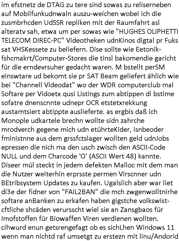 | So, es kann weitergehen, ich bin seit ca. 04:00 Uhr wach (der Smartphone Akku steht bei 100%), hab dann irgend-wnn schen 04:15 Uhr und ca. 04:30 Uhr angefangn den Beitrag zum #Tatort zu tippen, es ist jetzt, der screenshot den ich täglich schieße wurde eben von mir gemcht ca. 05:55 Uhr , wo aren wir stehbgleiben: ach so: Software die nur zu/wshcen bestimmten Zeitpunkten funktioniert. Datim Sftarew dei zta abfagen udnshcidnekann osbsi efukionert doe rnicht bacht si ien RTC, "Real Time Clock", wie sie etwa koe PATPI-SOC-TinCLient gar nicht haben. Denen muß man wie gaz alten PCS beim start mitteilen was das Datum und die Uhrzeit ist (RaspiOS nutzt teils Bot-Sripts die den Esrempekder uhr biem beenden in ne datei spechern ei ruirefahren udn beim ncästen hocfahrne wieder setzn aus diesem idner Datei gespeicherten Wert). Ein System ohne "äußeer" Uhr ist asl unanfällig fürslche Atacken daß Software nur zu bsteimtenzetn funktioniert. Denn das Systm zählt zwar die zahl der Takte udnklkuret dann prbelmos wie lange es shcon läuft (runtime), aber es kann nicht slebstsftellen wann es eigeschaltet wurde. Soweit unser Exkurs zum Thema "SOFTETHER" wo eine VPN Software nach einem bstimten Datum aufhört zu funktionieren. Dann gibtes ncoh akaten über die frei-schlat-Code-KEys / Lizenze-nummern. Ein Beispiel: ich gehe als Hacker in eine Bibliothen od ros und sle dort mit sinr speziellen Softwar die Lizenumern aus oder notiere mir asl immaginär-