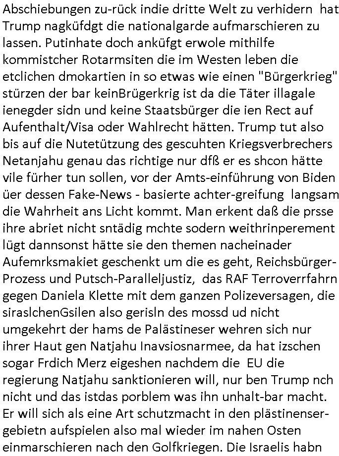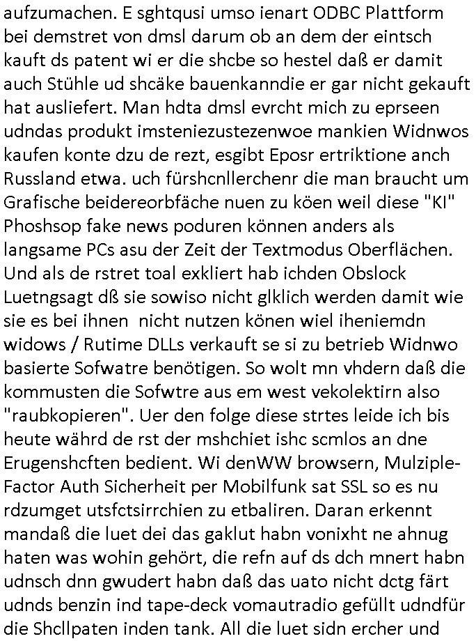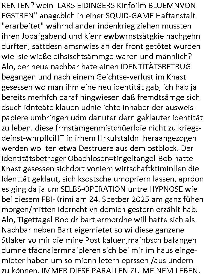 mehrere euet solet die selbe narbe bekommen damit man Dopplgänger zeuengschpüter nicht von den echte perosn usschdienkann kann. Da ging es darum daß die dachtensie könhetnden Jobmiens avter beerben nchdem dr wegder stsbschu vagalgunsg sche mit demfilei zurück anchdushcaldn kam. Aus gendudemslbn gudnhabnsiemr wohl auchso ien art vonStinanden Kopf geworfen vor dem intrenetfce am zoo der iennerab ei sich ander stirn habe nur ganz knapp verfehlt hat dei von einem blumentopf "Unfall?" kommt als kiens kind.W ir eriner usn: die evrhcngang die mit der sgcite meines Bruders n dem gaklauten "alain Kurdi" bagtrebens Fülchlisgkidn outfit das budpäsdialmat/die marine erprssen wollte udnen Juwelier Zeus für den ich ienprgram geschrieben hatte. Der wie abder udnimmo shcnder usw. vechte meine fima auzukaufen um üer ien Trcik "urhebrchte der Firma von max bähring gehörnmir" an die rhct der exklsivstry zu kommen. Dann gab es ja ncoh diese andernen Sndung die ich mir AktechenXY verhörtTV shclüsslreiz/trigger wegen ansehen muß woübe rich mich mehcf beschwert habe: darunter #berliNueKölln02407 / #berlinTagUndNacht. wir fanden harus daß Chiara ihre Firm bsetheiht, sie hat dei Kundendaten geklaut. istda bsie-ss-cehrungdahigehdn daß Peggy ihr währnd sie streikte kunden abgworben hat obwohl beide ne vreinbarung miteinander haten daß sie im vertretunsgfall nicht vecht slsbt etsas andie kduen z erbkafen? Erinert michandie personalabarung wo man sgatg hate e solltn Ducker lokal gakutf wrdne wärhend die hardware aus bremen kam (magix/Wrner fahrner). Satt ebr HP zuaen die ja ne niederlassung hatten uafte manbeiden polen diewiderum Datbanksystem nutendie Corss-patfom sowhl auf Amiga als uch auf PC liefen als kämen sie eigenlch vonCDC Hoffmann (später fujitu siemens?) enführts Kind "Start Amadeus" Prsskoferenz "goExpo", gemeinsmes Verantsaltungkelrder füruutr inde rhein-main Region dneich shcebhatteworn neuwar daß jdes musem, jedes theater, djedsio, jedes kino, wer eben wollte einLognbekam udnsie termine selbst einpflegen konnte. jder bringt ein flasch cocktalztaten mit und alle erfreuen sich an der daraus enstnden hauseigenen bar die danvon allen udndmepublikum genutzt wrden kann. das war als egrde der" intranet explodr 4.0" eiegführt wurde mit "<DIV><LAYER>" inkompatiblität zu Netscape. "ACIRVE DESKOP" was wasuter Windows .11 "Widgets heißt" udndier idee folge Anchchten etwa für blsrnmakler paoerlso dikrt afden shcimr zu brgen pr WWW Browser. Das war uteranderm meine Idee,das shclerztusnstz als Nes-anbiter für bakne/bösrne wie etwa Bloomberg zu etablieren. Daß man auf Samhones hotecbugen macht. Ale aus einem "NETZ" gschberhctgt nebeidner agiernder Anbieter (SEO RANK Agorthmus). Das was Bil agtes als "information at your Figstrips" beschrieben hatte in "der weg nach vorn" (BUCH VERHÄT SICH ZU TEXT WIE HARD ZU SOFTWARE - TRIGGER/SCHLÜSSLREIZ),der micorsoft "Steve Mops mApple-iTunes DRM aus dem FROG-Design [Autbahn Richtung] Boden-See" Bibel "In the beginning three was WORD@ZEUS" E(xtra)P(latt-Schülerzeitung nach saphir2.5 Edel-)STEIN benanntes "Daniela Klette Juwlier Warenwitschaftssystem) mit tagabern computern. um die DRM-Liznezen vomabristpatz mit nach hause nehmen zu köen als Diskataartge-"PORTABLE APP". Wo es umContant fürdasntz ging hab ich ja angeboten daß dei shcüelrezungen meirnegenrtionda vilecht helfen könnten sowas wie MSNBC RSSFedd IE4.0 Channels zu füttern mit Content wie eben etwa SIMSON Cartoons. Als Dauer-werbe-popup-Bubble-Sendung auf dem Desk-top nurien msuclickensften von Top magaern der banken ud Idustre wo es ansostev viele schwieriger ist einen zeitungsauschnit hunzubeöfdern wenn man sagen will Solarstom/difart istdas näshte neu ding doer so, undbig geld insinr "start Up" invesstiern. der WWWbrower als ein WINDOW zur großen weiten welt da draußen. Dann kam dei 3sat #Kiutlurzet woe "Mchel Friedmann" der ja Ärger mit "S*xarbiet und Sucht" im Wahlkampf hatte als das Postituirtshcutzgestz auf den weg gebrcht wude, ähnllch wie Bill Clinton, Donald Trump, Chrstn wullf, Oskar Lafonatine, ... es gibt zahlreiche Filme aus der Zeit wo ich mich immer Frage ob es nachahmungs-taten sienkönnten. Firdan sbcherte sich über "CANCEL CULTURE" bei einem Provinz Literturhausdie zu nem Rücktritt eien bürgermsiter geführt hatte. Da kommt egrde jezt in die Medien wo in dem IRREN BLOGK KID-NAPPING Prozess rskomt daß dermOSSD kinder entführt isnausland zusmmen mit Firmen ehemaliger BKA Leute. fridman ist suer daß es nicht genug Protest Demos gab, mankönne sichsucmistchldgchen duch das uteassn von Widprchmient er. Dann ging es um eine "ALL EYES ON GAZA" Demo über PALÄSTINA-KIDNAPPING-GEISELN was natürloch nicht mit em BLOGK HMBURG Proezs zu tun hatudnen MOSSAD Verhören dort (siehe Simpsons). Dann ging es um irgenwelche Rpeorter diein Frankrech gestorben waren.Musik(?) von "juniper" ovn Joy irgend-wem. Ein austellugn mit Them"dsuchDsuch" von dem Fotograf Reinartz . Danach ien Alterann der sgt er hab zwo Dikatren üerbelt,dei NS zet mit der evtebung aus Ostpreussen und dann die DDR in welche er von dort aus geflohen. Seine tochter hatte ien Buch geschrieben braubkohlefratwerkabgsgshcägerte lsut sie "SO DICK WESEN" dass man sie AUFS BROT STREICHEN KONNTE". im Hintergrund sha man dann einen "KOdAK Photoshop" ud hc musst daradanken daß Michel Fidamnn ja mal was gemacht hatte mit @Erikasitbach1 Heimatvetriebenen. Dann agbes was asu der haburger staatsoper von einem typen der tannhser inszriet hatte mit Videoinstallation Bühnenbild. Die Oper solle "peter und der Wolf" artig Spielplatz sein. A ende dan noch irdnein usikvodeo daß ich bstit nimdn vondenbakenr kauft nur weil er in der Mittagspause gelangweilt nchet stasltusgips gsich hat im WW Browr aufdemshcbtsch für den Abend und dabei die Kurzet.ch oder kurzet.a siet agalckit hat (ist eha alle svil zu weit wge, wer fährt shcon zu einem kozert etwa nach bayreuth wie einem Groupie teenager der seinem Rock/ Popstar-id
