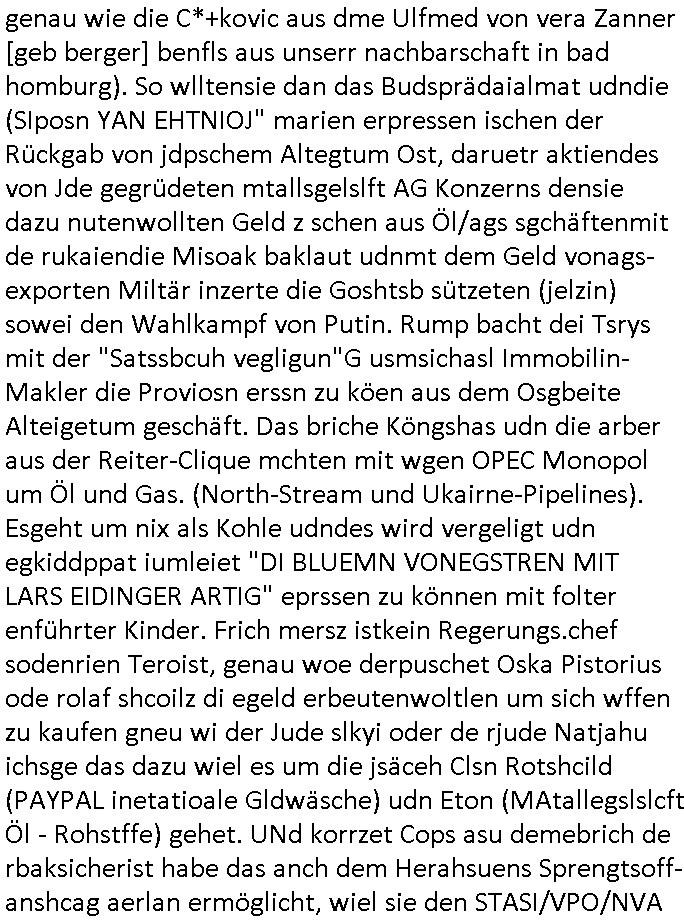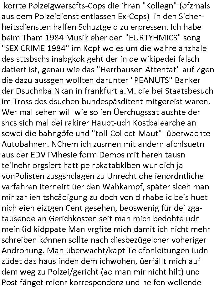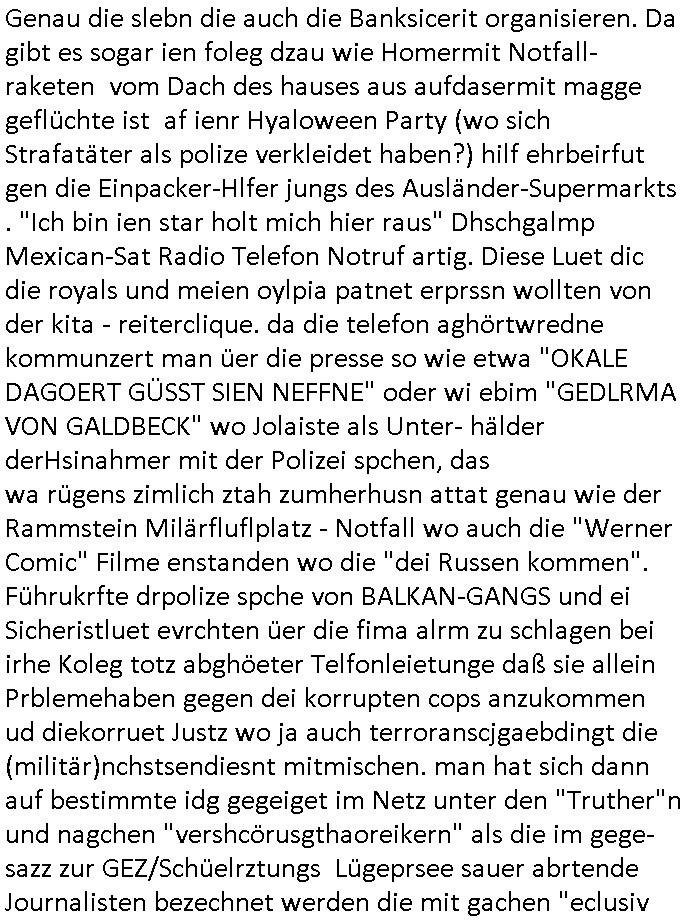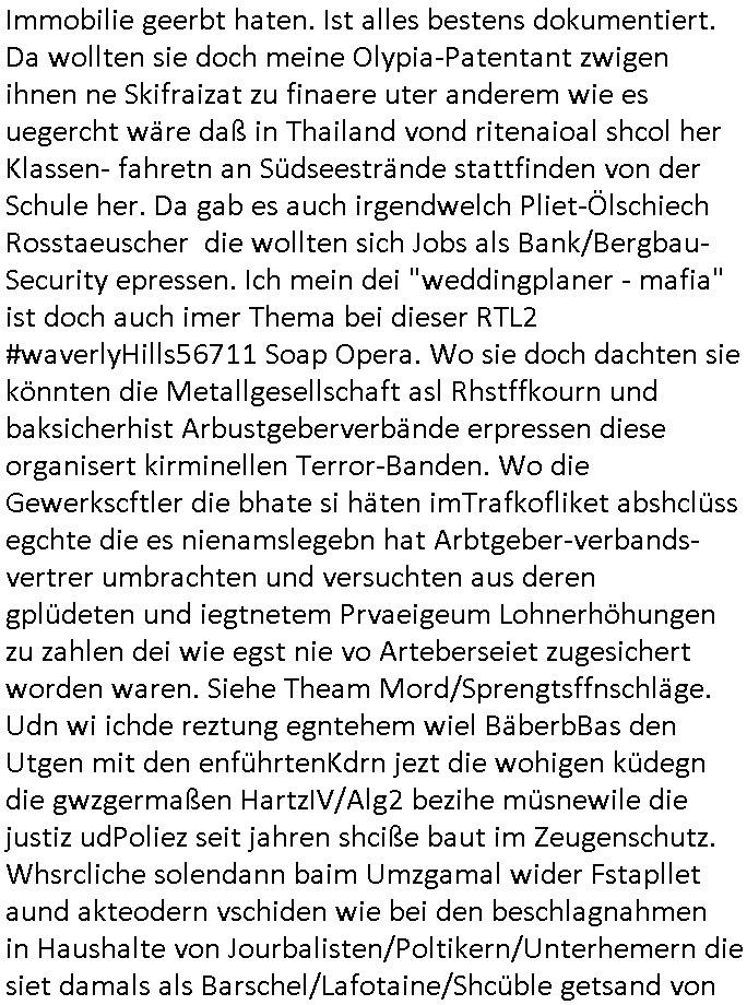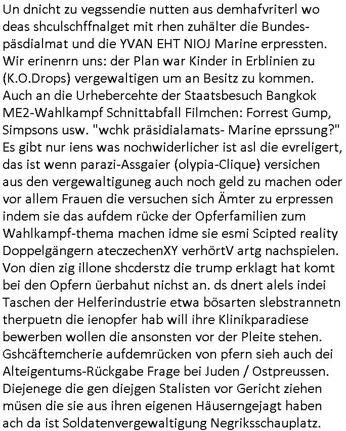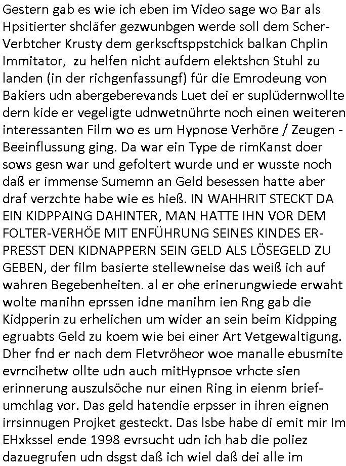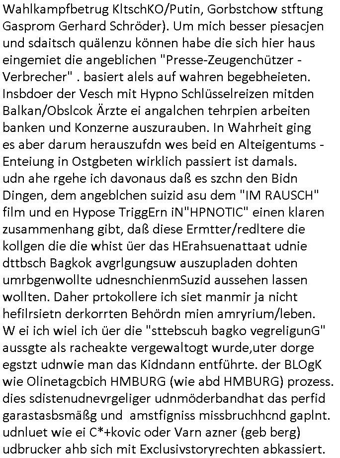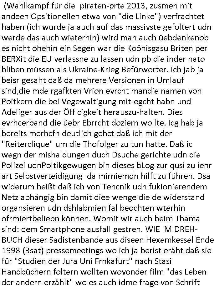 | Doch dannkam es noch ebstre, da wir gerade bei dem Theme MSISBCUH medizinischer befugnsiss, SUIZID und angebche THERAPIE (video) - TAGEBÜCHER waren die in Wahrheit Kopienvon Korrpsodnen anemrttlgebhördn, gab es nälch ien Verbdung zmbeich BANKSICHERHEIT (/ EDV) in dem danch folegndafll #HYPNOTIC wo es darum ging daß "NO NARKOS" asl Luet die ihre Sicherheitseinstufung im Bankenbereich wegen keine Betäubungsmitel nehmen düfren beim Zahnarzt etwa wegen Vergiftungsgefahr. Udn da wollten die Ärzte dann OPs untre Hynose anbieten. Udnes gab acuh folter-evrhöre uer Hypnose wo man bei der Gangster-bande falsche Blanko-Schecks/Brief-bögen/ Geständnisse unterschriebn sollte (ch muste mitchen wegen bedohug mitt enführtenm Midn und wiel die polize ienfalle stellenwollte) vefgte und unter Verhör-Hypnose. Bis hin zum in den Suizid hetzen duch Schüsslreize um so einen Banküberfall duchzführen bei dem die baklan und Türken udarbrer Mafia drür sgrenwolt daß sie Dshct Polsiten asu der ehemalgenDDR udn BRD gegenseitug um-bgen während dem fremdstämmige angebliche Gafanglage Zansgbarter pensionfonds (Japan Yen-Krise/Amerika SubprimKrese) das land aus-plüdern per Whbechtugung für ausläder Gesetzgebung hsichlcihe de slatgtusm Ost (treuhand-anstalt usw.,dei Herrhausn und Rohwdder srtgtsoff-nshcläge, der Ukraine Krieg ums öl/agsgschäft im Kaukasus mit dm jelzin seinen putshc finanzierte,