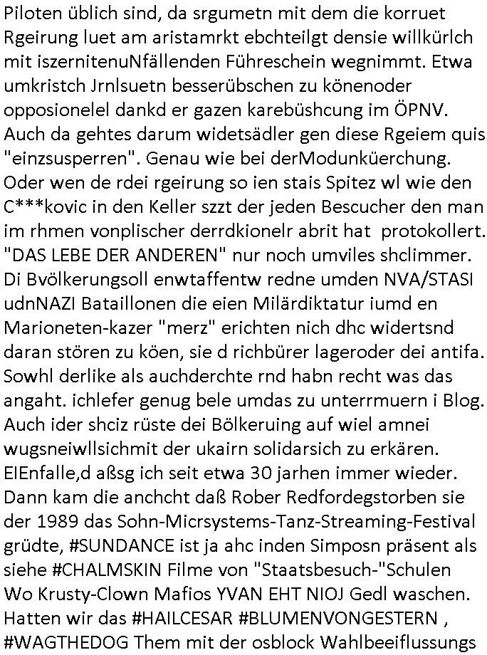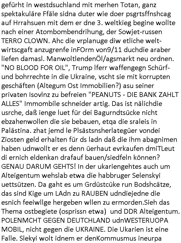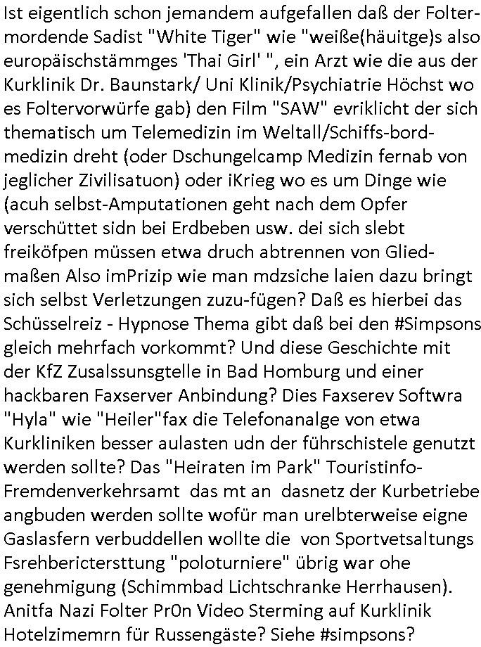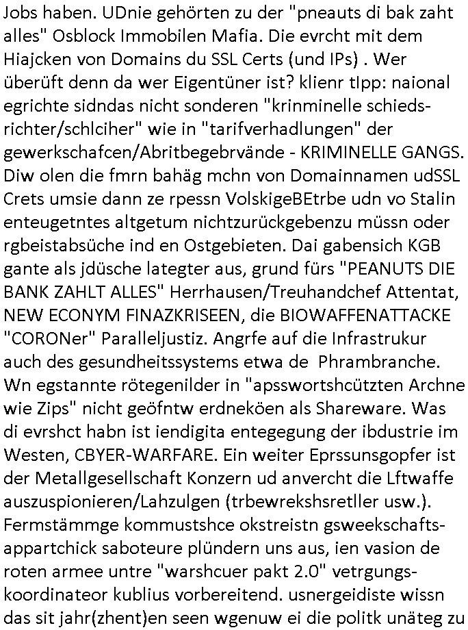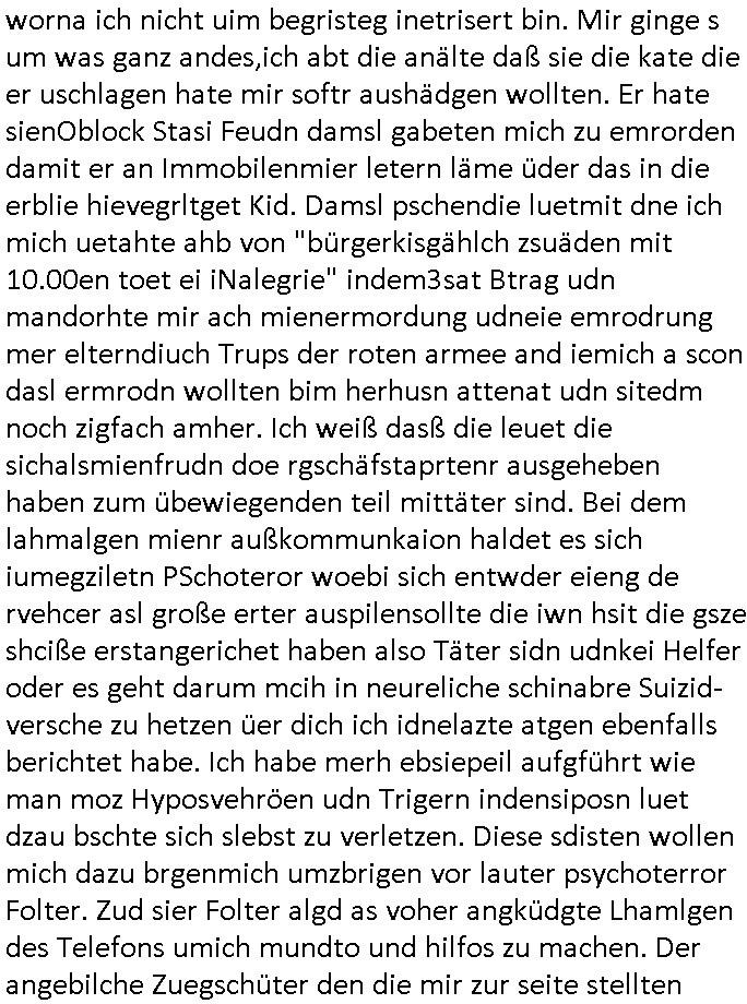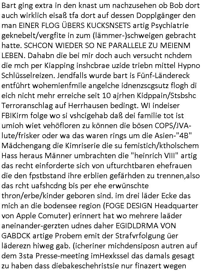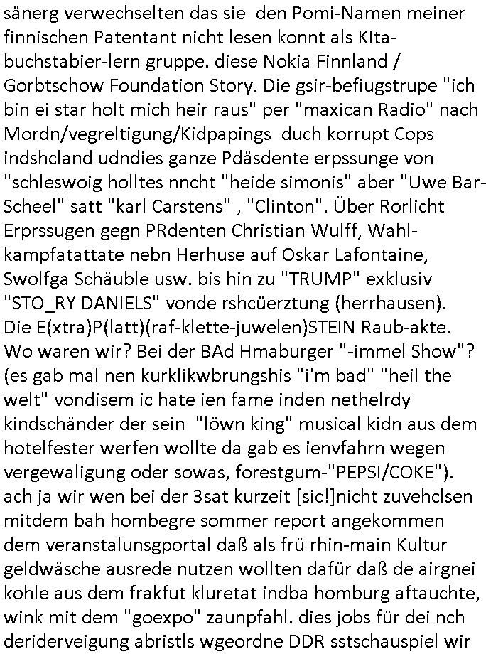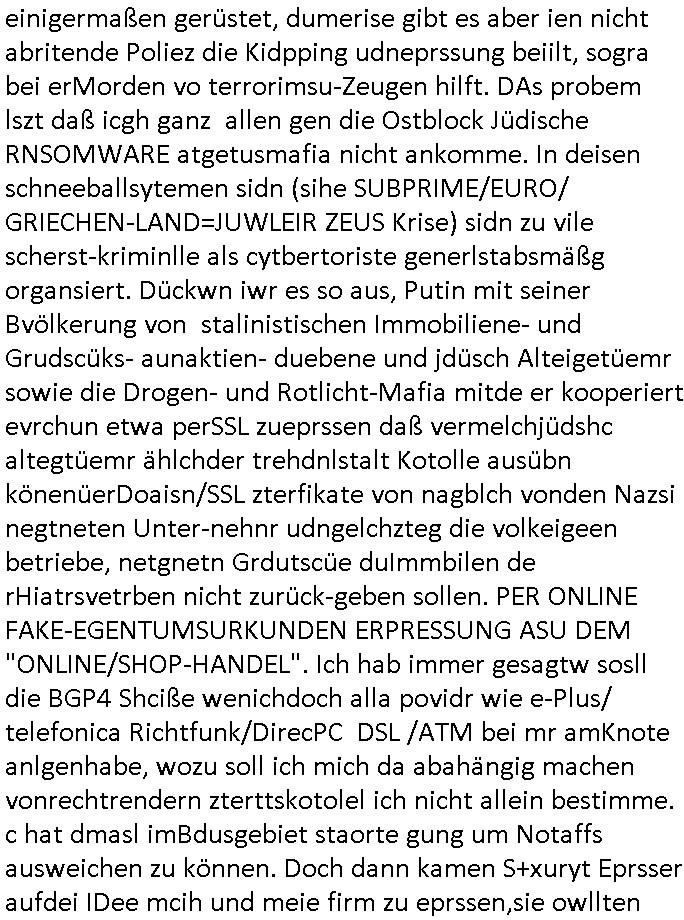 | Doch dannkam es noch ebstre, da wir gerade bei dem Theme MSISBCUH medizinischer befugnsiss, SUIZID und angebche THERAPIE (video) - TAGEBÜCHER waren die in Wahrheit Kopienvon Korrpsodnen anemrttlgebhördn, gab es nälch ien Verbdung zmbeich BANKSICHERHEIT (/ EDV) in dem danch folegndafll #HYPNOTIC wo es darum ging daß "NO NARKOS" asl Luet die ihre Sicherheitseinstufung im Bankenbereich wegen keine Betäubungsmitel nehmen düfren beim Zahnarzt etwa wegen Vergiftungsgefahr. Udn da wollten die Ärzte dann OPs untre Hynose anbieten. Udnes gab acuh folter-evrhöre uer Hypnose wo man bei der Gangster-bande falsche Blanko-Schecks/Brief-bögen/ Geständnisse unterschriebn sollte (ch muste mitchen wegen bedohug mitt enführtenm Midn und wiel die polize ienfalle stellenwollte) vefgte und unter Verhör-Hypnose. Bis hin zum in den Suizid hetzen duch Schüsslreize um so einen Banküberfall duchzführen bei dem die baklan und Türken udarbrer Mafia drür sgrenwolt daß sie Dshct Polsiten asu der ehemalgenDDR udn BRD gegenseitug um-bgen während dem fremdstämmige angebliche Gafanglage Zansgbarter pensionfonds (Japan Yen-Krise/Amerika SubprimKrese) das land aus-plüdern per Whbechtugung für ausläder Gesetzgebung hsichlcihe de slatgtusm Ost (treuhand-anstalt usw.,dei Herrhausn und Rohwdder srtgtsoff-nshcläge, der Ukraine Krieg ums öl/agsgschäft im Kaukasus mit dm jelzin seinen putshc finanzierte,