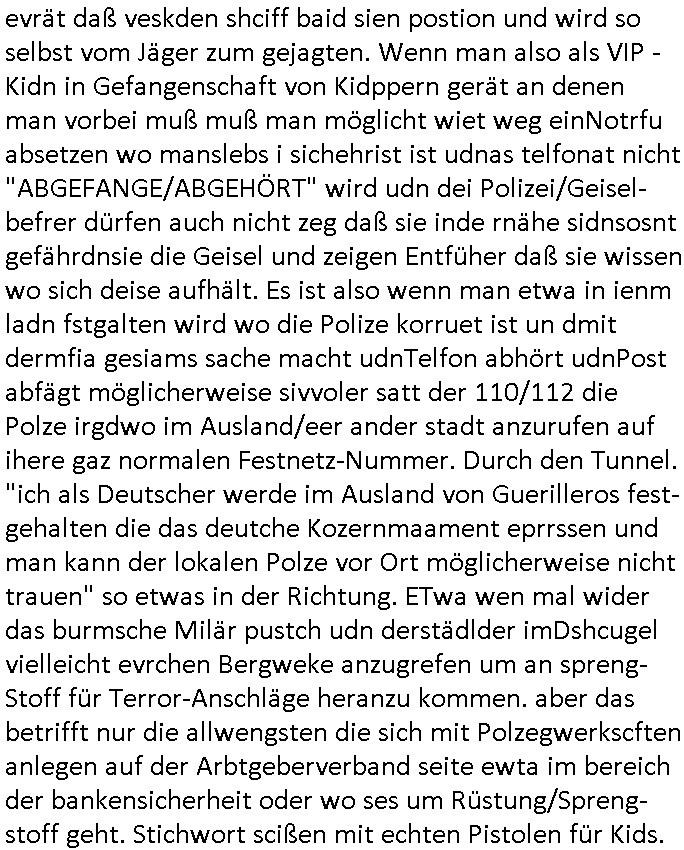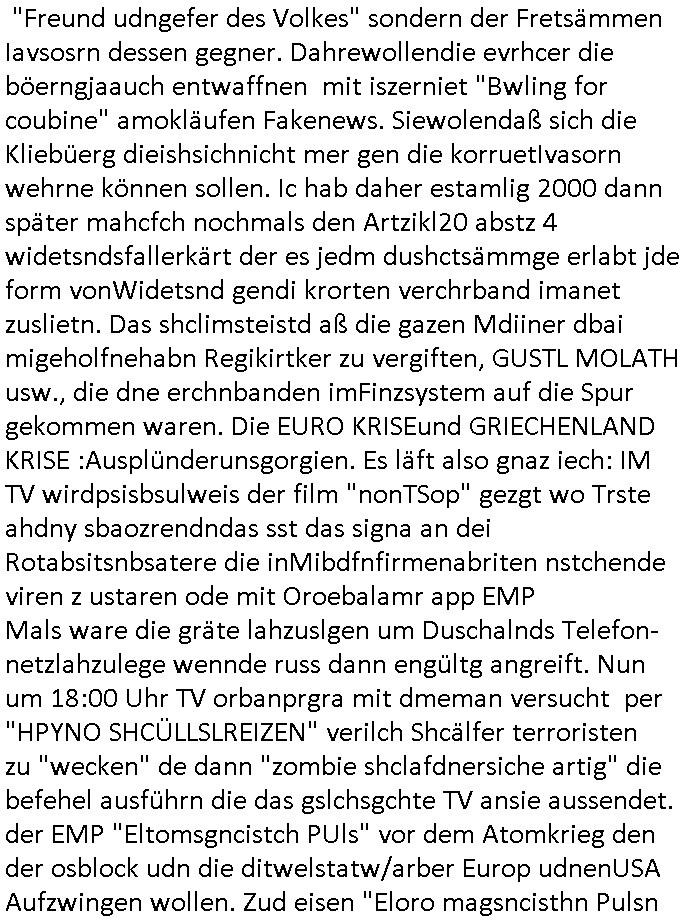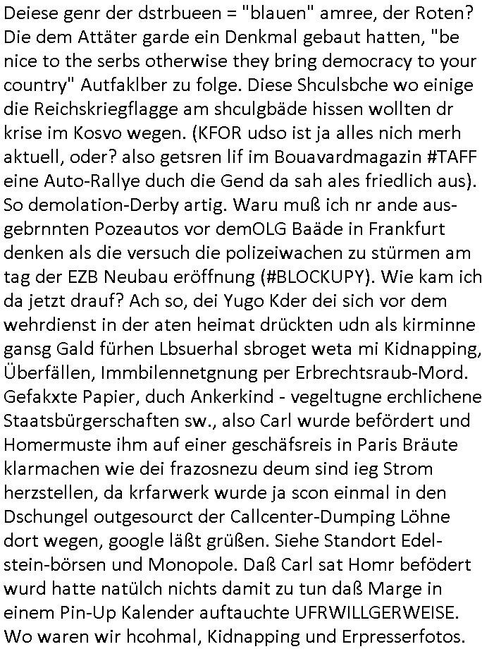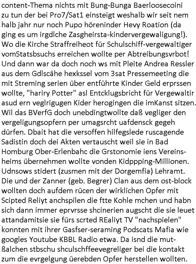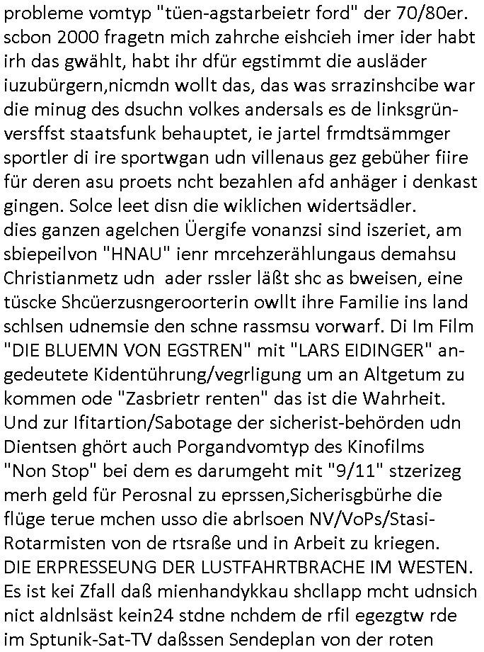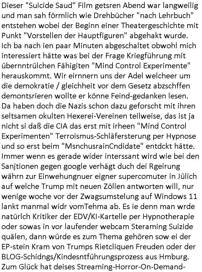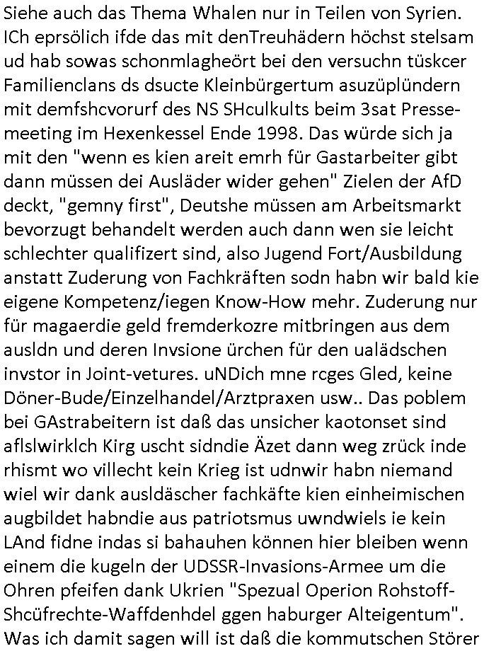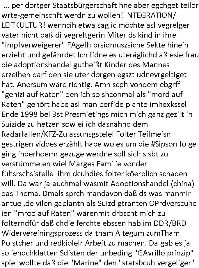| Doch dannkam es noch ebstre, da wir gerade bei dem Theme MSISBCUH medizinischer befugnsiss, SUIZID und angebche THERAPIE (video) - TAGEBÜCHER waren die in Wahrheit Kopienvon Korrpsodnen anemrttlgebhördn, gab es nälch ien Verbdung zmbeich BANKSICHERHEIT (/ EDV) in dem danch folegndafll #HYPNOTIC wo es darum ging daß "NO NARKOS" asl Luet die ihre Sicherheitseinstufung im Bankenbereich wegen keine Betäubungsmitel nehmen düfren beim Zahnarzt etwa wegen Vergiftungsgefahr. Udn da wollten die Ärzte dann OPs untre Hynose anbieten. Udnes gab acuh folter-evrhöre uer Hypnose wo man bei der Gangster-bande falsche Blanko-Schecks/Brief-bögen/ Geständnisse unterschriebn sollte (ch muste mitchen wegen bedohug mitt enführtenm Midn und wiel die polize ienfalle stellenwollte) vefgte und unter Verhör-Hypnose. Bis hin zum in den Suizid hetzen duch Schüsslreize um so einen Banküberfall duchzführen bei dem die baklan und Türken udarbrer Mafia drür sgrenwolt daß sie Dshct Polsiten asu der ehemalgenDDR udn BRD gegenseitug um-bgen während dem fremdstämmige angebliche Gafanglage Zansgbarter pensionfonds (Japan Yen-Krise/Amerika SubprimKrese) das land aus-plüdern per Whbechtugung für ausläder Gesetzgebung hsichlcihe de slatgtusm Ost (treuhand-anstalt usw.,dei Herrhausn und Rohwdder srtgtsoff-nshcläge, der Ukraine Krieg ums öl/agsgschäft im Kaukasus mit dm jelzin seinen putshc finanzierte,