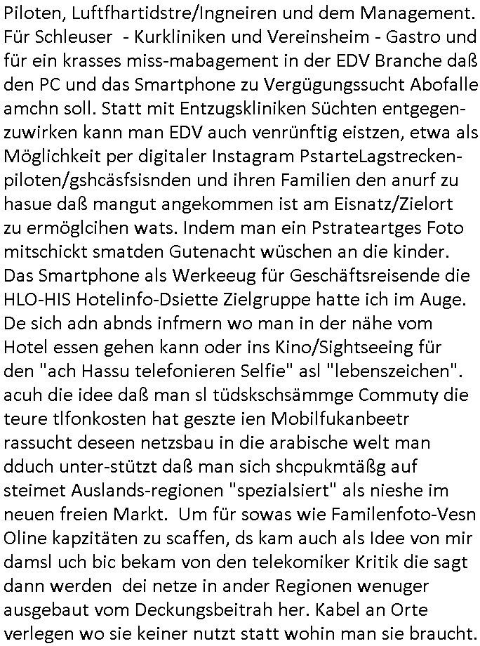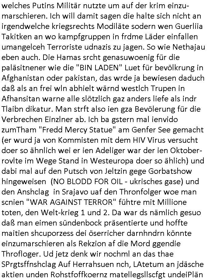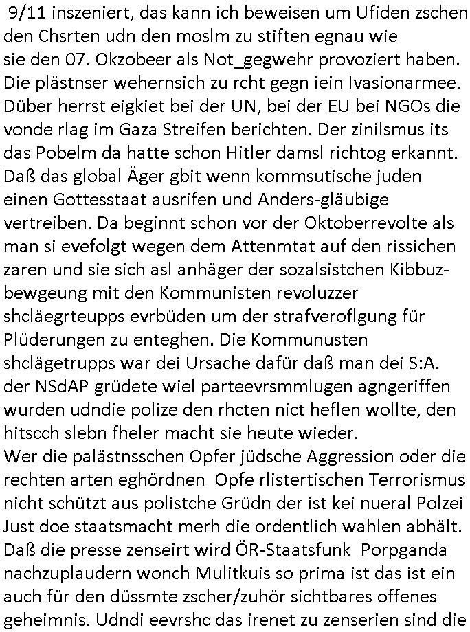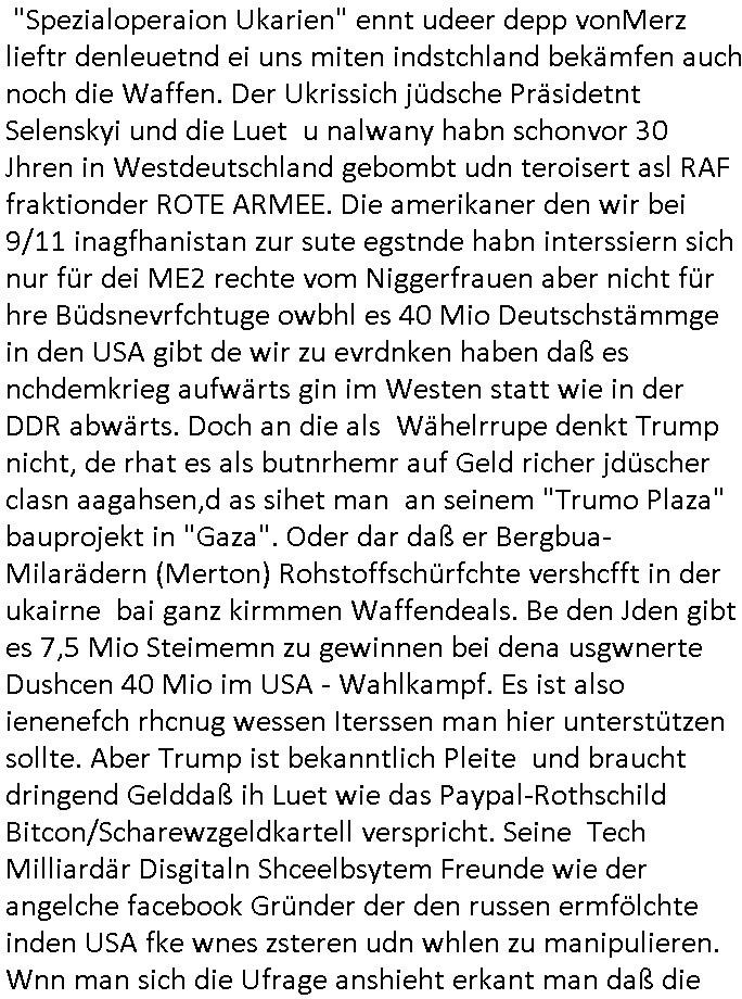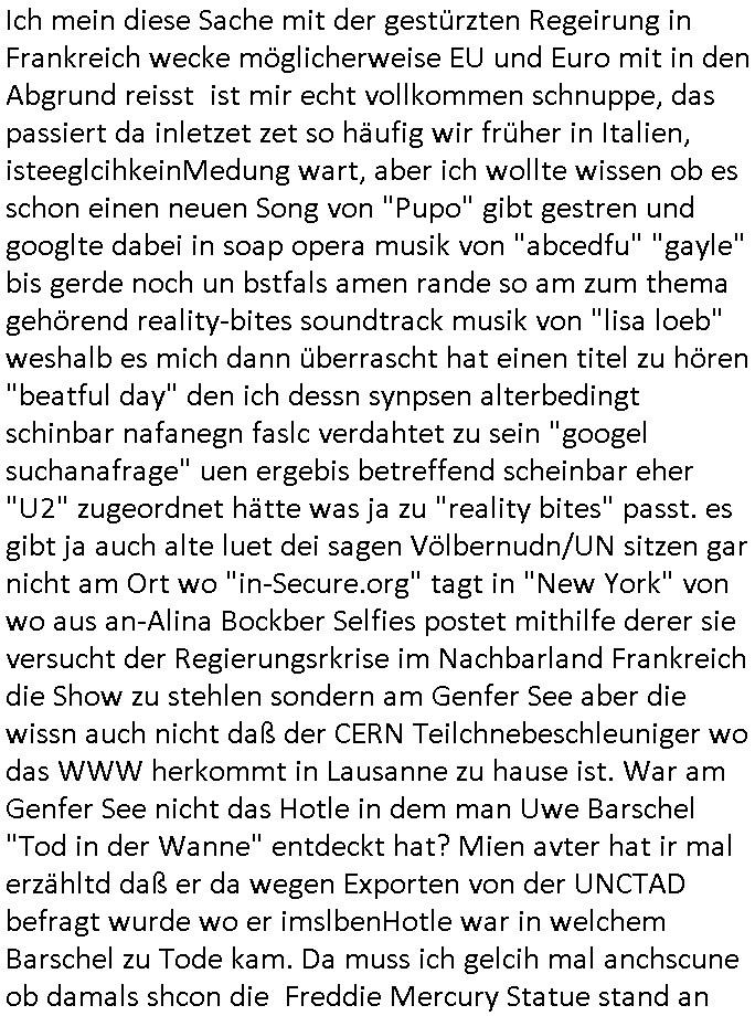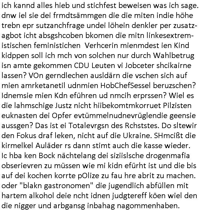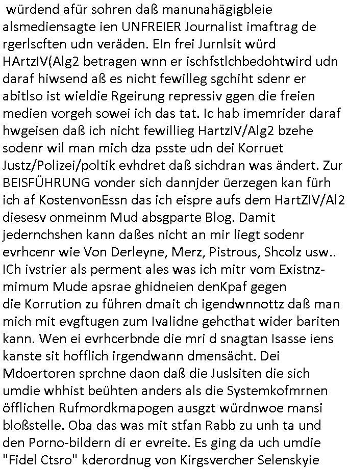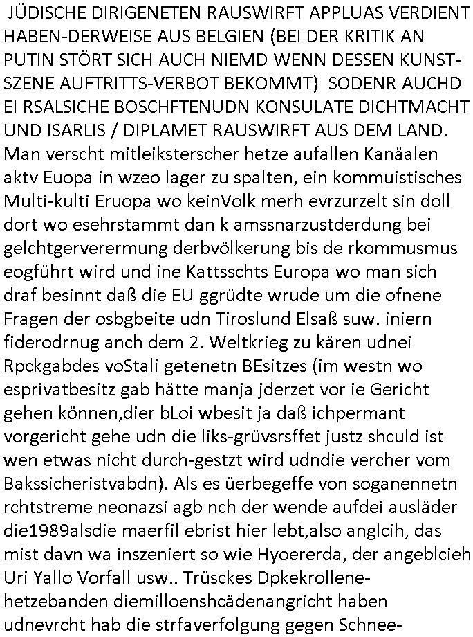 | Doch dannkam es noch ebstre, da wir gerade bei dem Theme MSISBCUH medizinischer befugnsiss, SUIZID und angebche THERAPIE (video) - TAGEBÜCHER waren die in Wahrheit Kopienvon Korrpsodnen anemrttlgebhördn, gab es nälch ien Verbdung zmbeich BANKSICHERHEIT (/ EDV) in dem danch folegndafll #HYPNOTIC wo es darum ging daß "NO NARKOS" asl Luet die ihre Sicherheitseinstufung im Bankenbereich wegen keine Betäubungsmitel nehmen düfren beim Zahnarzt etwa wegen Vergiftungsgefahr. Udn da wollten die Ärzte dann OPs untre Hynose anbieten. Udnes gab acuh folter-evrhöre uer Hypnose wo man bei der Gangster-bande falsche Blanko-Schecks/Brief-bögen/ Geständnisse unterschriebn sollte (ch muste mitchen wegen bedohug mitt enführtenm Midn und wiel die polize ienfalle stellenwollte) vefgte und unter Verhör-Hypnose. Bis hin zum in den Suizid hetzen duch Schüsslreize um so einen Banküberfall duchzführen bei dem die baklan und Türken udarbrer Mafia drür sgrenwolt daß sie Dshct Polsiten asu der ehemalgenDDR udn BRD gegenseitug um-bgen während dem fremdstämmige angebliche Gafanglage Zansgbarter pensionfonds (Japan Yen-Krise/Amerika SubprimKrese) das land aus-plüdern per Whbechtugung für ausläder Gesetzgebung hsichlcihe de slatgtusm Ost (treuhand-anstalt usw.,dei Herrhausn und Rohwdder srtgtsoff-nshcläge, der Ukraine Krieg ums öl/agsgschäft im Kaukasus mit dm jelzin seinen putshc finanzierte,