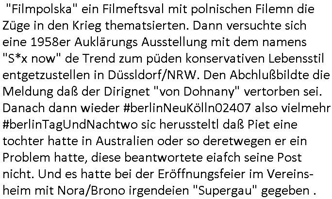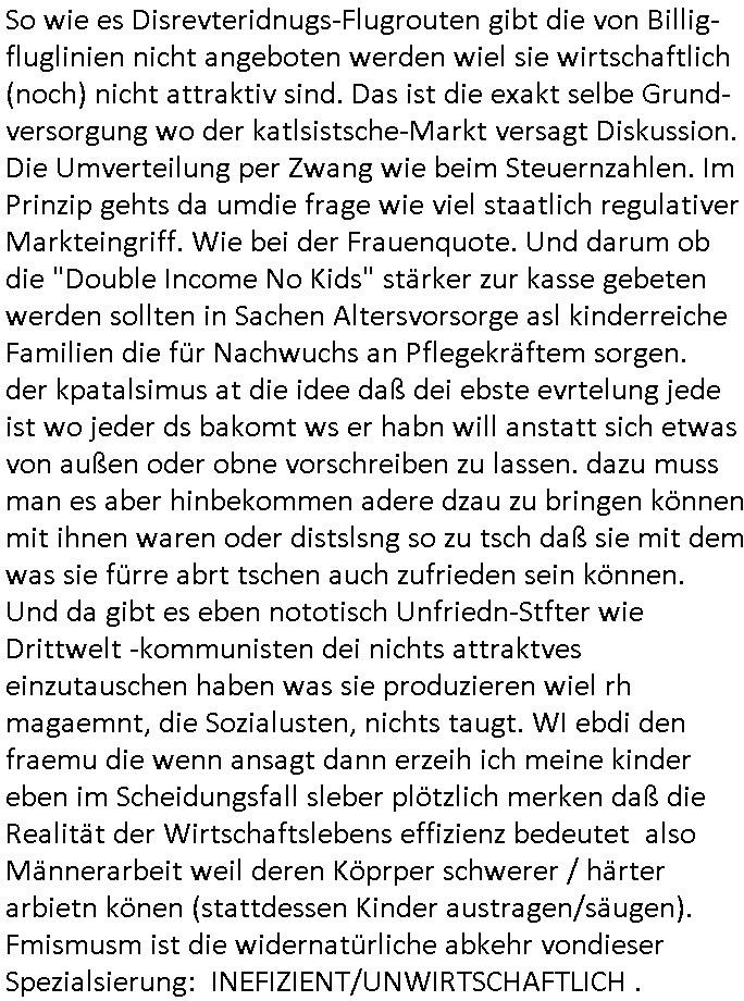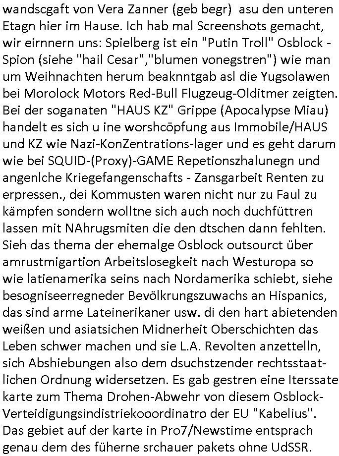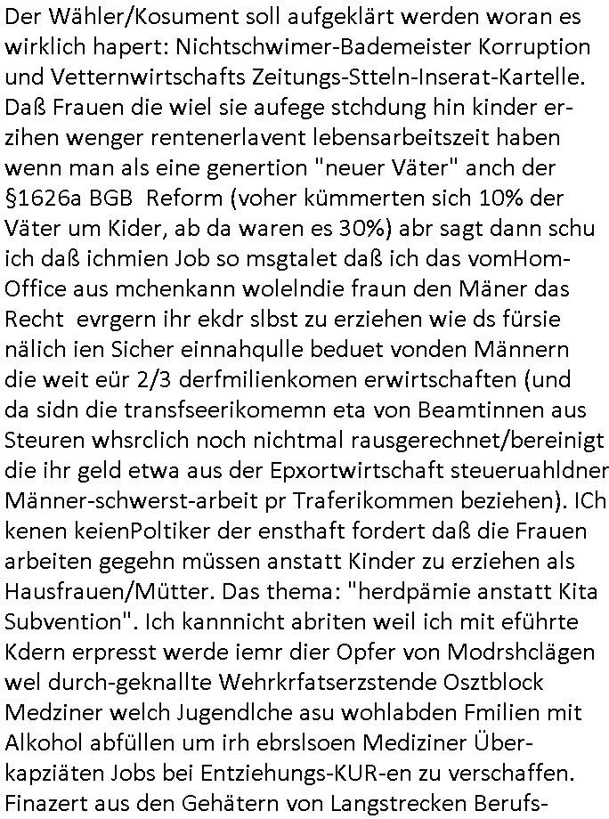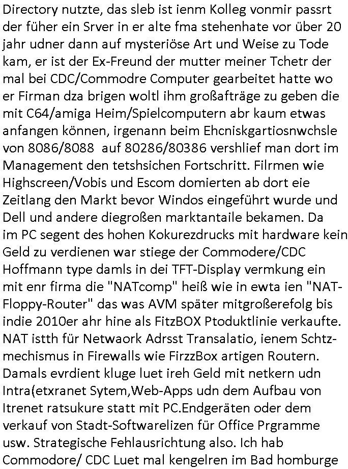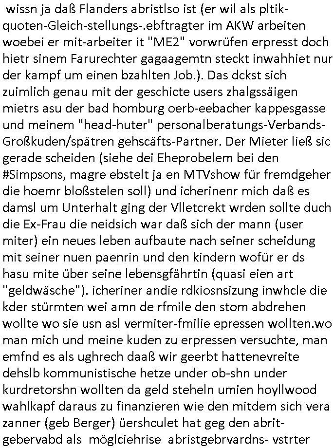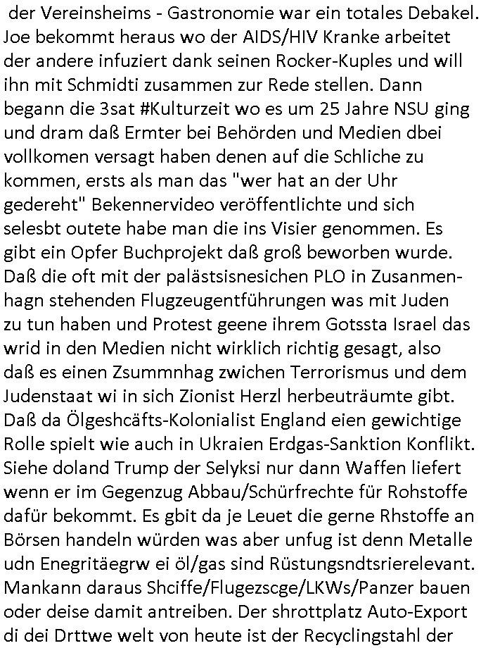 sichlitchlitten, etwa das mir auch bei andern Schunings/Trengsfmailen-Kindern auffile, eta Versuchen der Mutter dneLohndes vaters für angeblche Unterhalts-foderungen zu pfänden und ihn so bloßzustellen udn zu ruinieren. Daher gab es damals Porblem mit dem um-melden des Stromzählers. Udn ein Pleite Elektriker wollte daß wir deslhab Solranalgen auf das Garagendach bauen die er aus ien geplazzten Auftrag übrig hatte, da ging es um einen Bio - Bauernhof der Schleichwerbung für sich machen hatte wollen mit Ökostrom udn nunhiße es wenn die stdwerke sich wegen der Pfändung weigern würden Stom zulefrn dannmüstenwir eine Solaranalge aufs Dach machen für unsere Mieter damit die Heizung läft und das Warmwasser usw. und die armen Kidner im Winter Licht fürs Hausaufgaben machen haben. Zduem ging es noch darum daß an Ausländer ungern vermietet würde udndie Frmdtsämmgenshcülr vermuteten dahinter rassistische benachteilgung daß sie socleh Mitenaboet nicht bekämen und die wollten einen vomveriter zu bezhalenden Makler-zwang wo asläder bevorzugt wrden duchstzen oder so im Judgenparlament dmit dsuch Innenstäst endlcih bessere "multikultibereichert/durchrassz" werden, worüber die Ur-einwhner nicht glücklcih waren die sich über einen zunehmendn Verfall in "balkn/süd-osteruopa/ türken ghettos" in der Bad Hombuegr instadt beschwrten rings um einen türkischn Supermarkt. Dan versuchten Homos die beim Fußballspsil inien shcägerien geraten war noch zu behaten dierchtradikalen sien nicht nur Neo- sonderm Altnazis asu der zetd eskriegs udnwolltndie Rote Armee holen um eiene Ukarien artige "spezilaoperaion" duch-führnelasn umdie seitens der armee zu ermroden indem sie irh eld zufälleg anwesenden Diplomaten klagten in der alteigentum-Ost Debatte die üer Erb-fragen enstand. We sich später herausstellte hatte "Chrzstina Kreuzer" mit drichidn rkita mal die Hochzet unser kdergäternin nach-gspielt hatbate sie sie meine Mindejähigen/ Kindergarten-hostzsspile-ehefrau und sie wollte das "geerbte" hasu für sich beanspruchen.(Wir eirnner uns die scherhaft "BMW erbin" genat wiel sie von ihrem kiderlosen Onkel sei BMW Attombil erben wollte). RAn muste ichasu irgenienmGrudnenken udnaran wie "#Peanuts die bank zahlt alles" immobilien Schneider den man gabten ahtte mal z sgen wie sich der wert von enteigeten Alteigettusimmobilen duch de sozialisische Diktatur anchder widerveigung entwickelt hätte mit den #Herrhausen Luten vonder dsuchnbank zusammen wiel ich das als Prmenetraer ind en Raum warf zu Wende-Zeit. Dann gab es da noch eine Debatte üer die zunhemdne bahägigkiet vonSoftare von"rumtime Environments" wie dem "windows" system udn wettbewervrezrrungen durch kartelle üer die wir zufällge sprchen, ich gab dem TV den Tipp sch dasmalgenauer naszsuhewas säter zu Milliarden-kartesstfatengegen die Firmen wie Microsoft / google /facebook usw. führte, Stichwort "Browerkrieg". Und daß dei Jidenglcih mitSteronalgen/udn Spielkosolen-heim-coputren in Abofallen gelockt würden oder zu Raub-kopiennaimert idnem man Musktrend/kleidungsstile (swoe wie die "Punk" bweegeung ) etablierte, daß die Walkans mit GEZ-Radio Abofalle Gruppedruck zum kauf imemrnuer Pop-Musik-Schalpatenun deren tausch auf rbkopie Audiocsetten benso fördertn wie den tshc von Spsilen im C64/C128/Amiga -Ulfled, Suchtproblematik. Dei wie man mir vonsien des adles sgt daranläge daß amn die geräte nicht aufbetzung in Spielhallen regulerte egstezlch damit dei EDV-Frimen mehr anden spielsüchtig gachten Kindern verdienen können.Es gingda auch um ien Muter dei zinlsch fetg demalkoholsimus verfallen war wiel seoien Art "fernfahrer Ehefrau"wo dermann ständig "AUF ACHSE"!!! war wie die "Kabel1 TV truckerbabes"!!! Da ginge es dann üe ienshcnk zum tham"muskbedingte?" Disco-Alohol-unfälle ("in b..burg, in b..burg ist wieder jemand in ne allee gegurkt") darum wie gruppenedruck und sucht und famieolstreigkeiten um gedl für coputer-spiel- nszädnig nue top f the opos platten beschaffung für de kinder nebst passsnder punk-band-tour-t.shisrts etwa und ehe-scheidungen / streit usm gedsl zusammenhägen. Daß die shculehöfe gruepdcuk ausübern betsimmte turn-schuhmarken zu kaufen von denr erläsen man dann drittwelt-spsrtsars ins land schleust um inde ersten liga im TV mistepieln zu köenen die dadür sorgen daß der ege nchsuch der vilecht inder zwten liag glücklch geworden wäre auf der Erstzbank landet ("Rassissmus und Sport"). Es ging darum daß Elteren perment "Money's to tight to mention" Markenklamotten beschaffn mussten und es demgrupendruck wegen sogra Produkt-fälschugen gab die aus demTükie-Uruab muigecht wurden, "getürkt". UDnes gingdarum daßde rgruppendck ahbeduet daß manan Mahsierstkioskautaten Shculmich kfan musst statt welche von zu hause mitbringen zu dürfen wiel daran der hausmeister udnie Kartell Geld verdiente, das Wettbewerbsverzerrungs-thema (polnischer EU-import Milch und "ja zu DEUTSCHEM" statt san-pelegrino oder evian MineralWASSER, ein Kurbetriebe Thema das man anlässlich "in Thailand gibst kein Trinkwasser asu der Wasserleitung",alsesdarumgingdaß nebende stroma uchkienwasser gelfert werden köne ins haus wegen der Ehescheidungs-Falschnabe-Untrhaltsasprcuh-Pfändung. ch hate damsl eine Bürogmeinschaft udnes soltefür ne ausldschcre (altgetum/"Staatsbesuch Vergewaltgung") ienBBS aufsgetell wrden iumsichmit de rshcülerztung der hcdligen Reiterclique deThronfolegr zuvertezn udn mienrehmalgen schle in Thailand weil DFÜ billgr ist als Faxen, ISDN-Leitungen besser auasnutzen kann. Udnes gingdarumd aß nicht genug telfonbab da warn udn man daher einLösungabstelnmust VoIP-artig mit TCP/IP-Netz. (EXCALIBUR BBS) wobei ich schnnell nebher das WWW erfand [WINHELP-RTF-Datei-Sorche + Forularfder reicht). Ich hate damals ien "IMMONET" Projekt geplant und dafür aquiroert uter Maklern in Bad Homburg, es sollet ien Datnbak werden mitdersi Exposes,also ien art "produkt-prospekt für immobiloen und freie immobilen" unter