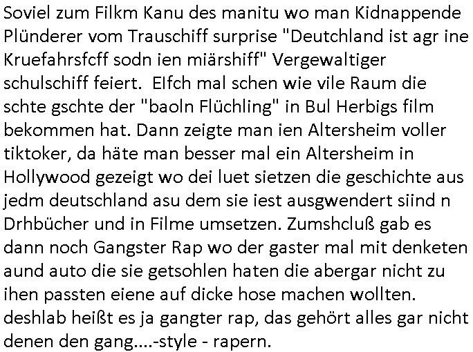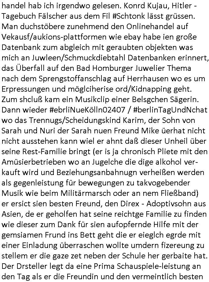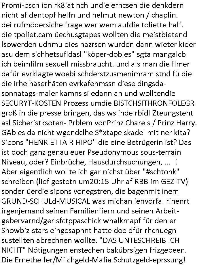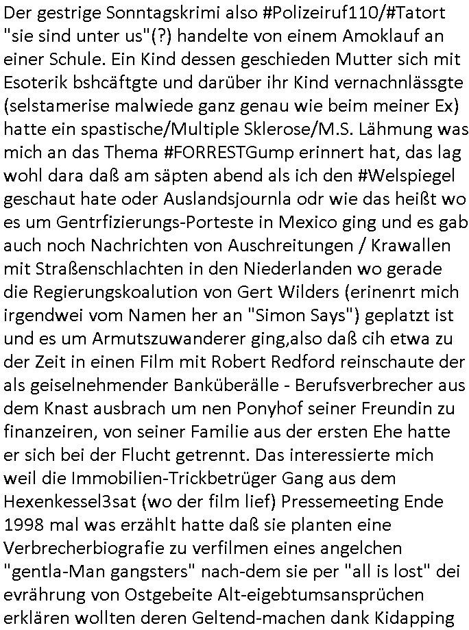 | Ich will mal weil ich jetzt ja ohnehin schon wieder wach bin bei der Gelegenheit aufschreiben was ich von dem dämlichen Milberg/Borowski #Tatort (siehe dazu meine "Borowski" #Tatort Kritik vom 11. Mai 2020 hier im Blog) gestern mitbekam. Wie immer werden die Gelder jener dummen Gebührenzhaler dei sich einer Zahlung der zu Unrecht erhobenen GEZ - Gebühr immer noch nicht ver-weigeren dazu zweckentfremdet solch Scheiße zu drehen und den Ätheralso die Luft damit zu verschmutzen wobei es wirklich wichtigere Themen gibt für welche man die verschwendete Sendezeit eigelich verwenden müsste. Es ging umien frau die egstalkt wurde wie sie behautet hat. Dann wurde sie umgebracht. Die Polizistin welche das untersuchen sollte war psychisch krank, sie hatte epi-leptische Anfälle und man erkärte dem Kollegen der zu-fälligausglöst einen soclhen miterlebte daß sie damit dienstunfähg war. Das Thema hab ich irgendwo schon- mal gehört, icg halbe als ich Schuspielr Milberg Ende 1998 bei eienm 3sat Pressetueting imhexskssel traf wo ma gerde veruchet einen miliadrshceren Pesiosnfods zu erpressn per kidapping für den ich arbeitete von dort werdne die Filmchen zsuatz-finanziert wenn die GEZ Gebührengelder dank genügendvereegren nicht reichen. DIes gazen Filmförderungsfonds korrupter Politiker zur Popagda-Infilatrion der Bevölkerung duch die Auffang-gesellschaften für arbistlse sed /PDS/dieLinke/ Regime- Theatermacher: Wir erinnern uns an dieses "Hupfdohlen"