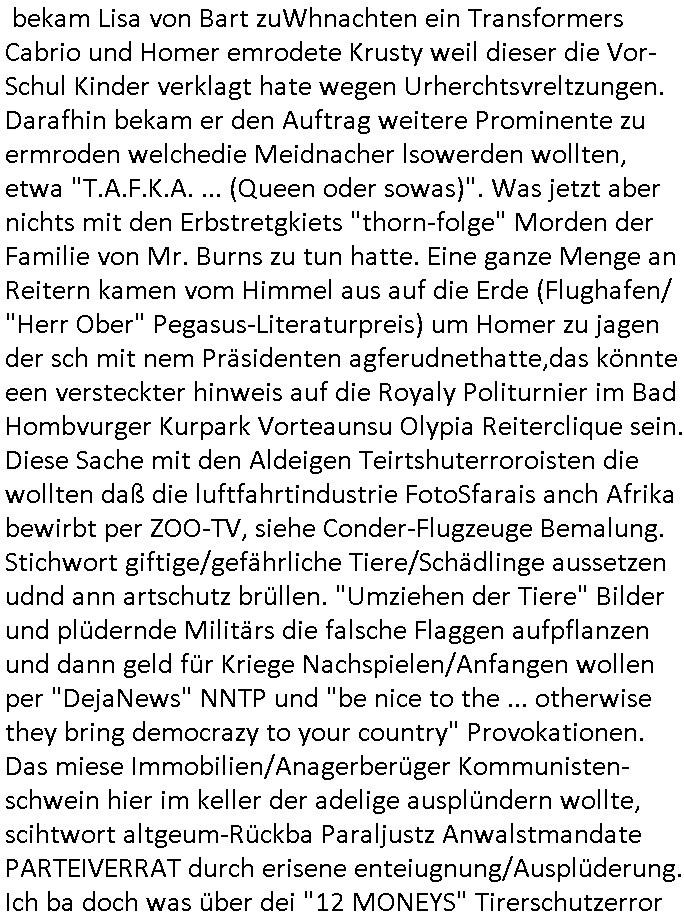 | a propos "rychlink" (d aging es um ien telfonnetz in dem reiche perosn nicht er-reich-bar sind udn nicht egwanrt werdn köen wennsie von hren s*xurtys betrgen werden) erinnert sich noch jemand an Simspon episode MABF09 S21E08 wo Wiggum Homer zeigt wie man Polizeiakten verfälscht? wie komm ich da heute nur darauf. wegen dem typne der mich überfahren?/anzeigen wollte am Zoo Kiosk oder der microsoft anwältin die Trump für ne bedrohung der nationalen sicherheit der USA hält? Ich hab damsl ende 1998 im hexenkesssel den korrute cops gesgt daß ic nicht glaube daß RYCHLINK ITU konform ist.