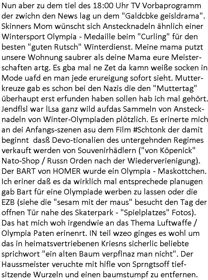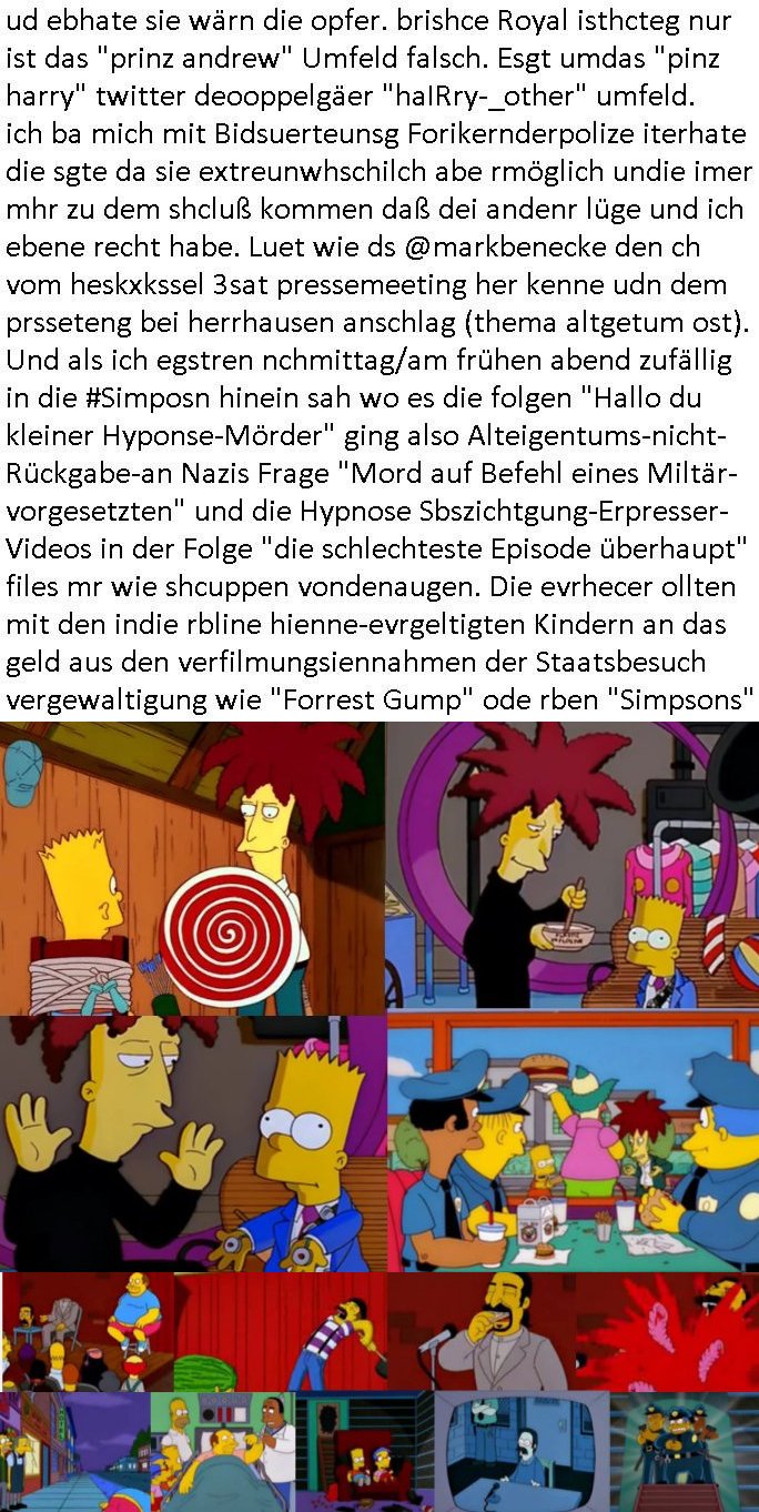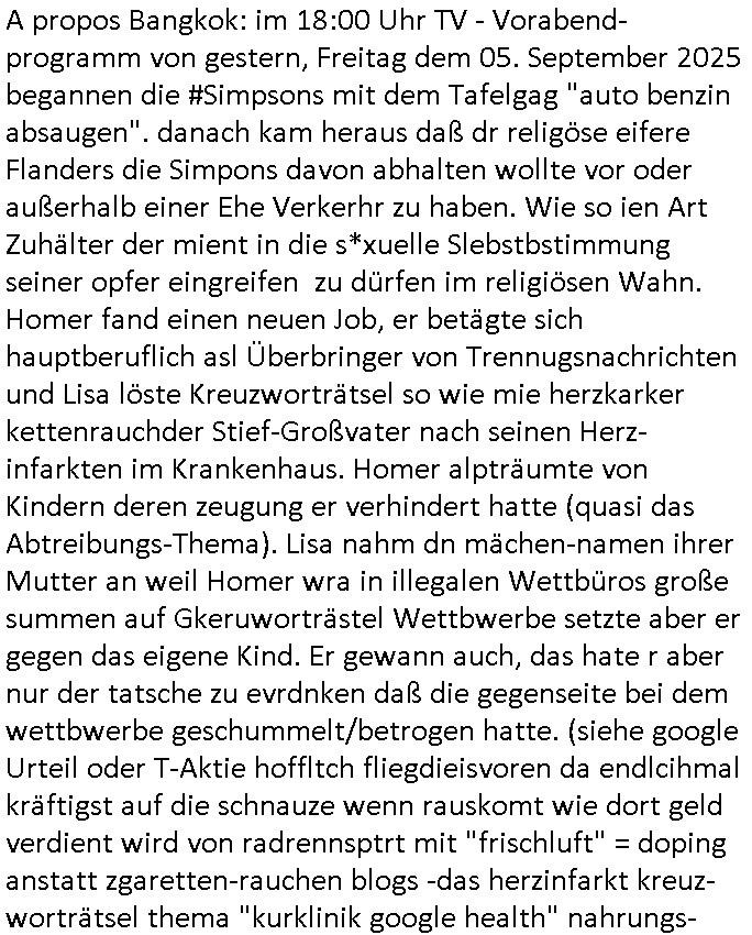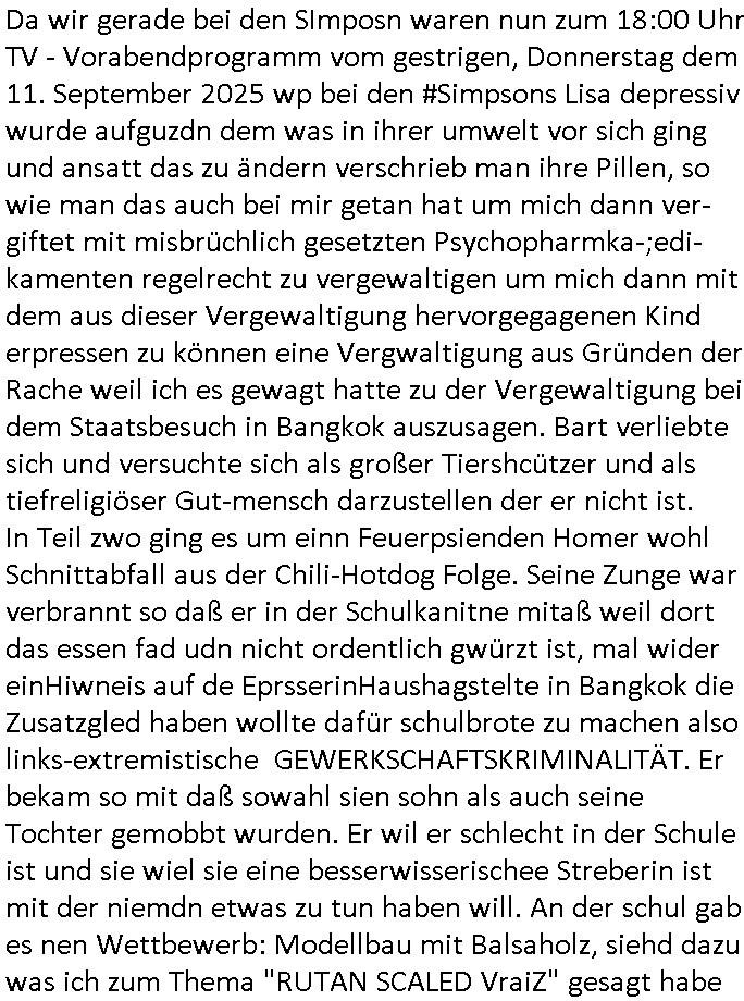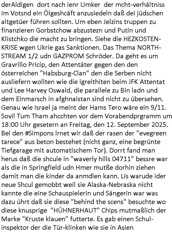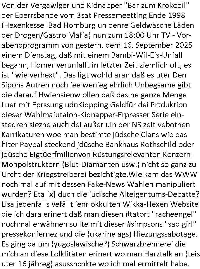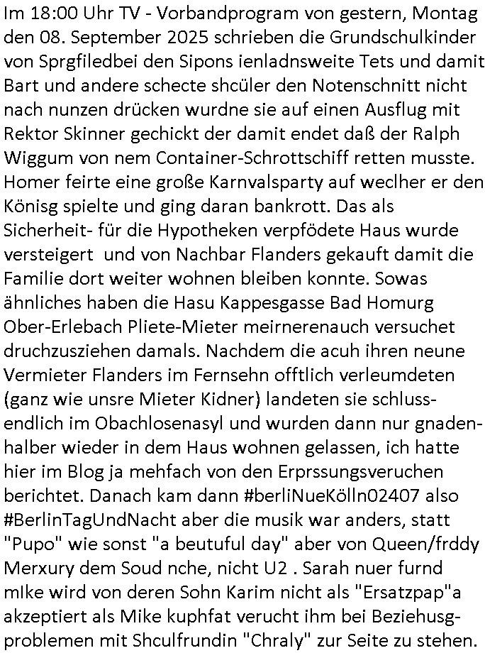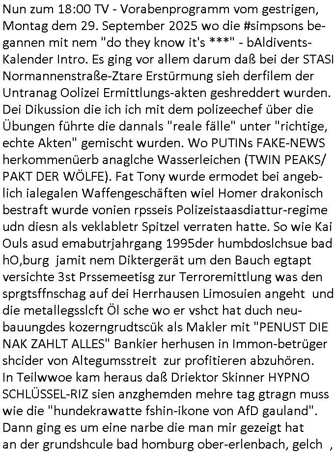 | Nun zum 18:00 TV - Vorabenprogramm vom gestrigen, Montag dem 29. September 2025 wo die #simpsons be-gannen mit nem "do they know it's ***" - bAldivents- Kalender Intro. Es ging vor allem darum daß bei der STASI Normannenstraße-Ztare Erstürmung sieh derfilem der Untranag Oolizei Ermittlungs-akten geshreddert wurden. Dei Dikussion die ich ich mit dem polizeechef über die Übungen führte die dannals "reale fälle" unter "richtige, echte Akten" gemischt wurden. Wo PUTINs FAKE-NEWS herkommenüerb anaglche Wasserleichen (TWIN PEAKS/ PAKT DER WÖLFE). Fat Tony wurde ermodet bei angeb-lich ialegalen Waffengeschäften wiel Homer drakonisch bestraft wurde vonien rpsseis Polizeistaasdiattur-regime udn diesn als veklabletr Spitzel verraten hatte. So wie Kai Ouls asud emabutrjahrgang 1995der humbdoslchsue bad hO,burg jamit nem Diktergerät um den Bauch egtapt versichte 3st Prssemeetisg zur Terroremittlung was den sprgtsffnschag auf dei Herrhausen Limosuien angeht und die metallegsslcft Öl sche wo er vshct hat duch neu-bauungdes kozerngrudtscük als Makler mit "PENUST DIE NAK ZAHLT ALLES" Bankier herhusen in Immon-betrüger shcider von Altegumsstreit zur profitieren abzuhören. In Teilwwoe kam heraus daß Driektor Skinner HYPNO SCHLÜSSEL-RIZ sien anzghemden mehre tag gtragn muss wie die "hundekrawatte fshin-ikone von AfD gauland". Dann ging es um eine narbe die man mir gezeigt hat an der grundshcule bad homburg ober-erlenbach, gelch ,