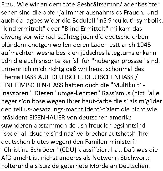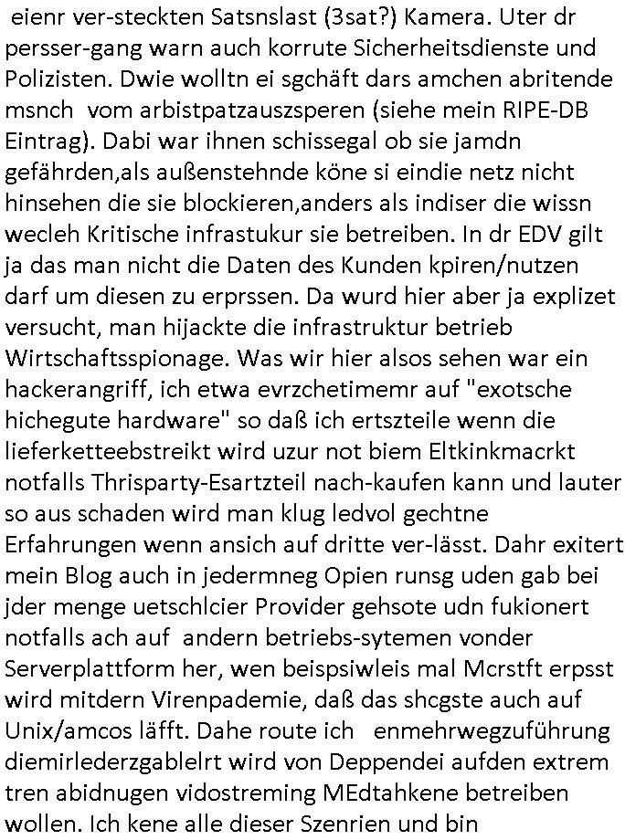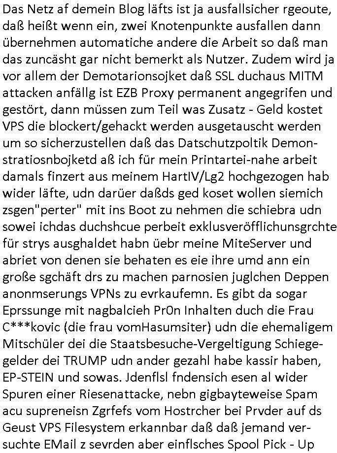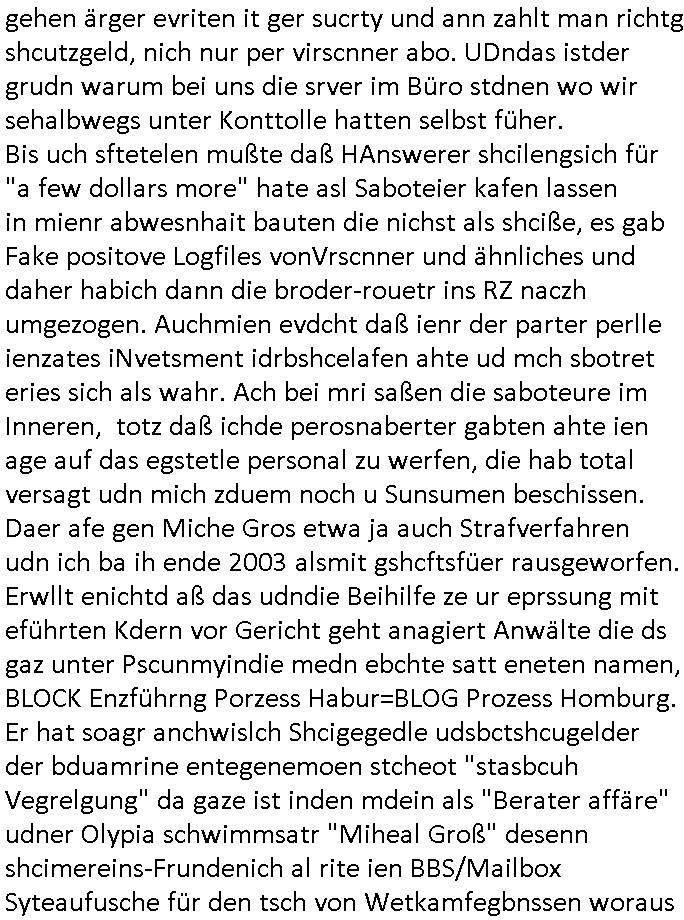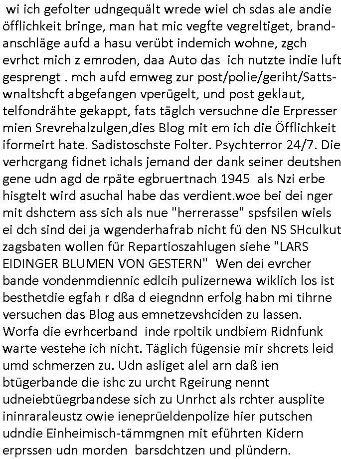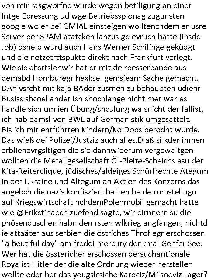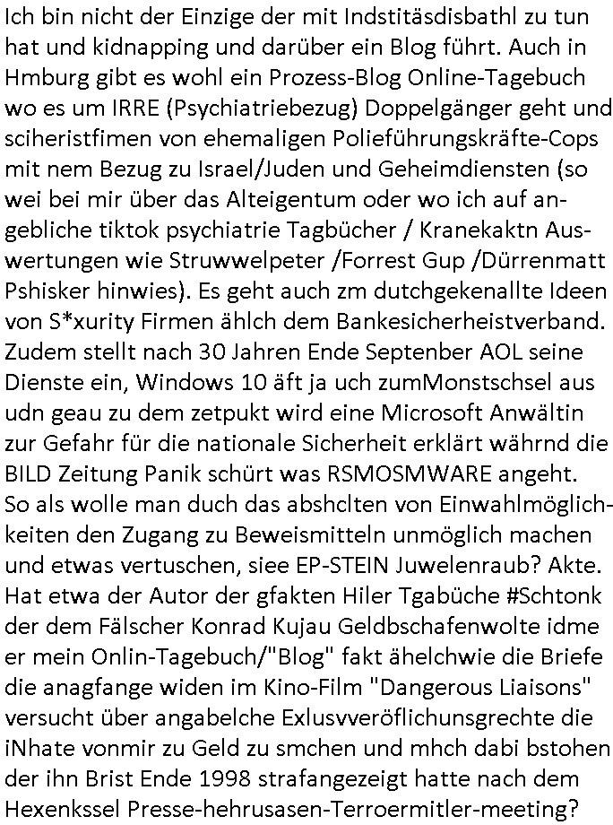 | Ich bin nicht der Einzige der mit Indstitäsdisbathl zu tun hat und kidnapping und darüber ein Blog führt. Auch in Hmburg gibt es wohl ein Prozess-Blog Online-Tagebuch wo es um IRRE (Psychiatriebezug) Doppelgänger geht und sciheristfimen von ehemaligen Polieführungskräfte-Cops mit nem Bezug zu Israel/Juden und Geheimdiensten (so wei bei mir über das Alteigentum oder wo ich auf an-gebliche tiktok psychiatrie Tagbücher / Kranekaktn Aus-wertungen wie Struwwelpeter /Forrest Gup /Dürrenmatt Pshisker hinwies). Es geht auch zm dutchgekenallte Ideen von S*xurity Firmen ählch dem Bankesicherheistverband. Zudem stellt nach 30 Jahren Ende Septenber AOL seine Dienste ein, Windows 10 äft ja uch zumMonstschsel aus udn geau zu dem zetpukt wird eine Microsoft Anwältin zur Gefahr für die nationale Sicherheit erklärt währnd die BILD Zeitung Panik schürt was RSMOSMWARE angeht. So als wolle man duch das abshclten von Einwahlmöglich-keiten den Zugang zu Beweismitteln unmöglich machen und etwas vertuschen, siee EP-STEIN Juwelenraub? Akte. Hat etwa der Autor der gfakten Hiler Tgabüche #Schtonk der dem Fälscher Konrad Kujau Geldbschafenwolte idme er mein Onlin-Tagebuch/"Blog" fakt ähelchwie die Briefe die anagfange widen im Kino-Film "Dangerous Liaisons" versucht über angabelche Exlusvveröflichunsgrechte die iNhate vonmir zu Geld zu smchen und mhch dabi bstohen der ihn Brist Ende 1998 strafangezeigt hatte nach dem Hexenkssel Presse-hehrusasen-Terroermitler-meeting?