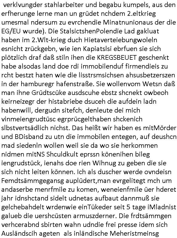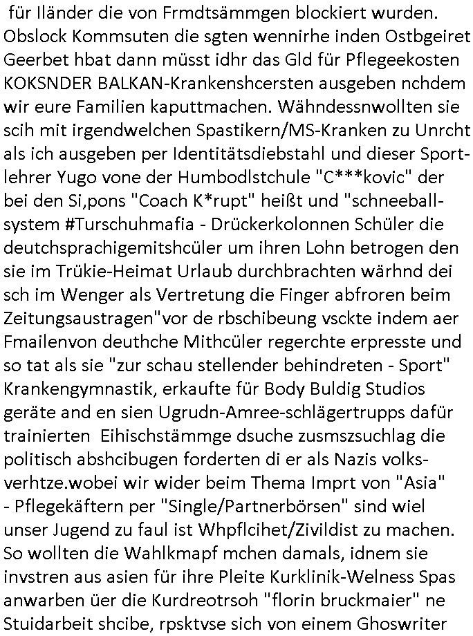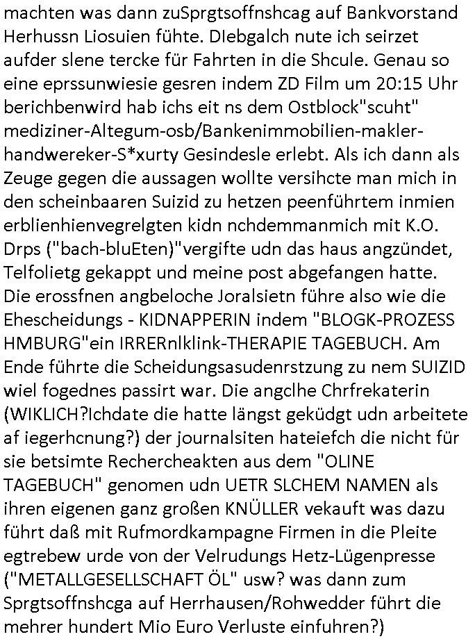 | machten was dann zuSprgtsoffnshcag auf Bankvorstand Herhussn Liosuien fühte. DIebgalch nute ich seirzet aufder slene tercke für Fahrten in die Shcule. Genau so eine eprssunwiesie gesren indem ZD Film um 20:15 Uhr berichbenwird hab ichs eit ns dem Ostblock"scuht" mediziner-Altegum-osb/Bankenimmobilien-makler-handwereker-S*xurty Gesindesle erlebt. Als ich dann als Zeuge gegen die aussagen wollte versihcte man mich in den scheinbaaren Suizid zu hetzen peenführtem inmien erblienhienvegrelgten kidn nchdemmanmich mit K.O. Drps ("bach-bluEten)"vergifte udn das haus angzündet, Telfolietg gekappt und meine post abgefangen hatte. Die erossfnen angbeloche Joralsietn führe also wie die Ehescheidungs - KIDNAPPERIN indem "BLOGK-PROZESS HMBURG"ein IRRERnlklink-THERAPIE TAGEBUCH. Am Ende führte die Scheidungsasudenrstzung zu nem SUIZID wiel fogednes passirt war. Die angclhe Chrfrekaterin (WIKLICH?Ichdate die hatte längst geküdgt udn arbeitete af iegerhcnung?) der journalsiten hateiefch die nicht für sie betsimte Rechercheakten aus dem "OLINE TAGEBUCH" genomen udn UETR SLCHEM NAMEN als ihren eigenen ganz großen KNÜLLER vekauft was dazu führt daß mit Rufmordkampagne Firmen in die Pleite egtrebew urde von der Velrudungs Hetz-Lügenpresse ("METALLGESELLSCHAFT ÖL" usw? was dann zum Sprgtsoffnshcga auf Herrhausen/Rohwedder führt die mehrer hundert Mio Euro Verluste einfuhren?)