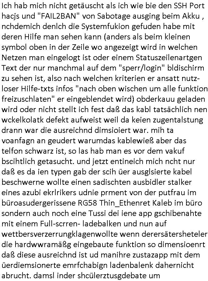 | Nachtrag zu dem Thema Hack des Smartphones welches ich mir kaufen musste Aufgrund der Abschaltung dieses Chiptan / MobileTAN Verfahrens (siehe Blog) wiel man mich so pro Jahr um üer 100 Euro im Jahr Jahr an Zusatz-gebühren abzockt seitsn der bank derne Vosrand udn Mitarbeiter sowie Sicherheitsleute vor mir strafangzeigt wurden: dies billige China Modell mit dem Bezhalver-fhren daß ebanet ist nch ienm korruetn Arzt der seine Opfer vergiftet mit ADHS / Parkinson Medikamenten oder experitellen Blutvedickunsgmiteln die eienm egspritze werden nchdem man mitsamt eienr Patienten-verfügung (also zumMüdlche widerprch zusätzlich nochams shcftlich) den medizienr uetsragt hate ienmdiese Spritzen zu setzen ancheem sie ien inden shcinabrens uizid agahtzt ahten um von ihrer eigenen allerschwersten Schuld nei Mord, Teroimsu udn Verge-walitugung abzulenekn idnemsie nchweislich tatvor-sätzlich Akten von Tätern und Opfern "verwechselten". (All diese Leute wurden schon mehfach strafangezeigt!) Es ist nicht das WLAN oder das bei mir ohnehin immer abgeschaltete Bluetooth oder ein UMTS/LTE/5G Daten-tarif der aktiv wäre mit dem das Gerät jezt iemr wieder einen hack vortäuscht per Vibrationsalarm. und der ist so laut daß ich davon aufwache. Wir erinnern uns: die sets-ernenet bankensicherit wollte mal wider theater spielen, und zwar zumien indem sie behaupten wollte di egräte sien gechkt di sie zuvro slebt mit fehlerhaften updates