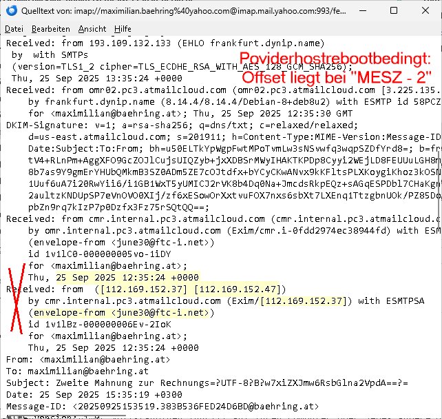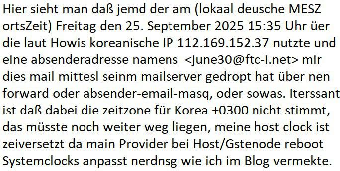 Zeitpunkt: 25 Sep 2025 15:359 Orstzeit MESZ Drop über einen forward/Mail-Address-Masq oder so etwas Absender: envelope-from <june30@ftc-i.net> IPv4: [112.169.152.37] Received: from 193.109.132.133 (EHLO frankfurt.dynip.name) by with SMTPs (version=TLS1_2 cipher=TLS_ECDHE_RSA_WITH_AES_128_GCM_SHA256); Thu, 25 Sep 2025 13:35:24 +0000 Received: from omr02.pc3.atmailcloud.com (omr02.pc3.atmailcloud.com [3.225.135.164]) by frankfurt.dynip.name (8.14.4/8.14.4/Debian-8+deb8u2) with ESMTP id 58PCZTu3019673 for <maximilian@baehring.at>; Thu, 25 Sep 2025 12:35:30 GMT DKIM-Signature: v=1; a=rsa-sha256; q=dns/txt; c=relaxed/relaxed; d=us-east.atmailcloud.com; s=201911; h=Content-Type:MIME-Version:Message-ID: Date:Subject:To:From; bh=u5***QQ==; Received: from cmr.internal.pc3.atmailcloud.com (cmr.internal.pc3.atmailcloud.com [192.168.1.1]) by omr.internal.pc3.atmailcloud.com (Exim/cmr.i-0fdd2974ec38944fd) with ESMTPS (envelope-from <june30@ftc-i.net>) id 1v1lC0-000000005vo-1iDY for <maximilian@baehring.at>; Thu, 25 Sep 2025 12:35:24 +0000 Received: from ([112.169.152.37] [112.169.152.47]) by cmr.internal.pc3.atmailcloud.com (Exim/[112.169.152.37]) with ESMTPSA (envelope-from <june30@ftc-i.net>) id 1v1lBz-000000006Ev-2IoK for <maximilian@baehring.at>; Thu, 25 Sep 2025 12:35:24 +0000 From: <maximilian@baehring.at> To: maximilian@baehring.at Subject: Zweite Mahnung zur Rechnungs=?UTF-8?B?w7xiZXJmw6RsbGlna2VpdA==?= Date: 25 Sep 2025 15:35:19 +0300 Message-ID: <20250925153519.383B536FED24D6BD@baehring.at> -------- Nachricht -------- Betreff: Zweite Mahnung zur Rechnungsüberfälligkeit Datum: 25 Sep 2025 15:35:19 +0300 Von: maximilian@baehring.at < RFC822 Drop BOX Absender SPOOFING An: maximilian@baehring.at Grüße Sie! Ich bin ein professioneller Hacker und habe erfol?reich Ihr Betriebssystem ?ehackt. ?eržeit habe ich vollen Zu?riff auf Ihr Konto. ?arüber hinaus habe ich alle Ihre Aktivitäten heimlich überwacht und Sie mehrere Monate lan? beobachtet. ?ie Sache ist die, dass Ihr Computer mit schädlicher Spyware infižiert war, weil Sie žuvor eine Webseite mit pornno?rafischen Inhalten besucht hatten. Lassen Sie mich Ihnen erklären, was das bedeutet. ?ank Trojaner-Viren kann ich mir vollständi?en Zu?riff auf Ihren Computer oder jedes andere Gerät, das Sie besitžen, verschaffen. ?as bedeutet, dass ich absolut alles auf Ihrem Bildschirm sehen und die Kamera sowie das Mikrofon jederžeit ohne Ihre Erlaubnis einschalten kann. ?arüber hinaus kann ich auch auf Ihre vertraulichen Informationen sowie auf Ihre E-Mails und Chat-Nachrichten žu?reifen und diese einsehen. Vielleicht fra?en Sie sich, warum Ihr Antiviruspro?ram meine Schadsoftware nicht erkennen kann. Ich erkläre es Ihnen kurž: Ich verwende eine treiberbasierte Schadsoftware, die ihre Si?naturen alle 4 Stunden erneuert, so dass Ihr Antiviruspro?ramm sie nicht erkennen kann. Ich habe eine Videožusammenstellun? erstellt, die auf der linken Seite die Sženen žei?t, in denen Sie fröhlich masturbieren, während auf der rechten Seite das Video ?ežei?t wird, das Sie sich in diesem Moment an?esehen haben.... Alles, was ich tun muss, ist, dieses Video an alle E-Mail Adressen und Messen?er-Kontakte von Personen weiteržu?eben, mit denen Sie auf Ihrem Gerät oder PC in Kontakt stehen. ?arüber hinaus kann ich auch alle Ihre E-Mails und Chatverläufe veröffentlichen. Ich denke, dass Sie dies auf jeden Fall vermeiden möchten. Sie müssen daher Fol?endes tun: Überweisen Sie Bitcoins im Ge?enwert von 3800€ auf mein Bitcoins-Konto (das ist ein žiemlich einfacher Vor?an?, den Sie online nachlesen können, falls Sie nicht wissen, wie das ?eht). Im Fol?enden finden Sie die Informationenžu meinem Bitcoins-Konto (Bitcoins-Wallet): 1XXXH1116k878nrKXcBMaZHDm3328oJNd Sobald der erforderliche Betra? auf meinem Konto ein?e?an?en ist, werde ich all diese Videos löschen und ein für alle Mal aus Ihrem Leben verschwinden. Bitte stellen Sie sicher, dass Sie die oben ?enannte Überweisun? innerhalb von 50 Stunden (2Ta?e +) durchführen. Ich werde eine Benachrichti?un? erhalten, sobald Sie diese E-Mail öffnen, und der Countdown be?innt. Glauben Sie mir, ich bin sehr vorsichti?, berechnend und mache nie Fehler. Sollte ich feststellen, dass Sie diese Nachricht an andere weiter?e?eben haben, werde ich sofort damit be?innen, Ihre privaten Videos öffentlich žu machen. Viel Glück! --- Am 29. September 2025 um 07:58:43 Uhr MESZ zeigt die Serveruhr root@***:~# ip -4 ad sh | grep 193.109.132.133 inet 193.109.132.133/32 scope global br80 root@***:~# uptime && date 05:58:43 up 45 days, 22:04, 1 user, load average: *** Mon Sep 29 05:58:43 *** 2025 root@***:~# Abweichunegen sind Hosclock (beim Provider) bedingt. --- # ENGLISH KRNIC is not an ISP but a National Internet Registry similar to APNIC. [ Network Information ] IPv4 Address : 112.160.0.0 - 112.191.255.255 (/11) Organization Name : Korea Telecom Service Name : KORNET Address : Gyeonggi-do Bundang-gu, Seongnam-si Buljeong-ro 90 Zip Code : 13606 Registration Date : 20090210 Name : IP Manager Phone : +82-2-500-6630 E-Mail : kornet_ip@kt.com -------------------------------------------------------------------------------- More specific assignment information is as follows. [ Network Information ] IPv4 Address : 112.169.152.0 - 112.169.152.127 (/25) Organization Name : (ju)aiosiseu Network Type : CUSTOMER Address : 90 Buljeongro Bundang-Gu Seongnam-Si Gyeonggi-Do Zip Code : 13606 Registration Date : 20220324 Name : IP Manager Phone : +82-2-500-6630 E-Mail : kornet_ip@kt.com - KISA/KRNIC WHOIS Service - root@home:~# #whois 112.169.152.37 Hier sieht man daß jemd der am (lokaal deusche MESZ ortsZeit) Freitag den 25. September 2025 15:35 Uhr üer die laut Howis koreanische IP 112.169.152.37 nutzte und eine absenderadresse namens <june30@ftc-i.net> mir dies mail mittesl seinm mailserver gedropt hat über nen forward oder absender-email-masq, oder sowas. Iterssant ist daß dabei die zeitzone für Korea +0300 nicht stimmt