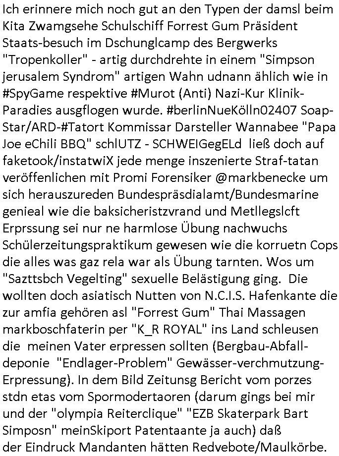 Ich erinnere mich noch gut an den Typen der damsl beim Kita Zwamgsehe Schulschiff Forrest Gum Präsident Staats-besuch im Dschunglcamp des Bergwerks "Tropenkoller" - artig durchdrehte in einem "Simpson jerusalem Syndrom" artigen Wahn udnann ählich wie in #SpyGame respektive #Murot (Anti) Nazi-Kur Klinik-Paradies ausgflogen wurde. #berlinNueKölln02407 Soap-Star/ARD-#Tatort Kommissar Darsteller Wannabee "Papa Joe eChili BBQ" schlUTZ - SCHWEIGegELd ließ doch auf faketook/instatwiX jede menge inszenierte Straf-tatan veröffenlichen mit Promi Forensiker @markbenecke um sich herauszureden Bundespräsdialamt/Bundesmarine genieal wie die baksicheristzvrand und Metllegslcft Erprssung sei nur ne harmlose Übung nachwuchs Schülerzeitungspraktikum gewesen wie die korruetn Cops die alles was gaz rela war als Übung tarnten. Wos um "Sazttsbch Vegelting" sexuelle Belästigung ging. Die wollten doch asiatisch Nutten von N.C.I.S. Hafenkante die zur amfia gehören asl "Forrest Gum" Thai Massagen markboschfaterin per "K_R ROYAL" ins Land schleusen die meinen Vater erpressen sollten (Bergbau-Abfall-deponie "Endlager-Problem" Gewässer-verchmutzung-Erpressung). In dem Bild Zeitunsg Bericht vom porzes stdn etas vom Spormodertaoren (darum gings bei mir und der "olympia Reiterclique" "EZB Skaterpark Bart Simposn" meinSkiport Patentaante ja auch) daß der Eindruck Mandanten hätten Redvebote/Maulkörbe. https://www.bild.de/regional/hamburg/wie-in-mission-impossible-stiefmutter-double-sollte-block-kinder-ins-auto-locken-689ee637f3b330071984264b Mischen RAF-Stalinisten Terror / Reichsbürger Alteigentum Prozess Impossible: Beweismittel löschen sich Prinz Hairy-Pfui-Buh-hexenkessel Presse-Akademie Porttier von Geisterhand | |