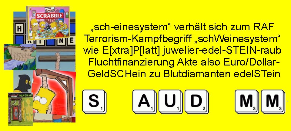 | „sch-einesystem“ verhält sich zum RAF Terrorism-Kampfbegriff „schWeinesystem“ wie E[xtra]P[latt] juwelier-edel-STEIN-raub Fluchtfinanzierung Akte also Euro/Dollar- GeldSCHein zu Blutdiamanten edelSTein