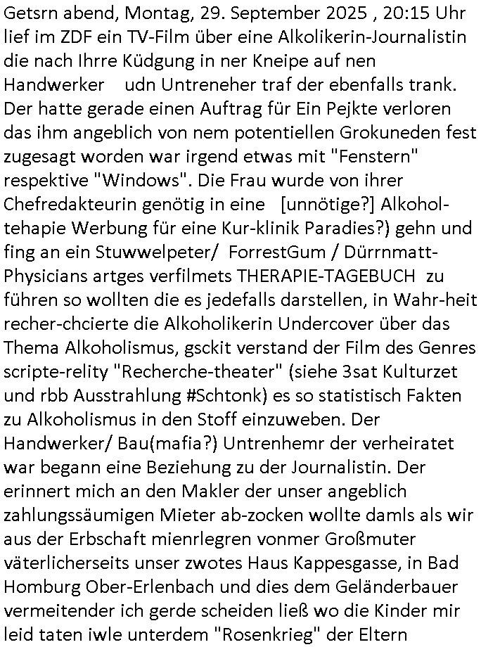 | Getsrn abend, Montag, 29. September 2025 , 20:15 Uhr lief im ZDF ein TV-Film über eine Alkolikerin-Journalistin die nach Ihrre Küdgung in ner Kneipe auf nen Handwerker udn Untreneher traf der ebenfalls trank. Der hatte gerade einen Auftrag für Ein Pejkte verloren das ihm angeblich von nem potentiellen Grokuneden fest zugesagt worden war irgend etwas mit "Fenstern" respektive "Windows". Die Frau wurde von ihrer Chefredakteurin genötig in eine [unnötige?] Alkohol-tehapie Werbung für eine Kur-klinik Paradies?) gehn und fing an ein Stuwwelpeter/ ForrestGum / Dürrnmatt-Physicians artges verfilmets THERAPIE-TAGEBUCH zu führen so wollten die es jedefalls darstellen, in Wahr-heit recher-chcierte die Alkoholikerin Undercover über das Thema Alkoholismus, gsckit verstand der Film des Genres scripte-relity "Recherche-theater" (siehe 3sat Kulturzet und rbb Ausstrahlung #Schtonk) es so statistisch Fakten zu Alkoholismus in den Stoff einzuweben. Der Handwerker/ Bau(mafia?) Untrenhemr der verheiratet war begann eine Beziehung zu der Journalistin. Der erinnert mich an den Makler der unser angeblich zahlungssäumigen Mieter ab-zocken wollte damls als wir aus der Erbschaft mienrlegren vonmer Großmuter väterlicherseits unser zwotes Haus Kappesgasse, in Bad Homburg Ober-Erlenbach und dies dem Geländerbauer vermeitender ich gerde scheiden ließ wo die Kinder mir leid taten iwle unterdem "Rosenkrieg" der Eltern