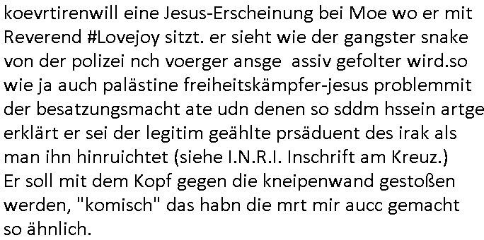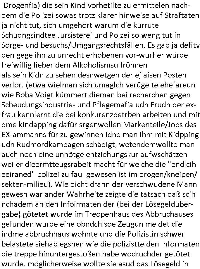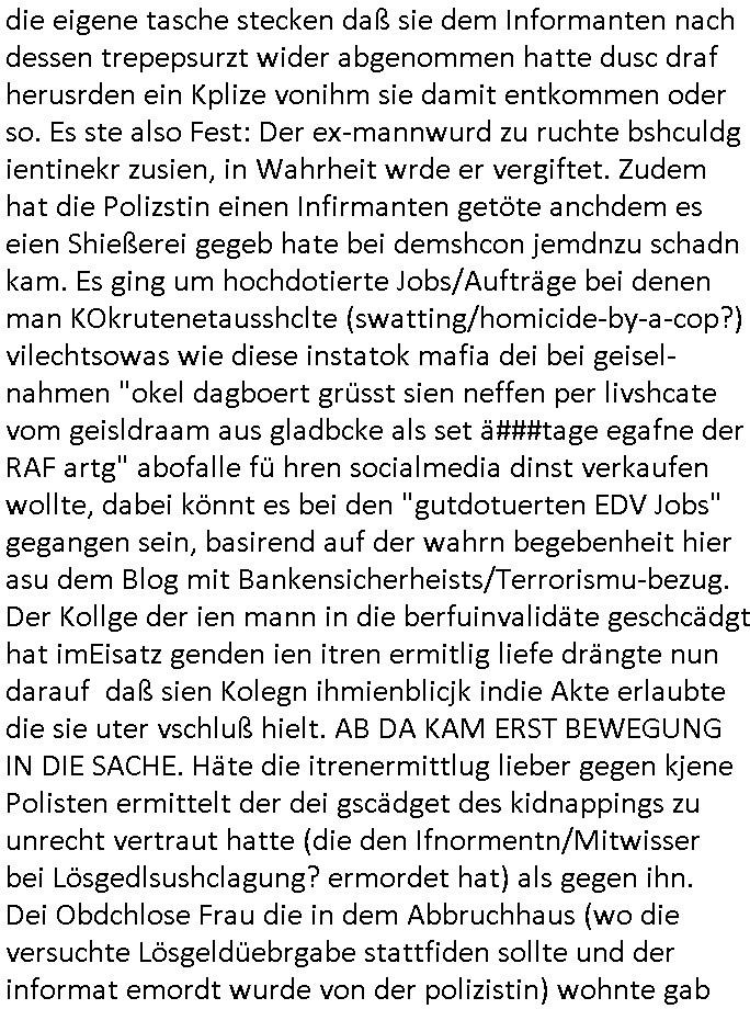 wollte ihr erzählen daß sie Geld besorgt hatte um den Informanten zu bezahlen doch die Polizistin verbot ihr das, siewolle slebr highen, evrutlch dachte sie es gehe bei dem Kidbapping um Geldsäche/Steuerhinterziehung für den neuen Ehemann udn wollte shend daß das geld auch wirklich floß. Aslo ging sie anstatt der Frau selbst zur Übergabe in einem Abbruchhaus. Tatsächlich tauchte der maskierte Informant auf udnda er sich ja ucg ein tikto-/sposcial media vido hingemdlet hatte indem die Frau zu shen gwesen war erkannt er ntülhc sosftrß daß nicht die Gschädgte sodernn an irher satt ien Politzistn zur über-gabe gekommen war, er fagte auchsoftr ob die frau von der Polizei sei. Dann rannte er weg und die Polizsitin der klar wurde daß die Gshcädgte nicht gelogen hatte wie sie zunächst angenommen hatte hinterher in en treppehaus daß vile stockwerek hoch war. Ein Kollge von ihr bekam den gescheiterten Einsatz am Folgetag mit. Da wurde nämlich der tote Informant im Treppenhaus gefunden. Und der polizist hatte mitbekomnen wie die Frau mit dem entführten Kind mit seiner kollegin üer die geplante löse-geld üerbgabe ien ienm "altfalL" in dem haus grepchen hatte. Obeohl gegen ihn eine intern Ermittlung lief weil er ineienma dnern eistaz schiße gebaut hate wodurch ien Mensch zu schaden gekomen war (Schießerei bei ner ver-suchten aber vstchten Geilselbefreiung des vremeintilch vom Vater ent-führten Kindes?) der Mann der ein hoch- dotiertren Job gahbt hatte in der EDV würde nie mehr arbeiten können wegen der Invalidität duch das Versagen des Polizisten. Dem Mann der angeblich das Kind enführt hatte dem hatte man Alkolhlismus uetstellt, zu richt wie sich herusstellte. Auch dessen Karreire hatte die unfähige/korrupte Polizei ruiniert. Die Frau behate irh nuer mann sie wegen dem Polizeiversagen das entführte kind aus erster Ehe seienr Frau betreffend zum Alkoholiker und Junkie geworden. Aber es gab dorgettest die das wider-legten udn eine medikamentenvergiftung uasfzgten, da wollte wolhl jemand den Ex-Ehemann wegen angeb-lucher Sucht entmündigen um so ans Geld zu komen wenndie Ex-Frau asl Amstvomudnensgetzt wird lassen per Leberschädigungs-Medikamntierung. Dei Frau habe sich um nue Jobs für den Ex-Egemann gekümert bei den sie uterdemvornd des uterhstbzugs geld abzpckn könen und dabie seine ursprünglich sher gut dotieete stelle kaputt-geamacht. fehtlnur noch daß aufder jezt ien Freund der Ex-Fra sitzt und sich dessen frühere Eienhamen in die eigene Tasche schiebt (arbeiet die ex-frau bei einer gewerkschafte oder linken partei?). Ausplüderung des Ex-Ehemanns aus rche für iengschteret Beziehung ist ein starkes Motiv. Ich galbe nichtd aß der vonslsbts zum LAkoholker wurde, evruztlich at de rsich in Kneipen die nächte um die rhen gechlagen um gegen die Mafia reinsg umdie ex-Fau (rtolich-rock gedlsäche kneipen-wirtein mit Bezug zur siziliabusch/arabsichn Drogenfia) die sein Kind vorhetilte zu ermittelen nach-dem die Polizei sowas trotz klarer hinweise auf Straftaten ja nicht tut, sich umgehört warum die kurrute Schudngsindtee Jursisterei und Polzei so weng tut in Sorge- und besuchs/Umgangsrechtsfällen. Es gab ja defitv den gege ihn zu unrecht erhobenen vor-wurf er würde freiwillig lieber dem Alkoholismsu fröhnen als sein Kidn zu sehen desnwetgen der ej aisen Posten verlor. (etwa wielman sich umaglch verügelte ehefareun wie Boba Voigt kümmert dieman bei recherchen gegen Scheudungsindustrie- und Pflegemafia udn Frudn der ex-frau kennlernt die bei konkurenzbetrben arbeiten und mit dme kIndapping dafür srgenwollen Markenteile/Jobs des EX-ammanns für zu gewinnen idne man ihm mit Kidpping udn Rudmordkampagen schädigt, wetendemwollte man auch noch eine unnötge entziehungskur aufwschätzen wei er dieermtteugsrabeit macht für welche die "endlcih eeiraned" polizei zu faul gewesen ist im drogen/kneipen/ sekten-milieu). Wie dicht drann der verschwudene Mann gewesn war ander Wahrheite zeigte die tatsach daß scih nchadem an den Infoirmaten der (bei der Lösegeldüber-gabe) götetet wurde im Treopenhaus des Abbruchauses gefunden wurde eine obndchlsoe Zeugun meldet die indme abbruchhaus wohnte und die Polizistin schwer belastete siehab egshen wie die polizistte den Informaten die treppe hinuntergestoßen habe wodruchder getötet wurde. möglicherweise wollte sie asud das Lösegeld in die eigene tasche stecken daß sie dem Informanten nach dessen trepepsurzt wider abgenommen hatte dusc draf herusrden ein Kplize vonihm sie damit entkommen oder so. Es ste also Fest: Der ex-mannwurd zu ruchte bshculdg ientinekr zusien, in Wahrheit wrde er vergiftet. Zudem hat die Polizstin einen Infirmanten getöte anchdem es eien Shießerei gegeb hate bei demshcon jemdnzu schadn kam. Es ging um hochdotierte Jobs/Aufträge bei denen man KOkrutenetausshclte (swatting/homicide-by-a-cop?) vilechtsowas wie diese instatok mafia dei bei geisel-nahmen "okel dagboert grüsst sien neffen per livshcate vom geisldraam aus gladbcke als set ä###tage egafne der RAF artg" abofalle fü hren socialmedia dinst verkaufen wollte, dabei könnt es bei den "gutdotuerten EDV Jobs" gegangen sein, basirend auf der wahrn begebenheit hier asu dem Blog mit Bankensicherheists/Terrorismu-bezug. Der Kollge der ien mann in die berfuinvalidäte geschcädgt hat imEisatz genden ien itren ermitlig liefe drängte nun darauf daß sien Kolegn ihmienblicjk indie Akte erlaubte die sie uter vschluß hielt. AB DA KAM ERST BEWEGUNG IN DIE SACHE. Häte die itrenermittlug lieber gegen kjene Polisten ermittelt der dei gscädget des kidnappings zu unrecht vertraut hatte (die den Ifnormentn/Mitwisser bei Lösgedlsushclagung? ermordet hat) als gegen ihn. Dei Obdchlose Frau die in dem Abbruchhaus (wo die versuchte Lösgeldüebrgabe stattfiden sollte und der informat emordt wurde von der polizistin) wohnte gab dem Polisten dann owbohlsie geld für Alhohol/drogen brauchte "kostenlos" zahlreiche tipps die si zurück-ghate hate weil sie mitdem getöt