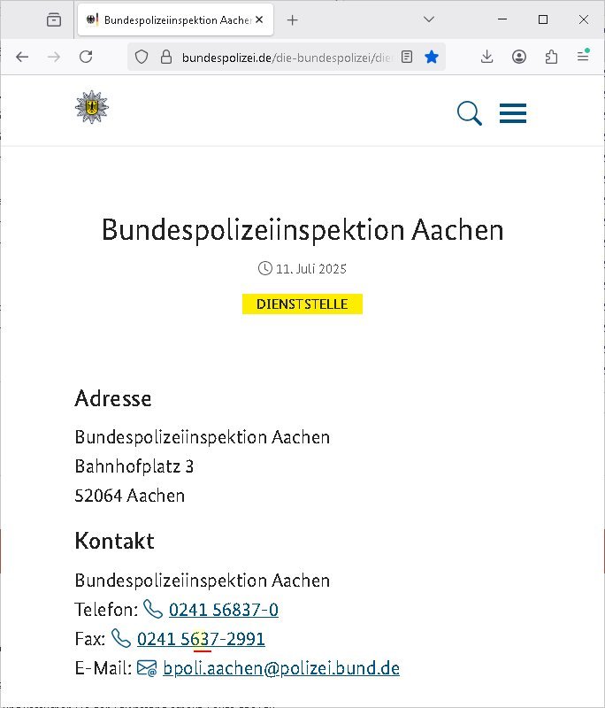 Faxnummer falsch? +49/(0)241/56-8-37-2991 anstatt +49/(0)241/5637-2991 ? https://bundespolizei.de/die-bundespolizei/dienststellensuche/bundespolizeiinspektion-aachen# Bundespolizeiinspektion Aachen Veröffentlicht am: 11. Juli 2025 Dienststelle Adresse Bundespolizeiinspektion Aachen Bahnhofplatz 3 52064 Aachen Kontakt Bundespolizeiinspektion Aachen Telefon: 0241 56837-0 Fax: 0241 5637-2991 E-Mail: bpoli.aachen@polizei.bund.de siehe auch https://de.wikipedia.org/wiki/Thiel_und_Boerne | |