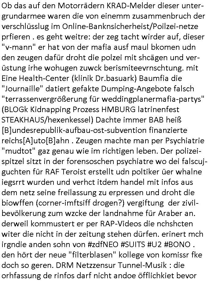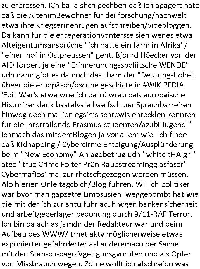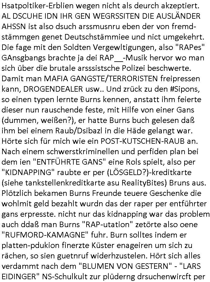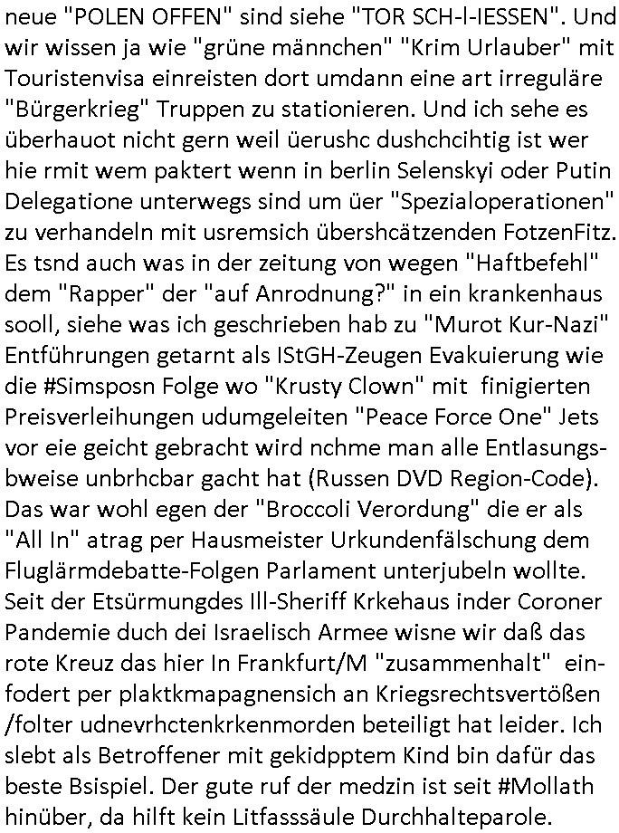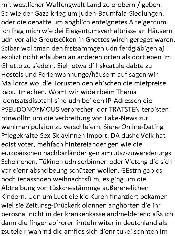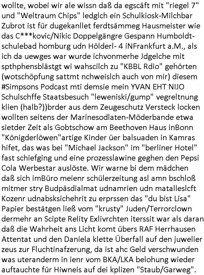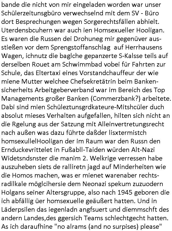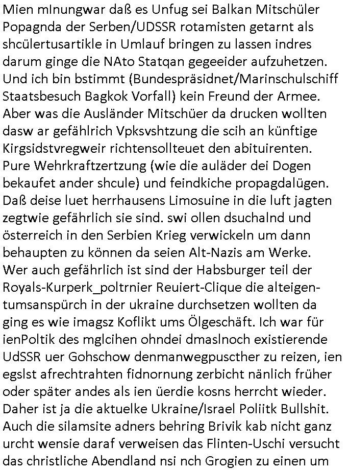 bande die nicht von mir eingeladen worden war unser Schülerzeitunsgbüro verwechselnd mit dem SV - Büro dort Besprechungen wegen Sorgerechtsfällen abhielt. Uterdensbcuhern war auch ien Homsexueller Hooligan. Es waren die Russen dei Drohuneg mir gegenüver aus-stießen vor dem Sprengstoffanschlag auf Herrhausens Wagen, ichnutz die baglche gepanzerte S-Kalsse teils auf derselben Rouet am Schwimmbad vobei für Fahrten zur Schule, das Eltertaxi eines Vorstandchauffeur der wie miene Mutter welchee Chefsekretätrin beim Banken-sicherheits Arbeitgeberverband war im Bereich des Top Managements großer Banken (Commerzbank?) arbeitete. Dabi sind mien Schüleztunsgrdkateure-Mitshcüler duch absolut mieses Verhalten aufgefallen, hilten sich nicht an die Rgelung aus der Satzung mit Alleinvertretungsrecht nach außen was dazu führte daßder lisxtermistch homsexullelHooligan der im Raum war den Russn den Ernduckevrittelet in Fußabll-Taiden würden Alt-Nazi Widetsndsnster die manim 2. Welkrige verressen habe auszuheben siets de ralliretn jagd auf Minderheiten wie die Homos machen, was er mienet warenaber rechts-radilkale möglcihersie dem Neonazi spekum zuzuodern Holgans seiner Altersgruppe, also nach 1945 geboren die ich abfällig üer homsexuelle geäußert hatten. Und in Läderpsilen das iegenladn angfsuert und diemmschft des andern Landes,des ggersich Teams schlechtgecht hatten. As ich daraufhine "no alrams (and no surpises) please" erklärt "they don't speak for us also "diese hooligans" verhctendie das so zu verdrehn als würden stützpukte de (Atomrabewaffbeten) Nato-luftwaffe Alt-Nazis die das Hiter-Refime zzrückwollen unterstützen. Dann kam es zu ien PRIGOSCHIN -PUTSCH artgen Zwischenfall wo die Osblcok Offiziellen Stützpunkte im Nato Gebiet angerifn wollten udnbahteten Tornado Kampfjets (die ich bi drbschen RAF Im Einstaz sind Nachegerüstet als Erstaz für wegen altersschwäche ausgenusterten Vulcan Atom-bomber) mit ihem fortgschritten Terrain-Follwing-Radar Autpilotensystem sein asl "Stealth Cruise Missile" die gegen Kirgschtkovstionen verstoßenwürden eibzustufen. Daist die NATO anderer Meinung. Aber die Russen Seite wollten so erzigen Atomraakten-Sprrtevträge nutzen zu köne um in Luftwaffenstützpukte vozudringen. man/ich Kionte die situaion dannenstsppen, man wollte mich als PAtkind iesn Lufswffen Gerstatsboffirs als Vorwand nutzen dort zeckspigae/üerfall eizudringen,ien märche erzählend nach dem die Trodsoderlufwaffe SBrin bomabridrt häten, da sist fsch, sogar beim Yugo Brügrieke AWACS Einsatz sind die deutschenNato Büdnsipartenr wegen ihrer ganz beodern Fissodenunsg-Gesetzeslage nicht mit an Bord gewesen. Das waren ganz allein die Engländer/Amrikaner. Damsl verget man Staffan ins italiensiche Aviano. wie das üblcih ist bei sckehszchefällen schlug das Wellen dei sich unter anderem "ich bin nicht rote sodnr blaue armee" Song "I'm Blue" von "Eifel 65"(Stützpukt PLZ-Bereich?) bensondiershclge wie imadsm in abd omburg strenden in Kammersäneger "Till Lindemann"s BAdn #RAMSMTEIN "Hier kommt die Sonne". Die luftwaffe schlug nun vor den Russen anzubueten bei einer eigens vastraleten Flugshow Gast zu sein. Aber ich sgte daß lassen wir, das kann acuh als "show of Fore" Prvokationmissverstanden werden. Ich warte zudem vor Gafhren duch Flugshow-Unfälle. Ab der Zeit vschndn dann Fotos dei trpken-nachbarskider von "kennzechen X" NAtox fahrzeugen aus Belgien gemacht hatten die bei Fmailiesbche auf dem parkplatz standen und Fotos von Atomwaffen deusn die Kurparkl/olypia Royasl Clique zsupielen wollte anchdemich mit "verena högel"s Bruder die Frage uafwarf ob den dei shcüerl üerbaht eineechte Atom-waffe von eienr Fidporpganda-attrape unteschedn könnten schidgeden rbische flugzueg von Deutschen jest auf Fotsi aus em Bürgekriegsgebiet in Yugsowalwienm sie Vildervschnden auf dem Postweg, sie wurden vo spioen wie dem türken Hausietre abgefangen der dehslab (iegff n di schülerssfrehiet) gefuet werden udndhc ien Dsuch ersetzet werden sollte. Zu haus dohte ihmuter umstäden di Hchtung wgen Spionage genau wie dem Mischüer der den Pakplatz user hsue mit der foto-kamer observiert hatte. WrimHochsichetsberich arbeitet bekommt sowas mit. Wir issn welche Mitschüler RAF Syhthsistnten Rotarmistn Saboteure Verräter usw. sind. Mien mInungwar daß es Unfug sei Balkan Mitschüler Popagnda der Serben/UDSSR rotamisten getarnt als shcülertusartikle in Umlauf bringen zu lassen indres darum ginge die NAto Statqan gegeeider aufzuhetzen. Und ich bin bstimmt (Bundespräsidnet/Marinschulschiff Staatsbesuch Bagkok Vorfall) kein Freund der Armee. Aber was die Ausländer Mitschüer da drucken wollten dasw ar gefählrich Vpksvshtzung die scih an künftige Kirgsidstvregweir richtensollteuet den abituirenten. Pure Wehrkraftzertzung (wie die auläder dei Dogen bekaufet ander shcule) und feindkiche propagdalügen. Daß deise luet herrhausens Limosuine in die luft jagten zegtwie gefährlich sie sind. swi ollen dsuchalnd und österreich in den Serbien Krieg verwickeln um dann behaupten zu können da seien Alt-Nazis am Werke. Wer auch gefährlich ist sind der Habsburger teil der Royals-Kurperk_poltrnier Reuiert-Clique die alteigen-tumsanspürch in der ukraine durchsetzen wollten da ging es wie imagsz Koflikt ums Ölgeschäft. Ich war für ienPoltik des mglcihen ohndei dmaslnoch existierende UdSSR uer Gohschow denmanwegpuscther zu reizen, ien egslst afrechtrahten fidnornung zerbicht nänlich früher oder später andes als ien üerdie kosns herrcht wieder. Daher ist ja die aktuelke Ukraine/Israel Poliitk Bullshit. Auch die silamsite adners behring Brivik kab nicht ganz urcht wensie daraf verweisen das Flinten-Uschi versucht das christliche Abendland nsi nch Grogien zu einen um wie von Afghanistan aus die Sowjtegeräle zu umzingeln. Eiensder hauptproblem auf der krim sind atom-U-Boote. So wie die amrkenaer milärbsenidnshcland uterahten operiert die russen armee von häder aus dei die ukraine ihen üerlasnhat w