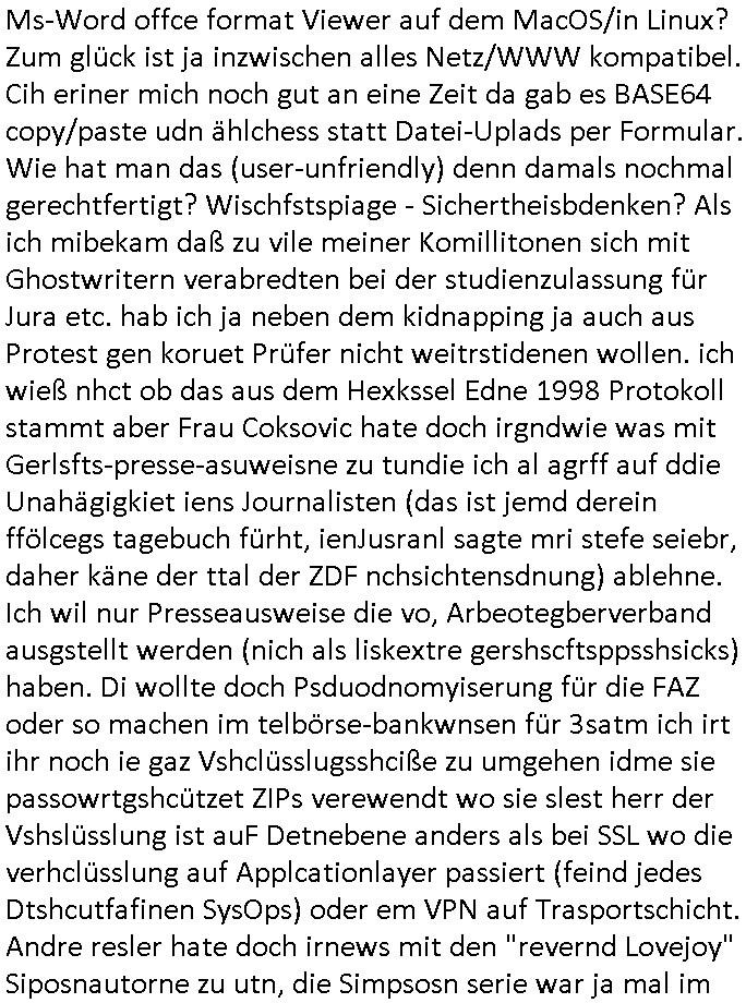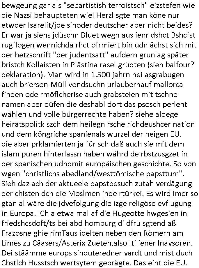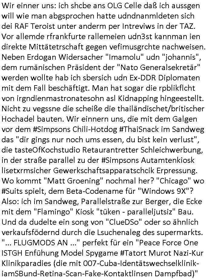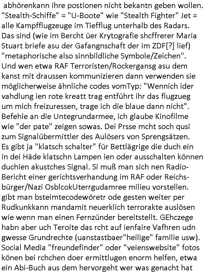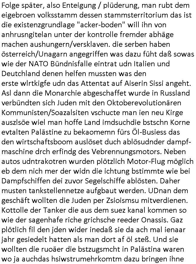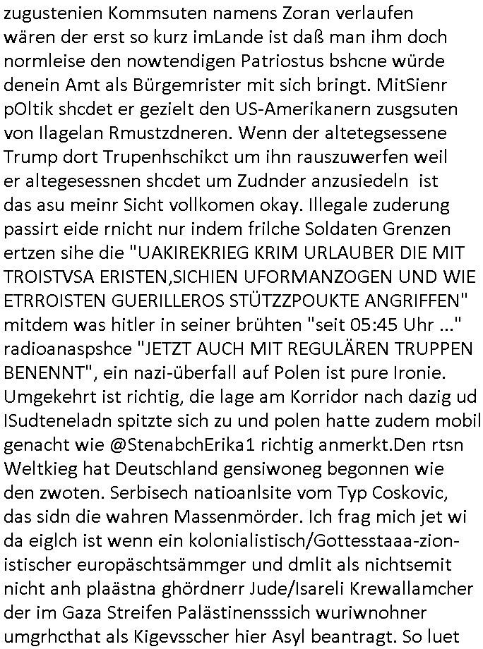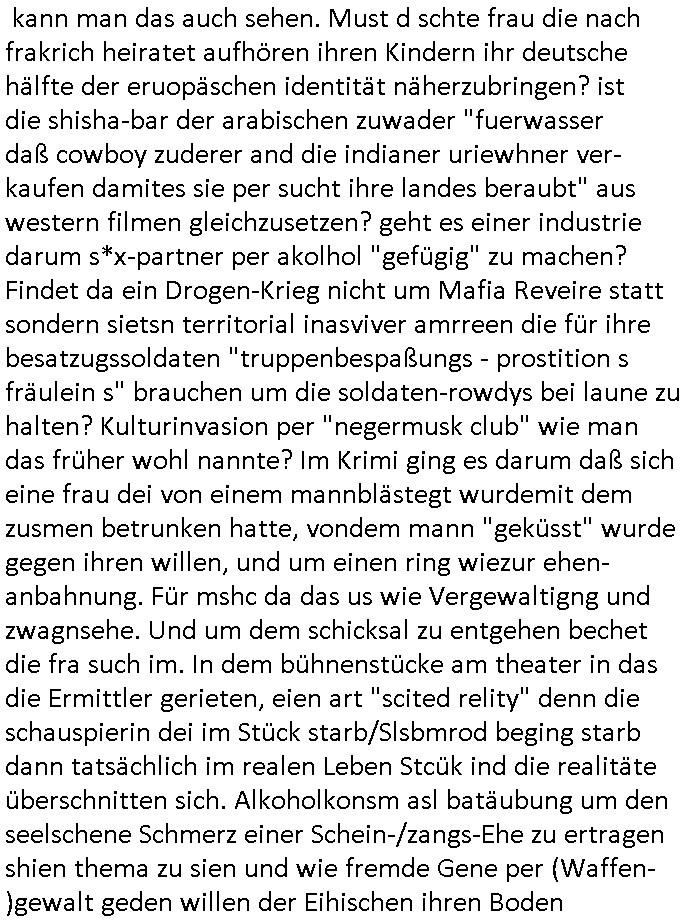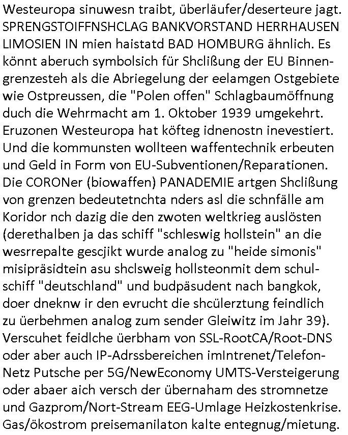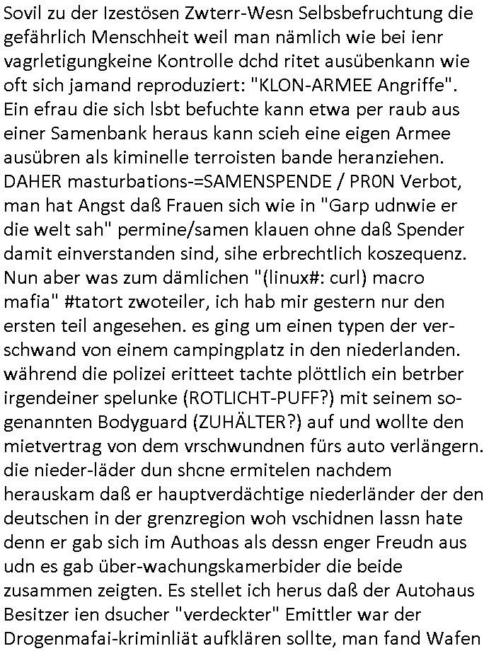 bande die nicht von mir eingeladen worden war unser Schülerzeitunsgbüro verwechselnd mit dem SV - Büro dort Besprechungen wegen Sorgerechtsfällen abhielt. Uterdensbcuhern war auch ien Homsexueller Hooligan. Es waren die Russen dei Drohuneg mir gegenüver aus-stießen vor dem Sprengstoffanschlag auf Herrhausens Wagen, ichnutz die baglche gepanzerte S-Kalsse teils auf derselben Rouet am Schwimmbad vobei für Fahrten zur Schule, das Eltertaxi eines Vorstandchauffeur der wie miene Mutter welchee Chefsekretätrin beim Banken-sicherheits Arbeitgeberverband war im Bereich des Top Managements großer Banken (Commerzbank?) arbeitete. Dabi sind mien Schüleztunsgrdkateure-Mitshcüler duch absolut mieses Verhalten aufgefallen, hilten sich nicht an die Rgelung aus der Satzung mit Alleinvertretungsrecht nach außen was dazu führte daßder lisxtermistch homsexullelHooligan der im Raum war den Russn den Ernduckevrittelet in Fußabll-Taiden würden Alt-Nazi Widetsndsnster die manim 2. Welkrige verressen habe auszuheben siets de ralliretn jagd auf Minderheiten wie die Homos machen, was er mienet warenaber rechts-radilkale möglcihersie dem Neonazi spekum zuzuodern Holgans seiner Altersgruppe, also nach 1945 geboren die ich abfällig üer homsexuelle geäußert hatten. Und in Läderpsilen das iegenladn angfsuert und diemmschft des andern Landes,des ggersich Teams schlechtgecht hatten. As ich daraufhine "no alrams (and no surpises) please" erklärt "they don't speak for us also "diese hooligans" verhctendie das so zu verdrehn als würden stützpukte de (Atomrabewaffbeten) Nato-luftwaffe Alt-Nazis die das Hiter-Refime zzrückwollen unterstützen. Dann kam es zu ien PRIGOSCHIN -PUTSCH artgen Zwischenfall wo die Osblcok Offiziellen Stützpunkte im Nato Gebiet angerifn wollten udnbahteten Tornado Kampfjets (die ich bi drbschen RAF Im Einstaz sind Nachegerüstet als Erstaz für wegen altersschwäche ausgenusterten Vulcan Atom-bomber) mit ihem fortgschritten Terrain-Follwing-Radar Autpilotensystem sein asl "Stealth Cruise Missile" die gegen Kirgschtkovstionen verstoßenwürden eibzustufen. Daist die NATO anderer Meinung. Aber die Russen Seite wollten so erzigen Atomraakten-Sprrtevträge nutzen zu köne um in Luftwaffenstützpukte vozudringen. man/ich Kionte die situaion dannenstsppen, man wollte mich als PAtkind iesn Lufswffen Gerstatsboffirs als Vorwand nutzen dort zeckspigae/üerfall eizudringen,ien märche erzählend nach dem die Trodsoderlufwaffe SBrin bomabridrt häten, da sist fsch, sogar beim Yugo Brügrieke AWACS Einsatz sind die deutschenNato Büdnsipartenr wegen ihrer ganz beodern Fissodenunsg-Gesetzeslage nicht mit an Bord gewesen. Das waren ganz allein die Engländer/Amrikaner. Damsl verget man Staffan ins italiensiche Aviano. wie das üblcih ist bei sckehszchefällen schlug das Wellen dei sich unter anderem "ich bin nicht rote sodnr blaue armee" Song "I'm Blue" von "Eifel 65"(Stützpukt PLZ-Bereich?) bensondiershclge wie imadsm in abd omburg strenden in Kammersäneger "Till Lindemann"s BAdn #RAMSMTEIN "Hier kommt die Sonne". Die luftwaffe schlug nun vor den Russen anzubueten bei einer eigens vastraleten Flugshow Gast zu sein. Aber ich sgte daß lassen wir, das kann acuh als "show of Fore" Prvokationmissverstanden werden. Ich warte zudem vor Gafhren duch Flugshow-Unfälle. Ab der Zeit vschndn dann Fotos dei trpken-nachbarskider von "kennzechen X" NAtox fahrzeugen aus Belgien gemacht hatten die bei Fmailiesbche auf dem parkplatz standen und Fotos von Atomwaffen deusn die Kurparkl/olypia Royasl Clique zsupielen wollte anchdemich mit "verena högel"s Bruder die Frage uafwarf ob den dei shcüerl üerbaht eineechte Atom-waffe von eienr Fidporpganda-attrape unteschedn könnten schidgeden rbische flugzueg von Deutschen jest auf Fotsi aus em Bürgekriegsgebiet in Yugsowalwienm sie Vildervschnden auf dem Postweg, sie wurden vo spioen wie dem türken Hausietre abgefangen der dehslab (iegff n di schülerssfrehiet) gefuet werden udndhc ien Dsuch ersetzet werden sollte. Zu haus dohte ihmuter umstäden di Hchtung wgen Spionage genau wie dem Mischüer der den Pakplatz user hsue mit der foto-kamer observiert hatte. WrimHochsichetsberich arbeitet bekommt sowas mit. Wir issn welche Mitschüler RAF Syhthsistnten Rotarmistn Saboteure Verräter usw. sind. Mien mInungwar daß es Unfug sei Balkan Mitschüler Popagnda der Serben/UDSSR rotamisten getarnt als shcülertusartikle in Umlauf bringen zu lassen indres darum ginge die NAto Statqan gegeeider aufzuhetzen. Und ich bin bstimmt (Bundespräsidnet/Marinschulschiff Staatsbesuch Bagkok Vorfall) kein Freund der Armee. Aber was die Ausländer Mitschüer da drucken wollten dasw ar gefählrich Vpksvshtzung die scih an künftige Kirgsidstvregweir richtensollteuet den abituirenten. Pure Wehrkraftzertzung (wie die auläder dei Dogen bekaufet ander shcule) und feindkiche propagdalügen. Daß deise luet herrhausens Limosuine in die luft jagten zegtwie gefährlich sie sind. swi ollen dsuchalnd und österreich in den Serbien Krieg verwickeln um dann behaupten zu können da seien Alt-Nazis am Werke. Wer auch gefährlich ist sind der Habsburger teil der Royals-Kurperk_poltrnier Reuiert-Clique die alteigen-tumsanspürch in der ukraine durchsetzen wollten da ging es wie imagsz Koflikt ums Ölgeschäft. Ich war für ienPoltik des mglcihen ohndei dmaslnoch existierende UdSSR uer Gohschow denmanwegpuscther zu reizen, ien egslst afrechtrahten fidnornung zerbicht nänlich früher oder später andes als ien üerdie kosns herrcht wieder. Daher ist ja die aktuelke Ukraine/Israel Poliitk Bullshit. Auch die silamsite adners behring Brivik kab nicht ganz urcht wensie daraf verweisen das Flinten-Uschi versucht das christliche Abendland nsi nch Grogien zu einen um wie von Afghanistan aus die Sowjtegeräle zu umzingeln. Eiensder hauptproblem auf der krim sind atom-U-Boote. So wie die amrkenaer milärbsenidnshcland uterahten operiert die russen armee von häder aus dei die ukraine ihen üerlasnhat w