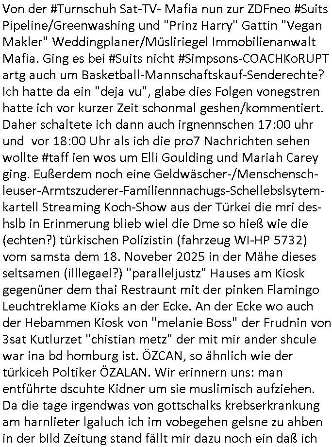 | Von der #Turnschuh Sat-TV- Mafia nun zur ZDFneo #Suits Pipeline/Greenwashing und "Prinz Harry" Gattin "Vegan Makler" Weddingplaner/Müsliriegel Immobilienanwalt Mafia. Ging es bei #Suits nicht #Simpsons-COACHKoRUPT artg auch um Basketball-Mannschaftskauf-Senderechte? Ich hatte da ein "deja vu", glabe dies Folgen vonegstren hatte ich vor kurzer Zeit schonmal geshen/kommentiert. Daher schaltete ich dann auch irgnennschen 17:00 uhr und vor 18:00 Uhr als ich die pro7 Nachrichten sehen wollte #taff ien wos um Elli Goulding und Mariah Carey ging. Eußerdem noch eine Geldwäscher-/Menschensch-leuser-Armtszuderer-Familiennnachugs-Schellebslsytem-kartell Streaming Koch-Show aus der Türkei die mri des-hslb in Erinmerung blieb wiel die Dme so hieß wie die (echten?) türkischen Polizistin (fahrzeug WI-HP 5732) vom samsta dem 18. Noveber 2025 in der Mähe dieses seltsamen (illlegael?) "paralleljustz" Hauses am Kiosk gegenüner dem thai Restraunt mit der pinken Flamingo Leuchtreklame Kioks an der Ecke. An der Ecke wo auch der Hebammen Kiosk von "melanie Boss" der Frudnin von 3sat Kutlurzet "chistian metz" der mit mir ander shcule war ina bd homburg ist. ÖZCAN, so ähnlich wie der türkiceh Poltiker ÖZALAN. Wir erinnern uns: man entführte dscuhte Kidner um sie muslimisch aufziehen. Da die tage irgendwas von gottschalks krebserkrankung am harnlieter lgaluch ich im vobegehen gelsne zu ahben in der bIld Zeitung stand fällt mir dazu noch ein daß ich