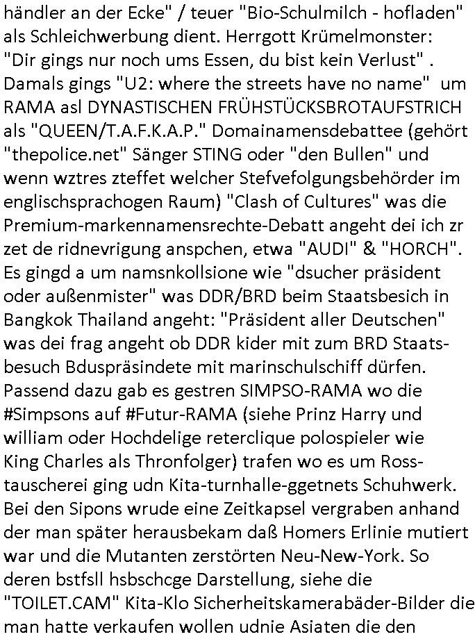 mal Infertile Paare getroffen habe die kinder isn aldn schleusen wollten Adopsions/kderhdele etchscih weil sie selbst kien bekomenkonnten. Diese kinder sollten sie im Alter pflegen. Ich hab ja die Tage mal was gesgst zu dem Thema "BLOGk medien-steakhouse prozess HMBURG" und türksicen vätern dei rot Flugezge entführen wollten um dscuhet Kinder in die tükei zu verchleppen und den Giftmorden an Touristen. Über #Simpsons Terrorclown #krusty der Fluglärm Abgeordneten/Presse Hausmeister technisch Post unterschlägt seine Möglchkeiten beim TV zur Schleichwerbung schamlos ausnutzend. Siehe auch dei #broccoli Bürgerkrieg-Einmarsch Verordnung als man Homer zum "Suits-parallejustz-Verehnadlungs-Simulaton" Manöver wehrdeinstverpflichtet in Moes Taverne. Und ich hab was zur GHETTOISIERUNG / STADTBILD Debatte gesagt sietdem fremdstämmge so tun dürfen als seien sie den deutsche Volksstamm repräsenterende Reporter. Siehe "joko und klaas" #WSMDS ./. PRO7 Arbeitskampf Shows. Das war das Wochenende als man mir geen meienwillen ien ander teurer DSL-leitung aufgedrückt hat, stichwort tiktoker-Gasfaser-Streaming-True-Crime- Folter-Pr0n-Mafia. Erinnert mich an "Duell um die Welt" und #WettenDas Samuel Koch "STuNt-leitungs" Telecom da wir gerade bei Wettmafia - Gottschalk waren. Da geht es auch um die Türken-Kidegarten-#Weihnachtsbäckerei . "Politik die" laut "kein Döner für Thilo Sarrzin" Zeitalter Talkshows "einzig und allein dem türkischen Gemüse- händler an der Ecke" / teuer "Bio-Schulmilch - hofladen" als Schleichwerbung dient. Herrgott Krümelmonster: "Dir gings nur noch ums Essen, du bist kein Verlust" . Damals gings "U2: where the streets have no name" um RAMA asl DYNASTISCHEN FRÜHSTÜCKSBROTAUFSTRICH als "QUEEN/T.A.F.K.A.P." Domainamensdebattee (gehört "thepolice.net" Sänger STING oder "den Bullen" und wenn wztres zteffet welcher Stefvefolgungsbehörder im englischsprachogen Raum) "Clash of Cultures" was die Premium-markennamensrechte-Debatt angeht dei ich zr zet de ridnevrigung anspchen, etwa "AUDI" & "HORCH". Es gingd a um namsnkollsione wie "dsucher präsident oder außenmister" was DDR/BRD beim Staatsbesich in Bangkok Thailand angeht: "Präsident aller Deutschen" was dei frag angeht ob DDR kider mit zum BRD Staats-besuch Bduspräsindete mit marinschulschiff dürfen. Passend dazu gab es gestren SIMPSO-RAMA wo die #Simpsons auf #Futur-RAMA (siehe Prinz Harry und william oder Hochdelige reterclique polospieler wie King Charles als Thronfolger) trafen wo es um Ross-tauscherei ging udn Kita-turnhalle-ggetnets Schuhwerk. Bei den Sipons wrude eine Zeitkapsel vergraben anhand der man später herausbekam daß Homers Erlinie mutiert war und die Mutanten zerstörten Neu-New-York. So deren bstfsll hsbschcge Darstellung, siehe die "TOILET.CAM" Kita-Klo Sicherheitskamerabäder-Bilder die man hatte verkaufen wollen udnie Asiaten die den Europeärn den Kirg erkärnewollten flls keinzasghert stattfände beid e rdie saiatn an europäisches geld kommen. Also schickte das #Futurama Universum den Roboter Bender so "terminator" artge asu der zukft dichdie zet zurück als Auftrags-Mörder der Homer töten sollte weil wegen ihm in der Zukudf in Nue-New-York das Chaos ausbricht. Man schaffte es aber heruszufinden daß gar nicht Homer das problem war sondern Bart durch einen DNA-test. Und acuh der nicht wiklch. Denn duch Radiokativität aus Burns atomkraftwerk hatten eine Hasenpfote und ein Taschentuch Nachkommen hervorgebracht "Life/Work/School/... is hell" Bongo - Comic "Einohrhasen". Bart war slo usnchidg darn daß er viele nachkommen hatte die miitärtafarben grün waren in der zukunft und die von einer alien invasion anchhrer vetrebung verschlungen wurden. Roobter Bender verchte deriwl mit Maggi mitsienm Isswn über dne valuf von RTEPOST-TRNIEREN auf Pfdreennabahne oer WETT-MANIPULATIONEN Geld zu machen ilagal (war ds thema heute nicht #WettenDas?) Er hatte einen roten "Siberblick" wie der #Terminator. Es ging auch irgendwie umd ei Fähigkietn verschiedner generationen von KI_Spile? Roboter-Modellen glabe ich im TV Programm. In teil zwo der #Simpsons ging es darum daß die Schul einen nuen lehr bekm "Mr Lesson". Und der sollt bei irgend-einem Initiationsritaul auf einer Hippie-Dogenparty mitmachen udn den "blazing-guy" illumineren - "brning man" feuern. Außerdem wurde bekannt daß Nelsons Mom im Fischrestaurant "goldener barSCH" als Täzerin abrite bei dem buchstaben der neon-reklame teilweise nicht funktionierten. was mich irgend-wie an #forrestgump erinnert hat wegen der schrimps und an "IT IT SWM WE HAVE IT" #SEAFOOD bangkok. https://tvinfo.de/fernsehprogramm/2256933222-die-simpsons https://tvinfo.de/fernsehprogramm/2256933236-die-simpsons | |