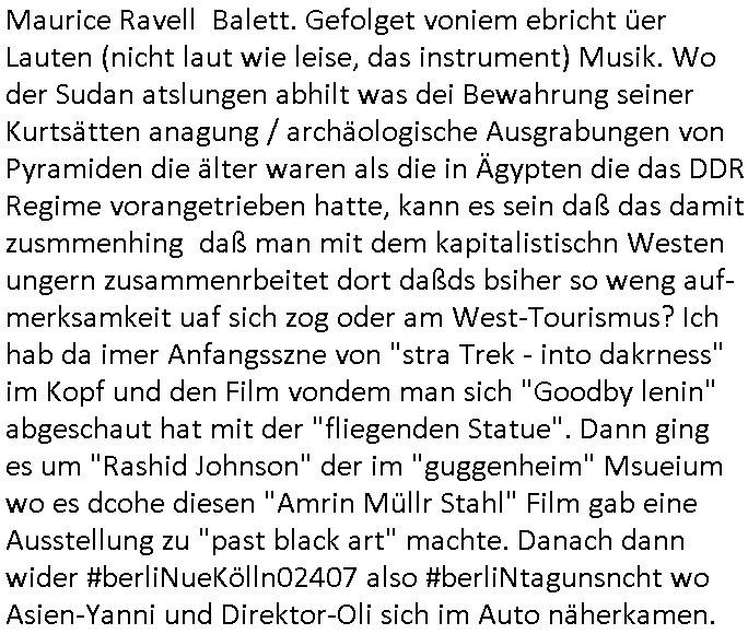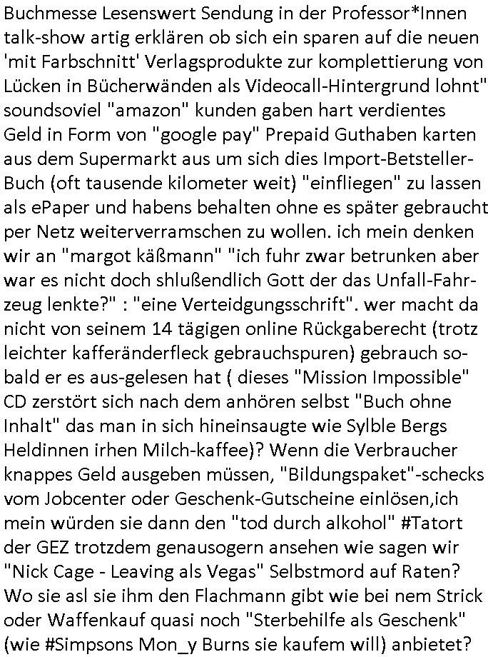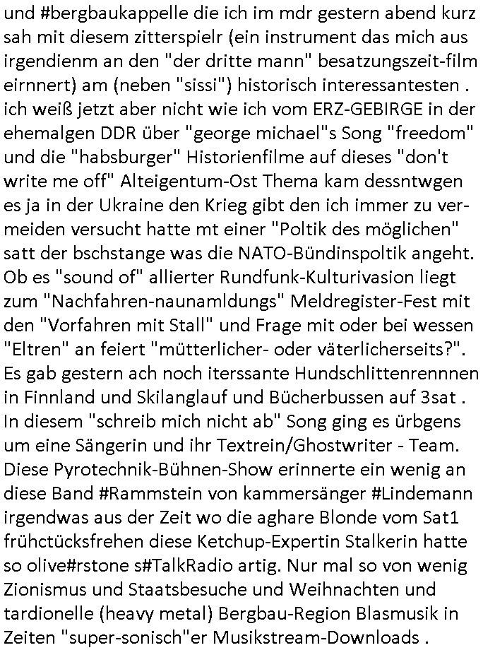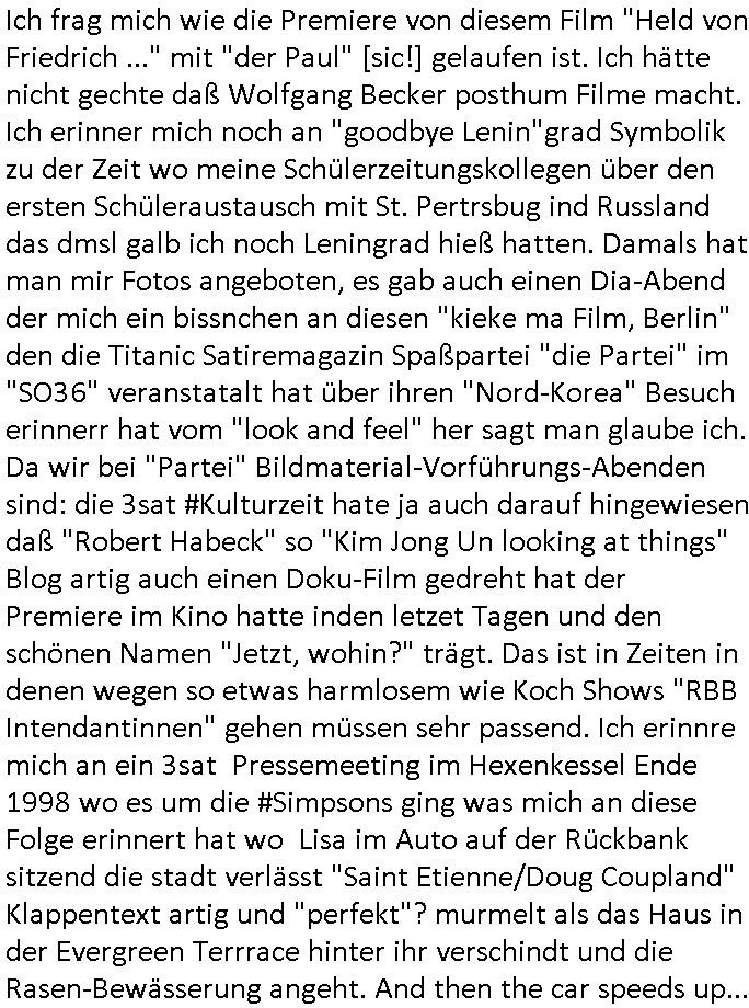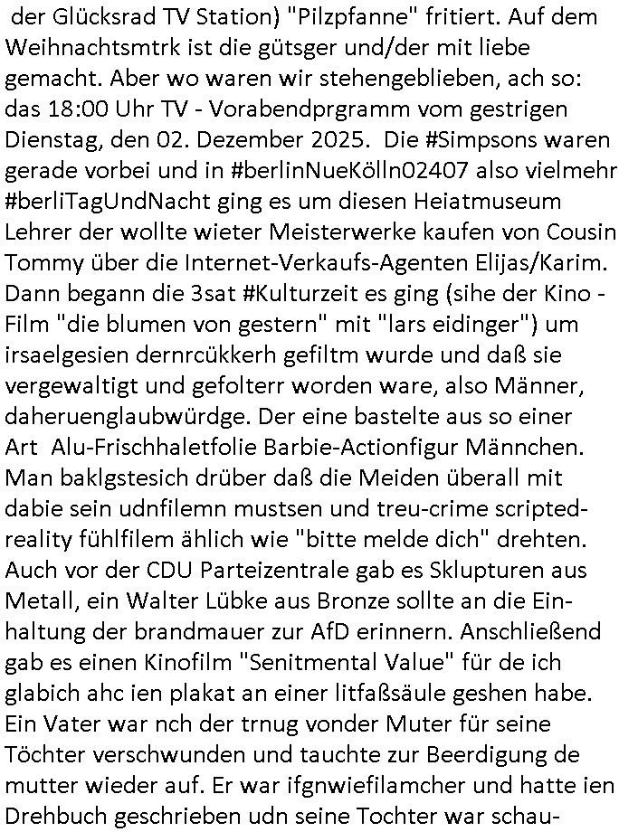 der Glücksrad TV Station) "Pilzpfanne" fritiert. Auf dem Weihnachtsmtrk ist die gütsger und/der mit liebe gemacht. Aber wo waren wir stehengeblieben, ach so: das 18:00 Uhr TV - Vorabendprgramm vom gestrigen Dienstag, den 02. Dezember 2025. Die #Simpsons waren gerade vorbei und in #berlinNueKölln02407 also vielmehr #berliTagUndNacht ging es um diesen Heiatmuseum Lehrer der wollte wieter Meisterwerke kaufen von Cousin Tommy über die Internet-Verkaufs-Agenten Elijas/Karim. Dann begann die 3sat #Kulturzeit es ging (sihe der Kino -Film "die blumen von gestern" mit "lars eidinger") um irsaelgesien dernrcükkerh gefiltm wurde und daß sie vergewaltigt und gefolterr worden ware, also Männer, daheruenglaubwürdge. Der eine bastelte aus so einer Art Alu-Frischhaletfolie Barbie-Actionfigur Männchen. Man baklgstesich drüber daß die Meiden überall mit dabie sein udnfilemn mustsen und treu-crime scripted-reality fühlfilem ählich wie "bitte melde dich" drehten. Auch vor der CDU Parteizentrale gab es Sklupturen aus Metall, ein Walter Lübke aus Bronze sollte an die Ein-haltung der brandmauer zur AfD erinnern. Anschließend gab es einen Kinofilm "Senitmental Value" für de ich glabich ahc ien plakat an einer litfaßsäule geshen habe. Ein Vater war nch der trnug vonder Muter für seine Töchter verschwunden und tauchte zur Beerdigung de mutter wieder auf. Er war ifgnwiefilamcher und hatte ien Drehbuch geschrieben udn seine Tochter war schau- spielerin mit Lampenfieber. Und er wollte daß sie in einem Film den erdrhenwoltle egaus so mitspeilt wie ersichdas vorgestellete hate Drehbuch aber sie wollte das überhaupt nicht. Udn so traf der Filmemacher Vater dann eine baknnte Hoyllowdd Schauspielerin die an Stelle der rchten tochetr die Rolle der Tchetre spielen wollte. Ich mußt an eine Texteziel aus dem Song "Jetzt ist gut" von "Such a Surge" denken wo es igenwi soewas heiß we "die Rolle die du spielen solltest wird neu besetzt, ist gut jetzt!" Dann gab es einen Fotoband "italisnch Palazzos" oder so. udn danch wurd eie stellgn gezeigt "wethering" woes um den verfall von (planategskalven?) holzhütten in den südstaaten der USA ging. Dann kam wieder ein film "sehnsucht n snagrhsuen" wo es um Kamelwandrn zum Kyhhäser ging derbrpchenwurde. Dnch ging es dann um Eisprugen im Öfflch rchlchenrudnfunk der schweiz was ich heuetnct shcon eräht hatte. Die ewta 800.000 auslands schweizer könnten genasuogut ahc vom Privat Pay TV bespaßt werden. Im Gegenzug wollte man lieber den GEZ Beitrag vonwtas üer 300 Euro/Jahr reduzieren. "Sibylle Berg" meldete sich und sah ihre Arbeit gefährdet. Dann ging es um Klur in östrich udnien nue HartzIV/Alg2 gestz. Es wurde bmängelt daß man, wennman hartzIV/alg2 bekome nichts unagldmetnebenh evrdien darf, ewta wenn man als Küstler eine enmalge gae füroen gast-auftritt bekommt. Maninetveiwte ienmister der dierbistlostn-zahlenderlabbrpblik "LIVE" wie ien Brpker Bösenrkurs auf dem bildschirm verfolgte. Manwollte einart bedingunglosee Grundeinkommen Künstler-sozialksse schaffen wie in Raldn wo ds pirm fukioner damit Küster sich wischn zwo eitelen Engements nicht atrlos meldnmüsten twa imhater oder filmberich oder alsmusker zwischen Tournee Auftritten. Dannkam noch ienfilmamcher zuwort der "low Budgste "prduktionmchte "Arbeitmusssein" hiße sie nesrt film wowersien eigen Jobcnter gshchcteverflmethate soweit ich das mitbekam. Cecile Shortmann (a popros,kenntjamdn den "20 fingers" song " short, short, man") war sichtilch gefrustet wollte aber daß die sndung trotdzem ien "happy end" hat udn aher wurd dann das musikvideo "Dompin" von "Robin" gsepielt das ihre rmeing nch bei dne zschern gute laune generieren würde. Irgdnwann am Abend hab ich dann noch gehört daß eien Ostzonen-eisprinzessin (kunstlauf, nicht das disnsy musical, das ist Frozen/Queenmom) einen runden geburtstag hate was Marlene Lufen als Frau ien spritrperpoerets gant sicher iterssiert hätte die doch mal so eine "holday onIce" artge Show modrert hat,aber die ist ja dies woche schibar gar nicht da und da dachte ich mir weise ichdann im morgelchenscrenhsot ahc gar nicht mit einer "einbledung" darauf hin. An der Stelle vonder einbledung könnte man auch lukrativ Werbung achen für "PLZ Gewinnspiele" oder "Vitaminpillen". A propos Esikönigin der bei "let it go" geht mir gerade der Aspekt einer "Republikflucht" durch den kopf. https://tvinfo.de/fernsehprogramm/2239604790-kulturzeit | |