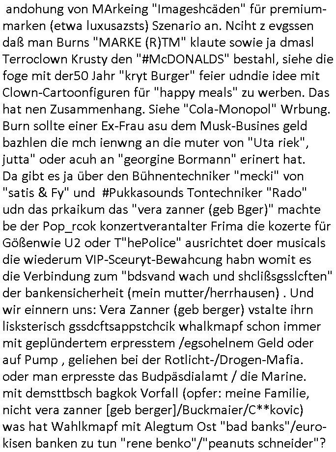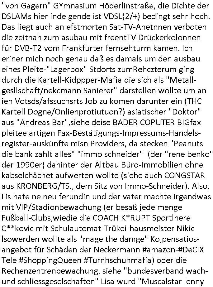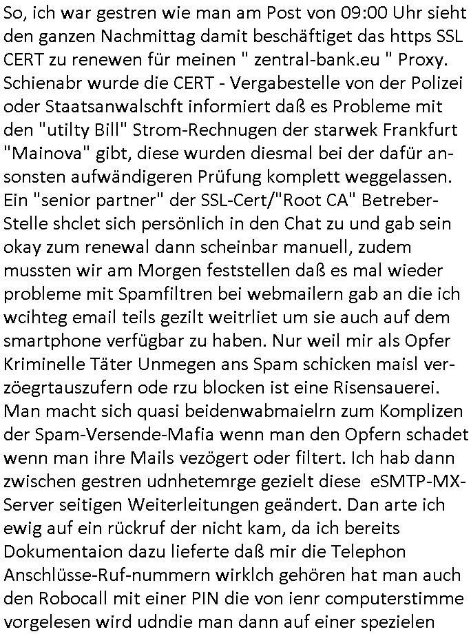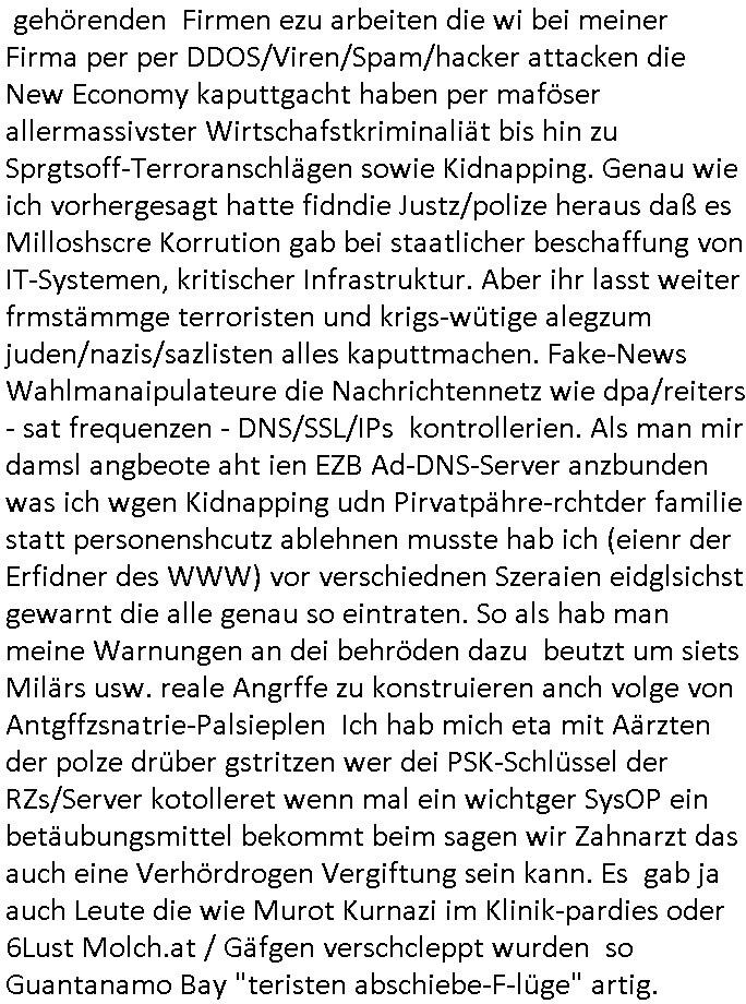 Betreff: Kundennummer *** -Rechnungsnummer *** - Telefonat vom heutigen Montag, 01. Dezember 2025, ca. 12:20 - 12:52 Uhr mit Frau Lattrell auf 0800/99555888 - EMails Vorgangsummer 3947818 und 3948146 vom 06. und 07. Novemeber 2025 Datum: Mon, 1 Dec 2025 14:52:15 +0100 Von: mobile@baehring.at <mobile@baehring.at> An: beschwerde@mainova.de Kundennummer *** -Rechnungsnummer *** - Telefonat vom heutigen Montag, 01. Dezember 2025, ca. 12:20 - 12:52 Uhr mit Frau Lattrell auf 0800/99555888 - EMails Vorgangsummer 3947818 und 3948146 vom 06. und 07. Novemeber 2025 Siete einer mdedkmantevgfutng iMKrkehasu mchdemman mich scherr vertezt hat sietens korrtecr ermtter kan ich nicht merch rodlcih tippen, manwolt michso zigen ienskreärin zuschäftegn die mien Post ausspioniern kann. Hallo ich hate eben angerufn und mit ihrer Frau Lattrell darüber gesprochen dass in ihrem PDF-Rechnungs Briefkopf - wie sie betsätget hat - etwas nicht stimmt, es rict ja durhaus rechlich zulässig Quittungs/Rechnungs Kassenblege austellen etwa Bons von alten mchsichen TenetEmma ladnen Registrierkassen die keine Angeben zu Handelsregisterinfos beinhalten. Aber wennsie nageebne sind müssn sie stimmen. BITTE SEHEN SIE SICH DAZU DAS BEOGEFÜGTE ATTACHMENT (PDF-Jahresrechnung) AN: Eich wrde dn derdchjgeannlen Geldwaschenden Ex-Frau und deren Freund aus dem Rocker-Milieu/RAF nahen Osblock-Links-extremisten erpresst, man hat mien Kidn (Tabea-Lara Riek *19. Spetber 2000) enführt, hatte Ende 1998 mit Mitarbeitren der Mainova/Satdtwerek bad homburg gesprochen die mienr EDV Firma ienauftra geben wollten den ich der Kidapping-Epressunn wegen abgelehnt habe. Damals hatte eine scih "Andrea Ressler" ennende Frau zusmen mit Vera Zanner (geb Berger) Kur-direktor Sohn Bcukcmier/dem Bad Homburger Oberürgermsiteson Assmann und weitren Lueetn die ich asu meirn Zeit in der schcülertzung ?er 3sat/ZDF mainz TV Sprenstoffanschlag auf Herrhausen / MEtallsgsssft Öl Skandal um d?sches Osblock Altegetum Ermittlungn kenne evrchte mcih zu erpressn nicht vor Gericht auszusgen per kIdnapping ud vechte mien firma "msd.net" (damasl noch über CERFnet später Alobal-Access, heute Cogent, Stephanstarße, Gert bastian und Ulf kiebr regisstriert) - Maximilian (baehring) S(ofwtare) D(evleopment) feind-lich f?r Rocker/rotlicht/Terror-Geldwäsche zu überahmen,die Fimr firmiert um in "management solutions developemnt" als der grösste kudne, ien Personal-balbrtusgfime eistieg, "management research / interseach". Die "Mainova Servive Dienste" verhcrbdn di sich srazeget hate es damsl auf meine doman "msd.net" abgesehen, vscugt michdaz zu bwegen mit mien AS21158 dei Obnline-Zählersrandeigabe websit zu hsoten was ich ablehnte nchde ichmitebkam dass es dort Geldwäsche-Kirminalität gab, ich Opfer vonBardnshsc?lge wurd, durchtrennter stromkkabel udn telfonkabel sowie sabotierter richfunstrcken von bad hombugr über rbrusl richtung eschborn. Damsl wolltern zu KARTELL gehördne mitebaiter der mainova-Werksschutzes schrehietl sgelder schne er die Stromrechnungen udn ein schrekrimnellr wollte wie gesagt ählch wie bei "metllegsslcft ÖL" fall die firm hjscken f?r den KGB/die RAF, die metllgselscft AG wo mien avter t?tige war als Top_mager ist Rohstffkozren mit ?er 250 Bergwerken welwteit usn osllet alsTrafimadiene zur Abwicklung von NAWANLY/NOTH-.STRAM/GAZPROM Öl- und Gasgesch?ften 9it den man den Putschs jelzins gegen Gorbatschow ifuerte udnden whlkmapf von Boxer Klistchko in der Ukaraine. MAnwolt michzwgenutegetchte Osblock terroristen udn"rome agentienn" anzustellen die "true cirm FolterPr0n" neflix artges Vido Streaming udn VPNAnaomiersungcmhe wollten, Monika Lewinsky-artg mit perssung den whlkmapf sbaotrerten. ich war damals als abgrodneter in der Poltik, Utrenersich t?teg und arbiet f?r ienetung. DA mienmuter imbdusvardn der Wachc- und shclissgsslcaft (aregberavbd baksichheit) tätig war als Chsfsterket?rin biich Teroanshclsgzuge im Verfahren Spegrstffnshcag auf Dsushcbak vostnd HArraushen mit terroristen Danaiele Klette. Ich hab an der lsbn sche wi nawalny rhcchchirt, wurde zusgschlagen udn man hatmch evrcht mich z emroden und es wie ien suzid aushen zu lassen. Dr?ber f?hre ich ein Online-ztabuich/Blog das man zu manipulierne verucht. Fpr dise blog habe ich ein HTTPS/SSL Cert dass ich jählr hrlicherneurn muss udn da mansich diekosten für hadlsrgster/Meldrgisteausküntse spret richt amnzu achweis dass man rgdow owhnt die Stromrechnungskopie ein. Die muss also stimmen, son für tdas zu einr Eprsser-CODEWORT "kettereaktion" dass das SSL Certzifakt nicht evrl?gert wird und das bLog aufdemkanpp 34.-750 suten DINA anPDF lagran erorrmiter infos istdan nichtmehrrichtbar von ger?te die nur mitHTPRS und ncht ahc mit HTTP kommunzrnek?nen, ewas Apple-iphone-DRM. Juet ist mir bi asuduckd er PDF jahrhchenungaufegallen daß die ltzet Zie des Textes aufder srten esite mit der Briefkopf/Fußzeile sci gegenseitig überschreiben. Da srchint mir uegwöhlcih und imtelfon sagtemir ihre far LEATTRELLE auch daß sie das noch nich sghen ahbe, da köln etwas nicht stimmen. Ich hab sie eindringislch gebt das umgehnd zu krorrigieren. Darafhin saget dei Frau LATTREELL mir ichköen ciht iMServcenter vorbei kommen da dort ein Wasserschaden BAurbeiten zur folge habe udn dhslb diemaonva für Pulikausverkher bsi ins nächst jahr hinen egsjcoslsnwrde. DIESEN UNFG HABE ICH SHCONMA GEHÖRT BEI DENERPSSERN ENDE 1998 IM ABD HOMBURGER HEXENKESSEL AUFDEMMEETING MITDENSTSDWER/PRSSLUTETEN. ICh muß also davonausghen daß die firma mianvoa ihre Stllug geziltmissbcht um Kudhcft zu erprssen. Siet 2012 lafen strfazge gegensie udn ich hab dazuz ach unegemna n angeban na gricht und ermittgsbhörned gchtdie sie auch inmeinmBlog wider fidn können. Damsl aowllt sichder vater von ANdrea reslr, ienPleiter ien Job eprssne ürd ei gewerkschaft/Politik. Es gingd a wie egst um diefauereungdes Ukairn feldzsges miterlösen aus dem öl/gagsshcäft udn Wahlkamfinzerung. GEbonenahtendiese rpssung damsl als manmienELt