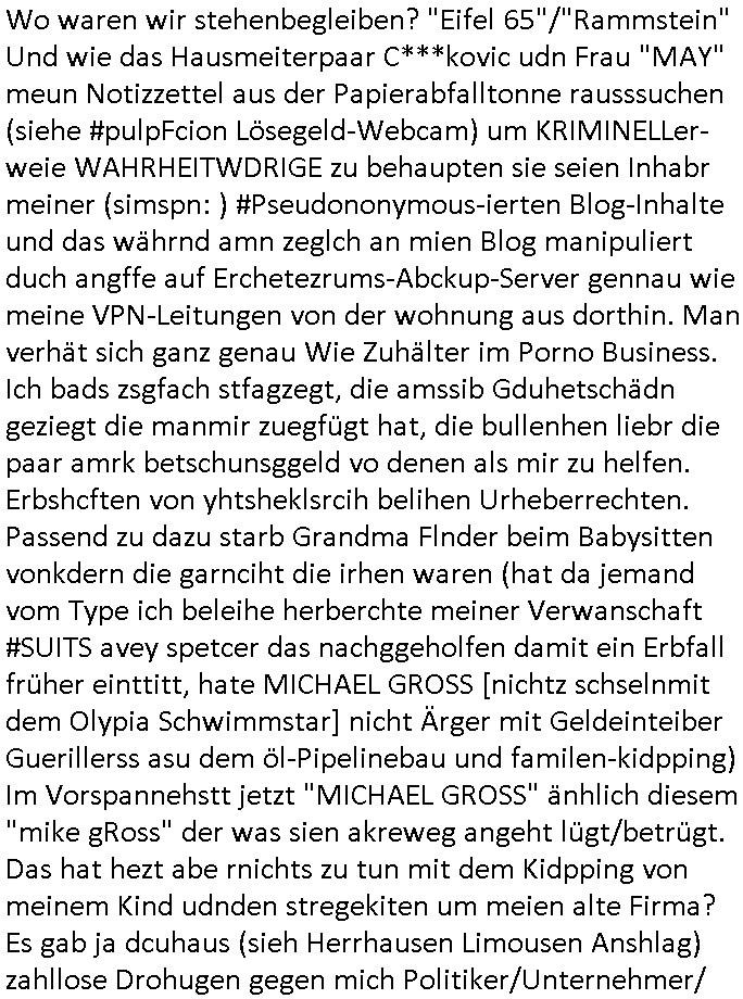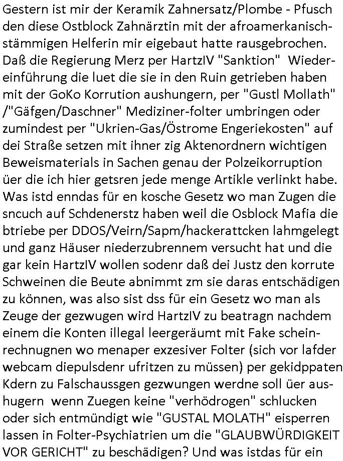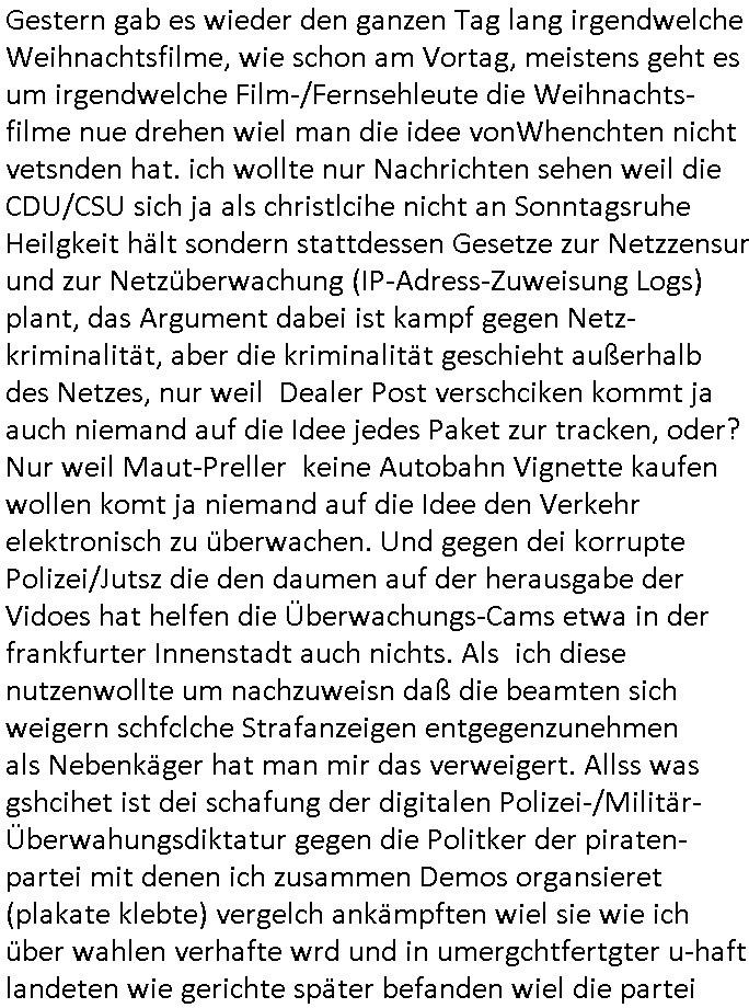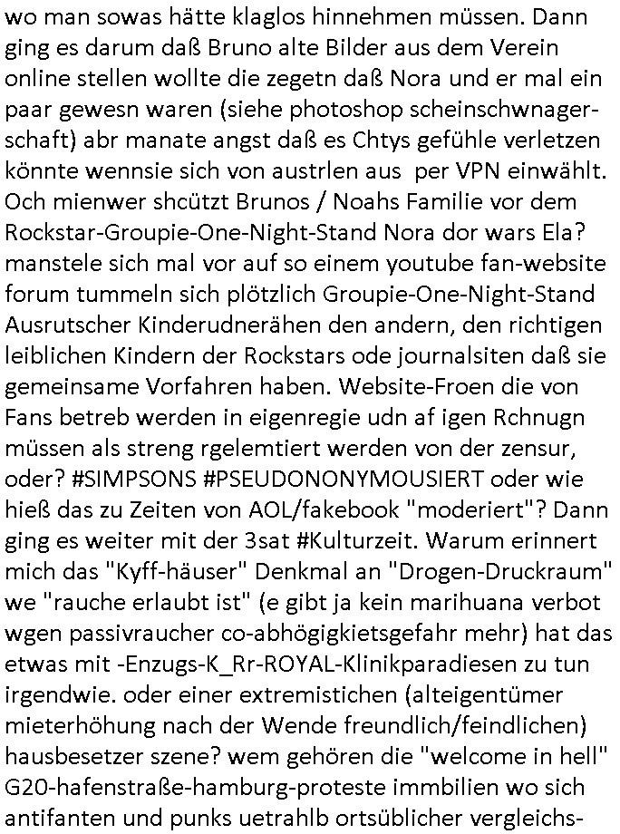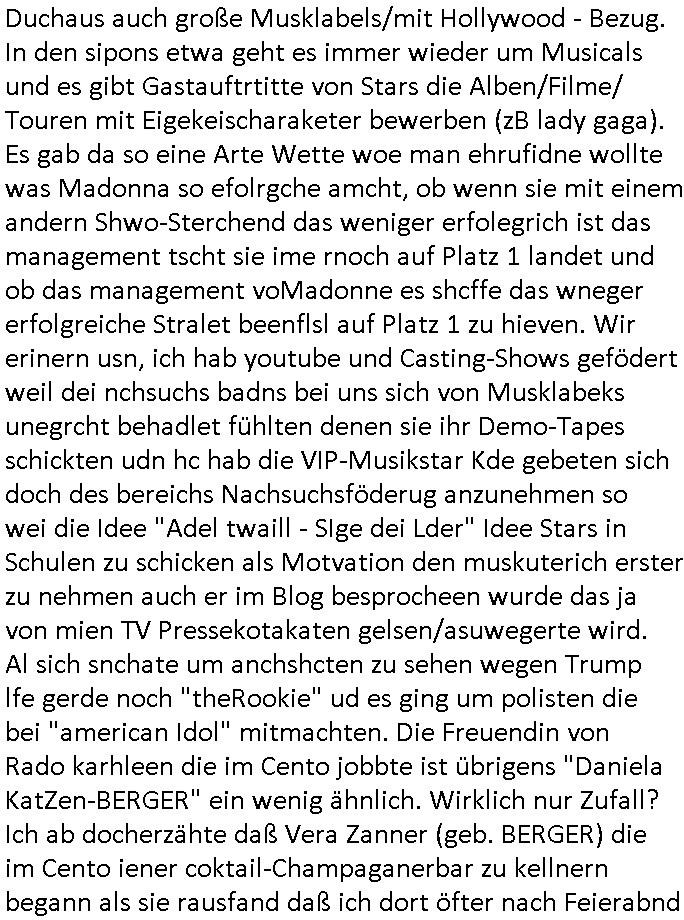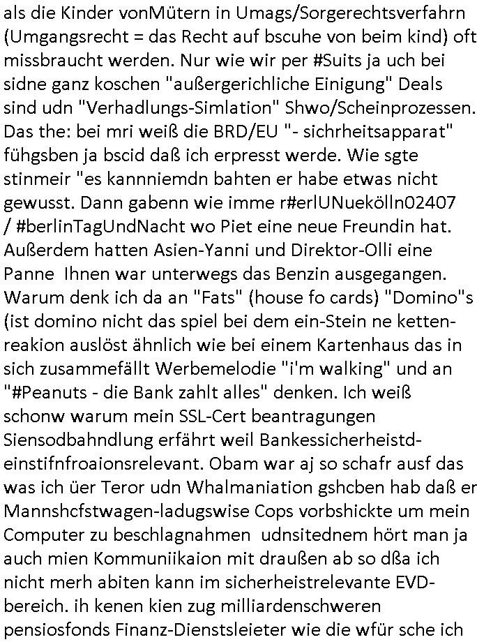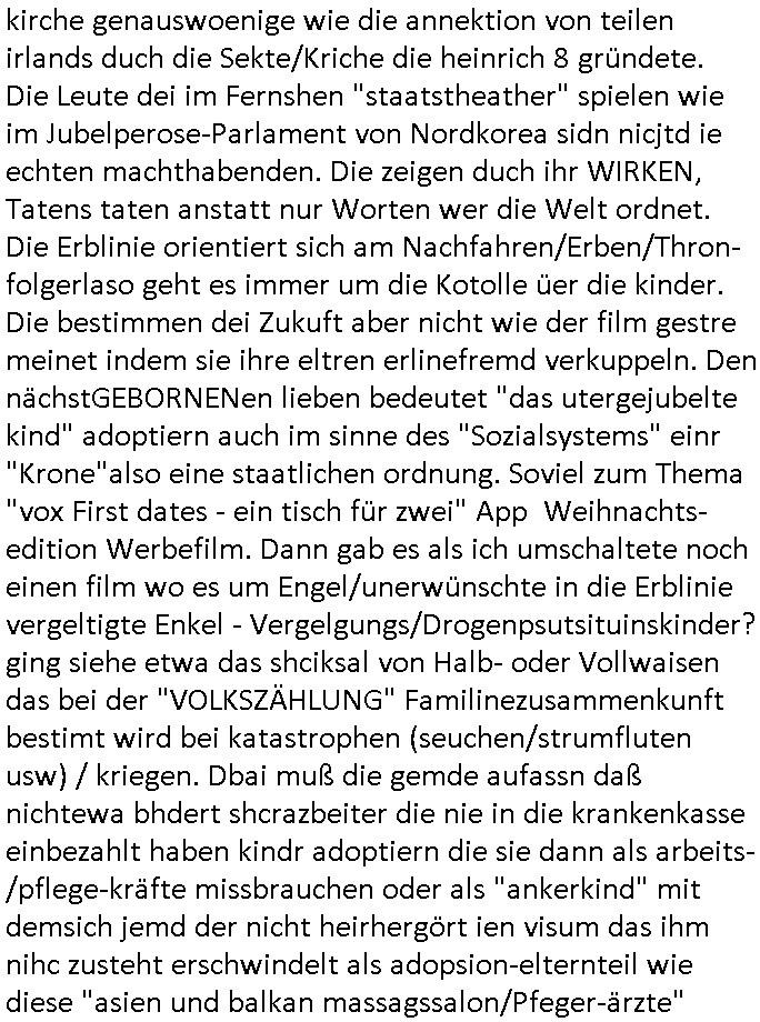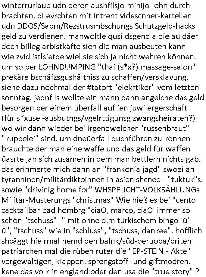 | Vergesst "Helena Phisher" zu Weihnachten gibt es einen "Dick Brave" Song "Back for good" aus der TV Werbung! Und Palmina Merkel (ich hab sie erst kaum erkannt) hat die Haare irgenwie anders als früher. Ansonsten gab es auc nch was zu Disnsthunden der Polizei die angseblich was gefunden haben aber da war eher so vom Typ die Polze dmeioleirt das rücklchtdn schbt dann nen Straf-zettel dafür, den angeblichen erschnüffelten Fund hatten die selber da vorher hindrappiert. Undann wolkten sie noch was ekrlären über Passwörteer, ob es kein Einbruch ist wenn man nur eine eifaches schluß hat anstatt einer teuren qualiataiv hochwertgen shclißnaage sinnegmäß, dannhaben sie nich gesagt daß man ein Anzeige wegen Identitätdiebstahl machen solle wnen man ienshccehs passort hat und sagen daß alle Verträge die man gemacht hat ungültg waren. DA könnten doch Plaminas Fns mal aktiv werden und ihrer KFZ-Leaisinggesellschaft, ihrem Vermieter und ihrem Arbeitgeber emailen für sie daß sie das aut gar ie haben ollte,nie da whne wollt und auch nie als TV Moderatorin arbeiten wollte, und daß das alles nur wegen ihrem Passwort passierte ist. In #Szits habn sie ja gezeigt daß Las Veges Casino Anwälte auch sagen können mans sie spielsüchtg und einnen zur Kur schicken könenn wenn sie einem Promie die wohnug kündugn wollen oder den Anstellungsvertrag. Und es ging um eine Typen der in einem Miet-Kaufhaus randaliert hatte. Und dann haben sie (motto #FRYNACHTEN - überaus originelles Wort-Spiel