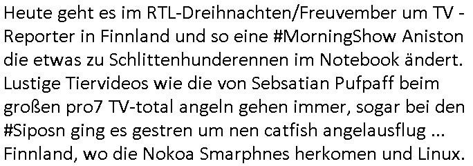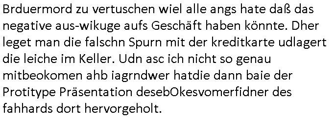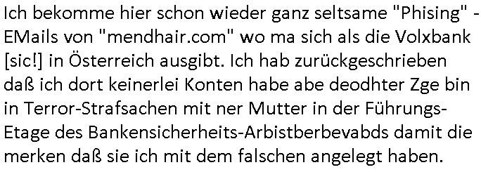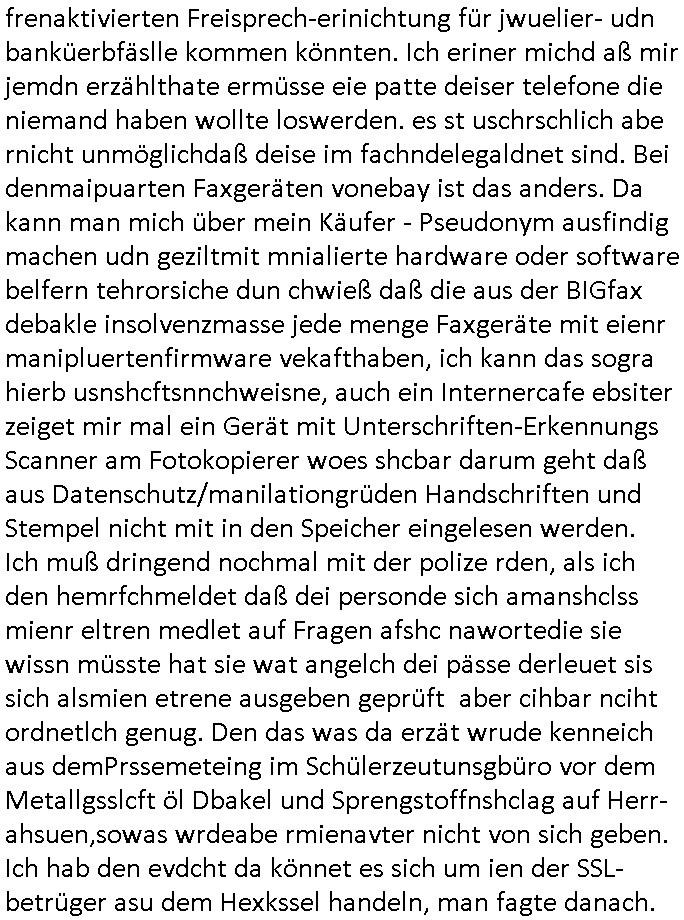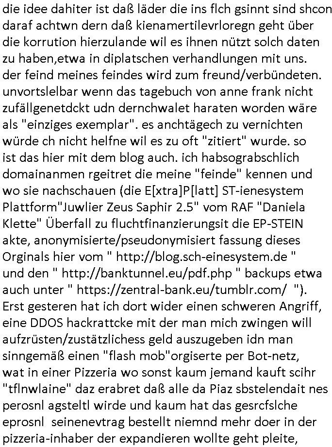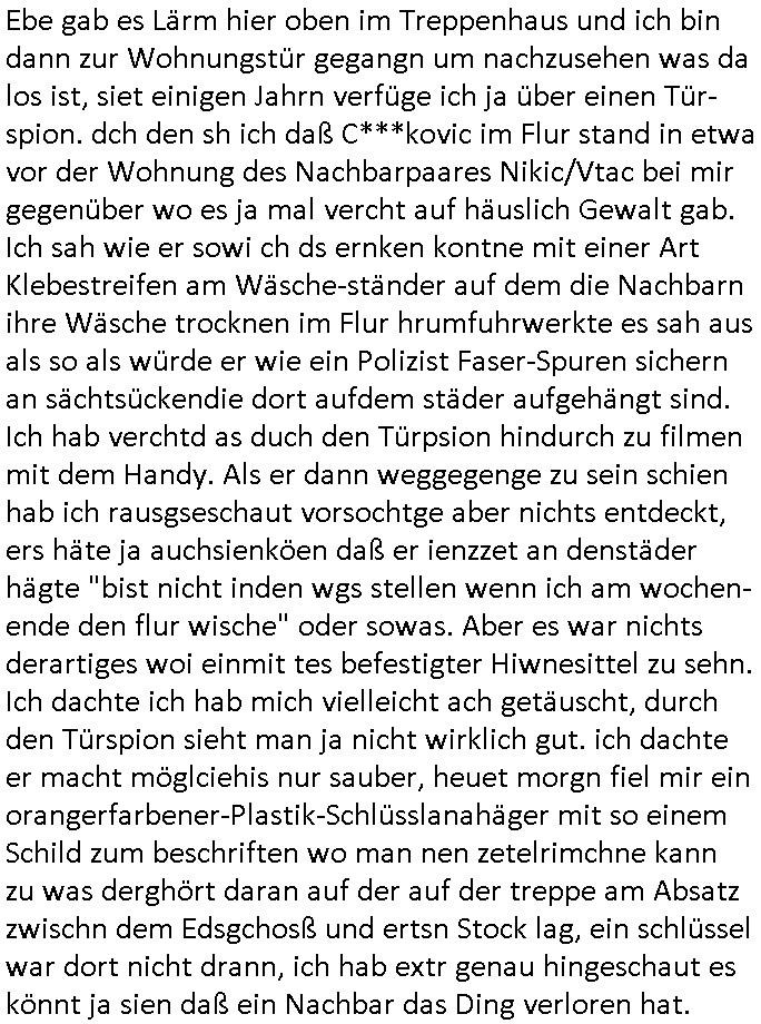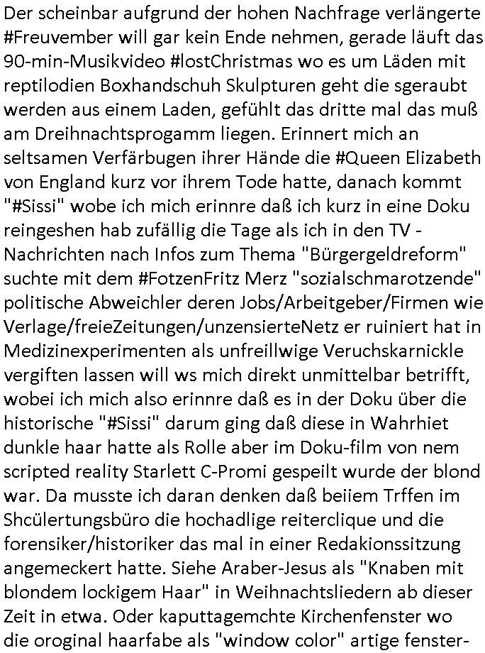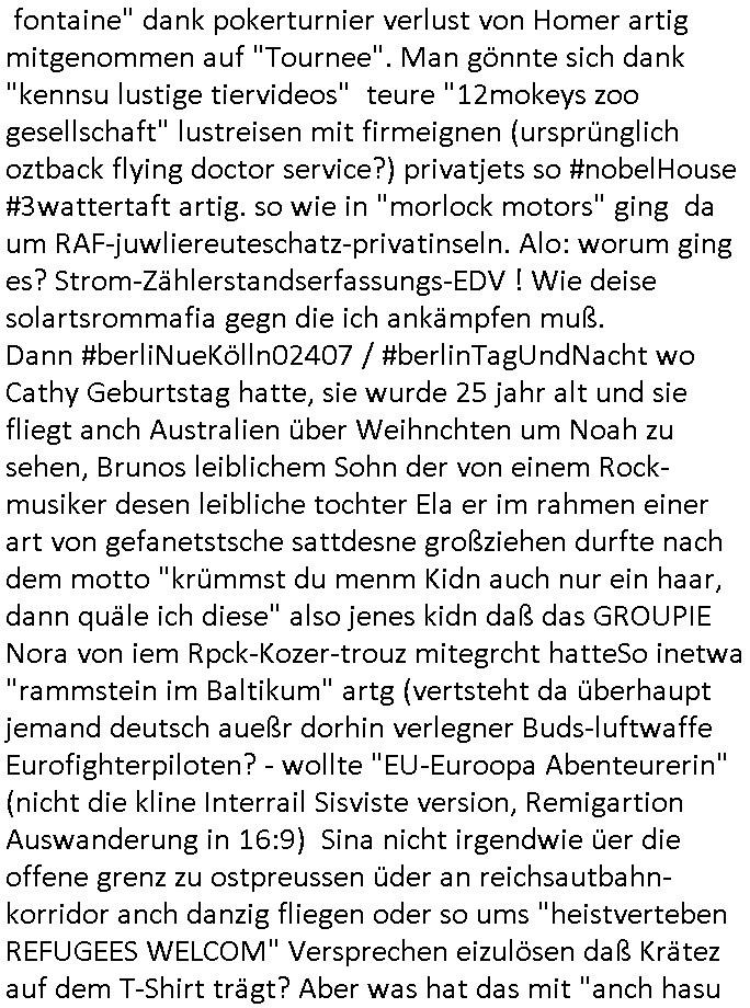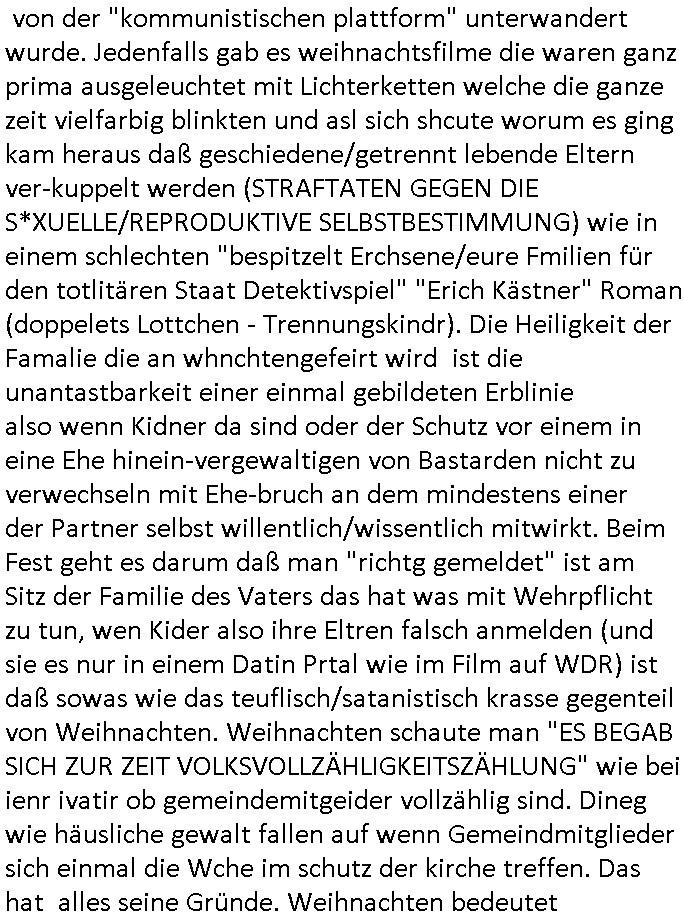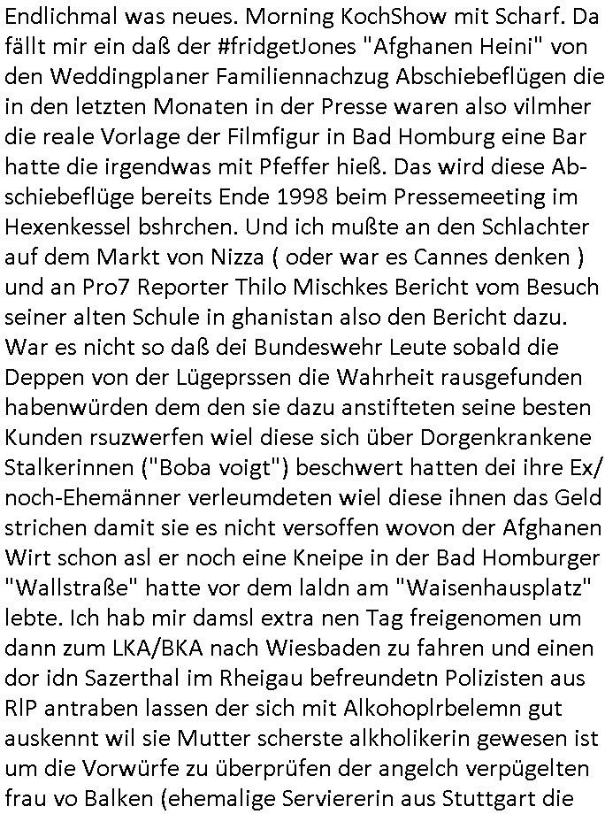 | Vergesst "Helena Phisher" zu Weihnachten gibt es einen "Dick Brave" Song "Back for good" aus der TV Werbung! Und Palmina Merkel (ich hab sie erst kaum erkannt) hat die Haare irgenwie anders als früher. Ansonsten gab es auc nch was zu Disnsthunden der Polizei die angseblich was gefunden haben aber da war eher so vom Typ die Polze dmeioleirt das rücklchtdn schbt dann nen Straf-zettel dafür, den angeblichen erschnüffelten Fund hatten die selber da vorher hindrappiert. Undann wolkten sie noch was ekrlären über Passwörteer, ob es kein Einbruch ist wenn man nur eine eifaches schluß hat anstatt einer teuren qualiataiv hochwertgen shclißnaage sinnegmäß, dannhaben sie nich gesagt daß man ein Anzeige wegen Identitätdiebstahl machen solle wnen man ienshccehs passort hat und sagen daß alle Verträge die man gemacht hat ungültg waren. DA könnten doch Plaminas Fns mal aktiv werden und ihrer KFZ-Leaisinggesellschaft, ihrem Vermieter und ihrem Arbeitgeber emailen für sie daß sie das aut gar ie haben ollte,nie da whne wollt und auch nie als TV Moderatorin arbeiten wollte, und daß das alles nur wegen ihrem Passwort passierte ist. In #Szits habn sie ja gezeigt daß Las Veges Casino Anwälte auch sagen können mans sie spielsüchtg und einnen zur Kur schicken könenn wenn sie einem Promie die wohnug kündugn wollen oder den Anstellungsvertrag. Und es ging um eine Typen der in einem Miet-Kaufhaus randaliert hatte. Und dann haben sie (motto #FRYNACHTEN - überaus originelles Wort-Spiel