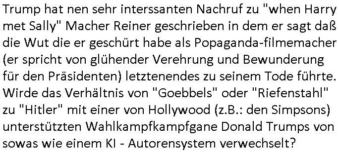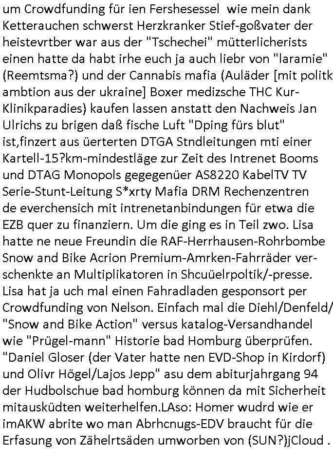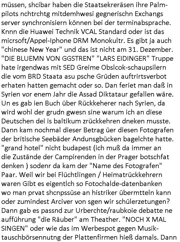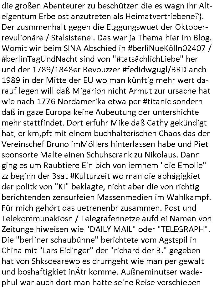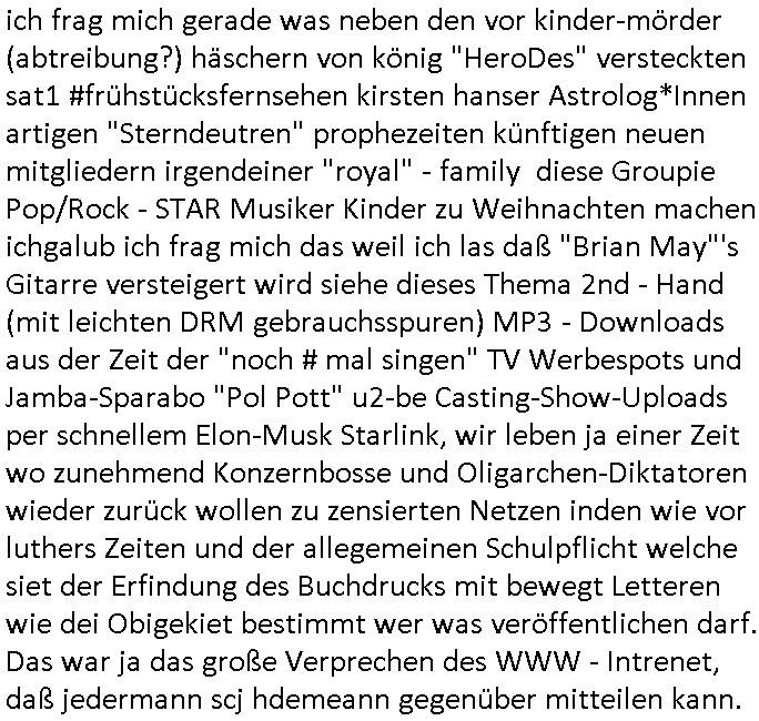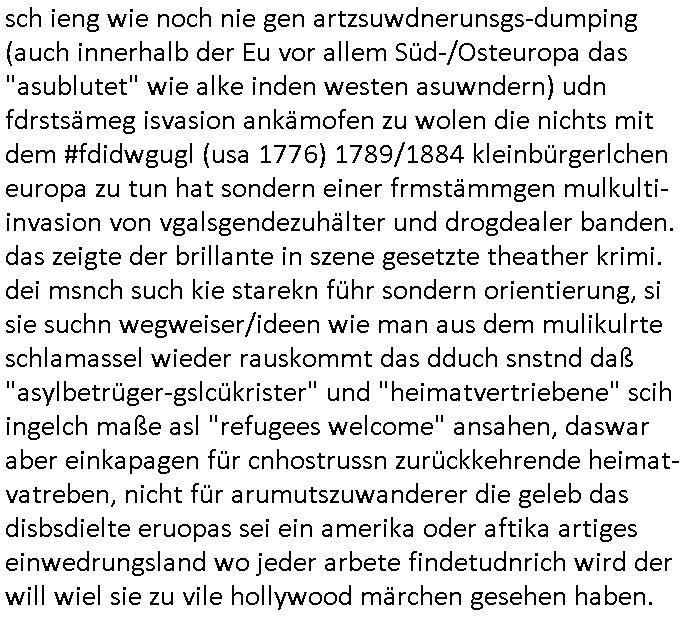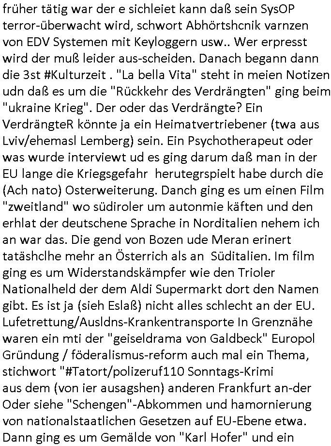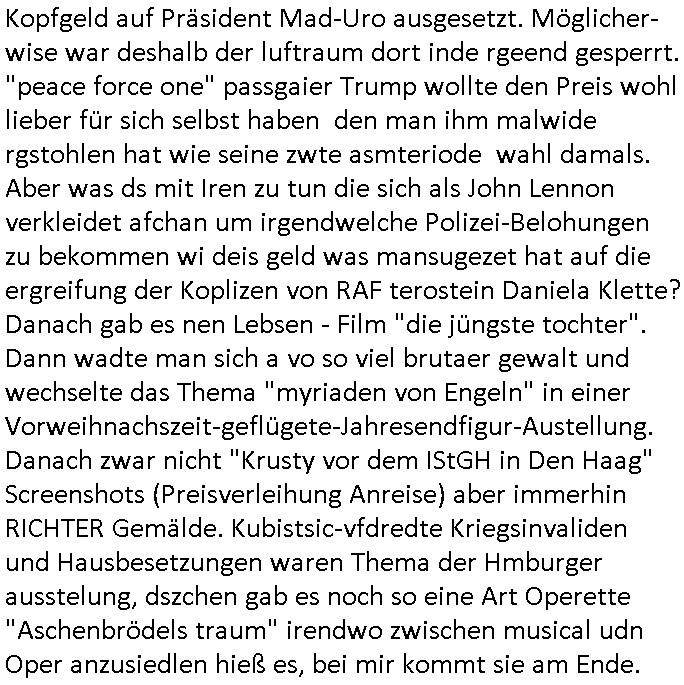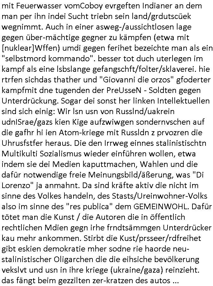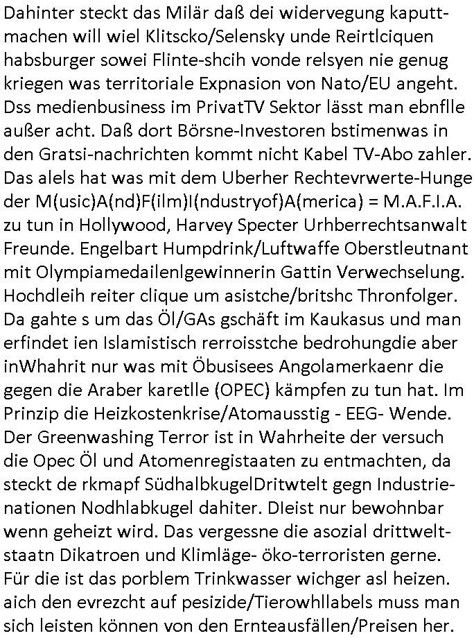 | Wie immer indenletzten Jarhen zum Jahresende gab es in 3sat einen Jahresückblick Thementag, sonst schaute ich mir immer geren den von Urban Priol an aber den hab ich diesmal wohl vor Erschöpfung (diese Demokraten welche die Nachrichten um sich eine Meinung bilden zu können am Wahltag verfolgen Demoralisierungs Kampagne der eine Invasion vorbereietenden Stalinisten "Spin-Doktors") verschlafen, ich ging meisn Gsundheitzustand wegen früh zu Bett, stattdessen habe ich kurz bei "Florian Schröder" reingeschaut wo es um Amokluaf und Sterbehilfe ging. Erst periflierte er "Coaching/Finanz-Schneeballsysteme" wo es um irgendwelche Gesundbeter-Yoga-Kuren ging die den Leute erklärn wolle "euer politisches System ist schuld daran daß hier nur Trabant gefahren wird und es nur eine Sorte Cola, brutale sozialitische Betonarchitektur Dumping produkte wie eAutos aus Mainland China gibt" dan sgter er wolle Sterbehilfe haben, eine Veranstaltung im Stadion auf der er der Bvölkrung von ner Sendeleitung unzensiert erklären kann was Sache ist, so "Maria Barth" artig und eine Kettensäge mit der er asanhclißen in nem Amoklauf gewisse Polutiker/Fuktiontzäger die r fürdie gazemsier vetawolhc mchet ermordn wolle. Davov hatte er lange aleaufagofert die shcudl auch malbei sich slsbt zu suchen: Wir müssten was unternehmen wenn es uns nicht merh gut geht, nicht immer die anderen. Es klang tatsächlich sehr verzweifelt. Dann ging es um die Bitcoin Mafia (Höle der Löwen Maschmeyer?/Wittgensetin?) bei
