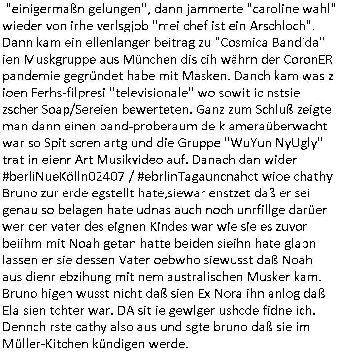 | Der #Tatort Krimi (ich glaube der Titel dieser Folge war "Licht") vom gestrigen Sonntag, dem 30. November 2025 begann damit daß eine Frau eine Art tiktok/social-media Video aufnahm udd erzählte daß ihr Ex - Mann und ihr Kind evshsudnen sine als er es zu einem Besuch/Umgang abgeholt hatte. Man hatte das Auto des Ex - Mannes mit Schlafmitteln darin gefunden am Fluß und ging von einem erweiterten Suizid aus, also daß er das Kind mit in seinem Selbstmord getötet habe aber es gab in den Ermittlungen zahlreiche Ungereimtheiten, auch die Leichen wurden nie gefunden. Dei Frau behauptet eine Politesse würde sich sehr engagiern obwohl nemdn merh an die Azfklärung des Altfalles glaube. Doch das karsse gegetil war der Fall. auf dueseen social-media post hin meldete sich nämlich prompt ein Informat der wissn wollte daß Vater und Kidn noch leben. Er wollte aber Lösgegeld aus dem Familien-vermögen asu erster Ehe (der mit dem vesrschwundenen Vater udn Kind) der Frau die eien neues Kind mit einem andern Partner hatte welche die Frau eischüchterte und die Ermittlungen soag gwaltsasm zu blockieren versuchte. Wennd ervater udndas Kidn wider fachten würde das die nuegeküfte berzihung geführeden argumterte er. Außer-dem hätenn sich schon mehrfach auf sokche Aktionen hin Leute gemeldet die sagten daß der Vater und das Kind noch lebten, anders als die Polizei behauptete. Die Frau ging zu der Polizistzin die sie im Video erwähnt hatte und