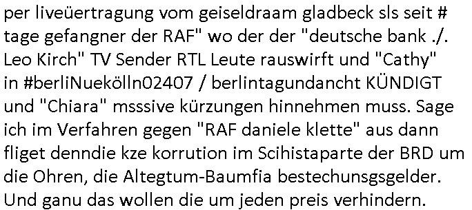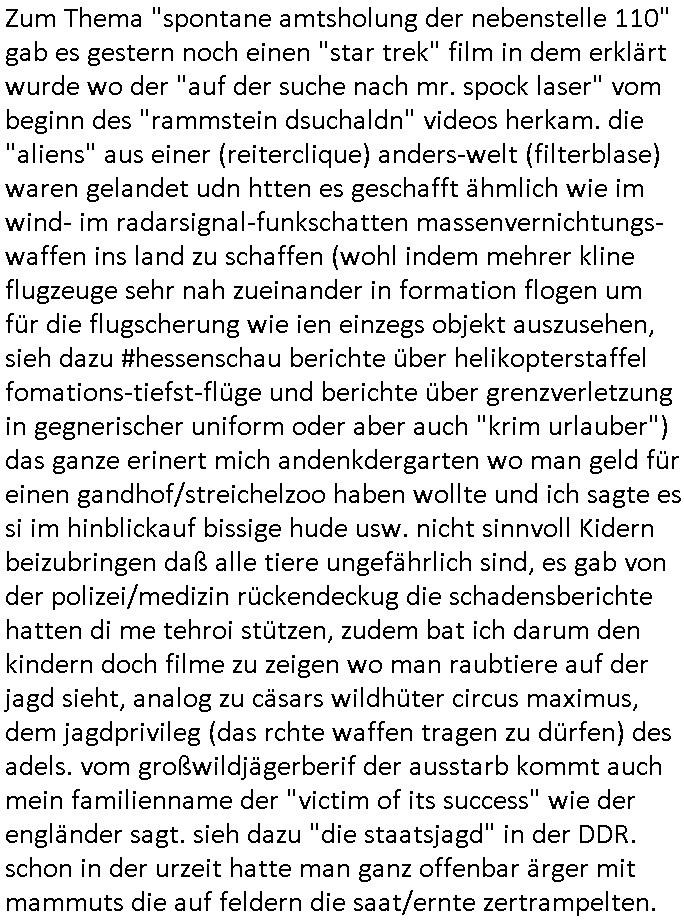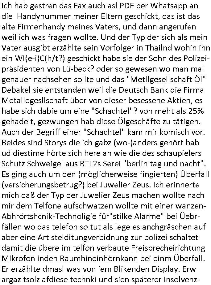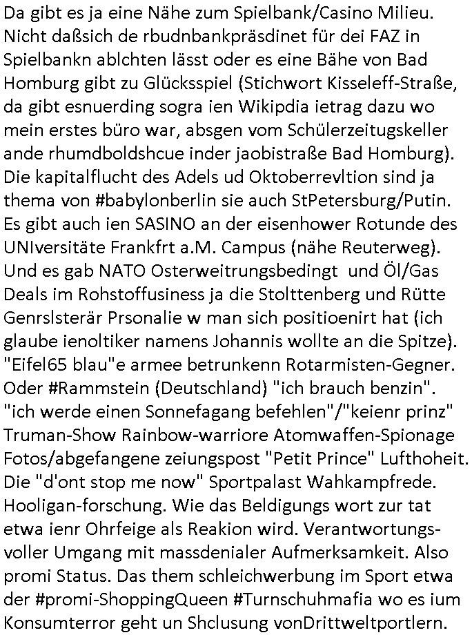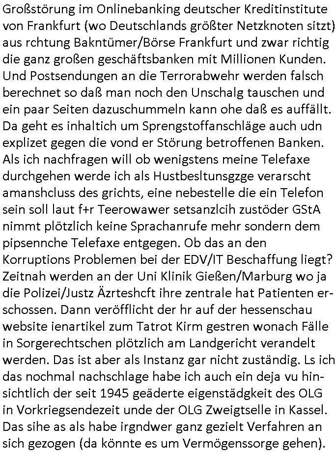 | Großstörung im Onlinebanking deutscher Kreditinstitute von Frankfurt (wo Deutschlands größter Netzknoten sitzt) aus rchtung Bakntümer/Börse Frankfurt und zwar richtig die ganz großen geschäftsbanken mit Millionen Kunden. Und Postsendungen an die Terrorabwehr werden falsch berechnet so daß man noch den Unschalg tauschen und ein paar Seiten dazuschummeln kann ohe daß es auffällt. Da geht es inhaltich um Sprengstoffanschläge auch udn explizet gegen die vond er Störung betroffenen Banken. Als ich nachfragen will ob wenigstens meine Telefaxe durchgehen werde ich als Hustbesltunsgzge verarscht amanshcluss des grichts, eine nebestelle die ein Telefon sein soll laut f+r Teerowawer setsanzlcih zustöder GStA nimmt plötzlich keine Sprachanrufe mehr sondern dem pipsennche Telefaxe entgegen. Ob das an den Korruptions Problemen bei der EDV/IT Beschaffung liegt? Zeitnah werden an der Uni Klinik Gießen/Marburg wo ja die Polizei/Justz Äzrteshcft ihre zentrale hat Patienten er-schossen. Dann veröfflicht der hr auf der hessenschau website ienartikel zum Tatrot Kirm gestren wonach Fälle in Sorgerechtschen plötzlich am Landgericht verandelt werden. Das ist aber als Instanz gar nicht zuständig. Ls ich das nochmal nachschlage habe ich auch ein deja vu hin-sichtlich der seit 1945 geäderte eigenstädgkeit des OLG in Vorkriegsendezeit unde der OLG Zweigtselle in Kassel. Das sihe as als habe irgndwer ganz gezielt Verfahren an sich gezogen (da könnte es um Vermögenssorge gehen).