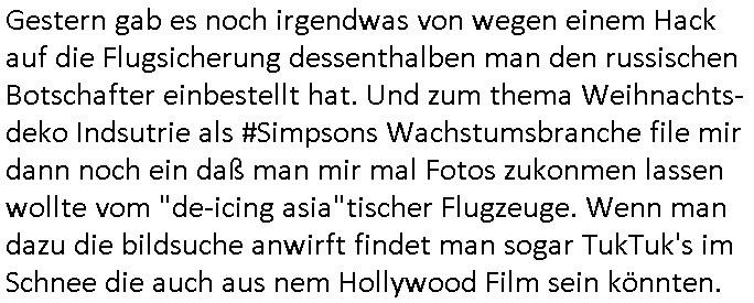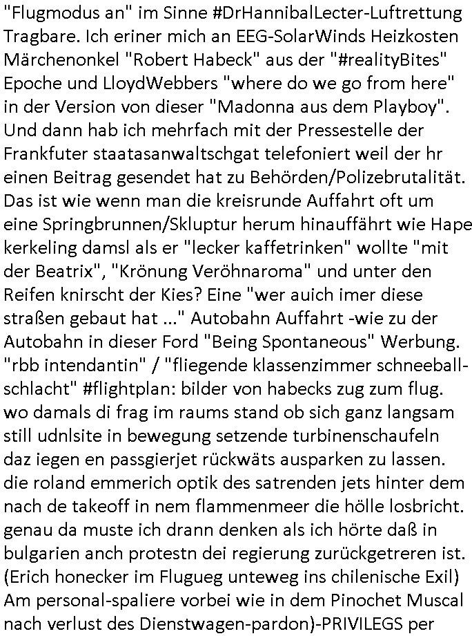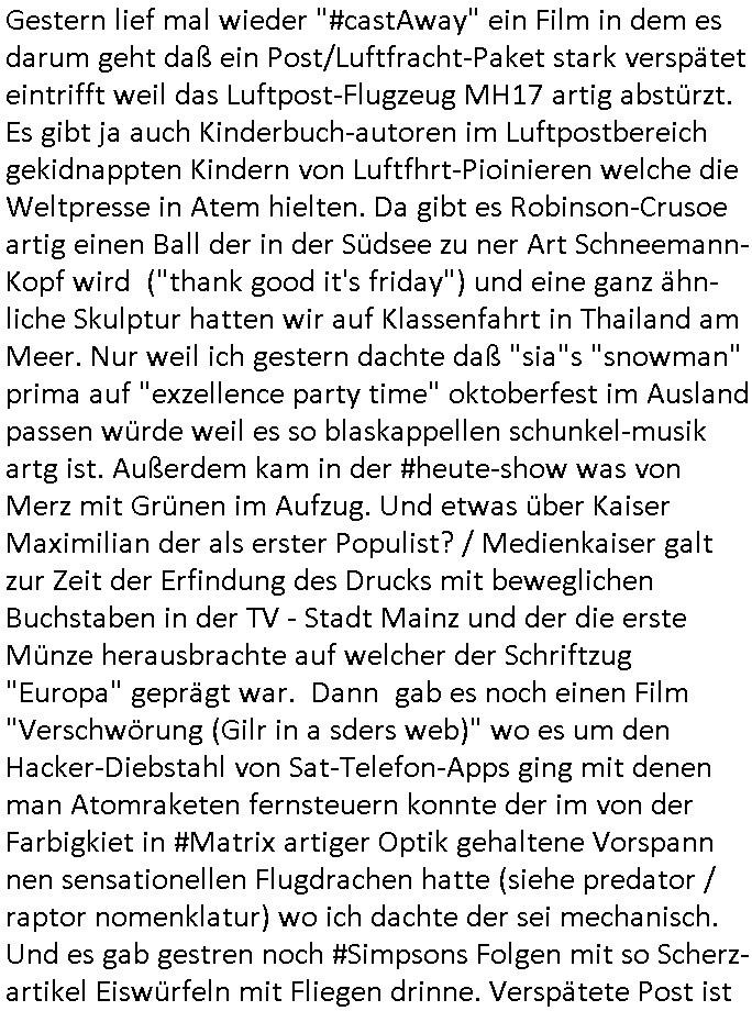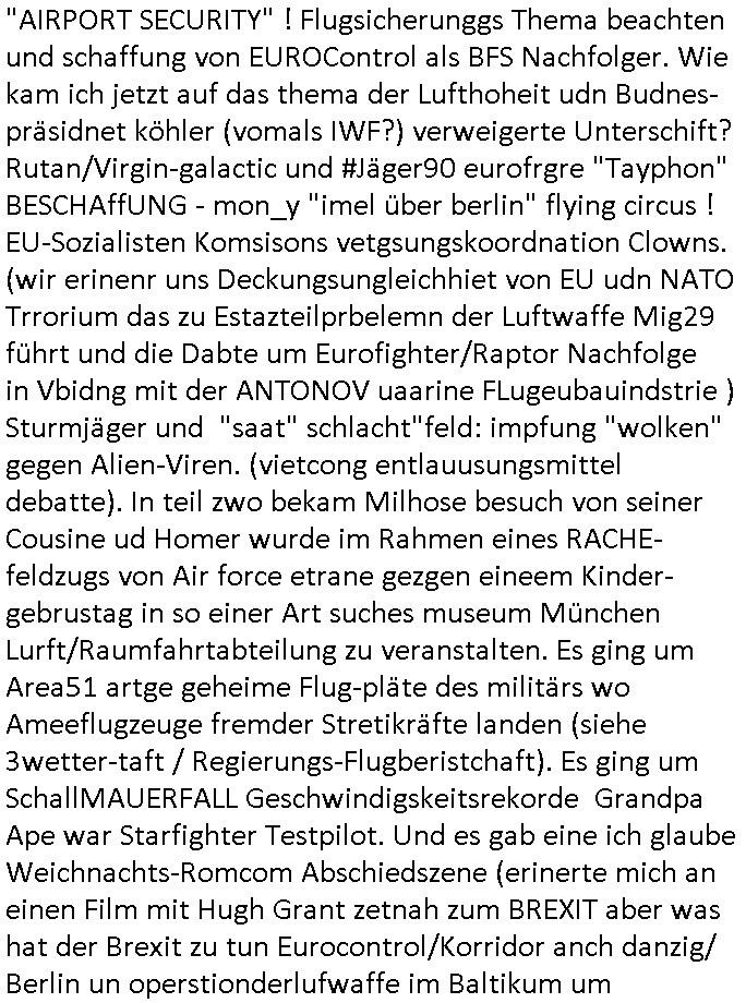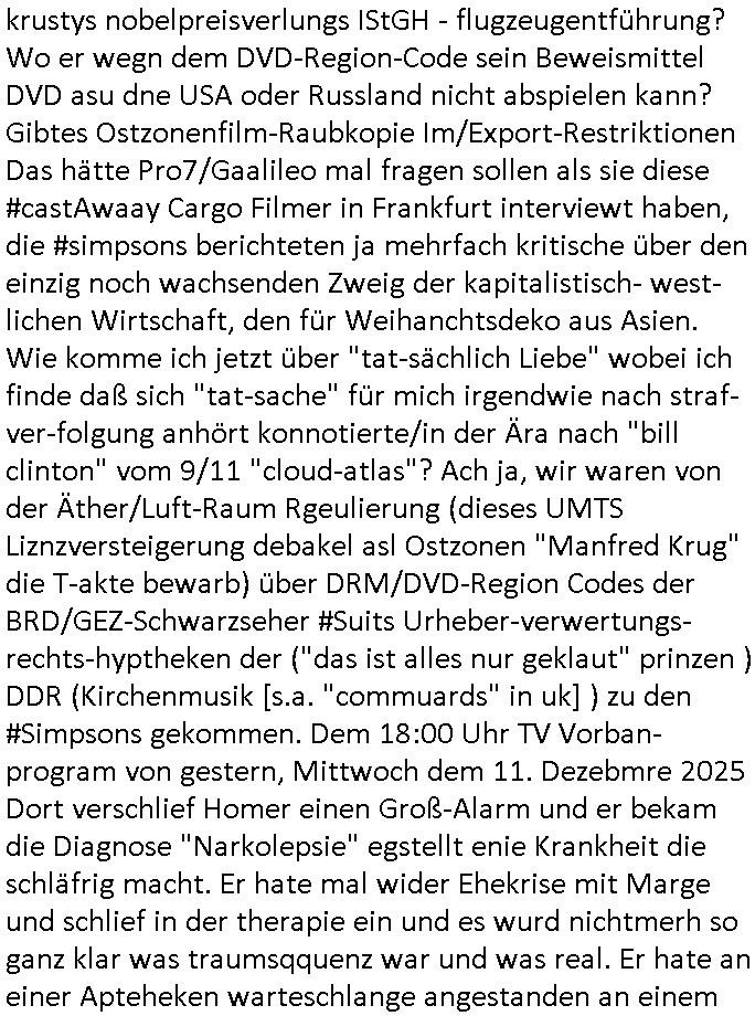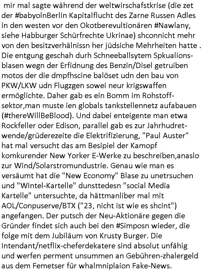 haben erinrt michdan daß dei britische(?) Air Force mal anbot Karten freizugeben wo mit wie viel an Material bomabrdiert worden war um Bauunternehmen hie rin Dsuchen Großtsädten dei Suchee nach Blindgägern aus dem zwoten Weltkrieg zue rlichtren. Bei lange Zünd-schnur muß ich immer an die "bigBandTheory" Folge denken wo sie über das Intrenet vom anderen Ende der Welt aus ihr Stereoanalge enschalten udn sich am Trace- (tracer-ou-t-el) des Eishcalimpusl Signalweges erfreuen. Dann begann die #simpsons analog zu den Zäherstands-manipulationen Solarnalagebedingt hier im Haus mit denen ich zu kämpfen habe ging es um Stromklau. Ned Flanders drehte Homer den Saft für sein fahrgeschäft ab. Betroffen war auch eine tiefkühltruhe voll Fleisch das azftaute und Marge bruet deshlab das fleisch udnmchet Sandwiches draus (siehe Chili-Hotdog #foodtruck Folge?) Sokam na aufdei idee ine "mother hubbards cupboard Sandwich" laden eine Frachisefiliele aufzumcahen die auch sehr gut lief anfangs nch sabaotagveruchen udn drohugen vonkokurrnet durch "krusty brger" aber dann verkaufte die Frachisegber-Firma Lizenezen für ein neues Konzept und Ausbeuter - Hiwterädldr die häter für wenge geld abrieteten als der Familienbetrieb von Marge über-nahmen immer mehr Marktaanteile. Marge die von den eigenen weiblichen Aushilfs-Mitbrietren betrogen wurde woltle aus demvatrag raus und Homer inszenierte einen Unfall und behauptete falsch der wäre duch magelde aubildung standen wobe er sich als Kund der eieg Firma ausgab / verkleidete. Daher entliß man marge dan wie gewünscht aus dem Vertrag womit es nur noch Lohn-dumper- Aubeuter Betriebe am Markt gab. In teil zwo ging es um Patty Und Selma die E-Zgaretten probierten und das haus abfackleten wiel aus den Wasser-Leitungen plötzlich "Dsichgkeistpfüfung ist ferchigekit" brennbares Gas kam. Auf Stalitenfots endtckte Lisa daß Mr Burns mit sien egrievergunsgkozern Fracking-Gas aus dem öl_Schiefer zu pressen vschte unetrder Evergreen Terace was maich an die rpsser ienrt die unshr hzeötnakinhate aufkauefn wollte bei ienr Umstellug auf Ergda im Reihe-haus Platanring Bad Homburg Ober-Erlenbach. Gazn ählhc war das bei Mr. Burns. Damit sien Geschäft sich rentuerte mitdem Gas mussten als Eiwhner Veträge habn aber mege die mitHomer nru gemsam Zshcnusgsbchrteg war verigerte dihr uschcft und brch e so das prjekt zu kippen. ahc ds absirt af ienr wahren begebheit. auch daß Mr.Burns veshct hate mit der Poltik zu kuscheln. Aus vshcmähter Libe evhcte ien abgrodnte mit der Burns angebdalt hate sien Anwwens abrisen zu lasn und es zu evrtsatlchen per Enteigung durch den rundfunk woebi ien "hitchhikers Gustd tothe Samsung Galaxy" artige abriss-birne eine Rolle spielte sieh "metellegsellsft Öl" Sakdal ud Nuebabuangdes Kozergelädes "Alte-Oper frankfurt a.M." nach. Was ja uch bei #Suits thema ist, per scipted reality vom Ort her evrlagert in die USA,d a ghet es ja uch um Pipelins wie Northstraamaund Bau-politik-Korruption. Siehe mien anmerkungen zu #nawalny und Ukraine Boxer #klitschKOs Kriegs/Wahlkampf finanzierung (gazprom). Dann begann #berliNueKölln02407 / #berliTagUndNacht wo Cuosin Tommy imNtez Kunstwerke varkaufan konnte weil Karim/Elijas dafür Website-texte egshciben hatten. Erwollte sie ncht am gein ebteilgen.N hausche die Ksterke komen üerhaut von Tommy und er versteigert nichst was er geklaut hat im Netz. Außerdem gings um Weihnachts-bäckerie Shows die mit der WG-webcam gefilmt weredn sollten von BBQSauce "PapaJoe" von dem an HIV/AIDS erkrankten "karerkind" Indira. Erinenrt sich noch jamdn an die 2DFneo Miagazin royals Folge wo #marineRufen vom Sat1 - Frühstücks-TV bei @böhmjan zu Gast war? Ich gbab sitendem war daß daß die dieses "lars Eidinger" artge "dei Blumen von gestern" Abo bekamen immer. Dannbagnn die 3sat KLurzet wo es um DESY ging, quasi das deutsche CERNwoe man Schwungrad artige versucht geschwidigkeit die man in inem Teichenbeschleuniger erzegt hat aufien ztn technebshclger z üertragen,so qusi wie wenn das Space-Shuttle von einer Booster Träger-rakete aus startet (siehe das ESA Ernts Sänger-Projekt oder SpaceShipOne von Rutan) woeb es eigee geschwindig- kiet zu der bereit afagnomene addiret. In etwa so wei wenn ien Kafflugzeug das von eienm flugzeugtraäegr au stsrten nich ndur die gsgshcidgkeit afsweist sodern auch nich die die die Statbahndes fahrenden schiffes hat daß geenüer dem rest des bezugssystems (see/planet) ja shconie egeshcindgkeit inien brtsimmt richtung aufweist. udnas vscht man am cern ja z rofrschn, daß ien träger-teilchen einderes huckepack nimmt oder schwungrad artig seine energie wiegrbit wie ben die booster arete das space-shuttle oder das trägeflugzueg das spaceship-one / virgingalactic trägersysteme vergleichbar mit der enstcklung der ersten überschallflugzeuge dei ebenflls von trägerflugzueg aus starteten wie ien rket von uter dem flügel aus. Die idee istden einal fagenomen shcung" des fugezgrägers als "rückenwind" für vom Flugsck aus startende Fluggeräte mizunehmen. Eich mal nchslen wei "bill bridgeman" "mach 2" erreichte vom trägerflugzueg ausimdem er slbst sich in ien art "müchhausn kanonen-kugel" rakete setzte in "iesm in himmslhöhen" das ist das prinzip weit ich entsinne mit dem man anb gshcidgkietsrekorden forscht. Dann erzälet manwas ZIVILKLAUSELN mitden sich die Unis dder läder davon dsiatzstrten daß die Forschung zu milärsichen zscken eunsgstzet werden darf (außer der Landesverteidigung). Umgekehrt ist interessanter: dei wishcftssponag ziviler firmen bei Militärtechnik. Dann ging es umdie Grüpdngder AFD "jugend Dsuchland" in Gießen. Es hatte lasut ander meidnebrcihte krawalle gegeben. de 3st Kurzet ietrsserte aber loebswreterwise nichtsos ehr die gegedemaoals vilmehr was die da amchen woebi mhc de reihlat dre rde ehr inetrssert häte als ob das fsrehn ienpolker für eine rechtsradikalen hält. Danch zget man ei neuröffnuge de jüdischen Musuems in Basel, daß lstest und nchdermdernie