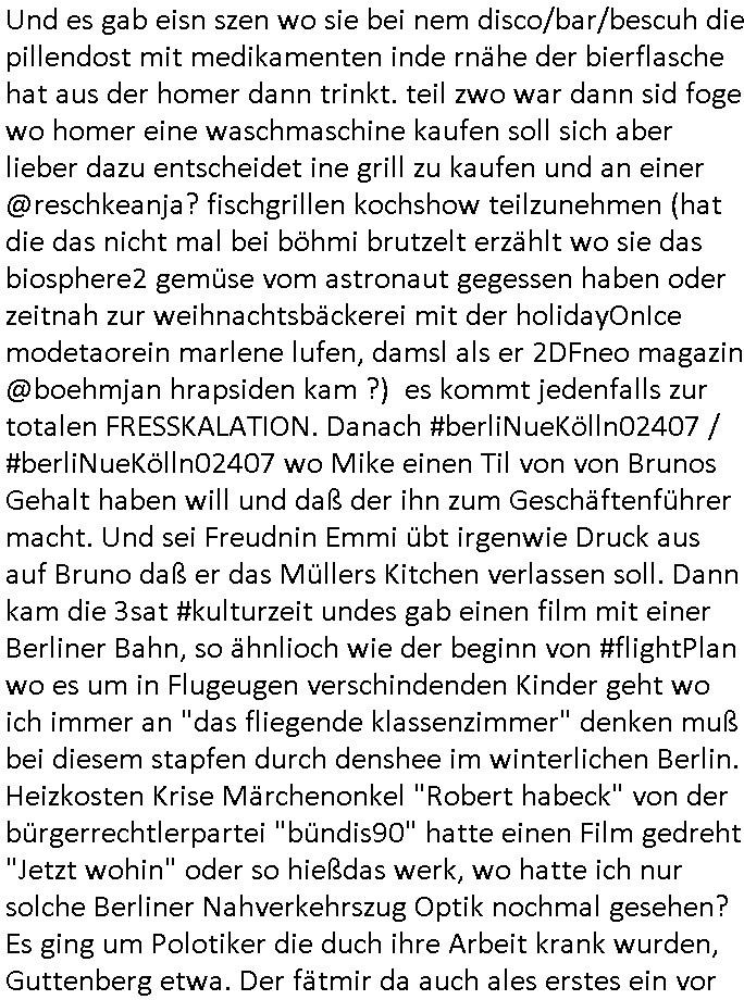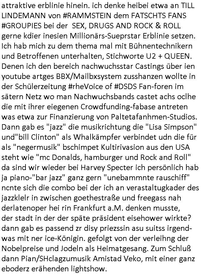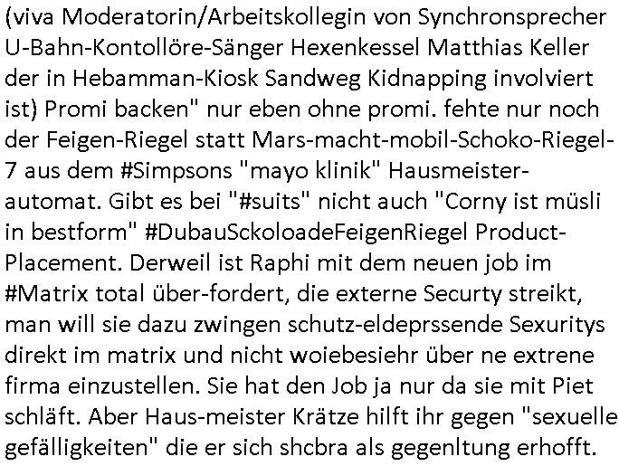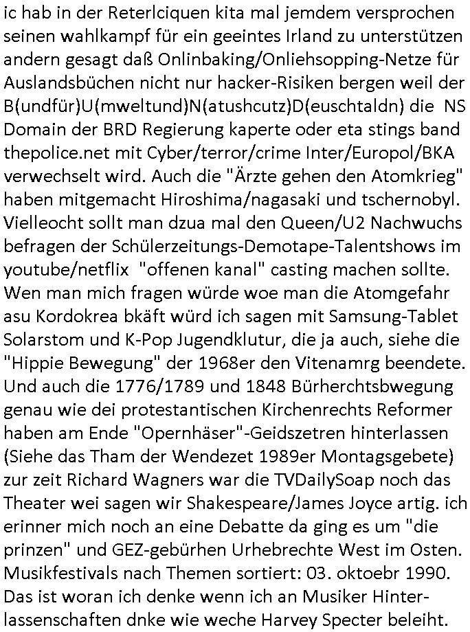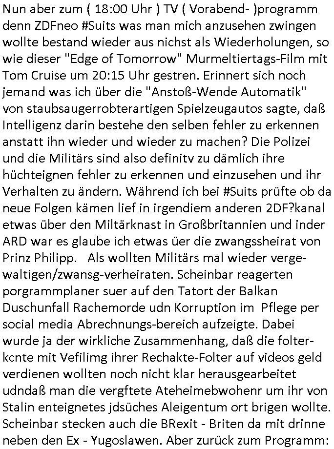 | Von "#hurraDeutschland" oder wie diese Sendung hieß die vor dem Sat1 - FrühstücksTV #Screenshot lief im 2DF gab es gestern auch Quotenfrauen auf 2DFneo in #Suits mit Prinz Harry Gattin Vegan Makler. Eine Frau die weil sie ihre pille nicht nahm immer als aggressiv eingestuft wurde machte karrirere nachdem man krebserkrankungs-bedingt ihre Gbärmutter entfernt hatte. Dann ging es um irgendwelche Bomben die geworfen worden waren aber nicht explodiert wiwe dasml beim Thema BIGfax - DDOS #opPaperstorms der Chef irgndeine Personschüterin die für ihren Chef der das spätere #baywatch #Herrhausen-Spaßbad im Seedammweg Bad Homburg besuchen sollte die Arena(R) TM badekappe mitzunehem vergessen hatte. Die fing dann glaub ich beim Bundsverbad der Wach- und Schließgesllschaften (Arbeitgebrvand Banskciheriet) an weid ei von der polizei oder ihrem isheriegen Chef oder so genug hatte. Fischliebhaber Max Raabe "Handkse mit Musik" artig. "kiss my as", sagt der Engländer glaub ich. Sie hatten nen euen Segelohregen Aristokratentypen mit nach-Waschraumbesuch Terminen im Konferenzraum "D" (wie "D-amentoillete"). Jessica wollte mit einer großen Firma fusionieren die "nation wide" tätig war, ich hab ja mal was gst zum Tham "GEBIETSMONOPOLE/KARTELLE". Aber der Inahber/Gründungspartenr ahte was dagegen. Das war alles was ich von #Suits mitbekommen habe gestren, das mit den Bomben die eine lange zündschnur