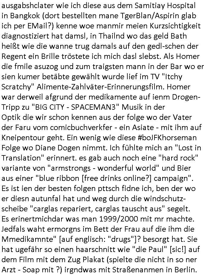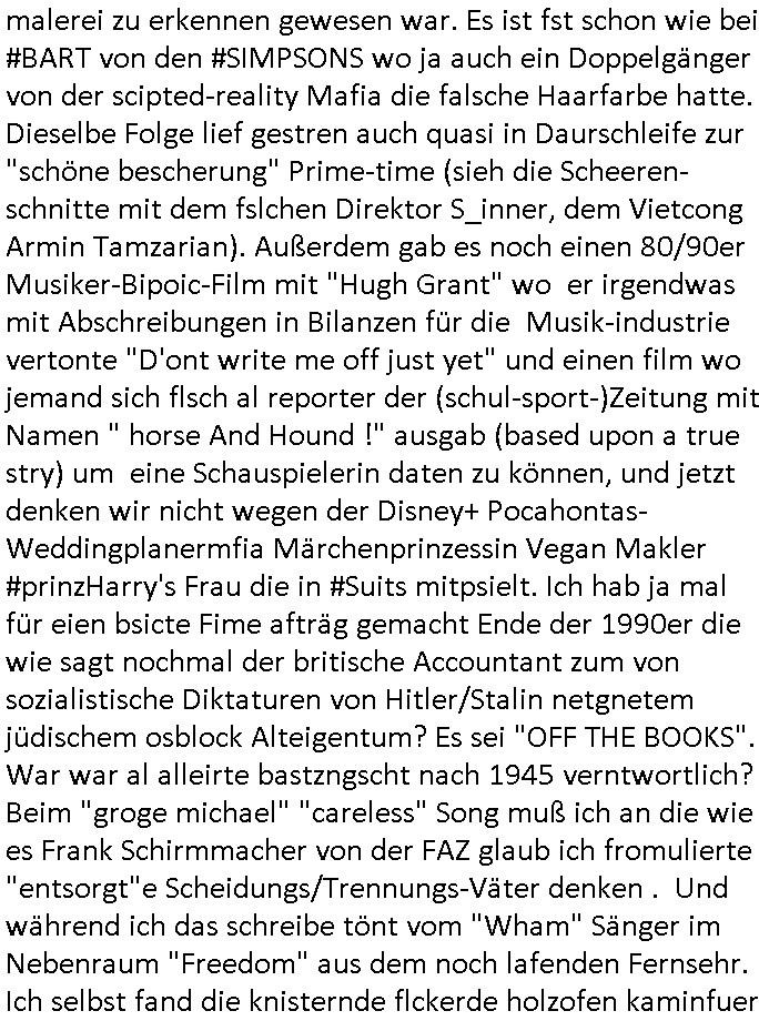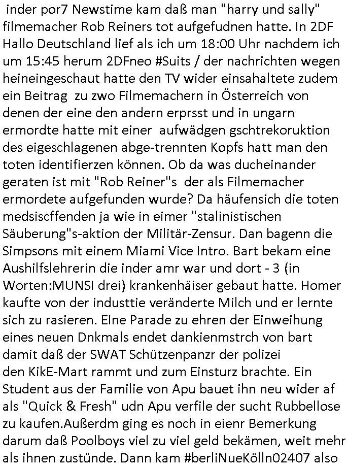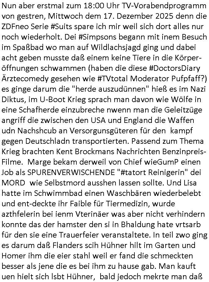 | Nun zum 18:00 Uhr TV - Vorabendprogramm von gestern, Montag dem 29. Dezember 2025 wo ich mir glücklicher-weise mal kein #berliNueKölln02407/ #berlinTagUndNacht und mir auch keinerlei 3sat #Kulturzeit ansehen musste, lediglch die #Simpsons. Anders als sonst erzählte eine "Stime aus dem Off" von Jazz und über Bluttransfusionen und "Whisper of Times" Polar-Eiswürfel die imprtert werdneosllten von Smithers. Burns erinnerte sich an Zeiten zurück in denen er noch große rauschende Fest gefeiert hatte. Ählich der "richie rich" fider wo er auf den "dopplets Lottchen" Bart trifft und diesem einredet seine neue, reiche Halbgeschwister Familie wolle ihn (Waise?) ermorden um an sein Geld, das Familienvmögen zu kommen. Es ist diese Folge wo Lenny urplötzlich zu viel Geld kommt und jedem, einem Vorwerk Vertretr gleich, einen Staubsagerrober besorgt. Aufder otilette eisn Luxushotels trifft er dann zufällig auf jemanden der genau aussieht wir er und tauscht mit ihm wie im "Erich Kästner" Roman "die Rollen". Das erinnert michienweng an dei [(Reklamations-)Weihnachts-]Film und TV Crews vonde Promihochzeute im Kindergarten in der Bad Homburg Ober-Erlenbacher Weingartenstraße und das in "Tic-Tac-Toe" Musik für die nchwelt fest-gehaten miese Verhalten von Bruckmaier, Hohmann udn andern asu der shcüleztung bei einem Pressmeeting mit großen Zteungen (Welt) und Fernsehen (darunter 3sat). Wo irgendeiene Ostbclok udnmarinsosldten Verbrecher-
